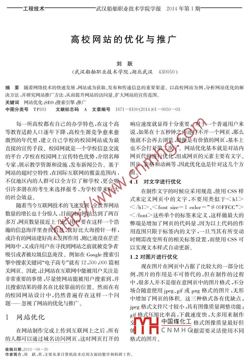 工程技術(shù)-武漢船舶職業(yè)技術(shù)學(xué)院學(xué)報(bào)2014年第1期高校網(wǎng)站的優(yōu)化與推廣劉躍(武漢船舶職業(yè)技術(shù)學(xué)院,湖北武漢430050 )摘要隨著網(wǎng)絡(luò)技術(shù)的快速發(fā)展,網(wǎng)站成為獲取、發(fā)布和傳遞信息的重要渠道。以高校網(wǎng)站為例,分析網(wǎng)站優(yōu)化的解決方法,并研究網(wǎng)站推廣方法,從而提升網(wǎng)站的訪問(wèn)量、擴(kuò)大網(wǎng)站的宣傳范圍。關(guān)鍵詞網(wǎng)站優(yōu)化 ;SE0 ;搜索引擎;推廣中圖分類號(hào)TP393文獻(xiàn)標(biāo)志碼A文章編號(hào) 1671 -8100(2014 )01 -0050-03每一所高校都有自己的辦學(xué)特色,在這個(gè)高響應(yīng)速度就顯得十分重要。對(duì)于-一個(gè)普通用戶來(lái)等教育適齡人口逐年下降,高校生源競(jìng)爭(zhēng)愈來(lái)愈說(shuō),如果在十五秒鐘之內(nèi)還打不開(kāi)-一個(gè)網(wǎng)頁(yè),那么激烈的年代里,建立自己學(xué)校的校園網(wǎng)站成為最,他就不會(huì)再去瀏覽,即便是有價(jià)值的網(wǎng)頁(yè),基本.上直接的宣傳手段。校園網(wǎng)就是一個(gè)學(xué)校信息交流也不會(huì)打開(kāi)第二次了。網(wǎng)站優(yōu)化基本就是對(duì)站內(nèi)的平臺(tái),學(xué)校在校園網(wǎng)上宣傳特色優(yōu)勢(shì),介紹名師網(wǎng)頁(yè)代碼進(jìn)行優(yōu)化,組成網(wǎng)頁(yè)的元素主要有文字、專家,展示教學(xué)資源和設(shè)施,發(fā)布新聞公告?;趫D片、表格和動(dòng)畫等,因此優(yōu)化也是針對(duì)這幾個(gè)方網(wǎng)站的超時(shí)空特性,在國(guó)際互聯(lián)網(wǎng)的覆蓋范圍內(nèi),面。不僅地區(qū)內(nèi)的人群可以全方位了解學(xué)校,更會(huì)吸1.1 對(duì)文字進(jìn)行優(yōu)化引許多潛在的考生來(lái)選擇報(bào)考,為學(xué)校帶來(lái)巨大在制作文字的時(shí)候應(yīng)采用規(guī)范,使用CSS樣的社會(huì)效益。式來(lái)定義網(wǎng)頁(yè)中的文字,不要用類似于