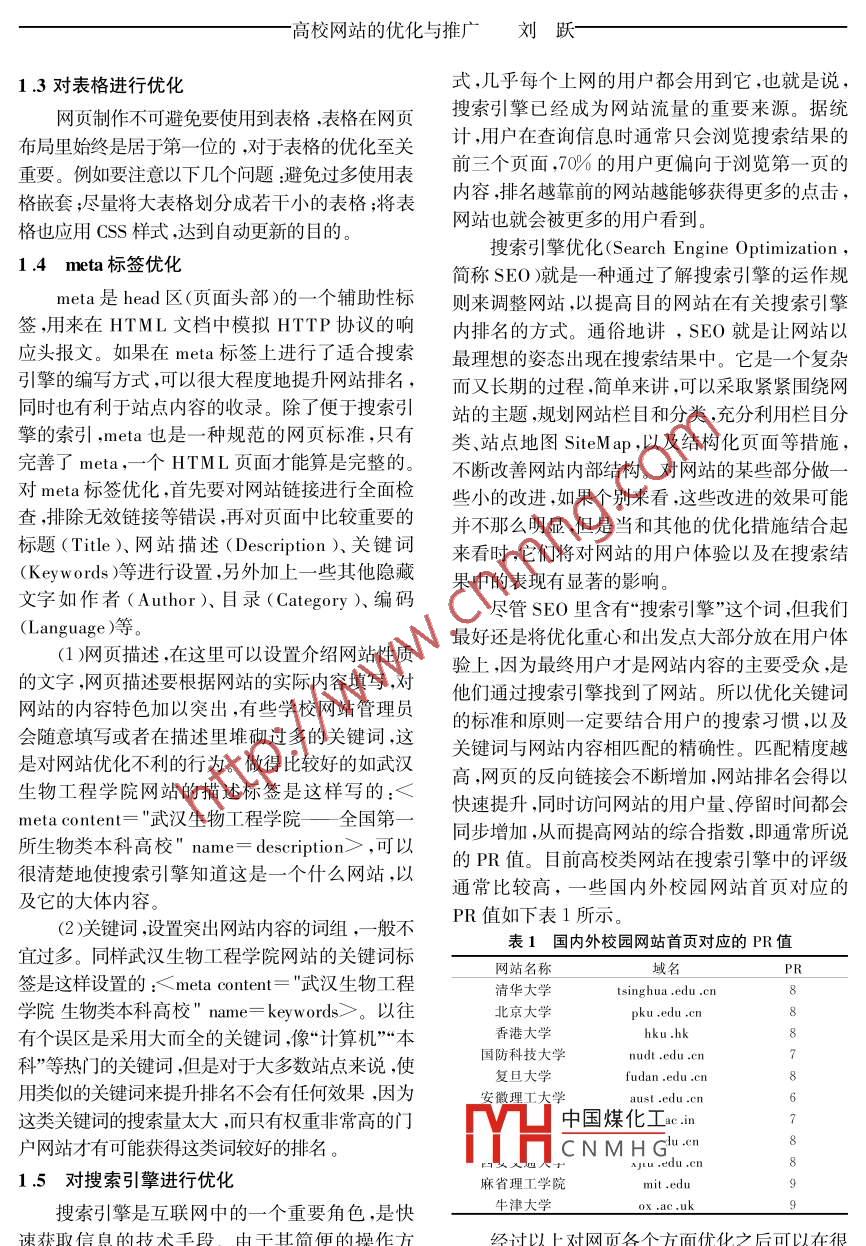 .數(shù)量的增長(zhǎng)也十分驚人,目前國(guó)內(nèi)網(wǎng)站達(dá)到了兩百這些單個(gè)的標(biāo)簽來(lái)定義,這樣做最大的萬(wàn),網(wǎng)頁(yè)數(shù)量接近上千億,用戶要在這樣一個(gè)浩弊端是增加了網(wǎng)頁(yè)的代碼量,因?yàn)橐陨洗a的作瀚的信息海洋里查找信息,就好比大海撈針-樣,用范圍只限于標(biāo)簽內(nèi)的文字,- -旦當(dāng)其有所變動(dòng)或許有的網(wǎng)站建好尚未發(fā)揮作用,則已淹沒(méi)在茫茫時(shí)則需改變所有的相關(guān)標(biāo)簽設(shè)置,而使用CSS可網(wǎng)海中,又或許用戶在尋找到網(wǎng)站之前就被競(jìng)爭(zhēng)者以實(shí)現(xiàn)文本樣式自動(dòng)更新。吸引或者被垃圾信息淹沒(méi)。例如在Google搜索引1.2對(duì)圖片進(jìn)行優(yōu)化擎中搜索關(guān)鍵詞“電子高?!本陀?2 ,500 ,000篇相現(xiàn)在圖片在網(wǎng)頁(yè)中占據(jù)了比較大的一部分比關(guān)網(wǎng)頁(yè)。因此,讓網(wǎng)站在互聯(lián)網(wǎng)中能被用戶關(guān)注是例,圖片的作用是不可替代的,但在制作的過(guò)程非常重要的事情,盡量使網(wǎng)站能被用戶搜索到,并中,很多人并不是很在意網(wǎng)頁(yè)中的圖片格式,不分且搜索結(jié)果的排名在比較靠前的位置。然而在有場(chǎng)合隨意使用jpeg.gif或png格式的圖片,無(wú)形的校園網(wǎng)站設(shè)計(jì)中,仍然普遍存在這樣一個(gè)問(wèn)中增加了網(wǎng)頁(yè)的體積。這三種格式各有優(yōu)缺點(diǎn):題-忽視了網(wǎng)站的優(yōu)化與推廣。jpeg格式文件尺寸較小,具有圖像質(zhì)量調(diào)整功能;1網(wǎng)站優(yōu)化gif格式壓縮比率高,下載速度快,大多用來(lái)制作中國(guó)煤化工格式圖像質(zhì)量最好但在網(wǎng)站制作完成上傳到互聯(lián)網(wǎng)上之后,所有YHCNMHQ據(jù)需要靈活使用不同的人都可以通過(guò)域名訪問(wèn)網(wǎng)頁(yè),這時(shí)網(wǎng)頁(yè)打開(kāi)的格式的圖片。收稿日期:2013-09 -20作者簡(jiǎn)介:劉躍男,主要從事計(jì)算機(jī)技術(shù)應(yīng)用方面的數(shù)學(xué)和科研工作。50-高校網(wǎng)站的優(yōu)化與推廣 劉躍式,幾乎每個(gè)上網(wǎng)的用戶都會(huì)用到它,也就是說(shuō),1.3對(duì)表格進(jìn)行優(yōu)化搜索引擎已經(jīng)成為網(wǎng)站流量的重要來(lái)源。據(jù)統(tǒng)網(wǎng)頁(yè)制作不可避免要使用到表格,表格在網(wǎng)頁(yè)計(jì) ,用戶在查詢信息時(shí)通常只會(huì)瀏覽搜索結(jié)果的布局里始終是居于第一一位的,對(duì)于表格的優(yōu)化至關(guān)前三個(gè)頁(yè)面,70%的用戶更偏向于瀏覽第一頁(yè)的重要。例如要注意以下幾個(gè)問(wèn)題:避免過(guò)多使用表內(nèi)容,排名越靠前的網(wǎng)站越能夠獲得更多的點(diǎn)擊,格嵌套;盡量將大表格劃分成若干小的表格;將表網(wǎng)站也就會(huì)被更多的用戶看到。格也應(yīng)用Css樣式,達(dá)到自動(dòng)更新的目的。搜索引擎優(yōu)化(Search Engine Optimization ,1.4 meta 標(biāo)簽優(yōu)化簡(jiǎn)稱SEO )就是- -種通過(guò)了解搜索引擎的運(yùn)作規(guī)meta是head區(qū)(頁(yè)面頭部)的一個(gè)輔助性標(biāo)則來(lái)調(diào)整網(wǎng)站,以提高目的網(wǎng)站在有關(guān)搜索引擎簽,用來(lái)在HTML文檔中模擬HTTP協(xié)議的響內(nèi)排名的方式。通俗地講, SEO就是讓網(wǎng)站以應(yīng)頭報(bào)文。如果在meta標(biāo)簽上進(jìn)行了適合搜索最理想的姿態(tài)出現(xiàn)在搜索結(jié)果中。它是一個(gè)復(fù)雜引擎的編寫方式,可以很大程度地提升網(wǎng)站排名,而又長(zhǎng)期的過(guò)程,簡(jiǎn)單來(lái)講,可以采取緊緊圍繞網(wǎng)同時(shí)也有利于站點(diǎn)內(nèi)容的收錄。除了便于搜索引站的主題,規(guī)劃網(wǎng)站欄目和分類,充分利用欄目分擎的索引.meta也是一種 規(guī)范的網(wǎng)頁(yè)標(biāo)準(zhǔn),只有類、站點(diǎn)地圖SiteMap,以及結(jié)構(gòu)化頁(yè)面等措施,完善了meta,-一個(gè)HTML頁(yè)面才能算是完整的。不斷改善網(wǎng)站內(nèi)部結(jié)構(gòu)。對(duì)網(wǎng)站的某些部分做一對(duì)meta標(biāo)簽優(yōu)化,首先要對(duì)網(wǎng)站鏈接進(jìn)行全面檢此小的改進(jìn),如果個(gè)別來(lái)看,這些改進(jìn)的效果可能查,排除無(wú)效鏈接等錯(cuò)誤,再對(duì)頁(yè)面中比較重要的并不那么明顯,但是當(dāng)和其他的優(yōu)化措施結(jié)合起標(biāo)題(Title ).網(wǎng)站描述(Description )、關(guān)鍵詞來(lái)看時(shí),它們將對(duì)網(wǎng)站的用戶體驗(yàn)以及在搜索結(jié)(Keywords )等進(jìn)行設(shè)置,另外加上一些其他隱藏果中的表現(xiàn)有顯著的影響。字如作者(Author).目錄(Category)、編碼盡管SEO里含有“搜索引擎”這個(gè)詞,但我們(Language )等。最好還是將優(yōu)化重心和出發(fā)點(diǎn)大部分放在用戶體(1 )網(wǎng)頁(yè)描述,在這里可以設(shè)置介紹網(wǎng)站性質(zhì)驗(yàn)_ t ,因?yàn)樽罱K用戶才是網(wǎng)站內(nèi)容的主要受眾,是的文字,網(wǎng)頁(yè)描述要根據(jù)網(wǎng)站的實(shí)際內(nèi)容填寫,對(duì)他們通過(guò)搜索引擎找到了網(wǎng)站。所以優(yōu)化關(guān)鍵詞網(wǎng)站的內(nèi)容特色加以突出,有些學(xué)校網(wǎng)站管理員的標(biāo)準(zhǔn)和原則- -定 要結(jié)合用戶的搜索習(xí)慣,以及會(huì)隨意填寫或者在