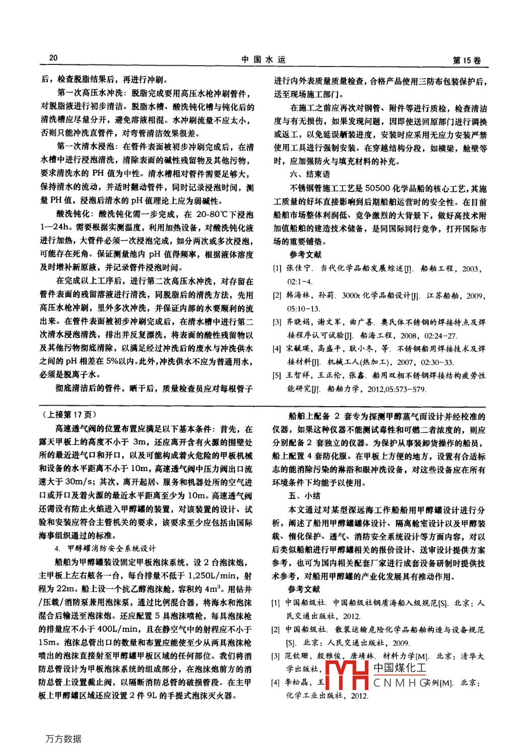 第15卷第8期中國(guó)水運(yùn)No 82015年8月China Water TransportAugust 2015船用甲醇罐設(shè)計(jì)金庫(kù),劉久軍,吳慶(中船重工(武漢)船舶與海洋工程裝備設(shè)計(jì)有限公司,湖北武漢430060)摘要:結(jié)合某型深遠(yuǎn)海工作船甲醇罐開(kāi)發(fā)設(shè)計(jì)情況,闡述了船用甲醇罐強(qiáng)度計(jì)算模式、甲醇卸載與安全防護(hù)系統(tǒng)設(shè)計(jì),對(duì)后續(xù)同類(lèi)型船舶的船用甲醇罐設(shè)計(jì)及布置提供了指導(dǎo)。關(guān)鍵詞:船舶;甲醇罐;甲醇系統(tǒng)中圖分類(lèi)號(hào):TQ223.121文獻(xiàn)標(biāo)識(shí)碼:A文章編號(hào):1006-7973(2015)08-001504隨著海洋資源的開(kāi)發(fā)與利用以及國(guó)家的深海發(fā)展戰(zhàn)略引2.甲醇系統(tǒng)的要求導(dǎo),深海鉆井作業(yè)的活動(dòng)還漸增多,為保證深海鉆井作業(yè)安(1)甲醇的裝載由岸上的裝貨設(shè)施完成,甲醇的卸載由全進(jìn)行,甲醇作為作業(yè)過(guò)程中不可或缺的水合物抑制劑,在船上配備的甲醇泵完成。海工行業(yè)的需求也越來(lái)越多。這就對(duì)深遠(yuǎn)海工作船的設(shè)計(jì)提(2)甲醇罐通道與甲醇罐里需配備惰性氣體保護(hù)系統(tǒng)出了配備甲醇裝載運(yùn)輸系統(tǒng)的要求。由于甲醇易燃易爆(閃(3)甲醇罐透氣系統(tǒng)采用高速排氣方式,裝備高速透氣點(diǎn)12℃),屬于有毒有害液體物質(zhì),在進(jìn)行甲醇裝載運(yùn)輸系閥統(tǒng)設(shè)計(jì)時(shí)其安全性是考慮的重點(diǎn),而且船舶行業(yè)規(guī)范規(guī)則對(duì)(4)甲醇罐透氣管應(yīng)聯(lián)至惰性氣體系統(tǒng)。其要求也更加嚴(yán)格。(5)甲醇罐采用雷達(dá)式遙控測(cè)深。由于目前國(guó)內(nèi)現(xiàn)有近海供應(yīng)船大多未設(shè)置專(zhuān)用甲醇罐,(6)甲醇裝載管系與船上鉆井壓載水系統(tǒng)連接對(duì)這一領(lǐng)域的研究不多,因此需要進(jìn)行開(kāi)發(fā)設(shè)計(jì)。在進(jìn)行設(shè)(7)甲醇罐液貨艙區(qū)配備消防安全系統(tǒng)。計(jì)時(shí),以化學(xué)品運(yùn)輸船舶相關(guān)規(guī)范作為設(shè)計(jì)依據(jù),但是也考(8)裝卸管路均采用不銹鋼材料,管路采用焊接形式連慮到深遠(yuǎn)海工作船運(yùn)輸?shù)募状紨?shù)量有限這一實(shí)際情況。我們接在船上設(shè)置一個(gè)罐體,給其配備相關(guān)的系統(tǒng),同時(shí)與船舶的(9)在泵、閥和管路上,應(yīng)設(shè)有區(qū)別標(biāo)記,以識(shí)別它們結(jié)構(gòu)和自有系統(tǒng)設(shè)計(jì)相結(jié)合,滿(mǎn)足船東和船級(jí)社的要求。本的用途和它們所服務(wù)的艙。文結(jié)合某型深遠(yuǎn)海工作船船用甲醇罐的實(shí)船設(shè)計(jì),對(duì)船用甲二、甲醇罐罐體設(shè)計(jì)醇罐的設(shè)計(jì)進(jìn)行總結(jié)歸納。1.罐體舾裝設(shè)計(jì)甲醇罐設(shè)計(jì)原則由于甲醇罐體積大,且屬于危險(xiǎn)品艙室,所以在布置時(shí)1.甲醇罐罐體的要求我們考慮到安全性,將其置于船舶主甲板下一個(gè)方形的減搖(1)甲醇罐采用不銹鋼材質(zhì)制作(船東要求)水艙之中。在主甲板上與甲醇罐之間設(shè)置通道,通道做成圍(2)甲醇罐周?chē)荚O(shè)有隔離艙保護(hù)井式結(jié)構(gòu),該通道頂部(主甲板上)和底部(甲醇罐頂部)(3)甲醇罐可作為壓載艙并注入壓載水都設(shè)有一個(gè)凈開(kāi)口大小為600×800mm人孔蓋,人孔蓋下(4)從開(kāi)敞甲板至甲醇罐需設(shè)置2個(gè)通道配直梯到達(dá)甲醇罐底部,直梯寬度應(yīng)不小于400mm。對(duì)于(5)甲醇罐一端設(shè)一個(gè)深井平臺(tái)供應(yīng)船而言,我們?cè)O(shè)置通道時(shí)不應(yīng)與主甲板載貨區(qū)域重(6)甲醇罐內(nèi)部設(shè)置防浪擋板疊,所以在靠近甲醇罐兩端,各設(shè)一個(gè)通道出入口,與船舶表1甲醇罐設(shè)計(jì)要求主甲板兩側(cè)通道交匯,如圖1所示技術(shù)要求互連道設(shè)備容積大于70立方米主殼體材質(zhì)工作壓力內(nèi)壓0.1MPa外壓0O6MP0-5C存儲(chǔ)介質(zhì)設(shè)備安裝形式設(shè)備外形尺寸o2 2X2)m罐體舾裝設(shè)計(jì)收稿日期:2015-06-21中國(guó)煤化工作者簡(jiǎn)介:金庫(kù)(1988-),男,漢族,學(xué)士學(xué)位,工程師,中船重工CNMHG計(jì)有限公司,研究方向?yàn)榇w設(shè)計(jì)。基金項(xiàng)目:國(guó)家發(fā)改委2013年海工裝備研發(fā)及產(chǎn)業(yè)化項(xiàng)目資助。中國(guó)水運(yùn)第15卷在甲醇罐內(nèi)部,沿長(zhǎng)度方向每隔2m設(shè)置一個(gè)防浪擋板減緩甲醇在罐內(nèi)的晃蕩,但該設(shè)置不會(huì)影響裝卸甲醇時(shí)甲醇M.=21+k)E2416+N.m在罐體內(nèi)部的流動(dòng)性。為便于甲醇泵將甲醇抽離甲醇罐,需在甲醇罐一端設(shè)置一個(gè)深井圓筒支座處橫截面彎矩我們把甲醇罐設(shè)計(jì)為成套設(shè)備,所以在其罐體上還應(yīng)該配備不銹鋼的人孔蓋、直梯、甲醇泵基座、甲醇加載口/卸載口、2AL-=103e+08N·mm傳感器法蘭座、透氣口、惰性氣體加注口等與甲醇系統(tǒng)配套的接口,且均因采用不銹鋼材質(zhì)。這些接囗的位置都設(shè)置在左右由此可得最危險(xiǎn)截面為中間界截面。根據(jù)圓筒材料,可舷圍井區(qū)域內(nèi),可有效減小貨物區(qū)域的范圍,同時(shí)也便于檢修查得材料甲醇罐制作完成后其不銹鋼表面需酸洗鈍化處理。設(shè)計(jì)溫度下許用壓縮應(yīng)力[L=8032