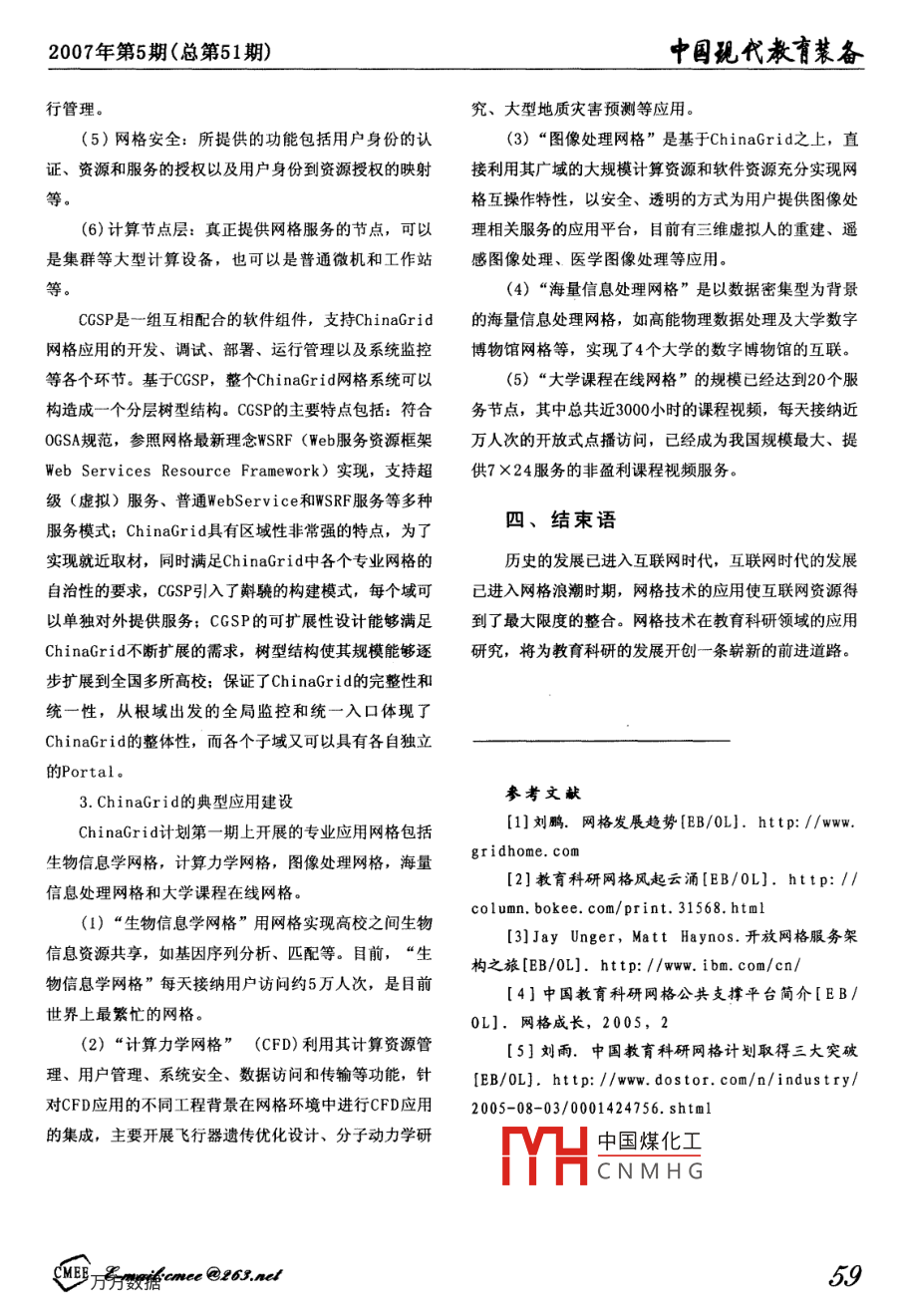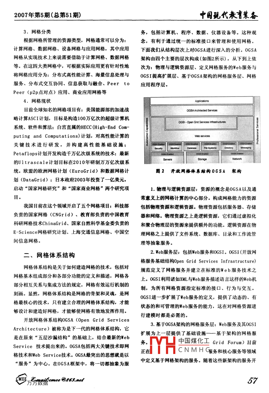 中國璣代彖有裝備2007年第5期(總第51期)網(wǎng)格技術(shù)的教育應(yīng)用王琳刁永鋒西華師范大學(xué)四川南充637002)摘要:網(wǎng)格是因特網(wǎng)應(yīng)用的新發(fā)展,是繼因特網(wǎng)之后的第三次互聯(lián)網(wǎng)浪潮,是“下一代因特網(wǎng)”。本文概述了網(wǎng)格技術(shù)的有關(guān)內(nèi)容,介紹了開放網(wǎng)格體系結(jié)構(gòu)0GSA,論述了我國教育科研網(wǎng)格 Chinagrid及中國教育科研網(wǎng)格公共支撐平臺CGSP。關(guān)健詞:網(wǎng)格0 GSa ChinaGrid CGSP互聯(lián)網(wǎng)經(jīng)歷了三個大的時期,第一個時期為源,正如電力網(wǎng)為千家萬戶供電一樣,用戶不必關(guān)心使Internet時期,第二個時期為Web時期,第三個,被稱的電力來源于何處(三峽水庫還是大亞灣核電站),或為下一代的 Internet-Grid,網(wǎng)格時期。這三個主以何種方式產(chǎn)生(水力發(fā)電、火力發(fā)電或核能發(fā)電),而流時期的演變及區(qū)別如圖1所示。只需接通電源即可獲得源源不斷的電力供應(yīng)。目前網(wǎng)格權(quán)威的定義是2001年堪稱世界網(wǎng)格之父[1965年到現(xiàn)在1980年到現(xiàn)在1993年到現(xiàn)在Ian Foster對網(wǎng)格的定義:動態(tài)多機構(gòu)虛擬組織中的Internet計算機的連通|網(wǎng)頁的連通資源的全面連通和共享資源共享和協(xié)同問題的解決。網(wǎng)格的全部核心就是分布Grid:∥2式計算與資源管理,網(wǎng)格的實質(zhì)就是共享與協(xié)作,共享是基礎(chǔ),協(xié)作是結(jié)果。沒有開放資源(包括硬件和軟圖1互連網(wǎng)主流的演變件),就不可能有共享,協(xié)作也就成了泡影。如果說傳統(tǒng)互聯(lián)網(wǎng)實現(xiàn)了計算機硬件的連通,萬維2.網(wǎng)格特征網(wǎng)實現(xiàn)了全球網(wǎng)頁的連通,網(wǎng)格技術(shù)則是要利用互聯(lián)網(wǎng)簡單地講,網(wǎng)格是把整個因特網(wǎng)整合成一臺巨大的把分散在不同地理位置的計算機、硬件設(shè)備、軟件、數(shù)超級計算機,實現(xiàn)計算資源、存儲資源、數(shù)據(jù)資源、信據(jù)等資源組織成一臺“虛擬的超級計算機”。息資源、軟件資源、通信資源、知識資源、專家資源等的全面共享和協(xié)同。當(dāng)然,網(wǎng)格并不一定非要這么大、網(wǎng)格概況我們也可以構(gòu)造地區(qū)性的網(wǎng)格、企事業(yè)內(nèi)部網(wǎng)格、局域網(wǎng)格來源網(wǎng)網(wǎng)格,甚至家庭網(wǎng)格和個人網(wǎng)格。網(wǎng)格的根本特征不網(wǎng)格(Grid)概念產(chǎn)生于上世紀(jì)90年代中期,是是它的規(guī)模,而是資源共享,消除資源孤島。網(wǎng)格的技從電力網(wǎng)( Power grid)概念借鑒過來的,網(wǎng)格把分術(shù)特征包括:布在各地的計算機連接起來,讓不同用戶分享網(wǎng)上資◆資源共享、協(xié)同工作M凵中國煤化工控制、非平凡服務(wù)質(zhì)收稿日期:2006-11-01CNMHG作者簡介:王琳,研究生。刁永鋒,教授,碩士生導(dǎo)師◆動態(tài)功能、開放系統(tǒng)?!に拇ㄊ】萍紡d重點科研項目資助(05JY029-093)562maitemee @net2007年第5期(總第51期)中目代盲萊備3.網(wǎng)格分類務(wù),包括計算機、程序、數(shù)據(jù)、儀器設(shè)備等。這種觀根據(jù)網(wǎng)格所管理的資源類型,網(wǎng)格通常可以分為:念,有利于通過統(tǒng)一的標(biāo)準(zhǔn)接口來管理和使用網(wǎng)格。計算網(wǎng)格、數(shù)據(jù)網(wǎng)格、設(shè)備網(wǎng)格與應(yīng)用網(wǎng)格,其中應(yīng)用下面我們從結(jié)構(gòu)層次上對OGSA進行深入的分析。OGSA網(wǎng)格從實現(xiàn)技術(shù)上來說需要借助于計算網(wǎng)格、數(shù)據(jù)網(wǎng)格架構(gòu)由四個主要的層次構(gòu)成(如圖2所示),從下到上依等。在這四大類網(wǎng)格中,可根據(jù)實際應(yīng)用更有針對性地次為:物理與邏輯資源層、定義網(wǎng)格服務(wù)的Web服務(wù)與將網(wǎng)格應(yīng)用分為:分布式高性能計算、海量信息處理與oGs提高擴展層、基于0GSA架構(gòu)的網(wǎng)格服務(wù)層、網(wǎng)格服務(wù)、分布式交互協(xié)同、信息獲取與融合、 Peer to應(yīng)用程序?qū)?。Peer(p2p點對點)應(yīng)用、商業(yè)應(yīng)用網(wǎng)格等網(wǎng)格現(xiàn)狀目前全球知名的網(wǎng)格項目有:美國能源部的加速戰(zhàn)OGSAAchdeded Servces略計算ASCI計劃,目標(biāo)是構(gòu)造100萬億次的超級計算機OGSI Open Gnd Servces ntrastrucres系統(tǒng)、軟件和算法:白宮直屬的HECC(High- End Com-puting and computations)計劃,對高性能計算的Web sorces關(guān)鍵技術(shù)進行研發(fā),并構(gòu)建高性能基礎(chǔ)設(shè)施;Petaflops計劃開發(fā)構(gòu)造千萬億次級系統(tǒng)的技術(shù);最新的 UItrascale計劃目標(biāo)在2010年研制萬萬億次級系統(tǒng)。歐盟的歐洲網(wǎng)格計劃( Eurogrid)和數(shù)據(jù)網(wǎng)格計圖2開放網(wǎng)格體系站構(gòu)0GSA架構(gòu)劃( DataGrid);日本政府2003年投資了一億美元,啟動“國家網(wǎng)格研究”和“國家商業(yè)網(wǎng)格”兩個研究項1.物理與邏輯資源層:資源的概念是0GSA以及通目常意義上的網(wǎng)格計算的中心部分。構(gòu)成網(wǎng)格能力的資源我國目前在這個領(lǐng)域開啟了五個網(wǎng)格項目:科技部包括物理資源和邏輯資源。物理資源包括服務(wù)器、存儲負(fù)責(zé)的國家網(wǎng)格( CNGrid)、教育部負(fù)責(zé)的中國教育器