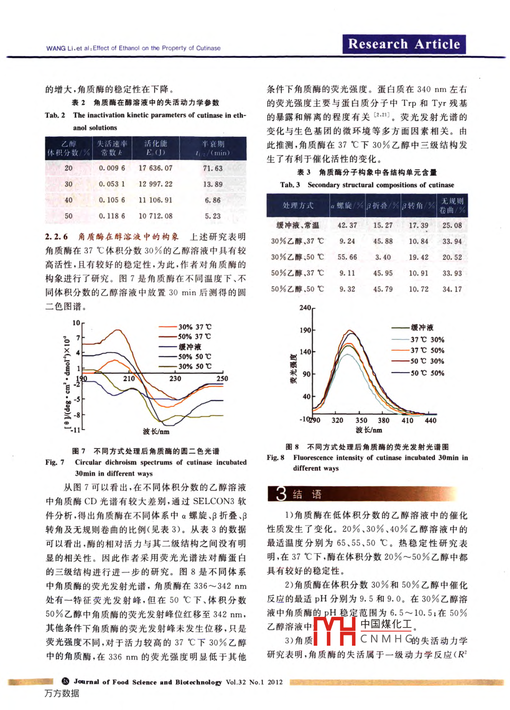 研究論文乙醇對(duì)角質(zhì)酶性質(zhì)的影響王莉,王淼k」,2(1.江南大學(xué)食品學(xué)院,江蘇無(wú)錫214122:2,食品科學(xué)與技術(shù)國(guó)家重點(diǎn)實(shí)驗(yàn)室,江南大學(xué),江蘇無(wú)錫214122)摘要:研究了乙醇溶液對(duì)角質(zhì)酶性質(zhì)的影響,同時(shí)用圓二色光譜和熒光光譜法對(duì)經(jīng)過(guò)硫酸銨沉淀、鎳柱親和層析等方法獲得的電泳純角質(zhì)酶進(jìn)行了構(gòu)象研究。結(jié)果表明,在體積分?jǐn)?shù)40%30%和20%乙醇溶液中角質(zhì)酶催化反應(yīng)的最適溫度分別為50、55和65℃;在37℃下,酶在體積分?jǐn)?shù)20%~50%乙醇中具有較妤的穩(wěn)定性,體積分教30%和40%乙醇對(duì)角質(zhì)酶具有激活作用;角質(zhì)酶在體積分?jǐn)?shù)30%和50%乙醇中催化反應(yīng)的最適pH分別為9.5和9.0;在體積分?jǐn)?shù)30%乙醇溶液中角質(zhì)酶的pH穩(wěn)定范圍為6.5~10.5。角質(zhì)酶在50℃的乙醇溶液中的失活動(dòng)力學(xué)研究表明,角質(zhì)酶的失活屬于一級(jí)動(dòng)力學(xué)反應(yīng)(R2>0.98)。從角質(zhì)酶構(gòu)象的研究結(jié)果可以看出,在乙醇體系中角質(zhì)酶的二級(jí)結(jié)構(gòu)和三級(jí)結(jié)構(gòu)都發(fā)生了相應(yīng)的變化,關(guān)鍵詞:角質(zhì)酶;乙醇;酶學(xué)性質(zhì);構(gòu)象中圖分類(lèi)號(hào):Q814.9文獻(xiàn)標(biāo)識(shí)碼:A文章編號(hào):1673-1689(2012)01-033-07Effect of Ethanol on the property of CutinaseWANG Li, WANG Miao“l(fā)2(1. The School of Food Science and Technology, Jiangnan University, Wuxi 214122, China: 2. State Key Laboratory of FoodScience and Technology, Jiangnan University, Wuxi 214122. China)Abstract: In this manuscript, effect of ethanol solutions on the biochemical property and conformation of cutinase were studied. The results showed that the optimum temperatures of cuti-nase were 65C, 55 C and 50 C respectively in 20%(V/V), 30% and 40% ethanol solutions.In 20% and 50% ethanol solutions cutinase was stable at 37C. In 30% and 50% ethanol solu-tions the optimum ph of cutinase were 9. 5 and 9. 0 respectively. In 30% ethanol solution theph stability range of cutinase was 6.. 5. In 30% and 40% ethanol solutions activity ofcutinase at 37 C was enhanced. The inactivation kinetic of cutinase was researched in ethanolsolutions at 50C. The results showed that the inactivation kinetic of cutinase in ethanol solu-tions followed the first order reaction(R2>0. 98). And the secondary and the tertiary structureconformations greatly changed in ethanol solutiods.Key words: cutinase, ethanol, enzymatic property, conformation生物酶作為高效的生物催化劑,傳統(tǒng)意義上是的催化反應(yīng)已經(jīng)倍受關(guān)注,酶學(xué)領(lǐng)域也有了一個(gè)全在水溶液中進(jìn)行的,但是,目前對(duì)其在有機(jī)溶液中新的分支一非水酶學(xué)(21。通常認(rèn)為在極性溶劑中中國(guó)煤化工收稿日期:2011-03-23基金項(xiàng)目:國(guó)家自然科學(xué)基金項(xiàng)目(20776063);國(guó)家計(jì)劃863項(xiàng)目(2011AA100905)CNMHG通倌作者:王森(1962-),女,江蘇無(wú)錫人,工學(xué)博士,教授博士研究生導(dǎo)師,主要從事食品生物化學(xué)方面的研究Email:mwang@jiangnan.edu.cn食品與生物技術(shù)學(xué)報(bào)2012年第32第1期WANG LI, et al, Effect of Ethanol on the Property of CutinaseResearch article酶的穩(wěn)定性較差,大部分非水相酶反應(yīng)均被限制于13試驗(yàn)方法相對(duì)非極性的溶劑中。一方面非極性溶劑利于提1.3.1pNPB水解酶活力的測(cè)定分光光度法。高酶的穩(wěn)定性,另一方面,在非極性溶劑中酶易于酶活在20℃下測(cè)定,反應(yīng)體積為1mL,其含20μL保持其活性構(gòu)象而表現(xiàn)出高的催化活力。極性有酶液、50mmol/L對(duì)硝基苯丁酸酯和50mmol/L硫機(jī)溶劑會(huì)爭(zhēng)奪酶分子表面的結(jié)構(gòu)水,使酶失活。因磺脫氧膽酸鈉pH為80的緩沖液980μL。在405此,對(duì)酶在有機(jī)溶劑中性質(zhì)及穩(wěn)定性的研究主要集mm記錄對(duì)硝基酚的生產(chǎn)速率。酶活定義:20℃下,中與非極性溶劑中3,4。每分鐘催化對(duì)硝基苯丁酸酯水解1μmol對(duì)硝基酚角質(zhì)酶是一種可以降解角質(zhì)并產(chǎn)生大量脂肪的酶量為一個(gè)酶活力單位口1。酸單體的水解酶,是a/B水解酶家族中相對(duì)分子質(zhì)1.3.2酶的分離與純化將發(fā)酵液于4℃量較小的成員,其活性中心含有典型的催化三元組10000r/min離心20min去除菌體,上清液經(jīng)質(zhì)量Ser1o、His1、Aspn5),具有酯酶和脂肪酶的功分?jǐn)?shù)50%的硫酸銨鹽析,4℃、1000r/min離心能。角質(zhì)酶可降解不溶性甘油三酯、可溶性酯和20min,得沉淀并透析,經(jīng)0.45m的濾紙微濾,然角質(zhì)等聚酯,也能破壞角質(zhì)多聚物分子的酯鍵使其后經(jīng)鎳柱進(jìn)行親和層析得純酶制品。水解為單體和小分子寡聚體6-。它作為一種多功1.3.3蛋白質(zhì)含量測(cè)定福林酚法。能水解酶,在食品、化工及紡織等諸多領(lǐng)域都具有L3.4 SDA-PAGE分析分離膠質(zhì)量濃度為12廣泛的應(yīng)用g/dL,濃編膠質(zhì)量濃度為2.5g/dL,電泳采用pH目前,國(guó)內(nèi)關(guān)于角質(zhì)酶的研究較少,國(guó)外對(duì)角8.3的 Tris-HO1緩沖體系,電泳后用考馬斯亮藍(lán)質(zhì)酶的研究大多集中于酶學(xué)性質(zhì)結(jié)構(gòu)以及生產(chǎn)菌G250染色株構(gòu)建、以及酶在反膠束體系中的性質(zhì)及應(yīng)1.3.5角質(zhì)酶性質(zhì)的研究角質(zhì)酶性質(zhì)研究