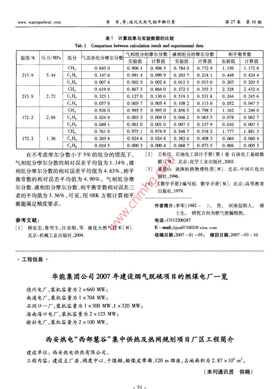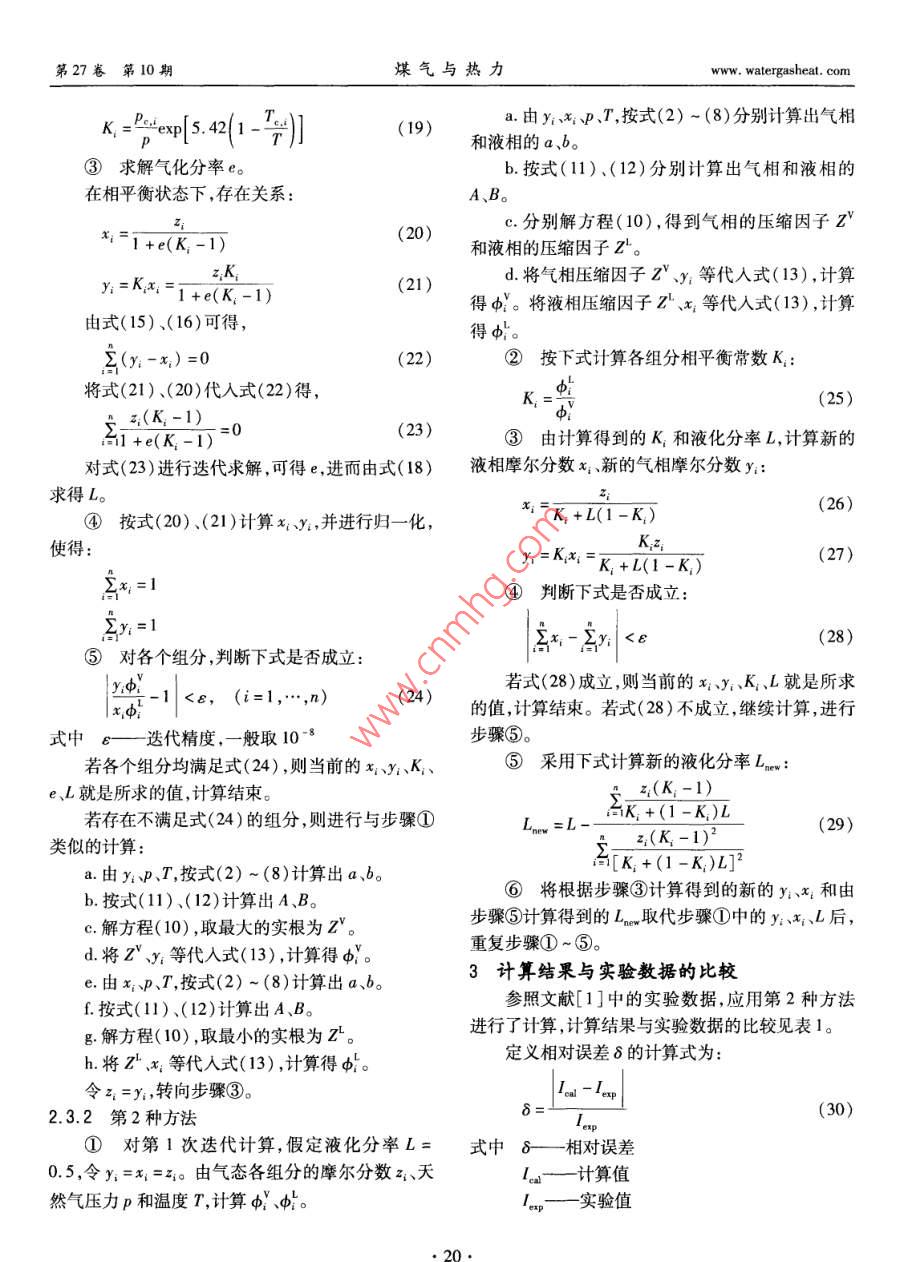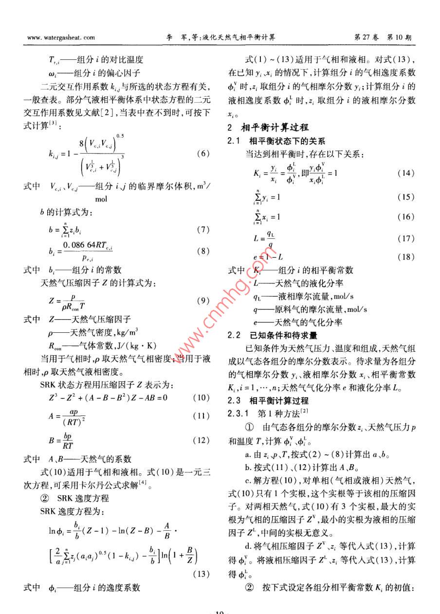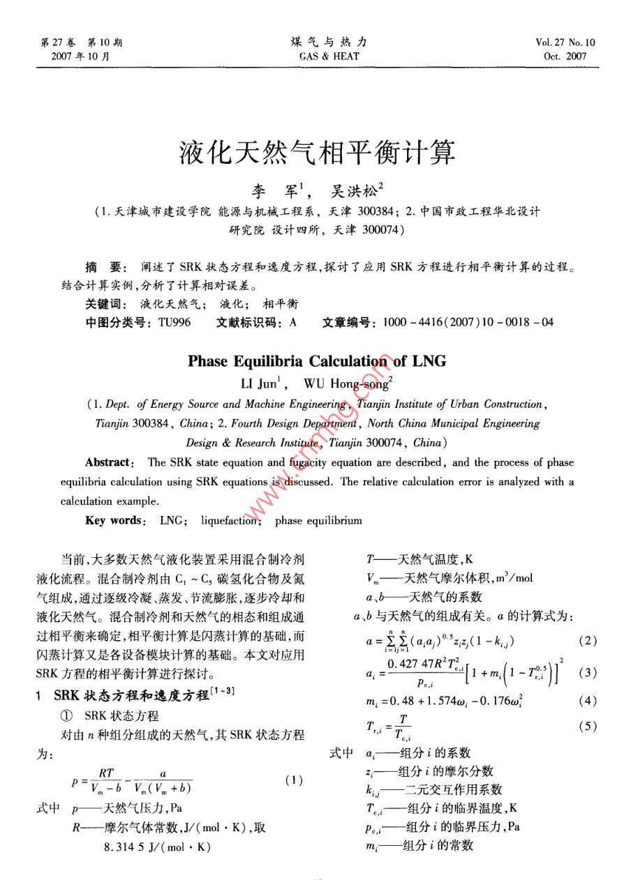 第27卷第10期煤氣與熱力Vol 27 No 102007年10月GAs heat0ct.2007液化天然氣相平衡計(jì)算李軍1,吳洪松2(1.天津城市建設(shè)學(xué)院能源與機(jī)械工程系,天津300384;2.中國(guó)市政工程華北設(shè)計(jì)研究院設(shè)計(jì)四所,天津300074)摘要:闡述了SRK狀態(tài)方程和逸度方程,探討了應(yīng)用SRK方程進(jìn)行相平衡計(jì)算的過(guò)程。結(jié)合計(jì)算實(shí)例,分析了計(jì)算相對(duì)誤差。關(guān)鍵詞:液化天然氣;液化;相平衡中圖分類(lèi)號(hào):TU996文獻(xiàn)標(biāo)識(shí)碼:A文章編號(hào):1000-4416(2007)10-0018-04Phase Equilibria Calculation of LNGLI Jun, WU Hong-song2(1. Dept. of Energy Source and Machine Engineering, Tianyin Institute of Urban Construction,Tianyin 300384, China; 2. Fourth Design Department, North China Municipal EngineeringDesign Research Institute, TiLanyin 300074, chinaAbstract: The SRK state equation and fugacity equation are described, and the process of phaseuilibria calculation using SRK equations is discussed. The relative calculation error is analyzed with acalculation exampleKey words: LNG; liquefaction; phase equilibrium當(dāng)前,大多數(shù)天然氣液化裝置采用混合制冷劑T——天然氣溫度,K液化流程?;旌现评鋭┯蒀1~C5碳?xì)浠衔锛暗獀——天然氣摩爾體積,m3/mol氣組成,通過(guò)逐級(jí)冷凝、蒸發(fā)、節(jié)流膨脹,逐步冷卻和a、b—天然氣的系數(shù)液化天然氣。混合制冷劑和天然氣的相態(tài)和組成通a、b與天然氣的組成有關(guān)。a的計(jì)算式為過(guò)相平衡來(lái)確定,相平衡計(jì)算是閃蒸計(jì)算的基礎(chǔ),而(2)閃蒸計(jì)算又是各設(shè)備模塊計(jì)算的基礎(chǔ)。本文對(duì)應(yīng)用E(a)5(1-6)0.42747R272SRK方程的相平衡計(jì)算進(jìn)行探討。(3)1SRK狀態(tài)方程和逸度方程-3m:=0.48+1.574a;-0.176①SRK狀態(tài)方程對(duì)由n種組分組成的天然氣,其SRK狀態(tài)方程T(5)為式中a—組分i的系數(shù)z—組分i的摩爾分?jǐn)?shù)P= V(V +b二元交互作用系數(shù)式中p——天然氣壓力,PaT—組分i的臨界溫度KR—摩爾氣體常數(shù),J/(mol·K),取組分i的臨界壓力,P8.3145J(mol·K)m:組分i的常數(shù)w, watergasheat com李軍,等:液化天然氣相平衡計(jì)算第27卷第10期T—組分i的對(duì)比溫度式(1)~(13)適用于氣相和液相。對(duì)式(13)組分i的偏心因子在已知y、x的情況下,計(jì)算組分i的氣相逸度系數(shù)元交互作用系數(shù)k與所選的狀態(tài)方程有關(guān),d時(shí),x取組分i的氣相摩爾分?jǐn)?shù)y;計(jì)算組分i的一般查表。部分氣液相平衡體系中狀態(tài)方程的二元液相逸度系數(shù)時(shí),取組分i的液相摩爾分?jǐn)?shù)交互作用系數(shù)見(jiàn)文獻(xiàn)[2],當(dāng)表中查不到時(shí),可按下x,。式計(jì)算32相平衡計(jì)算過(guò)程8 VV2.1相平衡狀態(tài)下的關(guān)系當(dāng)達(dá)到相平衡時(shí),存在以下關(guān)系(14)x式中V.、V組分的臨界摩爾體積,m3sy(15)b的計(jì)算式為∑x1=1(16)(7)0.08664RTb式中b—組分i的常數(shù)式中K—組分i的相平衡常數(shù)天然氣壓縮因子Z的計(jì)算式為L(zhǎng)—天然氣的液化分率(9)—液相摩爾流量,mo/sq——原料氣的摩爾流量,mols式中Z—天然氣壓縮因子天然氣的氣化分率p天然氣密度,kg/m32.2已知條件和待求量R氣體常數(shù),J/(kg·K)已知條件為天然氣壓力、溫度和組成,天然氣組當(dāng)用于氣相時(shí),p取天然氣氣相密度;當(dāng)用于液成以氣態(tài)各組分的摩爾分?jǐn)?shù)表示。待求量為各組分相時(shí),p取天然氣液相密度。的氣相摩爾分?jǐn)?shù)y、液相摩爾分?jǐn)?shù)x1、相平衡常數(shù)SRK狀態(tài)方程用壓縮因子Z表示為:K1,i=1,…,n;天然氣氣化分率e和液化分率L。z3-z2+(A-B-B2)Z-AB=0(10)2.3相平衡計(jì)算過(guò)程A(11)2.3.1第1種方法(21(RT)①由氣態(tài)各組分的摩爾分?jǐn)?shù)z1天然氣壓力pB(12)和溫度T,計(jì)算小。式中A、B—天然氣的系數(shù)由xP、T按式(2)~(8)計(jì)算出a、b。式(10)適用于氣相和液相。式(10)是一元三b.按式(11)、(12)計(jì)算出A、B。次方程,可采用卡爾丹公式求解c.解方程(10),對(duì)單相(氣相或液相)天然氣②SRK逸度方程式(10)只有1個(gè)實(shí)根,這個(gè)實(shí)根等于該相的壓縮因SRK逸度方程為子。對(duì)兩相天然氣,式(10)有3個(gè)實(shí)根,最大的實(shí)根為氣相的壓縮因子z,最小的實(shí)根為液相的壓縮Ind,=1(Z-1)-In(Z-B)AB因子Z,中間的實(shí)根無(wú)意義。24(1-,)-](1+2d將氣相壓縮因子z、x1等代入式(13),計(jì)算得。將液相壓縮因子z、x1等代入式(13),計(jì)算(13)得小式中d,組分i的逸度系數(shù)②按下式設(shè)定各組分相平衡常數(shù)K的初值:第27卷第10期煤氣與熱力www.watergasheat.comexp|5.421-(19)a.由y、x;、P、T,按式(2)~(8)分別計(jì)算出氣相和液相的a、b。③求解氣化分率e。b.按式(11)、(12)分別計(jì)算出氣相和液相的在相平衡狀態(tài)下,存在關(guān)系:A、B1+e(K1-1)(20)c.分別解方程(10),得到氣相的壓縮因子2和液相的壓縮因子z。Ky=Kx1+e(K:-1)(21)d.將氣相壓縮因子zY、y;等代入式(13),計(jì)算得。將液相壓縮因子Z、x1等代入式(13),計(jì)算由式(15)、(16)可得,得小?!?y,-x2)=0(22)②按下式計(jì)算各組分相平衡常數(shù)K將式(21)、(20)代入式(22)得(25)z(K:-1)1+e(K-1)0(23)③由計(jì)算得到的K和液化分率L,計(jì)算新的對(duì)式(23)進(jìn)行迭代求解,可得e,進(jìn)而由式(18)液相摩爾分?jǐn)?shù)x新的氣相摩爾分?jǐn)?shù)y求得L。K+L(1-K(26)④按