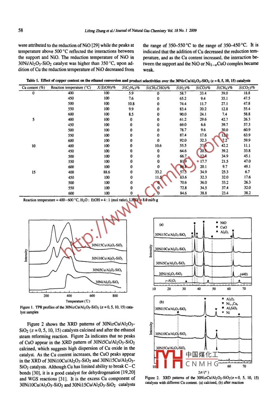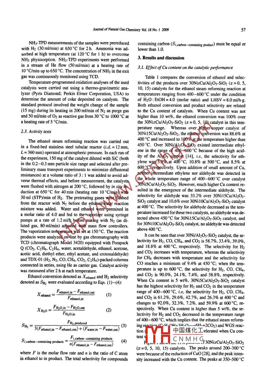 Availableonlineatwww.sciencedirect.comScience DirectNATURAL GASCHEMISTRYELSEVIERJoumal of Natural Gas Chemistry 18(2009)55:www.elsevier.com/locate/jngEthanol steam reforming over Ni-Cu/A12O3-MyO2M=Si, La, Mg,and zn) catalystsLifeng Zhang, Jie Liu, Wei Li, Cuili Guo, Jinli ZhangSchool of Chemical Engineering and Technology Tianjin University Tianjin 300072, ChinaManuscript received September 17, 2008; revised December 11, 2008AbstractNi-based catalysts doped with copper additives were studied on their role in ethanol steam reforming reaction. The effects of Cu content,upport species involving Al2O3-SiO2, Al2O3-MgO, Al2O3-ZnO, and Al2O3-La2O3, on the catalytic performance were studied. Characteriza-ons by TPR, XRD, NH3-TPD, XPS, and TGA indicated that catalysts 30Ni5Cw/Al2O3-MgO and 30NiSCwAl2O3-Zno have much higher Hselectivity than 30Ni5Cu/Al2O3-SiOz, as well as good coke resistance. H] selectivity for 30NiSCwAlO3- MgO catalyst was 73. 3%at 450Cand increased to 94.0% at 600C, whereas for 30Ni5Cu/Al2O3-Zno catalyst, the H2 selectivity was 63.6% at 450C and 95.2% at 600C.These AlO3-Mg0 and Al2O3-ZnO supported Ni-Cu bimetallic catalysts may have important applications in the production of hydrogen byethanol steam reforming reactionsKey words: ethanol steam reforming; nickel-copper- based catalyst; Al2O3-SiOz support; Al2O3-MgO support; Al2O3-ZnO support; Al2 O3-a203 support1. Introductioninto CO2 through the water-gas shift(wGS)reaction [4]Along with the increasing demand for carbon-neutralTo improve the production of hydrogen, transition met-and zero-emission alternative fuels, considerable attention haals involving Ni [51, Co [6,7], PL, Pd, and Rh [1, 8-10] havebeen paid to transform the biomass-derived compounds into been reported to show good activity and selectivity for ethanolhydrogen-rich gas. Among such compounds, bioethanol ob. steam reforming reactions. Especially, nickel is widely usedtained by biomass fermentation is of particular interest be. as the catalytic component for hydrogenation and dehydro-cause of the increasing availability of raw material, ease of genation reactions because of its high activity to break C-chandling in the liquid state, high hydrogen content, and lotbonds and the relatively low cost. However, there exists se-toxicity [1.2]. Hydrogen can be produced by following the vere catalyst deactivation by sintering or carbon depositionoverall steam reforming reaction of ethanol [3][11-13]over Ni-based catalyst. The secondary metal speciesis added into Ni-based catalysts so as to promote the cokingCH3CH20H+3H20-6H2+2C02 AH98=+347. 4 kJ/mol resistance. For instances, Vizcaino reported that the additionof Cu into Sio -supported Ni-based catalysts could reduceThe thermodynamic favorable ethanol steam reforming CO generation and improve coke resistance in the steam re-reaction includes several catalytic steps as follows: (i)the de- forming reaction of ethanol [14]. Marino et al. [15-18re-hydrogenation or dehydration reaction of ethanol; (ii)the de- ported that Cu/Ni/K/y-Al2O3 catalyst showed acceptable ac-hydrogenation reaction produces acetaldehyde as the interme- tivity, stability, and selectivity for hydrogen at 300C in thediate product that can be transferred to CO and CHa through steam reforming reaction of bioethanol. It is considered thatcarbon-carbon(C-C)bond breaking, and the dehydration re- Cu has limited steam reforming activity but good activity inaction produces ethylene that can be easily transformed into dehydrogenation [19, 20] and WGS reactioncarbon deposition; and (ii)methane can generate hydrogenAmong the oxide supports, alumina-based supports areand carbon monoxide by steam reforming reaction while the often used in reforming catalysts because of their mechanicalgenerated carbon monoxide can be subsequently transformed and中國煤化工 conditions. WhereasCorresponding author. Tel: +86-22-27890643; Fax: +86-22-27890643: E-mail: zhanundation items: 973 Program(2006CB202500), the National Natural ScienceCNMHntury Excellent Talents inpyright 02009, Dalian Institute of Chemical Physics, Chinese Academy of Sciences, All nights reserveddoi:l0.0l6S1003-99Lifeng Zhang et al/ Joumal of Natural Gas Chemistry Vol 18 No. I 2009over the support of Al2O3, catalyst deactivationoccurs prepared by precipitation-impregnation method using a com-by carbon deposition through the ethylene intergener- mercial ?-Al2O3 powder(SBET=177 m/g, Tianjin R&D Inated via the dehydration reactions of ethanolhe basic stitute of Chemical Industry, China). In all experiments, theadditives or promoters, which are beneficial to water adsorp- weight ratio of M, O2 /Al2O was fixed at 0.25 in the mixedtion and -OH surface mobility, have been extensively stud- supports. A stoichiometric amount of 0.1 M La(NO3)3so-led to improve the coke resistance of Al2O3-supported cata- lution, 0. 1 M Mg(NO3) solution, or 0.1 M Zn(NO3)solulysts. For example, alkali and alkali earth metal oxides, such tion was added to 0. 1 M H2N-CO-NH2 solution by continuas Mgo [21, 22] and solid solution(MgAl204)[23], were re- ously stirring at 100C, respectively, together with introducported to prevent the coke formation on the Ni-based cata- ing y-Al O3 powder at the same time. The obtained solutionlysts. It was reported that MgAl2O4 solid solution could re- was filtered after stirring for 6 h. The filtered solid was thenduce the Ni particle size so as to suppress the coke formation dried at 120C overnight and calcined in air at 650C for 6h[24]. Zno [25] and lanthanide oxides [5] were reported to The mixed supports were ground and the powder sieved topromote the dehydrogenation reaction to acetaldehyde. In ad- 0. 2-0. 3 mm size was used as the catalyst support. they weredition, the support of silica-stabilized alumina was reported designated as Al2O3-M, Ox, where M referred to the elementto improve the activity performance of palladium-supported (Mg, Zn, and La)added into y-Al2O3 carriercatalyst for the combustion of