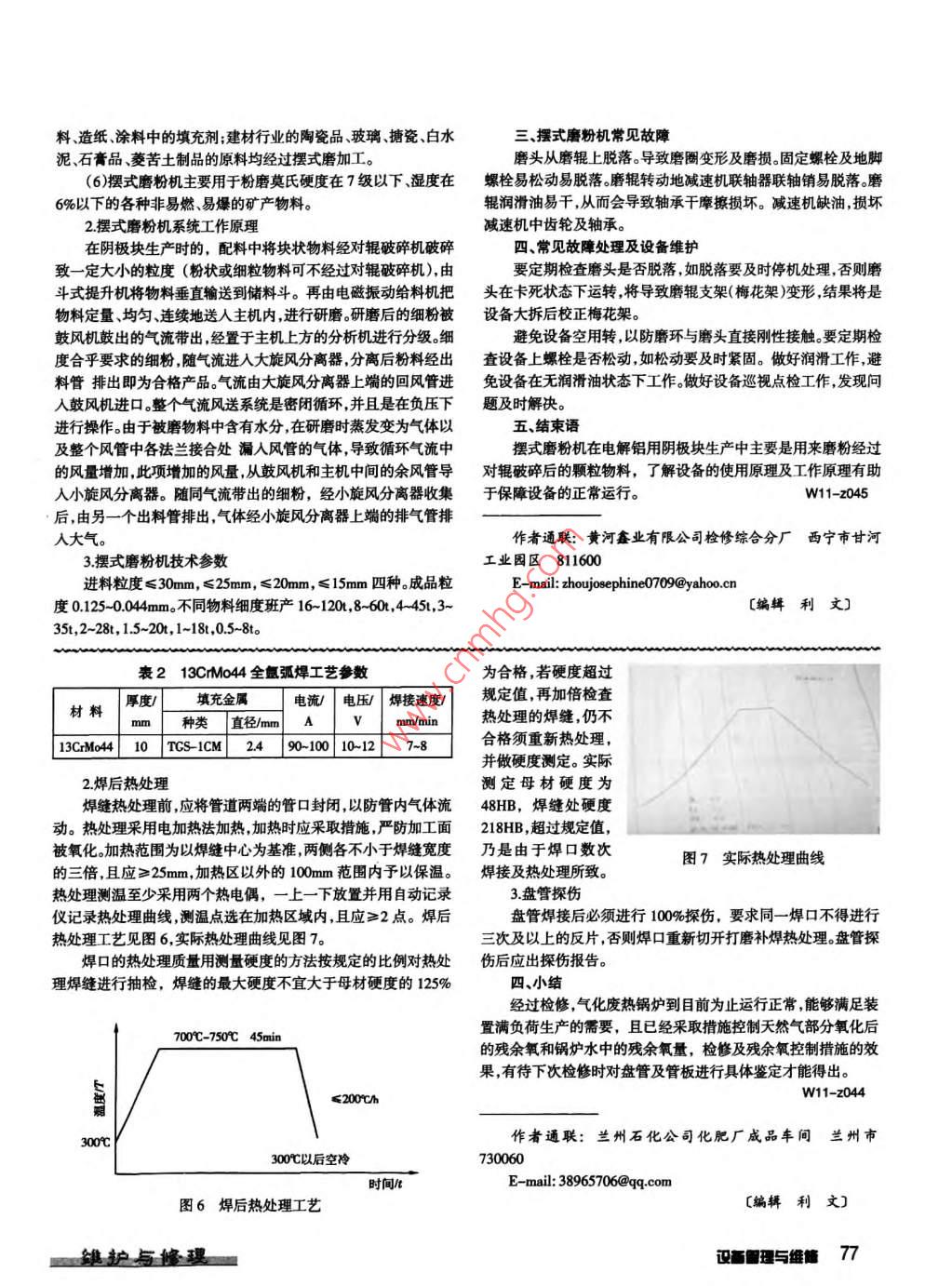 氣化廢熱爐管失效分析及檢修李仰泉吳健摘要分析合成氨裝置謝爾氣化廢熱鍋爐管板及盤(pán)管外表面出現(xiàn)的點(diǎn)狀腐蝕坑及穿孔原因,發(fā)現(xiàn)材料為13CrMo44的盤(pán)管外表面有點(diǎn)狀腐蝕坑及穿孔的原因?qū)儆谖蹼娀瘜W(xué)腐蝕,給出相應(yīng)解決措施和廢熱鍋爐更換盤(pán)管的檢修過(guò)程。關(guān)鍵詞廢熱鍋爐盤(pán)管失效分析檢修中圖分類(lèi)號(hào)U664.58 文獻(xiàn)標(biāo)識(shí)碼一、簡(jiǎn)介.表1材料化學(xué)成分分析結(jié)果(w,%)化肥廠合成氨裝置謝爾氣化廢熱鍋爐CGr系內(nèi)盤(pán)管式鍋爐,分別由6根盤(pán)管螟旋纏繞13C-Mo44 標(biāo)準(zhǔn)t 0.1-0.18 ?0.4-1 0.15-0.35 0.7-1.1 0.4-0.6 1-2 |≤0.3 |≤0.3成內(nèi)外四層,最外層直徑1550mm ,最內(nèi)層直分析數(shù)據(jù)0.130.520.210.810.45.1 | 0.11| 0.02徑600mm,原設(shè)計(jì)將每根盤(pán)管分4次變徑。管板及盤(pán)管材料為13CrMo44(德系材料牌號(hào)),其撓性多層螺旋2.材料金相分析盤(pán)管既增大了換熱面積,同時(shí)又可利用撓性變形來(lái)吸收部分熱從腐蝕坑處沿管子膨脹差。剖面截取式樣進(jìn)行金相以甲烷為主要成分的天然氣、純氧和過(guò)熱蒸汽在氣化爐中檢查,見(jiàn)圖3。燃燒,進(jìn)行部分氧化反應(yīng),其天然氣部分氧化反應(yīng)方程式為:13CrMo44材料正常2CH+Oz 2C0+4H(此反應(yīng)為可逆反應(yīng))。甲烷和蒸汽之間的蒸金相組織應(yīng)為鐵素體+片汽轉(zhuǎn)化反應(yīng)為:CH+H20=C0+3H2(此反應(yīng)為可逆反應(yīng))。狀的珠光體,但是從圖3離開(kāi)氣化爐的粗合成氣溫度約1300-1500C,在廢熱鍋爐中看出,外表面、內(nèi)表面中將其降至350C以下,同時(shí)副產(chǎn)10+0.5MPa的飽和蒸汽。2010及壁厚中部的金相組織圖3材料金相照片200X年1月氣化廢鍋盤(pán)管因外表面出現(xiàn)點(diǎn)狀腐蝕坑和穿孔而失效,基本相同,均為鐵素體+見(jiàn)圖1和圖2。球化的珠光體,珠光體的片狀已不太明顯,屬于中度球化。這是二、失效原因分析材料在長(zhǎng)期高溫工況下運(yùn)行的結(jié)果,珠光體出現(xiàn)球化是正?,F(xiàn)根據(jù)腐蝕坑的宏觀形貌可以確認(rèn),腐蝕坑起3.腐蝕坑形貌微觀分析和表面能譜成分分析源于外表面。管板外表面為了進(jìn)一步研究腐蝕坑及穿孔現(xiàn)象形成的原因,對(duì)其在掃描主要與天然氣部分氧化電鏡下進(jìn)行腐蝕坑形貌的微觀分析和表面能譜成分分析,見(jiàn)圖4。反應(yīng)后的粗合成氣接觸,盤(pán)管外表面主要與鍋爐水接觸,因此失效原因可能與介質(zhì)有關(guān),也可能是由于超溫導(dǎo)致外表面氧圖1盤(pán)管表面點(diǎn)狀腐蝕坑化或局部氣化。因此,主要進(jìn)行材料化學(xué)成分分析;材料金相分析;腐蝕坑形貌微觀分析和表面能譜成分分析。1.材料化學(xué)成分分析材料的化學(xué)成分分析結(jié)果見(jiàn)表1。分析結(jié)果顯示,材料成分符合13CrMo44的標(biāo)準(zhǔn)。圖2管板表面長(zhǎng)期腐蝕沖刷成槽圖4雛護(hù)與修理設(shè)備智理與維德i 75擺式磨粉機(jī)工作原理及常見(jiàn)故障周鑫摘要擺式磨粉機(jī)工作原理, 常見(jiàn)故障及處理辦法。使用過(guò)程中的注意事項(xiàng)。關(guān)鍵詞擺式磨粉機(jī)碾磨磨輥中圖分類(lèi)號(hào)TQ172.633文獻(xiàn)標(biāo)識(shí)碼B- .引言擺式磨粉機(jī)成品粒度按不同要求可在0.125-0.044mm (相當(dāng)于擺式磨粉機(jī)主要用于對(duì)物料進(jìn)行磨粉以便達(dá)到工藝要求,120~325目)范圍內(nèi)調(diào)節(jié)。在生產(chǎn)陰極塊時(shí)主要用擺式磨粉機(jī)對(duì)無(wú)煙煤破碎完后進(jìn)行磨1.擺式磨粉機(jī)適用范圍粉,以便達(dá)到生產(chǎn)工藝要求。在長(zhǎng)期使用過(guò)程中擺式磨粉機(jī)主要(1)土類(lèi)。粘土、瓷土、膨潤(rùn)土菱苦土、陶土與礬土。易損件及易壞件為磨頭,其易從磨輥上脫落導(dǎo)致運(yùn)轉(zhuǎn)過(guò)程中將(2)非金屬礦石類(lèi)。石膏、滑石、石墨、螢石、方解石、石灰石、設(shè)備卡死。紼石、重晶石、磷灰石、硅灰石、長(zhǎng)石與石英。二、擺式磨粉機(jī)概述(3)金屬氧化物類(lèi)。錳鐵礦、鉻鐵礦、鈦鐵礦與鋁礬土。擺式磨粉機(jī)又稱(chēng)懸輥磨或雷蒙磨,是- -種“環(huán)-輥”碾磨結(jié)(4)化工合成物類(lèi)。焦炭石灰焦、冶煉焦及硫酸鋇。合氣流篩選和氣力輸送形式的制粉設(shè)備。擺式磨粉機(jī)屬于圓盤(pán)(5)其他。擺式磨粉機(jī)的產(chǎn)品可用于許多行業(yè),如冶金行業(yè)不動(dòng)型盤(pán)磨機(jī)。擺式磨粉機(jī)是- -種通用性較強(qiáng)的制粉設(shè)備,有干用鎂粉作高爐耐火層;石油開(kāi)采用重晶石粉樂(lè)封噴油口;用膨潤(rùn)法連續(xù)制粉、粒度分布集中、細(xì)度連續(xù)可調(diào)及結(jié)構(gòu)緊湊的特點(diǎn)。土粉漿作為鉆井的潤(rùn)滑劑;化工輕工行業(yè)用不同石粉作橡膠、塑從圖4a和圖4b的低倍放大腐蝕坑中可以明顯看出,廣蝕的時(shí)間超過(guò)4h,下次使用前必須重新烘烤.焊條的烘烤次數(shù)不坑有層狀分裂片,且層與層之間界限相當(dāng)明顯,表明腐蝕坑是經(jīng)應(yīng)超過(guò)三次,焊絲使用前進(jìn)行清理、除銹、除油,焊條堆放層數(shù)以過(guò)多次的層片狀脫落而形成的。圖4e片狀微觀圖呈龜裂狀,說(shuō)不超過(guò)三層為最好。明產(chǎn)物很脆。圖4d坑底疏松處