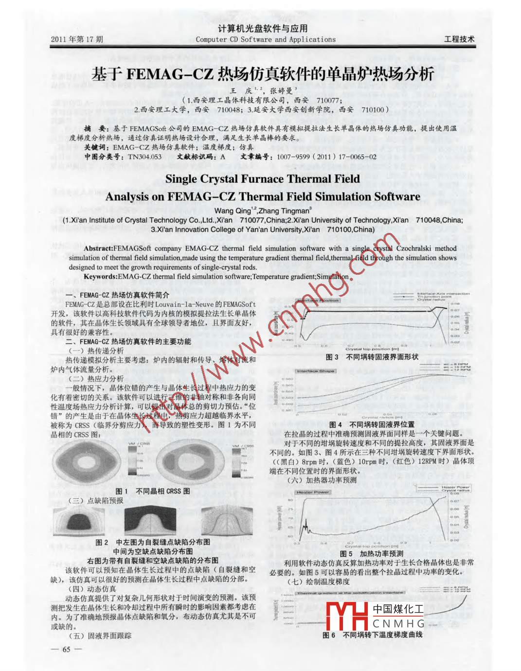 計(jì)算機(jī)光盤軟件與應(yīng)用2011年第17期Computer CD Software and Applications工程技術(shù)基于 FEMAG-CZ熱場(chǎng)仿真軟件的單晶爐熱場(chǎng)分析慶2,張婷曼(1西安理工晶體科技有限公司,西安710072西安理工大學(xué),西安710048;3.延安大學(xué)西安創(chuàng)新學(xué)院,西安710100)摘要:基于 FEMAGSoft公司的EMAG-C乙熱場(chǎng)仿真軟件具有模擬提拉法生長(zhǎng)單晶體的熱場(chǎng)仿真功能,提岀使用溫度梯度分析熱場(chǎng),通過仿真誣明熱場(chǎng)設(shè)計(jì)合理,滿足生長(zhǎng)單晶棒的要求關(guān)健詞:EMAG-CZ熱場(chǎng)仿真軟件;溫度梯度;仿真中圖分類號(hào):TN304.053文獻(xiàn)標(biāo)識(shí)碼:A文章編號(hào):1007-9599(2011)17-0065-02Single Crystal Furnace Thermal FieldAnalysis on FEMAG-CZ Thermal Field Simulation SoftwareWang Qing", Zhang Tingman1. Xi'an Institute of Crystal Technology Co, Ltd. Xi'an 710077, China; 2. Xi'an University of Technology, Xi'an 710048, China3.Xi'an Innovation College of Yan'an University, Xi'an 710100, China)Abstract: FEMAGSoft company EMAG-CZ thermal field simulation software with a single crystal Czochralski methodsimulation of thermal field simulation, made using the temperature gradient thermal field, thermal field through the simulation showsdesigned to meet the growth requirements of single-crystal rodsKeywords: EMAG-CZ thermal field simulation software; Temperature gradient; SimulationFEMAG-Z熱場(chǎng)仿真軟件簡(jiǎn)介FEMAG-CZ是總部設(shè)在比利時(shí) Louvain-1a- Neuve的 FEMAGSoftlevtertacn Ionian開發(fā),該軟件以高科技軟件代碼為內(nèi)核的模擬提拉法生長(zhǎng)單晶體的軟件,其在晶體生長(zhǎng)領(lǐng)域具有全球領(lǐng)導(dǎo)者地位,且界面友好具有很好的兼容性。二、 FEMAG-CZ熱場(chǎng)仿真軟件的主要功能(一)熱傳遞分析熱傳遞模擬分析主要考慮:爐內(nèi)的輻射和傳導(dǎo)、熔體對(duì)流和圖3不同堝轉(zhuǎn)固液界面形狀爐內(nèi)氣體流量分析3=(二)熱應(yīng)力分析一般情況下,晶體位錯(cuò)的產(chǎn)生與晶體生長(zhǎng)過程中熱應(yīng)力的變化有著密切的關(guān)系。該軟件可以進(jìn)行三維的非軸對(duì)稱和非各向同性溫度場(chǎng)熱應(yīng)力分析計(jì)算,可以提出對(duì)晶體總的剪切力預(yù)估?!拔弧钡漠a(chǎn)生是由于在晶體生長(zhǎng)過程中,熱剪應(yīng)力超越臨界水平被稱為CRSS(臨界分剪應(yīng)力),而導(dǎo)致的塑性變形。圖1為不同圖4不同堝轉(zhuǎn)固液界位置晶相的CRSS圖在拉晶的過程中準(zhǔn)確預(yù)測(cè)固液界面同樣是一個(gè)關(guān)鍵問題。對(duì)于不同的坩堝旋轉(zhuǎn)速度和不同的提拉高度,其固液界面是不同的。如圖3、圖4所示在三種不同坩堝旋轉(zhuǎn)速度下界面形狀(黑白)8rpm時(shí),(藍(lán)色)10rpm時(shí),(紅色)12RPM時(shí))晶體頂端在不同位置時(shí)的界面形狀(六)加熱器功率預(yù)測(cè)圖1不同晶相CRSS圖(三)點(diǎn)缺陷預(yù)報(bào)1圖2中左圖為自裂縫點(diǎn)缺陷分布圖中間為空缺點(diǎn)缺陷分布圖圖5加熱功率預(yù)測(cè)右圖為帶有自裂縫和空缺點(diǎn)缺陷的分布圖利用軟件動(dòng)態(tài)仿真反算加熱功率對(duì)于生長(zhǎng)合格晶體也是非常該軟件可以預(yù)知在晶體生長(zhǎng)過程中的點(diǎn)缺陷(自裂縫和空必要的。如圖5可以容易的看出整個(gè)拉晶過程中功率的變化。缺),該仿真可以很好的預(yù)測(cè)在晶體生長(zhǎng)過程中點(diǎn)缺陷的分部。(七)繪制溫度梯度(四)動(dòng)態(tài)仿真動(dòng)態(tài)仿真提供了對(duì)復(fù)雜幾何形狀對(duì)于時(shí)間演變的預(yù)測(cè)。該預(yù)測(cè)把發(fā)生在晶體生長(zhǎng)和冷卻過程中所有瞬時(shí)的影響因素都考慮在內(nèi)。為了準(zhǔn)確地預(yù)報(bào)晶體點(diǎn)缺陷和氧分,布動(dòng)態(tài)仿真尤其是不可中國(guó)煤化工或缺的。CNMHG(五)固液界面跟蹤圖6不同堝轉(zhuǎn)下溫度梯度曲線計(jì)算機(jī)光盤軟件與應(yīng)用工程技術(shù)Computer CD Software and Applications2011年第17期通過仿真,固液交界面的溫度梯度可以很方便的計(jì)算出來。中釋放的結(jié)晶潛熱以及溶體傳導(dǎo)給晶體的熱量帶走,這樣才能增這一結(jié)果對(duì)于理論缺陷的預(yù)報(bào)是非常有用的。晶體生長(zhǎng)過程中三大固液界面處的過冷度,為硅單晶的生長(zhǎng)提供足夠的生長(zhǎng)動(dòng)力,種不同坩堝旋轉(zhuǎn)速度下溫度梯度曲線如圖6。使得硅單晶處于一個(gè)較高的速度下生長(zhǎng),從而提高生產(chǎn)效率。在三、使用溫度梯度分析熱場(chǎng)固液界面處的縱向溫度梯度不是過于大,這樣抑制了大量微缺陷在直拉法生長(zhǎng)硅單晶的過程中,硅單晶生長(zhǎng)的成功與否以及的產(chǎn)生,以及不規(guī)則晶核的生長(zhǎng),從而提高了硅單晶的品質(zhì),大質(zhì)量的高低是由熱場(chǎng)的溫度分布決定的。溫度分布合適的熱場(chǎng)大減少了變晶的概率。固液界面的形狀微微凹向液體,這說明在不僅硅單晶生長(zhǎng)順利,而且品質(zhì)較高:如果熱場(chǎng)的溫度分布不是固液界面處的徑向溫度梯度為負(fù)值,但是基本處于一個(gè)較為平坦很合理,生長(zhǎng)硅單晶的過程中容易產(chǎn)生各種缺陷,影響質(zhì)量,情的狀況,從而保障了晶體的正常生長(zhǎng),以及雜質(zhì)在徑向的均勻分況嚴(yán)重的出現(xiàn)變晶現(xiàn)象生長(zhǎng)不出來單晶。因此在投資硅單晶