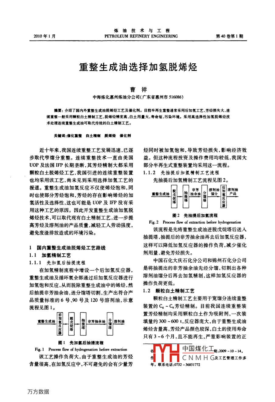 煉油技術(shù)與工程2010年1月PETROLEUM REFINERY ENGINEERING第40卷第1期重整生成油選擇加氫脫烯烴曹祥中海煉化惠州煉油分公司(廣東省惠州市516086)摘要:介紹了國內(nèi)外重整生成油脫烯烴工藝及催化劑。目前半再生重整通常采用后加氫工藝芳烴損失大連續(xù)重整一般釆用噘粒白土糖制工藝脫烯烴精度高白土用量大,壽命短,污染環(huán)境。采用高選擇性加氫脫烯烴技術(shù)處理連續(xù)重整生成油可取代傳統(tǒng)的白土精制工藝。關(guān)鍵詞:催化量整自土精制脫烯烴催化劑近十年來我國連續(xù)重整工藝發(fā)展迅速,已逐烴同時被加氫飽和,導(dǎo)致芳烴損失,影響經(jīng)濟(jì)效步取代窄餾分重整。連續(xù)重整技術(shù)一直由美國益。但這種流程投資及操作費用均較低,我國大UOP及法國IFP長期壟斷,其芳烴精制大都采用部分半再生式重整裝置均采用這一流程顆粒白土脫烯烴工藝,我國引進(jìn)的連續(xù)重整裝置1.1.2先抽提后加氫精制工藝流程也均采用該工藝,尚未見到采用選擇加氫工藝的先抽提后加氫精制工藝流程見圖2報道。重整生成油加氫反應(yīng)不僅使烯烴飽和,同非芳溶劑油時也使部分芳烴飽和,芳烴的存在影響烯烴的加整生成油餾分氫氫活性及選擇性,這也可能是UOP及IFP沒有采用這種工藝的原因。因此開發(fā)重整生成油加氫脫烯烴技術(shù),可以取代現(xiàn)有白土精制工藝,進(jìn)一步提田2先抽提后加氯流程高芳烴及溶劑油的產(chǎn)品質(zhì)量,減輕工人勞動強(qiáng)度,Fig. 2 Process flow of extraction before hydrogenation避免廢渣排放造成的環(huán)境污染。該流程是先將重整生成油進(jìn)脫戊烷塔后送入抽提塔抽提后的非芳抽余油再去后加氫反應(yīng)器1國內(nèi)重整生成油脫烯烴工藝路線這樣可以降低加氫反應(yīng)器的操作負(fù)荷,減少催化1.1加氫精制工藝劑用量,避免芳烴損失。1.1.1先加氫后抽提流程中國石化大慶石化分公司和錦州石化分公司在加氫精制流程中增設(shè)一個后加氫反應(yīng)器,是將抽提出的非芳抽余油先經(jīng)分餾切割出各種重整生成油及循環(huán)氫全部通過后加氫反應(yīng)器進(jìn)行溶劑油餾分后再去加氫精制,這樣加氫反應(yīng)器的加氫飽和反應(yīng)從而脫除重整生成油中的烯烴,然操作負(fù)荷更低。后抽提非芳抽余油,送分餾塔切割,生產(chǎn)出符合產(chǎn)1.2顆粒白土精制工藝品質(zhì)量標(biāo)準(zhǔn)的6號、90號及120號溶劑油,示意顆粒白土精制工藝主要用于寬餾分連續(xù)重整流程見圖1。裝置的C6~C芳烴精制。目前我國連續(xù)重整裝置芳烴精制均采用顆粒白土作為吸附劑,一次裝重整生成油氫非芳抽余油分[溶劑油填量約300~600t,反應(yīng)器龐大,由于重整生成油烯烴含量高,芳烴產(chǎn)品顏色較深,白土的使用壽命只有3~6個月,且不能再生,嚴(yán)重影響裝置的正圖1先加氯后抽提流程中國煤化工x001014該工藝操作負(fù)荷大,由于重整生成油的芳烴CNMHG及工藝管理工作多含量很高,在加氫反應(yīng)中,不可避免的會有少量芳年。聯(lián)系電話0752-36851772曹祥重整生成油選擇加氫脫烯烴19常操作和產(chǎn)品質(zhì)量,而且白土的頻繁更換產(chǎn)生大2重整生成油后加氫催化劑量固體廢物,增加了工人的勞動強(qiáng)度,處理成本2.1非貴金屬/Al2O3催化劑高,同時造成環(huán)境污染。另外,連續(xù)重整裝置所產(chǎn)國內(nèi)許多半再生式重整裝置大多采用后加氫非芳烯烴含量也很高,分離后生產(chǎn)的溶劑油溴價脫除重整生成油中的微量烯烴,所用催化劑為重較高,雖然經(jīng)后加氫精制,但處理高溴價原料時效整原料預(yù)加氫催化劑。國內(nèi)開發(fā)的這類催化劑見果仍不理想。表2白土精制工藝條件如下非貴金屬/Al2O3催化劑的操作條件通常為:溫度150~160℃,壓力1.0-1.5MPa,空速反應(yīng)溫度300~320℃,壓力1.5~2.2MPa,液體08-1.0h-,原料溴指數(shù)50~100mg/(100g),體積空速2~3h-,氫油體積比400-1000加氫出口溴指數(shù)<20mg/(100g)。產(chǎn)物溴價0.07-1.0g/(100g)。國內(nèi)主要顆粒白土指標(biāo)見表1。2.2貴金屬/Al2O3催化劑表1國內(nèi)主要顆粒白土指標(biāo)中國科學(xué)院山西煤炭化學(xué)研究所研制了2種Table 1 Indexes of domestic clay particles貴金屬/A2O3催化劑用于半再生重整裝置生成撫颙油后加氫,見表3,兩種催化劑比目前工業(yè)應(yīng)用的JH-OlNC-OI顆粒白土預(yù)加氫類催化劑的效率高得多,在較溫和的反應(yīng)水分,%≤10pH值條件下可使加氫生成油的溴價<0.02g/(100g)堆密度/g,a1014-09074-.9065-08而芳烴基本不飽和壓碎強(qiáng)度/N·?!?.0>0.51重整生成油采自長嶺煉油廠,溴價為1.7020-60g/(100g),進(jìn)料總芳烴質(zhì)量分?jǐn)?shù)42.49%,2種催比表面積/m2·g1化劑操作條件見表4。衰2國產(chǎn)預(yù)加氫催化劑種類Table 2 Domestic pre-hydrogenation catalysts堆密度/g·cm活性組分/開發(fā)單位0.83-0.85Mo-NV/Y-Al石油撫順石化Mo-Co/y- A2O,中國石油撫順石化分公司石油三廠d1.6x(6-8)Mo-Co-Ni/YAlO,中國石油撫順石化分公司石油三廠d1.8x6-8Mo-Ni/Y-Al中國石化長嶺分公司煉油42-3球0.7-0.8Mo-Si-NV/Y- Al, 0撫順石油化工研究院d2-3球0.7-0.8Mo-Co-NV/Y-A,O,撫順石油化工研究院當(dāng)量φ】.2三葉草型W-NVy-Al0,北京石油化工科學(xué)研究院表32種貴金屬/Al2O3催化劑的物化性質(zhì)表4催化劑的操作條件Table 3 Physicochemical properties of the two nobleTable 4 Operating conditions for catametal/AL, O