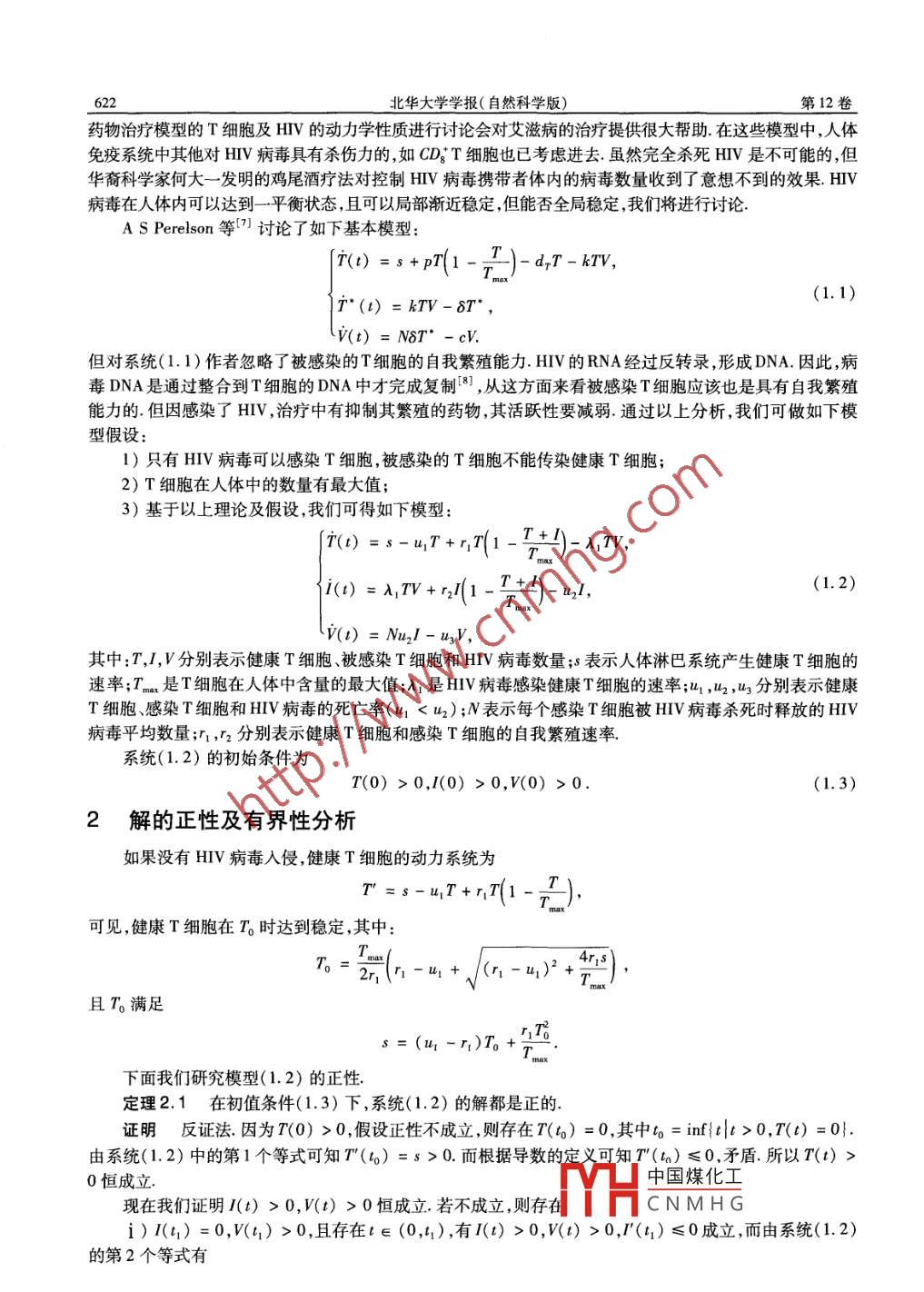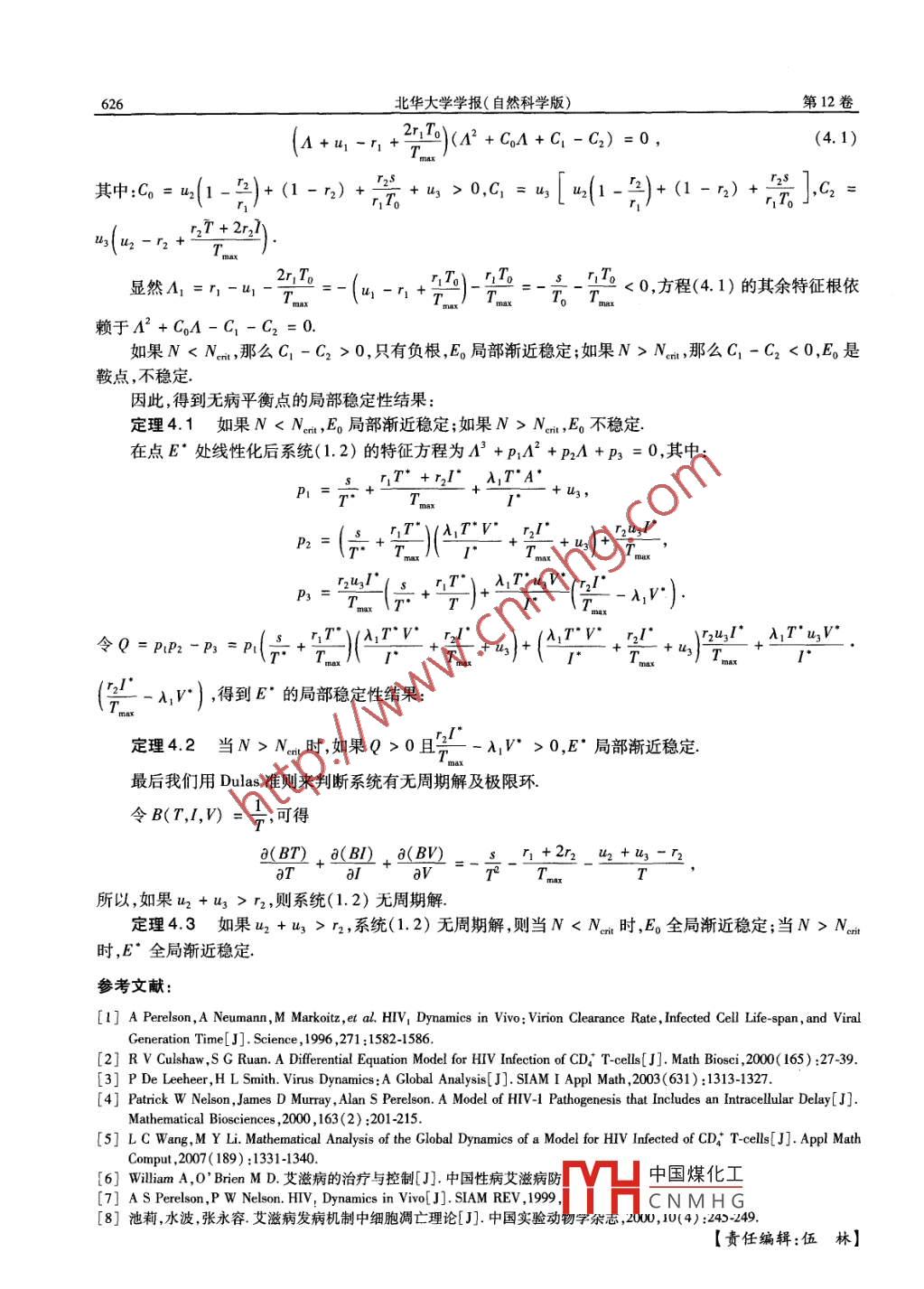 第12卷第6期北華大學(xué)學(xué)報(自然科學(xué)版)Vol. 12 No 62011年12月JOURNAL OF BEIHUA UNIVERSITY( Natural Science)Dec.2011文章編號:10094822(2011)0640621406HⅣ∨病理動力學(xué)模型分析蘇雙雙,王凱,夏米希努爾1.新疆大學(xué)數(shù)學(xué)與系統(tǒng)科學(xué)學(xué)院新疆烏魯木齊830046;2新疆醫(yī)科大學(xué)醫(yī)學(xué)工程與技術(shù)學(xué)院,新疆烏魯木齊830054)摘要:考慮了CDT細(xì)胞的全 logistic自我繁殖,構(gòu)造了具有治療的HV病理研究模型,研究了解的存在性、正性及穩(wěn)定性通過對每個感染T細(xì)胞釋放的HⅣ病毒平均數(shù)量N的討論,得到:如果NN灬,有無病平衡點和地方病平衡點兩個平衡點,但此時無病平衡點不穩(wěn)定,地方病平衡點是局部漸近穩(wěn)定的最后通過構(gòu)造 dulac- Benison函數(shù),得到了地方病平衡點全局穩(wěn)定的條件關(guān)鍵詞:HV;T細(xì)胞;漸近穩(wěn)定;平衡點中圖分類號:0175.12文獻標(biāo)志碼:AAnalysis of the Dynamics Model of HIv Pathogenesis ModelSU Shuang-shuang, WANG Kai, Xamxinur(1. College of Mathematics and System Sciences, Xin jiang University, Urumqi 830046, China;2. Department of Medical Engineering and Technology, Xinjiang Medical University, Urumgi 830054, ChinaAbstract: HIV virus, which invade the human body, mostly parasitic in the T cells, where they transcribe RNAduplicate, then generate some new ones, at last kill the infected T cells, released from them. According to this wedivide the species in this paper into three kinds: uninfected T cells, infected T cells and HIV. Only uninfected Tcells can be created by body, others can't increase because of external input. Being predator, HIV just add frominfected T cells. We have proved that if NNit the infected steady state is locally asymptotically stable. Both of them are globally asymptotically stable ifone condition is satisfiedKey words HIV; T cells; asymptotically stable; equilibrium1引言自從20世紀(jì)80年代艾滋病被發(fā)現(xiàn)至今,已有許多關(guān)于HV病理學(xué)研究結(jié)果2,尤其是近些年將數(shù)學(xué)模型與HV病理學(xué)相結(jié)合3.我們更好地理解和治療HV提供了很大的幫助作為威脅人類最強的傳染病之一,對HIV病理研究是十分必要的而數(shù)學(xué)模型這一強大的工具,在史上幾次流行病研究中顯示出了其強大的威力眾所周知,HⅣV進入人體后主要攻擊T淋巴細(xì)胞(簡稱T細(xì)胞),寄宿在T細(xì)胞內(nèi),完成RNA反轉(zhuǎn)錄及復(fù)制,當(dāng)產(chǎn)生新的HV病毒后再將T細(xì)胞徹底殺死『產(chǎn)中的*6,故對具有收稿日期:20110924CNMHG作者簡介:蘇雙雙(1986-),女,碩士研究生,主要從事常微分方程及其應(yīng)用研究;王凱(1982-),男,講師博士,主要從事微分方程在生物傳染病、復(fù)雜網(wǎng)絡(luò)的應(yīng)用研究622北華大學(xué)學(xué)報(自然科學(xué)版)第12卷藥物治療模型的T細(xì)胞及HIV的動力學(xué)性質(zhì)進行討論會對艾滋病的治療提供很大幫助.在這些模型中,人體免疫系統(tǒng)中其他對HV病毒具有殺傷力的,如CDT細(xì)胞也已考慮進去雖然完全殺死HⅣV是不可能的,但華裔科學(xué)家何大一發(fā)明的雞尾酒療法對控制HV病毒攜帶者體內(nèi)的病毒數(shù)量收到了意想不到的效果HIV病毒在人體內(nèi)可以達到一平衡狀態(tài),且可以局部漸近穩(wěn)定,但能否全局穩(wěn)定,我們將進行討論A S Perelson等7討論了如下基本模型:d-T-krv1.1)T(1)=kⅣV-δ7,V(t)=NδT’-cV但對系統(tǒng)(1.1)作者忽略了被感染的T細(xì)胞的自我繁殖能力HIV的RNA經(jīng)過反轉(zhuǎn)錄,形成DNA.因此,病毒DNA是通過整合到T細(xì)胞的DNA中才完成復(fù)制8],從這方面來看被感染T細(xì)胞應(yīng)該也是具有自我繁殖能力的但因感染了HⅣV,治療中有抑制其繁殖的藥物,其活躍性要減弱通過以上分析,我們可做如下模型假設(shè)1)只有HⅣV病毒可以感染T細(xì)胞,被感染的T細(xì)胞不能傳染健康T細(xì)胞;2)T細(xì)胞在人體中的數(shù)量有最大值;3)基于以上理論及假設(shè),我們可得如下模型7(t)=s-1T+r1T1i(t)=A1rv+r,n(1T+1)-a21(1.2)V(1)=Nu2/-u3V,其中:T,,V分別表示健康T細(xì)胞、被感染T細(xì)胞和HIV病毒數(shù)量;5表示人體淋巴系統(tǒng)產(chǎn)生健康T細(xì)胞的速率;Tm是T細(xì)胞在人體中含量的最大值;λ是HV病毒感染健康T細(xì)胞的速率;l1,u2,3分別表示健康T細(xì)胞感染T細(xì)胞和HV病毒的死亡率(u10,l(0)>0,V(0)>0(1.3)2解的正性及有界性分析如果沒有HIV病毒人侵,健康T細(xì)胞的動力系統(tǒng)為T=s-1+T1-可見健康T細(xì)胞在T時達到穩(wěn)定,其中TT4r且7滿足(u1-r1)T0下面我們研究模型(1.2)的正性定理2.1在初值條件(1.3)下,系統(tǒng)(1.2)的解都是正的證明反證法因為r(0)>0,假設(shè)正性不成立,則存在T(t)=0,其中to=inft|t>0,7(t)=0由系統(tǒng)(1.2)中的第1個等式可知T(4)=s>0.而根據(jù)導(dǎo)數(shù)的定義可知T()≤0.矛盾.所以T()>0恒成立中國煤化工現(xiàn)在我們證明(t)>0,V(t)>0恒成立若不成立,則存在CNMHG)I(t1)=0,W(t1)>0,且存在t∈(0,l1),有I(l)>0,V(t)>0,P(t1)≤0成立,而由系統(tǒng)(1.2)的第2個等式有6期蘇雙雙,等:HV病理動力學(xué)模型分析4)=(4)4)+6(4)(1-(4+()-(4)=7(44)>0,矛盾;i)I(41)>0,v(t1)=0,且存在t∈(0,),有I(t)>0,(t)>0,v(t1)≤0成立,而v(t1)=Nu2(t1)-u3V(1)>0,矛盾;ⅲ)I(t1)>0,(t1)=0,且存在t∈(0,t),有I(t)>0,v(t)>0,而l(t)=0,W(t)=0是系統(tǒng)(1.2)的一個解,且滿足初始條件l(t)=0,(t)=0,由解的唯一性,對任意t≥0,有l(wèi)(t)=0,V(t)=0恒成立,矛盾下面研究解的有界性定理2.2系統(t