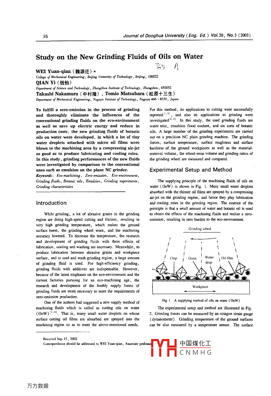 16Jourmal of Donghua University(Eng. Ea.) Vol.20, No.3 (2003)Study on the New Grinding Fluids of 0ils on Water5月WEI Yuan-qian (魏源遷) *Collge of Mechanical Engiering, Beijing Unieriny of Ternology, Bejing, 1002QIAN Yi (錢怡)nd Technology , Zhengzhou Intiue of Technology, Zhengzhou, 450052Takashi Nakamura (中村隆) , Tomio Matsubara (松原十三生)Dpartment of Mechanical Engineering , Nagoya Insiue of Technology, Nagoya 466 - 85555 , JapanTo fufill a zero-emission in the process of grindingFor this method, its applications to cutting were sccessfullyand thoroughly eliminate the influences of thereportedand also its applications to grinding wereconventional grinding fluids on the eco-environmentinvestigatedi2.4. In this study, the used grinding fluids areas well as save up electric energy and reduce inwater mist, emulsion flooo coolant, and six sorts of boranicproduction costs, the new grinding fluids of botanicoils. A large number of the grinding experiments are cariedoils on water were developed, in which a lot of tinyout on a precision NC plain grinding machine. The goindingwater droplets attached with micro oil films wereforces, surface temperaure, surface roughness and surfaceblown to the machining area by a compressing air-jethardness of the ground workpieces as well as the material-so good as to produce lubricating and cooling roles.removal volume , the wheel-wear volume and grinding ratios ofIn this study , grinding performances of the new fluidsthe grinding wheel are measured and compared.were investigated by comparison to the conventionalones such as emulsion on the plane NC grinder.Experimental Setup and MethodKeywonds: Eco machining, Zero emission, Eco-environment ,Grinding fluids,Botanic oils, Emulsion, Grinding experiments,The supplying principle of the machining fluids of oils onCrinding characteristicswater (OoW) is shown in Fig. 1. Many small water dropletsabsorbed with the thinner oil flms are sprayed by a compressingair-jet on the grinding region, and hence they play lubricationIntroductionand cooling roles in the grinding region. The essence of theprinciple is that a small arnount of water and botanic oil is usedWhile grinding, a lot of abrasive grains in the grindingto oblain the eficts of the machining fluids and realize a zerO-region are doing high-speed cuting and friction, resuling inermission, resuling in zero burden to the eco-environment.very high grinding temperature, which makes the groundGrinding wheelsurface bumt, the grinding wheel worn, and the machiningaccuracy lowered. To decrease the temperature, the researchand development of grinding fluids with three efects oflubrication, cooling and washing are necessary. Meanwhile, toproduce lubrication between abrasive grains and workpiecesurface,and to cool and wash grinding region, a large amountGrainWateriOilfim!of grinding fluid is used. For high. efciency grinding,grinding fluids with additives are indispensable. However,because of the latest emphases on the eco-envronment and thecurrent factories pursuing for an eco-machining age, theresearch and development of the freshly supply forms ofWorkpiece .grinding fluids are more necessary to meet the requirements ofzer-emission production.Fig.1 A spplying method of oils on water (OW)One of the authors had suggested a new supply method ofmachining fluids which is called as cutting oils on water(OoW)!1-*. That is, many small water droplets on whose2. Grinding forces can be measured by an octagon strain gaugesurface cutting oil flms are absorbed are sprayed into the(dynanometer). Grinding terperature of the ground surfacesmachining region so as to meet the above-mentioned needs.can be also measured by a temperaure sensor. The surfaceCoreppondence should be adessed to WE1 Yuan-qian, Associale profcese中國煤化工:YHCNMHGJourna! of Donghua University (Eng. Ed.) Vol.20, No.3 (2003) 17profiles of the grinding wheel can be duplicated by usingadditives make the temperature increments of the groundgraphite specimens (size: 38 x15x 10 mm), so the grindingsurfaces smallest and smaller, respectively. Moreover, thewheel-wear volume can tmeasured. The experimentaltangential grinding forces of No.4 ands (OoW) are smallerconditions are listed in Table 1.than that of No.1 ( cutting emulsion). It is easy to sce fromFig. 5 that the lubrication of No. 3 (OoW) is prior to that ofGrindingNo.1 (cuting emulsion), and that of No.2 ( water mist) isWheelthe worst. The micro-bardness ( Vickers hardness) of theground surface is measured and demonstrated in Fig. 7. It isunclear to see a distinction from grinding fluids._WaterORa■ RmaxWorkpiece.DynanometerNozzleStrain0.5Gauge - .Magnetic ChuckTypes of grinding fluidsTable FeedFig.3 Surface roughness (SCM435)Fig.2 Experimental setup圖SCM435國SUS304Tabel 1 Experimental ConditionsGrinding wheelWA46HV(305 x38 x 127 mm)Grinding conditions Air pressure: 0. 1 MPaAir nowing rate: 120 1/minOoW flowing mnte: 20 VhWater mist flowing rate: 1.21/hEmulsion flowing rate: 600 VhDepth of cut'Total depths of cul: 1 um/100Tyes ofginding AuidsμmFig.4 Increments of surface temperatureDressing: one time ( 10 μm/ time)WorkpiecesInner diameter: 6 mm, fixed angle: I0C ,60「distance to grinding point: 100 mmA日Fn]Steel; SCM435 ( < HRCSS), S45C ( <20一HRC25) ; Stainless scel: SUS304Grinding fluidsSize: 50 x30 x 30 mmI: Emulsion flood coolantE 402: Water mist3: OoW (Polysulfide)04: OoW ( Pentarythritol ester + 2%Polysulfide)Types of ginding fuidsS: OoW ( Pentaeryhriol ester +2%TCP)6: OoW ( Econa frying oi)Fig.5 Crinding fores ( SCM435)7: OoW ( Econa cooking oil)8: OoW (Salad oi)Grinding modePlunging grindting60廠20 tExperimental Results and DiscussionsAs specimens are SCM435 and SUS304, the depth of cutand its sum are set as lμm and 100 μm, respectively. Thesurface roughness , surface temperature and grinding forces ofTypesof ginig luisthe ground workpieces are shown in Figs. 3 ~ 6. Withingrinding fluids, the uses of No. 1 and No. 4 or5 with 2%