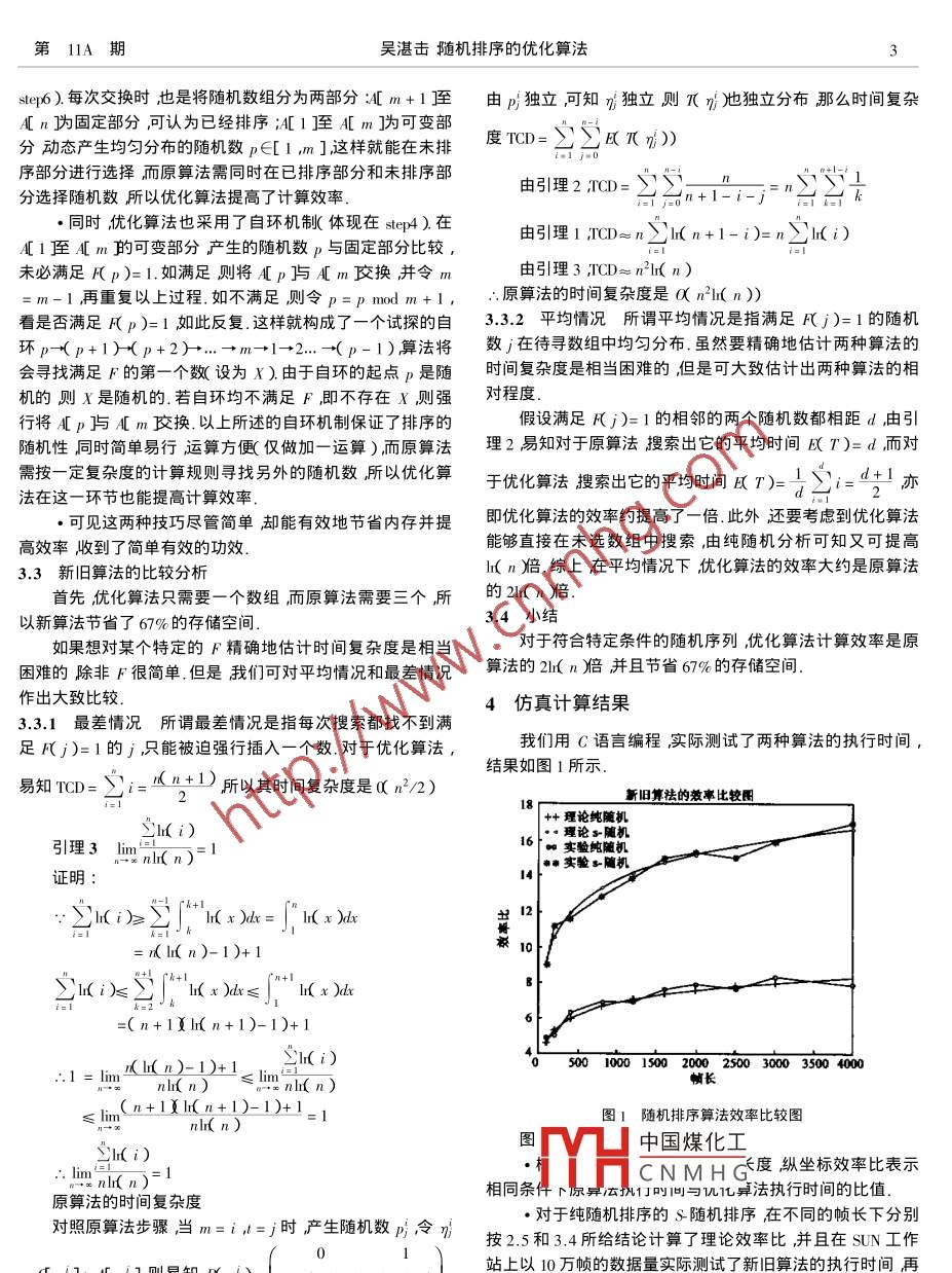 第11A期電子學(xué)報Vol.28 No.11A2000年11月ACTA ELECTRONICA SINICANov.2000隨機排序的優(yōu)化算法.吳湛擊吳偉陵(北京郵電大學(xué)信息工程系181 信箱北京100876 )摘要:隨機排序經(jīng)常出現(xiàn)在數(shù)字信號處理的分析和仿真中尤其用于交織器的比較分析和優(yōu)化設(shè)計中,它的算法優(yōu)劣直接影響到計算仿真的效率.針對原有算法本文提出了優(yōu)化算法大大改善它的時間和空間復(fù)雜度.定量的理論分析和實際的仿真測試都表明優(yōu)化算法能夠有效提高計算效率和節(jié)省存儲空間.關(guān)鍵詞:隨機排序;優(yōu)化算法;時間復(fù)雜度;交織器中圖分類號: 0224文獻標識碼: A文章編號: 0372-2112( 2000 ) 11A-0076-04Optimal Algorithm of Random SortWU Zhan-ji ,WU Wei-ling( P.0. Box 181 ,Department of Information Engineering ,BUPT ,Beijing 100876 ,China )Abstract : Random sort is often applied in analysis and simulation of digital signal processing ,and its algorithm afects the com-putation fficiency . In this paper optimal algorithms are put forward ,and can greatly reduce space and time complexity degree of previ-ous algorithms . Both theoretic analysis and experimental simulation prove that optimal algorithms can efficiently promote the computa-tion eficiency and save memory.Key words : randon-sort optimal-algorithm ,ime-complexity-degree Ainterleaver1引言引理1的說明這-引理是由歐拉首先發(fā)現(xiàn)的(證明從略),所謂隨機排序是指取值范圍在1和n之間的兩兩互不相它表明在n足夠大的情況下用l( n)估計2T是精確的.同的隨機整數(shù)序列.隨機排序作為隨機交織器的程序算法在交織器的設(shè)計中有著重要的作用.在作為IMT2000糾錯編碼2純隨機排序算法候選方案之-的Turbo碼中交織器的設(shè)計--直是研究的重點.按照普遍的觀點[13-6]隨機交織是香農(nóng)信道編碼定理中首先假定仿真已經(jīng)具備功能即能產(chǎn)生從1到任意指定隨機編碼的體現(xiàn),因而被視為較好的一種大量的計算仿真都整數(shù)的均勻分布的隨機整數(shù).現(xiàn)在要在此基礎(chǔ)上產(chǎn)生一個長基于固定交織和隨機交織的對比測試,而且交織器的優(yōu)化設(shè)度為n的純隨機排序序列{a;}i a,∈[1 n],v i≠j ,a;≠a;計也往往要在大量隨機產(chǎn)生的交織器集合中選擇誤碼率較.1 原有算法(文獻2B4頁)小的那種.同樣隨機交織對于. -般意義下的信道交織的對比stepl初始化數(shù)組 A ,i∈[1 n]A[ i]=0 ,m=1測試和優(yōu)化設(shè)計也有很大價值.隨機排序算法的優(yōu)劣直接影step2產(chǎn)生隨機數(shù) p∈[1 n]響到計算仿真的效率尤其是對于數(shù)據(jù)量大、耗時長的工程仿step3如果A[p]=0則置A[p]=1并在數(shù)組B存儲真更是如此.另外對于隨機排序算法的時間復(fù)雜度的理論分p風m]=p ,且將m加1析也不夠完善.本文著重于改進原有隨機排序算法提高仿真step4如果 m1轉(zhuǎn)step2;收稿日期209014修回日期200-07-11基金項目國家自然科學(xué)基金重大項目( No. 69896243資助課題2電子學(xué)報2000年否則停機打印A即純隨機排序序列.布可知{n;獨立分布則π(η:)也獨立分布,那么時間復(fù)雜說明:●優(yōu)化算法的基本思想是:首先初始化-一個簡單遞增排度TCD= 2X K(η:))序的數(shù)組A={1 2.. ,幾}然后產(chǎn)生一個[ 1 ,n 止均勻分布的由引理2,TCD=>;1-;=n;隨機整數(shù)設(shè)為p1)將A[n]與A[p1交換然后,A[ n固定.不變再產(chǎn)生一個[1,n-1]上均勻分布的隨機整數(shù)(設(shè)為由引理1 ,TCD= nlr( n)p2)并將A[ n-1]與A[ P2交換如此反復(fù)直到進行完n-1.:原算法時間復(fù)雜度是( nl( n))次交換得到一個純隨機排序數(shù)組A.2.5小結(jié)●從中可以看出純隨機的優(yōu)化算法基于交換的實現(xiàn)機對于純隨機排序,優(yōu)化算法比原算法節(jié)省50%存儲空制休在step3)實現(xiàn)了動態(tài)排序.在每一次交換時,它將A數(shù)間且計算效率是原算法的lI( n )倍.組分為兩部分:[ m+1侄A[ n是固定部分,已實現(xiàn)隨機排.3符合特定條件的隨機排序算法序不再變動;A[1]至A[m是可變部分需產(chǎn)生均勻分布的隨機數(shù)p∈[1 m]并將A[ m]與A[p交換.之后,可認為A在研究中有時需要產(chǎn)生滿足-定條件的隨機排序例如[ m已實現(xiàn)隨機排序置于固定部分故將m減一,如此重S隨機序列其產(chǎn)生的基本步驟是:首先產(chǎn)生隨機數(shù)j J≤j≤.復(fù)直到m為1.n并與前S個已產(chǎn)生的隨機數(shù)比較如果與其距離都小于●所以,可得出結(jié)論:優(yōu)化算法的實現(xiàn)基于數(shù)組不同位置s則丟棄j重新產(chǎn)生,否則記錄j然后尋找下一個位置,直的隨機交換這-點保證了它排序的隨機性;同時每次產(chǎn)生到所有n個數(shù)都找完.我們把這種特定條件抽象成布爾代數(shù)的隨機數(shù)其概率分布不同這一點保證 了它排序的動態(tài)性每Fj)∈{0 1}當然也可能不存在使F(j)= 1成立的j那么產(chǎn)生-個隨機數(shù)就能決定一個排序位置這與原算法不同,從可強行插入一個數(shù)并進行后繼搜索.而大大提高了運算效率.3.1原有算法( 文獻2B5頁)2.3 優(yōu)化算法的成立性證明step1初始化數(shù)組A A[ i]=0,i∈[1 n]m=1我們知道每個長度為n的純隨機排序序列的發(fā)生概率step2初始化數(shù)組 C ,C[ i]=0ji∈[1 m],t=0為1/n!如果優(yōu)化算法產(chǎn)生的每個數(shù)組都滿足此條件則說step3產(chǎn)生隨機數(shù) p∈[ 1 ,mn]明該算法成立.由算法可知,step4如果A[p]=1轉(zhuǎn)step3RA)= P{ξ1=an &2=an-1.. 5-1=a2}step5如