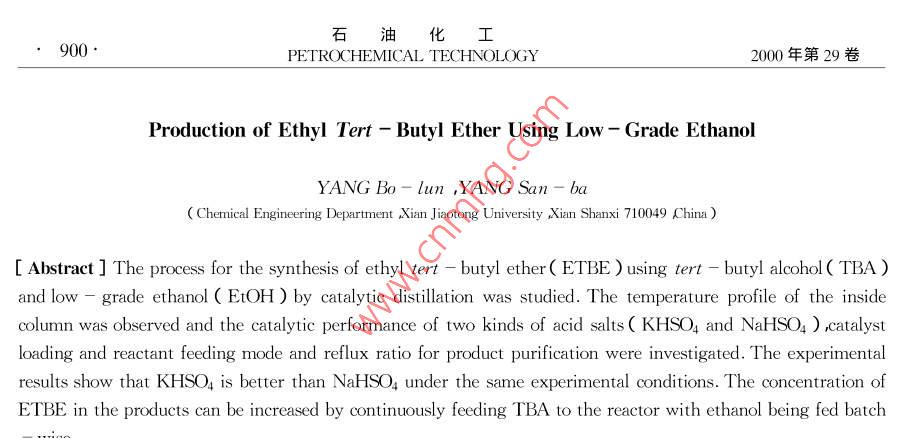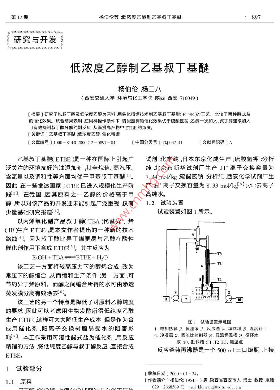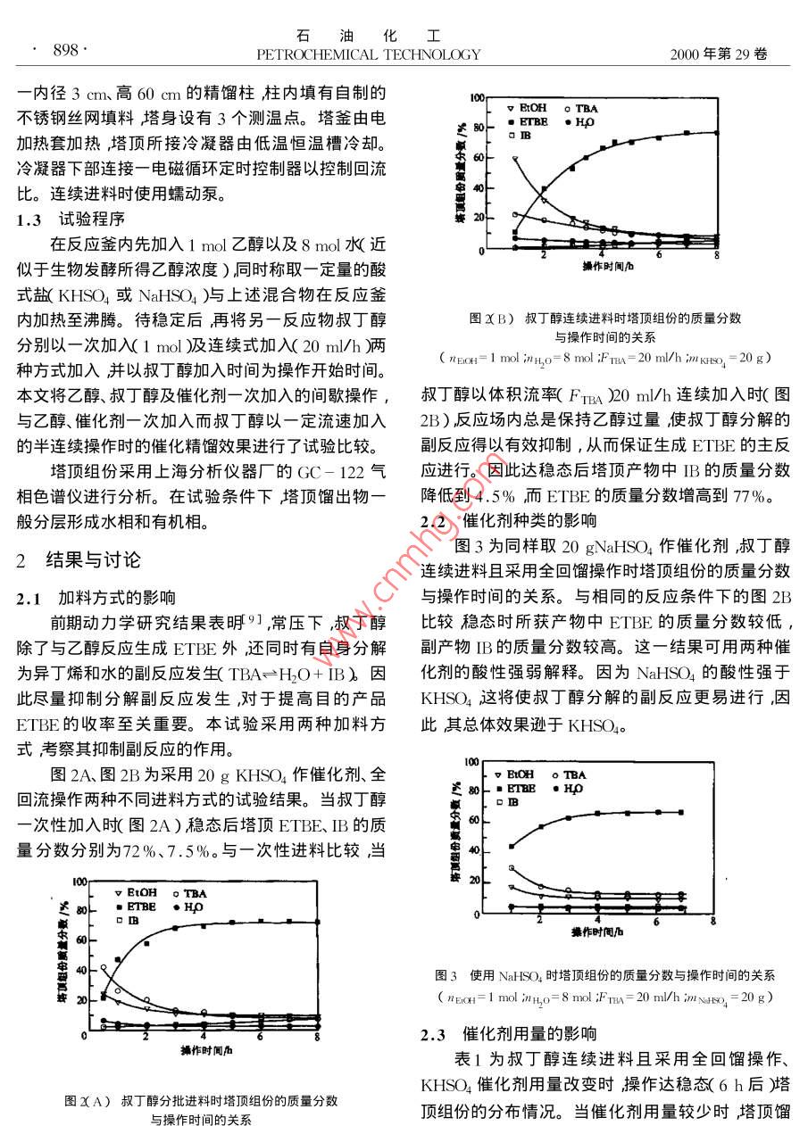 第12期楊伯倫等泜濃度乙醇制乙基叔丁基醚研究與開發(fā),,,2低濃度乙醇制乙基叔丁基醚楊伯倫楊三八西安交通大學環(huán)境與化工學院陜西西安710049)摘要]研究了以叔丁醇及低濃度乙醇為原料用催化精餾技術(shù)制乙基叔丁基醚(EI巸肭工藝。比較了兩種酸式鹽的催化效果。試驗結(jié)果表明在同樣操作祭件下硫酸氫鉀的催化效果優(yōu)于硫酸氫鈉乙醵一次加入、叔丁醇連續(xù)加入可有效抑制叔丁醇分解的副反應(yīng)從而提高產(chǎn)物中EIBE的濃度。[關(guān)鍵詞]乙基叔丁基醚低濃度乙醇摧化精餾[文章編號]1000-814420002-0897-04[中圖分類號]TQ03241[文獻標識碼]A乙基叔丁基醚ETE湜一種在國際上引起廣試劑:化學純,日本東京化成生產(chǎn):硫酸氫鉀:分析泛關(guān)注的環(huán)境友好汽油添加劑其辛烷值、蒸汽壓、純北京市新華試劑廠生產(chǎn)H離子交換容量為含氧量以及調(diào)和性等方面均優(yōu)于甲基叔丁基醚1。7.34mo/kg流酸氫鈉汾析純西安化學試劑廠生因此在一些發(fā)達國家ETEE已進入規(guī)?;a(chǎn)階產(chǎn)H離子交換容量為8.33mo/kg8冰水去離子段2。在我國,因其原料之一乙醇的價格高于甲高純水。醇所以對該產(chǎn)品的開發(fā)還未能引起廣泛重視僅有1.2試驗裝置少量基礎(chǔ)研究報道3試驗裝置如圖1所示以丙烯氧化副產(chǎn)品叔丁釀TBA)代替異丁烯(IB片產(chǎn)ETBE是本文作者提出的一種新的技術(shù)路線4。因為叔丁醇比異丁烯更易與乙醇在酸性催化劑作用下合成ETBE。其主反應(yīng)為Etoh TBafEtbe+h,o該工藝一方面將較高壓力下的醇烯合成改為常壓下的醇縮合從而緩和生產(chǎn)條件;另一方面,可節(jié)約異丁烯原料。而醇之間縮合所得的水可由滲透蒸發(fā)膜分離有效除去6該工藝的另一個特點是降低了對原料乙醇純度的要求因此可以考慮用生物發(fā)酵所得低純度乙醇生產(chǎn)ETBE這樣可大大降低生產(chǎn)成本但是作為合圖1試驗裝置示意圖成用催化劑,陽離子交換樹脂易受水的阻害影1.電加熱套2.恒流泵;3.反應(yīng)錱.填料塔5.溫度計呵7。本工作采用可溶性酸式鹽為催化劑用反應(yīng)6.冷凝器η.回流比控制器♂.低溫恒溫槽⑨.循環(huán)水泵10.貯料糟丌1測溫點精餾的方法將低純度乙醇與叔丁醇反應(yīng)直接合成反應(yīng)釜兼再沸器是一個500ml三口燒瓶上接ETBE。1試驗部分收稿日期]2000-01-241.1原料[作者簡介]楊伯俗1954-)男陜西省西安市人搏士教授電話石油化工898PETROCHEMICAL TECHNOLOGY2000年第29卷內(nèi)徑3cm、高60cm的精餾柱柱內(nèi)填有自制的不銹鋼絲網(wǎng)填料塔身設(shè)有3個測溫點。塔釜由電v EtOH TBA述即0·EmBE·Ho加熱套加熱塔頂所接冷凝器由低溫恒溫槽冷卻冷凝器下部連接一電磁循環(huán)定時控制器以控制回流比。連續(xù)進料時使用蠕動泵。1.3試驗程序在反應(yīng)釜內(nèi)先加入1mo乙醇以及8m水近似于生物發(fā)酵所得乙醇濃度)同時稱取一定量的酸操作時間式鹽KHSO4或 NaSO4)與上述混合物在反應(yīng)釜內(nèi)加熱至沸騰。待穩(wěn)定后再將另一反應(yīng)物叔丁醇圖ⅩB)叔丁醇連續(xù)進料時塔頂組份的質(zhì)量分數(shù)分別以一次加入1mol)連續(xù)式加入(20ml/h)兩與操作時間的關(guān)系(nEIOH=I mol ;n,=8 mol FTBA-20 ml/h int KHso, 20 g)種方式加入并以叔丁醇加入時間為操作開始時間。本文將乙醇、叔丁醇及催化劑一次加入的間歇操作,叔丁醇以體積流率(Fm)0m/h連續(xù)加入時(圖與乙醇、催化劑一次加入而叔丁醇以一定流速加入2B)反應(yīng)場內(nèi)總是保持乙醇過量,使叔丁醇分解的的半連續(xù)操作時的催化精餾效果進行了試驗比較。副反應(yīng)得以有效抑制,從而保證生成ETHE的主反塔頂組份采用上海分析儀器廠的(C-122氣應(yīng)進行。因此達穩(wěn)態(tài)后塔頂產(chǎn)物中IB的質(zhì)量分數(shù)相色譜儀進行分析。在試驗條件下塔頂餾出物一降低到4.5%而ETBE的質(zhì)量分數(shù)增高到77%。般分層形成水相和有機相2.2催化劑種類的影響圖3為同樣取20 gNaHSO4作催化劑叔丁醇2結(jié)果與討論連續(xù)進料且采用全回餾操作時塔頂組份的質(zhì)量分數(shù)2.1加料方式的影響與操作時間的關(guān)系。與相同的反應(yīng)條件下的圖2B前期動力學研究結(jié)果表硏,常壓下,叔丁醇比較穩(wěn)態(tài)時所獲產(chǎn)物中ETBE的質(zhì)量分數(shù)較低,除了與乙醇反應(yīng)生成ETBE外還同時有自身分解副產(chǎn)物B的質(zhì)量分數(shù)較高。這一結(jié)果可用兩種催為異丁烯和水的副反應(yīng)發(fā)生(TBA→H2O+邗B)因化劑的酸性強弱解釋。因為 Naso4的酸性強于此盡量抑制分解副反應(yīng)發(fā)生,對于提高目的產(chǎn)品KHSO這將使叔丁醇分解的副反應(yīng)更易進行因ETBE的收率至關(guān)重要。本試驗采用兩種加料方此其總體效果遜于KHSO式考察其抑制副反應(yīng)的作用。圖2A圖2B為采用20 g KHSO4作催化劑全BtOH。TBA回流操作兩種不同進料方式的試驗結(jié)果。當叔丁醇遲8·EBE·Hp次性加入圖2A)穩(wěn)態(tài)后塔頂ETBE、IB的質(zhì)量分數(shù)分別為72%、7.5%。與一次性進料比較當v EtOH。TBA0·ETBE·Hp操作時間h圖3使用 NaSO4時塔頂組份的質(zhì)量分數(shù)與操作時間的關(guān)系(nEIGH=I mol nHo=8 mol :FTBA=20 mI/h mI NHso.=20 g)2.3催化劑用量的影響婚作時聞西表1為叔丁醇連續(xù)進料且采用全回餾操作、KHSO催化劑用量改變時操作達穩(wěn)態(tài)(6h