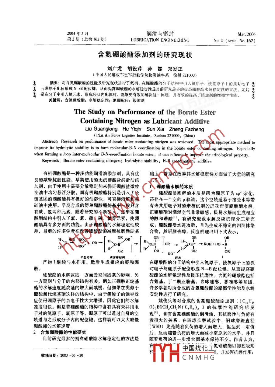 2004年3月潤滑與密封Mar. 2004第2期(總第162期) .LUBRICATION ENCINEERINGNo.2 ( serial No. 162)含氮硼酸酯添加劑的研究現(xiàn)狀劉廣龍胡役芹孫霞鄭發(fā)正(中國人民解故不空軍后勤學(xué)院物資油料系徐州 21000)摘要:對含氮硝酸嘴的性能及研究現(xiàn)狀進行了慨括.在硼酸酯的分子結(jié)構(gòu)中引人氮原子。使氮原了1:的孤對電子¥與硼原子配位形成N .B 配位鍵,從而提高硼酸酯的水解穩(wěn)定性是目前研究最多的捉高硼酸酯水解穩(wěn)定性的方法。尤其蘇是在分子中引人氮元素,形成環(huán)狀內(nèi)配體時,能夠更有效的解決這~一問題, 并有效的提高S添加劑的摩擦學(xué)性能。關(guān)鍵詞:含氮硼酸酯;水解穩(wěn)定性;氮硼配位:添加劑The Study on Performance of the Borate EsterContaining Nitrogen as Lubricant AdditiveLiu Guanglong Hu YiqinSun Xia Zheng Fazheng(PLA Air Forre logistics Institute, Xuzhou 221000, China)Abstract: Research on performnance of borate ester containing-nitrigen was reviewed. The most appropriate method toimprove its hydrolytice sability is to fom molecular-B-N coordination in the borate esler containing nitrogen. Espeiallywhen forming a loop inter-molecular B-N-cordination botate ester, it can eficienly improve the tribological property.Keywords: Borate ester containing nirogen; bhydrolytie stability;, N-B coordination; additive有機硼酸酯是- -種多功能潤滑油添加劑,具有優(yōu)礎(chǔ)上,著重在改善其水解穩(wěn)定性方面做了大量的研究良的減摩抗磨性能。早期使用的無機硼酸鹽潤滑油添工作。加劑,由于使用中需要分散穩(wěn)定劑來保證硼酸鹽微粒] 餾酸酯水解的本質(zhì)在油中均勻懸浮分散,而有機硼酸酯特別是引入了長硼酸酯易潮解的本質(zhì)是因為硼原子為sp'雜化, .鏈基團的硼酸酯具有極好的油溶性,可直接溶解到基還存在一-個空的p軌道,這個空軌道易于接受水等帶礎(chǔ)油中使用。早期合成的簡單硼酸酯烷基中- -般只含有未共用電子對的親核試劑的進攻而使硼酸酯水解。有碳、氫兩種元素,隨著研究的不斷深人,逐漸在硼正硼酸酯對潮濕空氣非常敏感,極易水解而生成相應(yīng)酸酯結(jié)構(gòu)中引入了氧、氮、硫、磷、氯等元素,使碉的醇和硼酸"。有研究假設(shè)水解反應(yīng)機理分三步完.酸酯具有多方面的功能。由于硼酸酯的水解穩(wěn)定性較成:硼酸酯受水進攻后,首先生成不穩(wěn)定的四面體絡(luò)差,目前的許多學(xué)者在改善硼酸酯的減摩抗磨性能基合物,然后脫去醇,反應(yīng)機理可用下式表示:H。進攻RO、B-OR-R ,or]"\o:BR1OR°一p:B*→ROH+HO -n)R0ROOFRo" '平酉睹構(gòu)四面體結(jié)掏產(chǎn)物I繼續(xù)與水作用,最后生成相應(yīng)的醇和硼在硼酸酯的分子結(jié)構(gòu)中引人氮原子,使氮原子上的孤酸對電子與硼原子配位形成N-B配位鍵,從而提高硼硼酸酯的水解速度-方面受空間因素的影響,另酸酯的水解穩(wěn)定性及極壓抗磨性。含氦的硼酸酯包括- -方面則與分子的內(nèi)部結(jié)構(gòu)有關(guān),例如正硼酸正烷基含氨基、丁二酰亞胺基,含咪唑啉、惡唑啉等基團。酯的水解速度隨烷基的增大而減慢,但如果在類似于許多學(xué)者對所合成的含氮硼酸酯的摩擦學(xué)性能及水解硼酸氯代烷基酯這樣的結(jié)構(gòu)中,由于氯原子的誘導(dǎo)效安定性進行了研究。應(yīng)使得硼原子的親電子性大大增強,因此它們的水解姚俊兵等對合成的含氮硼酸酯添加劑[(CpH2s速度很快。但是若硼酸酯的結(jié)構(gòu)中含有具有未共用電0),BOCH.CH.N(CH,)2 )的抗摩性能研究后發(fā)子對的氨原子、氧原子等,硼原子可以通過自身的空現(xiàn)2,含有含氮硼酸酯的潤滑油,其抗磨性與負荷有軌道與之形成分子內(nèi)的配位鍵,這樣就可以大大減慢著很大的關(guān)系。在四球長磨試驗中,鋼球磨斑直徑硼酸酯的水解速度.(WSD)先是隨著負荷的增大而增大,但達到-一定值2含氮硼酸酯的性能研究后,反而隨著負荷的增大而減小至原來的水平,并且目前研究最多的提高硼酸酯水解穩(wěn)定性的方法是隨著負荷的進一步增大而基本保持不變。作者認為,氙硼酸酯以物理吸附中國煤化工,并愛,沈的樣作用收稿日期: 2003 -05 -20THCNMHG2004年第2期劉廣龍等:含氦硼酸酯添加劑的研究現(xiàn)狀115而在較苛刻的摩擦磨損條件下,硼酸酯吸附膜破裂.黃偉九等利用四球機和環(huán)塊試驗機考察了兩種水降解,并經(jīng)過. 系列摩擦化學(xué)反應(yīng)生成氮化硼,從而溶性含氮硼酸酯(脂肪酸咪唑啉硼酸酯)的摩擦學(xué)起到抗磨保護作用:摩擦表面上氮化硼的生成,可能性能,并用X射線光電了能譜儀(XPS) 對摩擦表面涉及到含氨硼酸酯中具有缺電子空軌道的硼和具有孤進行了分析,摩擦學(xué)試驗表明'l:含氮硼酸酯在水中對電了的氮的再結(jié)合。摩擦過程產(chǎn)生外逸電子,在外具有良好的減摩抗磨性能和承載能力,表面分析證明逸電子的作用下,硼酸酯分子降解,然后,具有狐對含氮硼酸酯在摩擦過程中發(fā)生了摩擦化學(xué)反應(yīng),生成電了的氮碎片與具有缺電子空軌道的硼碎片配位,并了含硼酸、三氧化二硼、有機氮等的復(fù)合膜,有效地結(jié)合生成氮化硼化合物。提高了水基液的抗磨減摩性能和承載能力。葛春華等用硼酸和烷醇酰胺合成了幾種不同的硼衰1幾類硎酸酯水解穩(wěn)定性的比較酸酯類潤滑油添加劑,將這些硼酸酯按總質(zhì)量的2%加水解穩(wěn)定性人到基礎(chǔ)油