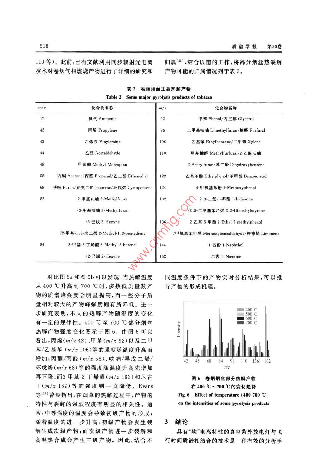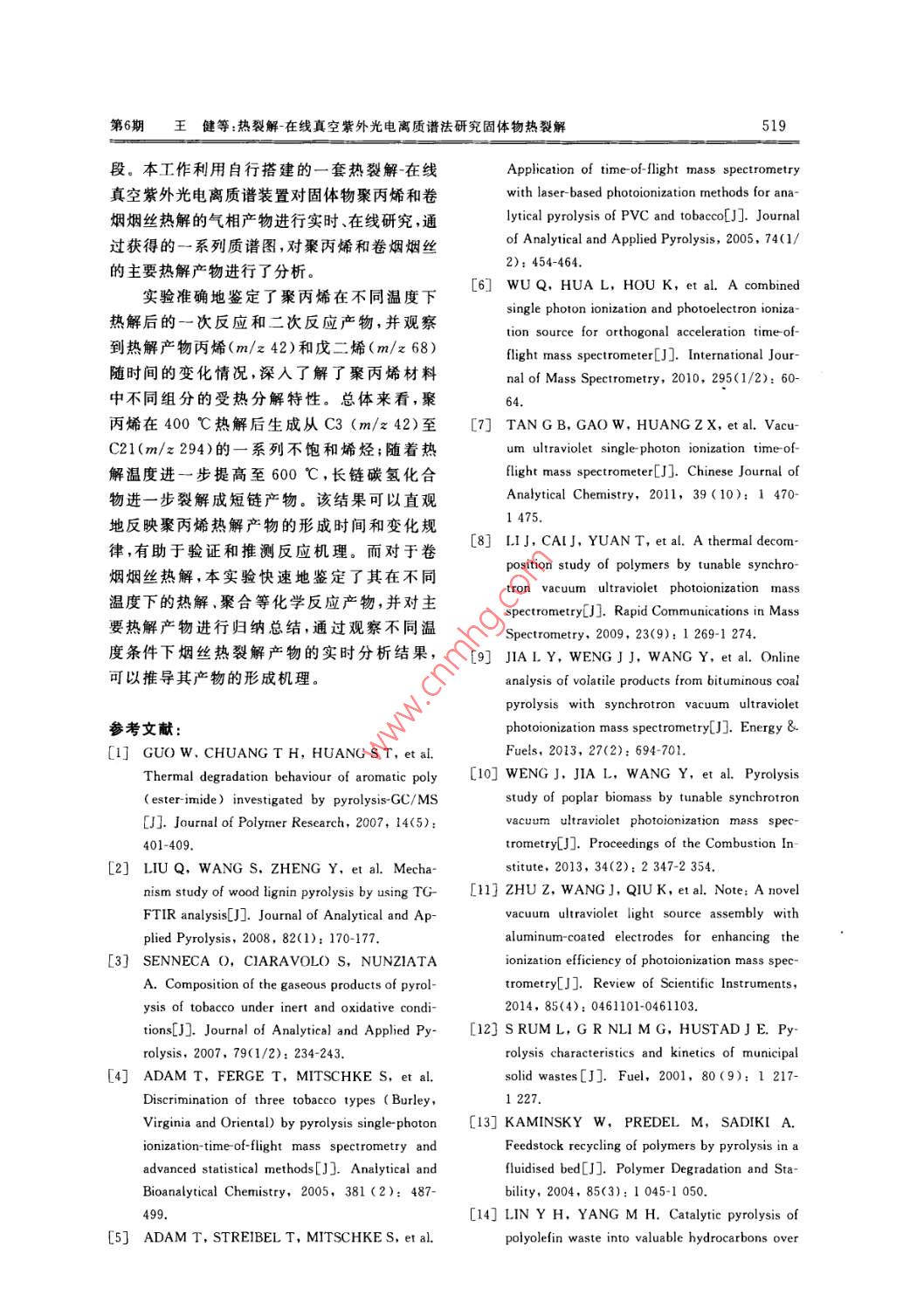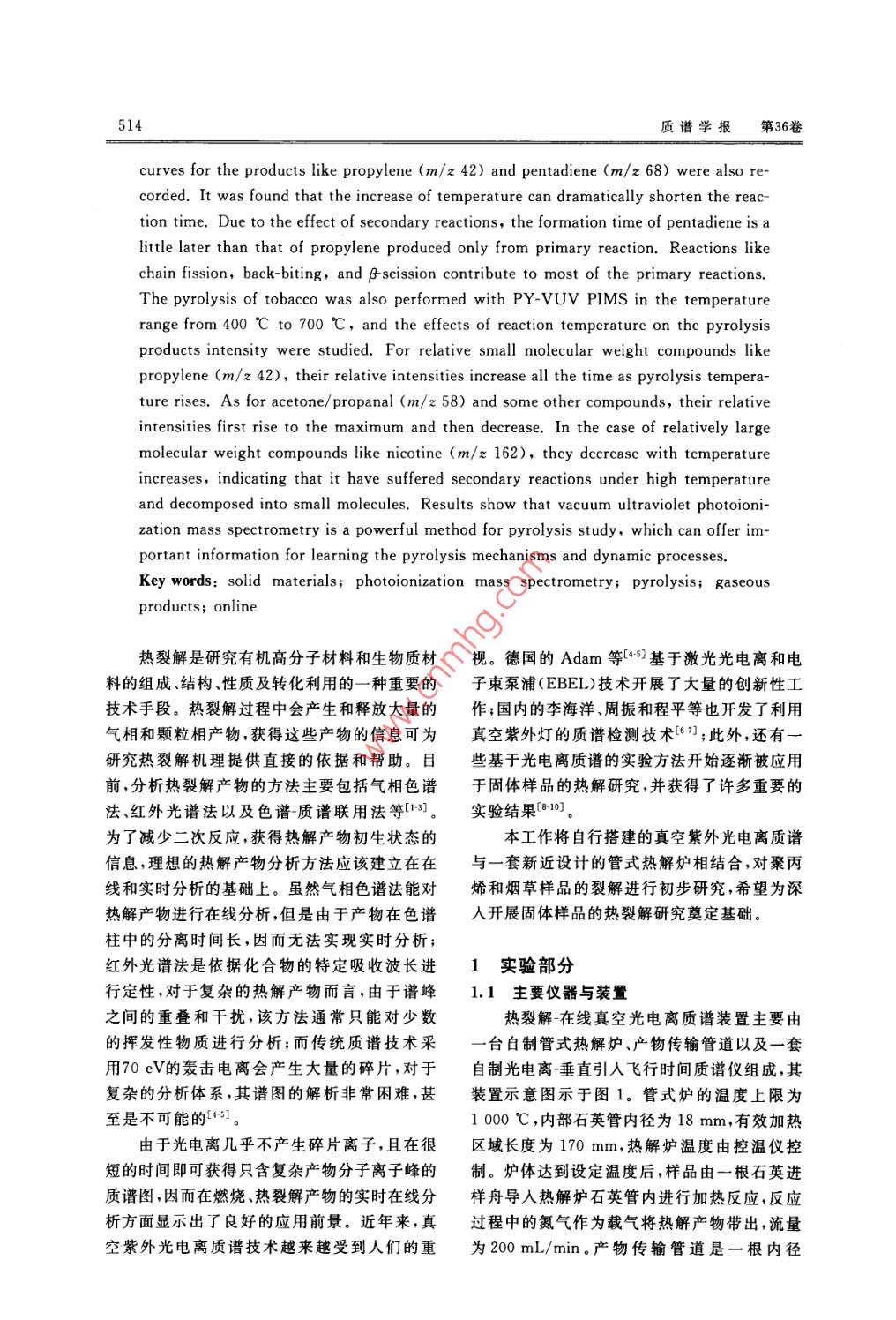 第36卷第6期質(zhì)譜學(xué)報(bào)Vol. 36 No. 62015年11月.Journal of Chinese Mass Spectrometry SocietyNov. 2015熱裂解-在線真空紫外光電離質(zhì)譜法研究固體物熱裂解王健',王毓',胡永華”,文 武',黃鵲',潘 洋'(1.中國科學(xué)技術(shù)大學(xué)國家同步輻射實(shí)驗(yàn)室,安徽合肥230026;2.安徽中煙工業(yè)有限責(zé)任公司技術(shù)中心,安徽合肥230088)摘要:為了實(shí)時(shí)、在線研究一些固體物質(zhì)的熱裂解產(chǎn)物,自行搭建了一套熱裂解-在線真空紫外光電離質(zhì)譜裝置。利用真空紫外燈作為電離源,并結(jié)合垂直引入飛行時(shí)間質(zhì)譜,初步研究了聚丙烯在400~600 C和卷煙煙絲在400~ -700 C熱解時(shí)釋放的氣相產(chǎn)物。本實(shí)驗(yàn)不僅在線獲得了一系列熱解氣相產(chǎn)物的光電離質(zhì)譜圖,還了解了各產(chǎn)物,如丙烯(m/z 42)、戊二烯(m/z 68)等在不同溫度下隨時(shí)間的變化曲線,從而獲知熱解反應(yīng)的動態(tài)變化過程。結(jié)果表明,真空紫外光電離質(zhì)譜法是研究固體物熱裂解的重要手段,可以為研究熱解動態(tài)變化和產(chǎn)物形成機(jī)理提供重要信息。關(guān)鍵詞:固體物;光電離質(zhì)譜;熱裂解;氣相產(chǎn)物;實(shí)時(shí)研究中圄分類號:0657.63文獻(xiàn)標(biāo)志碼:A文章編號: 1004-2997(2015)06-0513-08doi: 10.7538/ zpxb. youxian. 2015. 0035Study on the Pyrolysis of Solid Materials with Pyrolysis-OnlineVacuum Ultraviolet Photoionization Mass SpectrometryWANG Jian' ,WANG Yu', HU Yong-hua', WEN Wu',HUANG Que',PAN Yang'(1. National Synchrotron Radiation Laboratory,University of Science and Technology of China, Hefei 230026, China2. Center of Technology, China Tobacco Anhui Industrial Co, Lid. ,Hefei 230088, China)Abstract: An online pyrolysis- vacuum ultraviolet photoionization mass spectrometer(PY-VUV PIMS) was built for the analysis of pyrolysis products of solid materials.V acuum ultraviolet photoionization is a“soft" ionization method producing few or nofragments of molecular ions, making the identification and interpretation of complex py-rolysis products in real time possible. In this work, the gaseous pyrolysis of polypropyl-ene at the temperatures range of 400 C to 600 C were firstly studied with this new-builtsetup. A series of mass spectra of gaseous products were obtained, and the time evolved收稿日期:2014-12-26;修回日期:2015-03-11基金項(xiàng)目:國家自然科學(xué)基金(11175185、U1432128)資助作者簡介:王健(1986- ),男(漢族),安徽準(zhǔn)南人 ,博士研究生,從事光電離質(zhì)請技術(shù)及應(yīng)用研究。E mail; wangj86@mail. ustc. edu. cn通信作者:潘洋(1976-),男(漢族).安徽蚌埠人,副研究員 ,從事光電離質(zhì)譜技術(shù)及應(yīng)用研究。E-mail: panyang@ustc. edu. cn網(wǎng)絡(luò)出版時(shí)間:2015-06-02;網(wǎng)絡(luò)出版地址:ttp: // www. cnki. net/ kem/detail/11.2979. TH. 20150602. 0851. 005. html514質(zhì)譜學(xué)報(bào)第36卷curves for the products like propylene (m/z 42) and pentadiene (m/z 68) were also re-corded. It was found that the increase of temperature can dramatically shorten the reac-tion time. Due to the effect of secondary reactions, the formation time of pentadiene is alittle later than that of propylene produced only from primary reaction. Reactions likechain fission, back-biting, and β-scission contribute to most of the primary reactions.The pyrolysis of tobacco was also performed with PY-VUV PIMS in the temperaturerange from 400 C to 700 C,and the effects of reaction temperature on the pyrolysisproducts intensity were studied. For relative small molecular weight compounds likepropylene (m/z 42), their relative intensities increase all the time as pyrolysis tempera-ture rises. As for acetone/ propanal (m/z 58) and some other compounds, their relativeintensities first rise to the maximum and then decrease. In the case of relatively largemolecular weight compounds like nicotine (m/z 162), they decrease with temperatureincreases, indicating that it have suffered secondary reactions under high temperatureand decomposed into small molecules. Results show that vacuum ultraviolet photoioni-zation mass spectrometry is a powerful method for pyrolysis study, which can offer im-portant information for learning the pyrolysis mechanisms and dynamic processes.Key words: solid materials; photoionization mass spectrometry; pyrolysis; gaseousproducts; online熱裂解是研究有機(jī)高分子材料和生物質(zhì)材視。德國的Adam等[+5基于激光光電離和電料的組成、結(jié)構(gòu)、性質(zhì)及轉(zhuǎn)化利用的一種重要的子束泵浦(EBEL)技術(shù)開展了大量的創(chuàng)新性工技術(shù)手段。熱裂解過程中會產(chǎn)生和釋放大量的作;國內(nèi)的李海洋、周振和程平等也開發(fā)了利用氣相和顆粒相產(chǎn)物,獲得這些產(chǎn)物的信息可為真空紫外燈的質(zhì)譜檢測技術(shù)[°7];此外,還有一研究熱裂解機(jī)理提供直接的依據(jù)和幫助。目些基于光電離質(zhì)譜的實(shí)驗(yàn)方法開始逐漸被應(yīng)用前,分析熱裂解產(chǎn)物的方法主要包括氣相色譜于固體樣品的熱解研究,并獲得了許多重要的法、紅外光譜法以及色譜質(zhì)譜聯(lián)用法等[-3]。實(shí)驗(yàn)結(jié) 果[8-10]。為了減少二次反應(yīng),獲得熱解產(chǎn)物初生狀態(tài)的本工作將自行搭建的真空紫外光電離質(zhì)譜信息,理想的熱解產(chǎn)物分析方法應(yīng)該建立在在與一套新近設(shè)計(jì)的管式熱解爐相結(jié)合,對聚丙線和實(shí)時(shí)分析的基礎(chǔ)上。雖然氣相色譜法能對烯和煙草樣品的裂解進(jìn)行初步研究,
