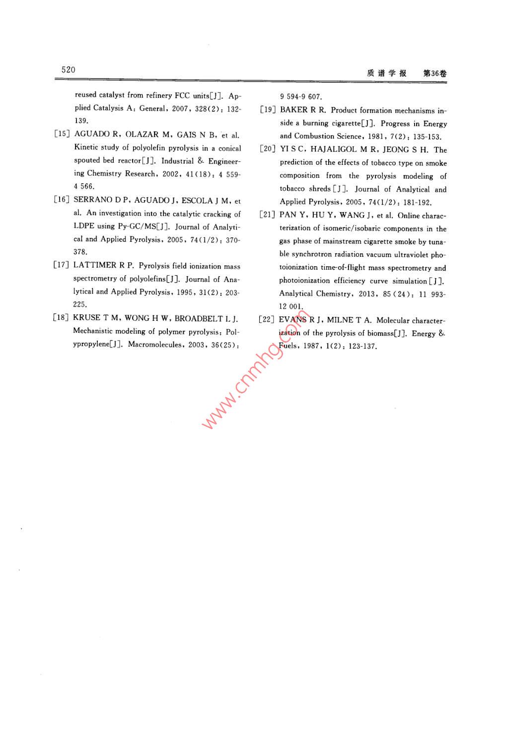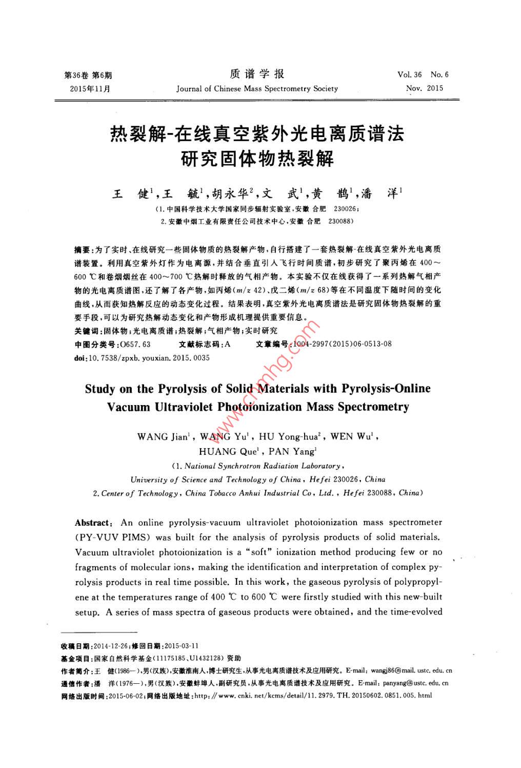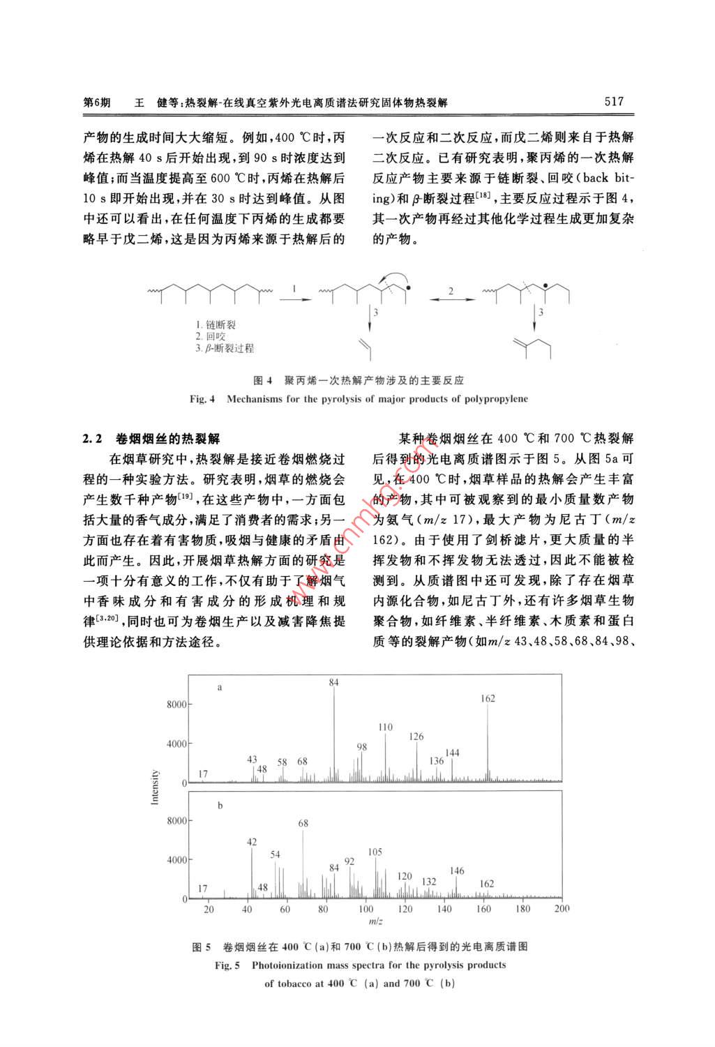 第36卷第6期質(zhì)譜學(xué)報(bào)Vol. 36 No. 62015年11月.Journal of Chinese Mass Spectrometry SocietyNov. 2015熱裂解-在線真空紫外光電離質(zhì)譜法研究固體物熱裂解王健',王毓',胡永華”,文 武',黃鵲',潘 洋'(1.中國科學(xué)技術(shù)大學(xué)國家同步輻射實(shí)驗(yàn)室,安徽合肥230026;2.安徽中煙工業(yè)有限責(zé)任公司技術(shù)中心,安徽合肥230088)摘要:為了實(shí)時(shí)、在線研究一些固體物質(zhì)的熱裂解產(chǎn)物,自行搭建了一套熱裂解-在線真空紫外光電離質(zhì)譜裝置。利用真空紫外燈作為電離源,并結(jié)合垂直引入飛行時(shí)間質(zhì)譜,初步研究了聚丙烯在400~600 C和卷煙煙絲在400~ -700 C熱解時(shí)釋放的氣相產(chǎn)物。本實(shí)驗(yàn)不僅在線獲得了一系列熱解氣相產(chǎn)物的光電離質(zhì)譜圖,還了解了各產(chǎn)物,如丙烯(m/z 42)、戊二烯(m/z 68)等在不同溫度下隨時(shí)間的變化曲線,從而獲知熱解反應(yīng)的動態(tài)變化過程。結(jié)果表明,真空紫外光電離質(zhì)譜法是研究固體物熱裂解的重要手段,可以為研究熱解動態(tài)變化和產(chǎn)物形成機(jī)理提供重要信息。關(guān)鍵詞:固體物;光電離質(zhì)譜;熱裂解;氣相產(chǎn)物;實(shí)時(shí)研究中圄分類號:0657.63文獻(xiàn)標(biāo)志碼:A文章編號: 1004-2997(2015)06-0513-08doi: 10.7538/ zpxb. youxian. 2015. 0035Study on the Pyrolysis of Solid Materials with Pyrolysis-OnlineVacuum Ultraviolet Photoionization Mass SpectrometryWANG Jian' ,WANG Yu', HU Yong-hua', WEN Wu',HUANG Que',PAN Yang'(1. National Synchrotron Radiation Laboratory,University of Science and Technology of China, Hefei 230026, China2. Center of Technology, China Tobacco Anhui Industrial Co, Lid. ,Hefei 230088, China)Abstract: An online pyrolysis- vacuum ultraviolet photoionization mass spectrometer(PY-VUV PIMS) was built for the analysis of pyrolysis products of solid materials.V acuum ultraviolet photoionization is a“soft" ionization method producing few or nofragments of molecular ions, making the identification and interpretation of complex py-rolysis products in real time possible. In this work, the gaseous pyrolysis of polypropyl-ene at the temperatures range of 400 C to 600 C were firstly studied with this new-builtsetup. A series of mass spectra of gaseous products were obtained, and the time evolved收稿日期:2014-12-26;修回日期:2015-03-11基金項(xiàng)目:國家自然科學(xué)基金(11175185、U1432128)資助作者簡介:王健(1986- ),男(漢族),安徽準(zhǔn)南人 ,博士研究生,從事光電離質(zhì)請技術(shù)及應(yīng)用研究。E mail; wangj86@mail. ustc. edu. cn通信作者:潘洋(1976-),男(漢族).安徽蚌埠人,副研究員 ,從事光電離質(zhì)譜技術(shù)及應(yīng)用研究。E-mail: panyang@ustc. edu. cn網(wǎng)絡(luò)出版時(shí)間:2015-06-02;網(wǎng)絡(luò)出版地址:ttp: // www. cnki. net/ kem/detail/11.2979. TH. 20150602. 0851. 005. html514質(zhì)譜學(xué)報(bào)第36卷curves for the products like propylene (m/z 42) and pentadiene (m/z 68) were also re-corded. It was found that the increase of temperature can dramatically shorten the reac-tion time. Due to the effect of secondary reactions, the formation time of pentadiene is alittle later than that of propylene produced only from primary reaction. Reactions likechain fission, back-biting, and β-scission contribute to most of the primary reactions.The pyrolysis of tobacco was also performed with PY-VUV PIMS in the temperaturerange from 400 C to 700 C,and the effects of reaction temperature on the pyrolysisproducts intensity were studied. For relative small molecular weight compounds likepropylene (m/z 42), their relative intensities increase all the time as pyrolysis tempera-ture rises. As for acetone/ propanal (m/z 58) and some other compounds, their relativeintensities first rise to the maximum and then decrease. In the case of relatively largemolecular weight compounds like nicotine (m/z 162), they decrease with temperatureincreases, indicating that it have suffered secondary reactions under high temperatureand decomposed into small molecules. Results show that vacuum ultraviolet photoioni-zation mass spectrometry is a powerful method for pyrolysis study, which can offer im-portant information for learning the pyrolysis mechanisms and dynamic processes.Key words: solid materials; photoionization mass spectrometry; pyrolysis; gaseousproducts; online熱裂解是研究有機(jī)高分子材料和生物質(zhì)材視。德國的Adam等[+5基于激光光電離和電料的組成、結(jié)構(gòu)、性質(zhì)及轉(zhuǎn)化利用的一種重要的子束泵浦(EBEL)技術(shù)開展了大量的創(chuàng)新性工技術(shù)手段。熱裂解過程中會產(chǎn)生和釋放大量的作;國內(nèi)的李海洋、周振和程平等也開發(fā)了利用氣相和顆粒相產(chǎn)物,獲得這些產(chǎn)物的信息可為真空紫外燈的質(zhì)譜檢測技術(shù)[°7];此外,還有一研究熱裂解機(jī)理提供直接的依據(jù)和幫助。目些基于光電離質(zhì)譜的實(shí)驗(yàn)方法開始逐漸被應(yīng)用前,分析熱裂解產(chǎn)物的方法主要包括氣相色譜于固體樣品的熱解研究,并獲得了許多重要的法、紅外光譜法以及色譜質(zhì)譜聯(lián)用法等[-3]。實(shí)驗(yàn)結(jié) 果[8-10]。為了減少二次反應(yīng),獲得熱解產(chǎn)物初生狀態(tài)的本工作將自行搭建的真空紫外光電離質(zhì)譜信息,理想的熱解產(chǎn)物分析方法應(yīng)該建立在在與一套新近設(shè)計(jì)的管式熱解爐相結(jié)合,對聚丙線和實(shí)時(shí)分析的基礎(chǔ)上。雖然氣相色譜法能對烯和煙草樣品的裂解進(jìn)行初步研究,