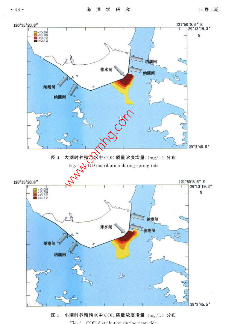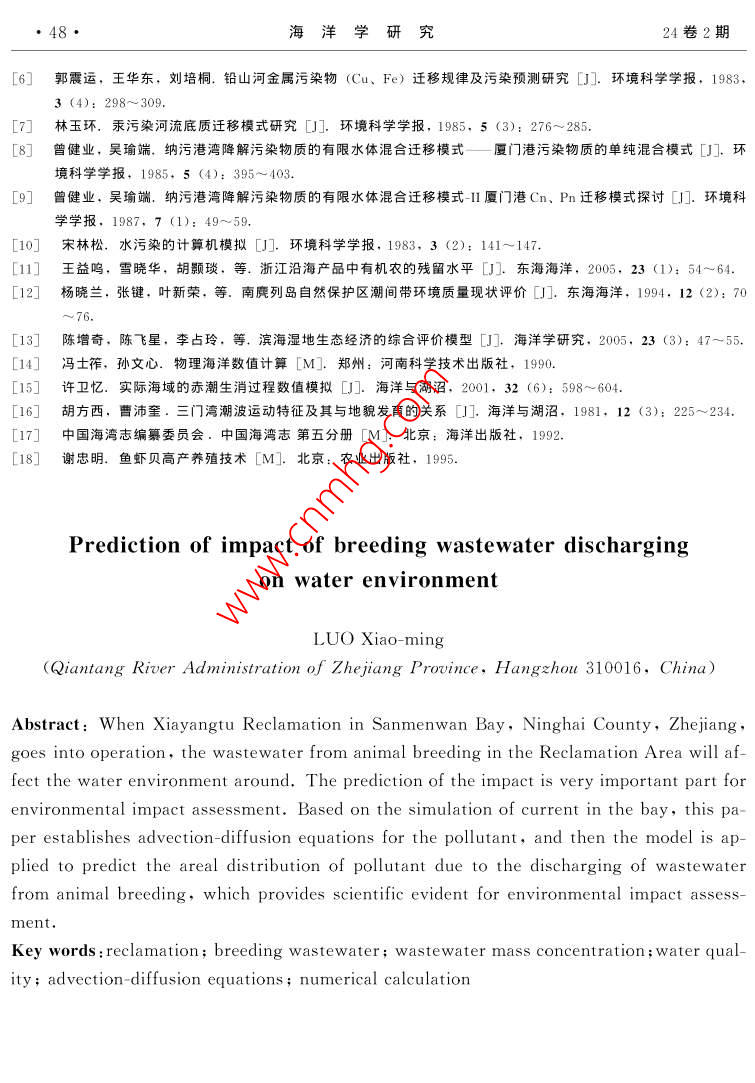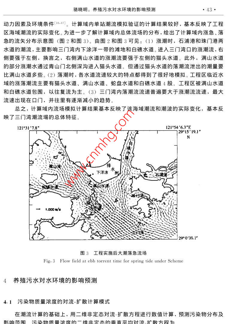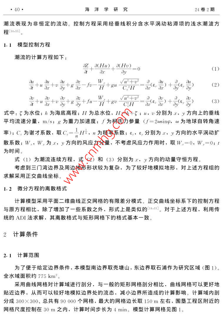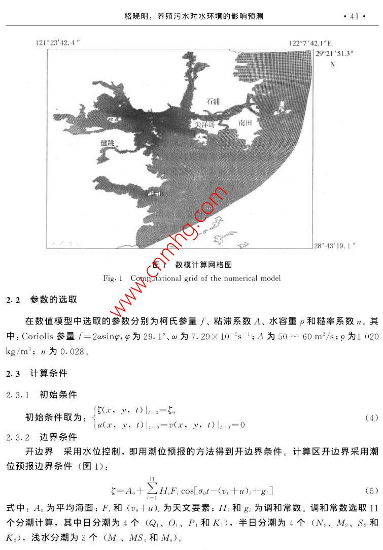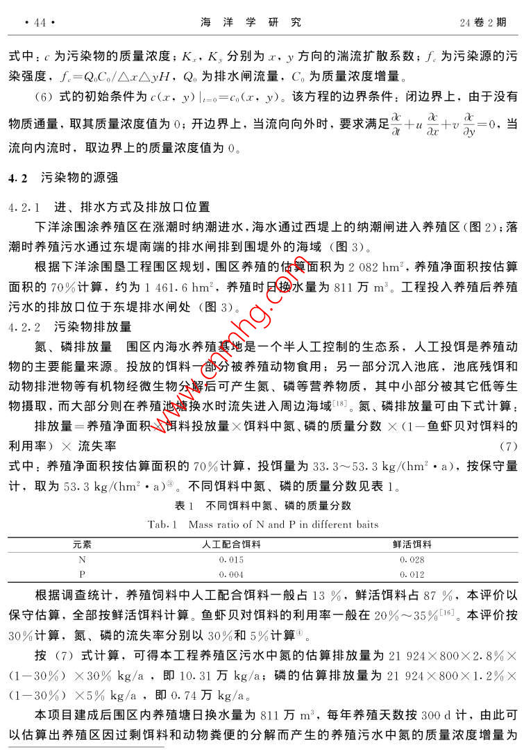 第24卷第2期海洋學(xué)研究Vol 24 No. 22006年6月JOURNAL OF MARINE SCIENCESune文章編號:1001-909X(2006)02-0039-10養(yǎng)殖污水對水環(huán)境的影響預(yù)測駱曉明(浙江省錢塘江管理局勘測設(shè)計院,浙江杭州310016)摘要:浙江三門灣寧海下洋涂圍墾工程投入養(yǎng)殖后排放的養(yǎng)殖污水將對周邊水環(huán)境產(chǎn)生的影響預(yù)測是該項目環(huán)境評價的重要內(nèi)容。在海灣潮流動力模擬的基礎(chǔ)上,建立了污染物對流擴散的數(shù)學(xué)模型,用以預(yù)測養(yǎng)殖污水排放后的擴散范圍及強度大小,為環(huán)境評價提供科學(xué)依椐關(guān)鍵詞:海涂圍墾;養(yǎng)殖污水;污染物質(zhì)量濃度;水質(zhì);對流-擴散方程;數(shù)值計箅中圖分類號:X830.3文獻(xiàn)標(biāo)識碼:A0引言浙江沿海在理論深度基準(zhǔn)面以上的海涂資源總面積約為28.9萬hm2。海涂圍墾已經(jīng)給浙江省帶來了可觀的經(jīng)濟效益,但也對環(huán)境產(chǎn)生了一些負(fù)面的影響,圍墾使局部水域的水動力條件改變,出現(xiàn)海床的沖淤變化外,圍墾區(qū)養(yǎng)殖污水對周邊水環(huán)境也會產(chǎn)生一定的影響門。為此,本文從水動力數(shù)學(xué)模型出發(fā),預(yù)測圍墾工程投入養(yǎng)殖后排放的污水對周邊水環(huán)境的影響情況。污染物擴散的模擬計算,在河流中的應(yīng)用較早也較多,建立江河中污染物的動態(tài)數(shù)學(xué)模型,能較好地模擬污染物的散擴過程-η對海洋中污染物質(zhì)遷移模式的研究也已有報道,一般都是用有限水體劃分方法,建立具有統(tǒng)計學(xué)特征的污染物混合遷移模式·。水污染的計算機模擬適用于源或匯,對河道和海灣中污染物擴散的情況進(jìn)行數(shù)值模擬,為環(huán)境的預(yù)測和評價提供科學(xué)依據(jù)本文以浙江三門灣寧海下洋涂圍墾工程投入養(yǎng)殖后排放的養(yǎng)殖污水對周邊水環(huán)境的影響為例,進(jìn)行數(shù)值模擬,在海灣潮流動力模擬旳基礎(chǔ)上,建立污染物擴散旳數(shù)學(xué)模型,以便預(yù)測養(yǎng)殖污水排放后的擴散范圍及強度大小。1數(shù)學(xué)模型浙江三門灣是一個支港多、潮差大、垂直混合良好的海灣,在潮汐、徑流作用下,其40海洋學(xué)研究24卷2期潮流表現(xiàn)為非恒定的流動??刂品匠滩捎媒?jīng)垂線積分含水平渦動粘滯項的淺水潮波方1.1模型控制方程潮流的計算方程如下:az a(Hu)a(Hv)(1)Or tu ay tg arf乙)+(e,(2)+a如+by++8CH=a()×、3。(3)式中:ξ為水位;h為海底高程;H為總水位,H=h+;a,v分別為x,y方向上的垂線平均流速分量,m/s;g為重力加速度;∫為柯氏力參量(∫=2 CUsing,ω為地球自轉(zhuǎn)角速率);C為謝才系數(shù),取C=1H,n為糙率系數(shù);,,分別為x,y方向的水平渦動擴散系數(shù);W:,Wy為x,y方向的風(fēng)應(yīng)力分量,不考慮風(fēng)應(yīng)力作用時,取W=0,W,=0;t為時間式(1)為潮流連續(xù)方程,式(2)和(3)分別為x,y方向的動量守恒方程??紤]到三門灣邊界及周邊地形形狀較為復(fù)雜,為了較好地模擬地形,對上述方程組的求解采用正交曲線坐標(biāo)。1.2微分方程的離散格式計算模型采用平面二維曲線正交網(wǎng)格的有限差分模式。正交曲線坐標(biāo)系下的控制方程與原方程相比,除了增加了一些系數(shù)之外,形式上是類似的1。對于上述方程,利用傳統(tǒng)的ADⅠ法求解,其離散格式與矩形網(wǎng)格下的格式基本一致。2計算條件2.1計算范圍為了便于給定邊界條件,本模型南邊界取殼塘山,東邊界取石浦作為研究區(qū)域(圖1)全水域面積約775km2。采用曲線網(wǎng)格對計算域進(jìn)行剖分,與一般的矩形網(wǎng)格剖分相比,曲線網(wǎng)格可以更好地貼近邊界,從而可以較好地模擬邊界處的流態(tài),減小邊界所造成的計算影響。計箅域內(nèi)剖分成300×30、總共有9000個網(wǎng)格,最大的網(wǎng)格邊長取150m左右,圍墾工程區(qū)附近的網(wǎng)格尺度控制在30m之內(nèi),計算時間步長為4min。模型計算網(wǎng)格見圖1駱曉明:養(yǎng)殖污水對水環(huán)境的影響預(yù)測41121°2342.4122742.|"E29°2151.3石浦南H金28°4319.1圖1數(shù)模計算網(wǎng)格圖Fig. 1 Computational grid of the numerical model2.2參數(shù)的選取在數(shù)值模型中選取的參數(shù)分別為柯氏參量∫、粘滯系數(shù)A、水容重ρ和糙率系數(shù)n。其中: Coriolis參量∫=2 asing,φ為29.1°、a為7.29×10s-;A為50~60m2/s;P為1020kg/m3;n為0.028。2.3計算條件2.3.1初始條件初始條件取為(4)lu(x. y, t)lr=o=v(x, y, t)l=o=02.3.2邊界條件開邊界采用水位控制,即用潮位預(yù)報的方法得到開邊界條件。計算區(qū)開邊界采用潮位預(yù)報邊界條件(圖1)S=A+2H F cos[, t-(vo+u)+gI(5)式中:A為平均海面;F和(τ+a)為天文要素;H和g為調(diào)和常數(shù)。調(diào)和常數(shù)選取11個分潮計算,其中日分潮為4個(Q1、O1、P1和K1),半日分潮為4個(N2、M2、S2和K2),淺水分潮為3個(M1、MS4和M)。海洋學(xué)研究24卷2期3模型驗證據(jù)本區(qū)域的潮位和潮流的大、小潮現(xiàn)場觀測資料,對模型進(jìn)行驗證,從而評估模型的可靠性3.1潮位驗證選擇2003年4~5月水文測驗期間,用獲取的核電廠址、南田島、牛山、花岙島、巡檢司、白玉灣島臨時潮位站同步的潮位觀測資料進(jìn)行驗證,實測潮位與模擬計算的潮位之間擬合得較好,最高、最低潮位的模擬誤差一般在10cm以內(nèi)3.2潮流驗證對工程區(qū)流速流向的驗證采用2003