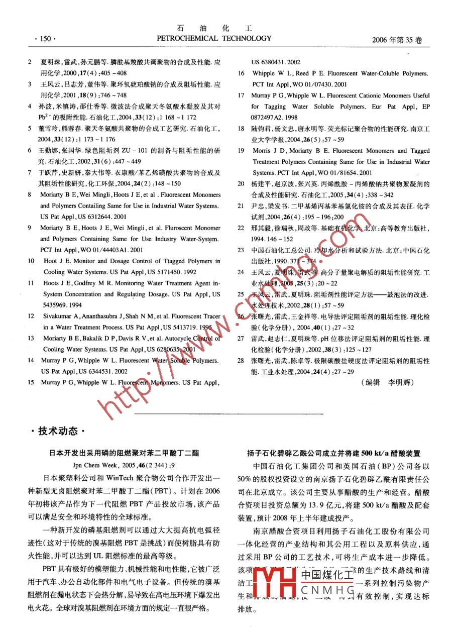 石油化工006年第35卷第2期PETROCHEMICAL TECHNOLOGY145含熒光基團(tuán)的丙烯酸-丙烯酰胺共聚物的合成雷武!,平春霞,王風(fēng)賀',夏明珠',張躍華·2,王風(fēng)云(1.南京理工大學(xué)工業(yè)化學(xué)研究所,江蘇南京210094;2.南通大學(xué)化學(xué)化工學(xué)院,江蘇南通226007)[摘要]以4-氯-1,8-萘二甲酸酐和3-二甲氨基內(nèi)胺為原料合成了一種水溶性的熒光單體4-甲氧基-N-(2-N,N-甲基氨基丙基)萘二甲酰亞胺烯丙基氯化銨(4- MNDMAPN-AQ),并得到了最佳的合成條件。通過紅外光譜、核磁共振譜、質(zhì)譜等方法對(duì)產(chǎn)物結(jié)構(gòu)進(jìn)行了表征。將該熒光單體與丙烯酸(AA)、丙烯酰胺(AM)共聚,得到了共聚物AAAM4- MNDMAPNAQ。對(duì)該共聚物的熒光性質(zhì)和阻垢性能進(jìn)行了系統(tǒng)研究,結(jié)果表明,該共聚物的熒光強(qiáng)度與其質(zhì)量濃度呈良好的線性關(guān)系,線性相關(guān)系數(shù)為09950,檢測(cè)下限為0.48mg/L。采用硬垢法,在(75±0.2)℃、[Ca2+]=5mmoL、[HCO3]=10mmoM/L、恒溫10h、共聚物AAAM4 MNDMAPN-AQ的質(zhì)量濃度為2.5mg/L的條件下,該共聚物的阻垢率可達(dá)70.78%,與阻垢性能良好的2-膦酸基丁烷-1,2,4-三羧酸相當(dāng),達(dá)到了阻垢劑的阻垢分散性能要求,表明該共聚物具有良好的阻垢性能[關(guān)鍵詞]熒光單體;季銨鹽;合成;共聚物;丙烯酸;丙烯酰胺;阻垢劑[文章編號(hào)]1000-8144(2006)02-0145-06中圖分類號(hào)]TQ085.412[文獻(xiàn)標(biāo)識(shí)碼]ASynthesis of Acrylic Acid-Acrylamide Copolymer Containing Fluorescent GroupLei Wu', Ping Chunxia, Wang Fenghe, Xia Mingzhu, Zhang Yuehua, Wang Fengyun(l Industrial Chemistry Institute, Nanjing University of Science& Technology, Nanjing Jiangsu 210094, China;2. College of Chemistry and Chemical Engineering, Nantong University, Nantong Jiangsu 226007, China)Abstract] A novel water soluble fluorescent monomer, 4-methoxy-N-( 3-dimethylaminopropylnaphthalimide allyl chloride quatemary ammonium salt(4-MNDMAPN-AQ), was synthesized from 4chloro-1, 8-naphthalic anhydride and 3-dimethyl amino propylamine. The optimal reaction conditionswere obtained, and structure of the product was characterized by means of IR, H NMR and ms. Thecopolymer AA/AM/4-MNDMAPN-AQ from acrylic acid( AA), acrylamide( AM)and 4-MNDMAPN-AQ was prepared. The fluorescent properties and scale inhibition performance of the copolymer werestudied in detail. Relationship between fluorescent intensity and concentration of copolymer was linearin concentration range of 1-8 mg/L. The correlation coefficient(R )was 0. 995 0. Under optimalconditions:[ Ca*]=5 mmol/L, HCO ]=10 mmol/L, I=(75+0. 2)C for 10 h and copolymermass concentration 2. 5 mg/L, the scale inhibition rate could reach 70. 78% by means of hard scaledetermination. Beside possessing fluorescence, the copolymer AA/AM/4-MNDMAPN-AQ, as a higherformance scale inhibitor, was comparable with 2-phosphono-butane-1, 2, 4-tricarboxylic acid whichwas known as the best scale inhibitorKeywords] fluorescent monomer; quaternary ammonium salt synthesis; copolymer; acrylic acidcrylamide scale inhibitor有機(jī)膦類阻垢緩蝕劑一直以來都是水處理藥劑加藥方式中因加藥不及時(shí)造成的腐蝕、結(jié)垢等問題或的核心組分,隨著環(huán)境保護(hù)要求的日益提高,低膦、無加藥過多而造成的資源浪費(fèi),實(shí)現(xiàn)了水處理藥劑的在膦藥劑成為水處理領(lǐng)域的發(fā)展趨勢(shì)1-。同時(shí)由于線分析和自控加藥,國(guó)內(nèi)在這方面的研究剛剛起步3處理過程中的監(jiān)控要求,傳統(tǒng)的用化學(xué)分析總磷作為中國(guó)煤化工,首先以4一氯一1,藥劑有效濃度控制指標(biāo)的方法越來越不適應(yīng)需要。具有熒光性能的水處理藥劑是一種示蹤型水處理劑[收CNMHG]200-11-05。[作者簡(jiǎn)介]雷武(1971-),男湖北省武漢市人,碩士,副教投,電具有靈敏度高、檢測(cè)下限低等優(yōu)點(diǎn),成為水處理領(lǐng)域話025-8415190,電郵leiwuhao@yahoo.com,cm。聯(lián)系人:王風(fēng)的研究熱點(diǎn)8-18。采用示蹤型水處理劑避免了傳統(tǒng)云,電話025-84315190石油化工PETROCHEMICAL TECHNOLOGY2006年第35卷8-萘二甲酸酐和3-二甲氨基丙胺為原料,經(jīng)3步系,及其對(duì)CaCO3的阻垢分散性能。反應(yīng)合成了一種水溶性的熒光單體4-甲氧基N-(2-N,N-二甲基氨基丙基)萘二甲酰亞胺烯1實(shí)驗(yàn)部分丙基氯化銨(4- MNDMAPN-AQ),然后與丙烯酸1.1反應(yīng)方程式(AA)和丙烯酰胺(AM)共聚,得到了一種新型多功單體4- MNDMAPN-AQ的合成反應(yīng)見式能含熒光基團(tuán)的共聚物(AAAM4- MNDMAPN(1);共聚物AAAM4- MNDMAPN-AQ的合成AQ)??疾炝嗽摴簿畚镔|(zhì)量濃度與熒光強(qiáng)度的關(guān)反應(yīng)見式(2)。CH,CH,CHIN