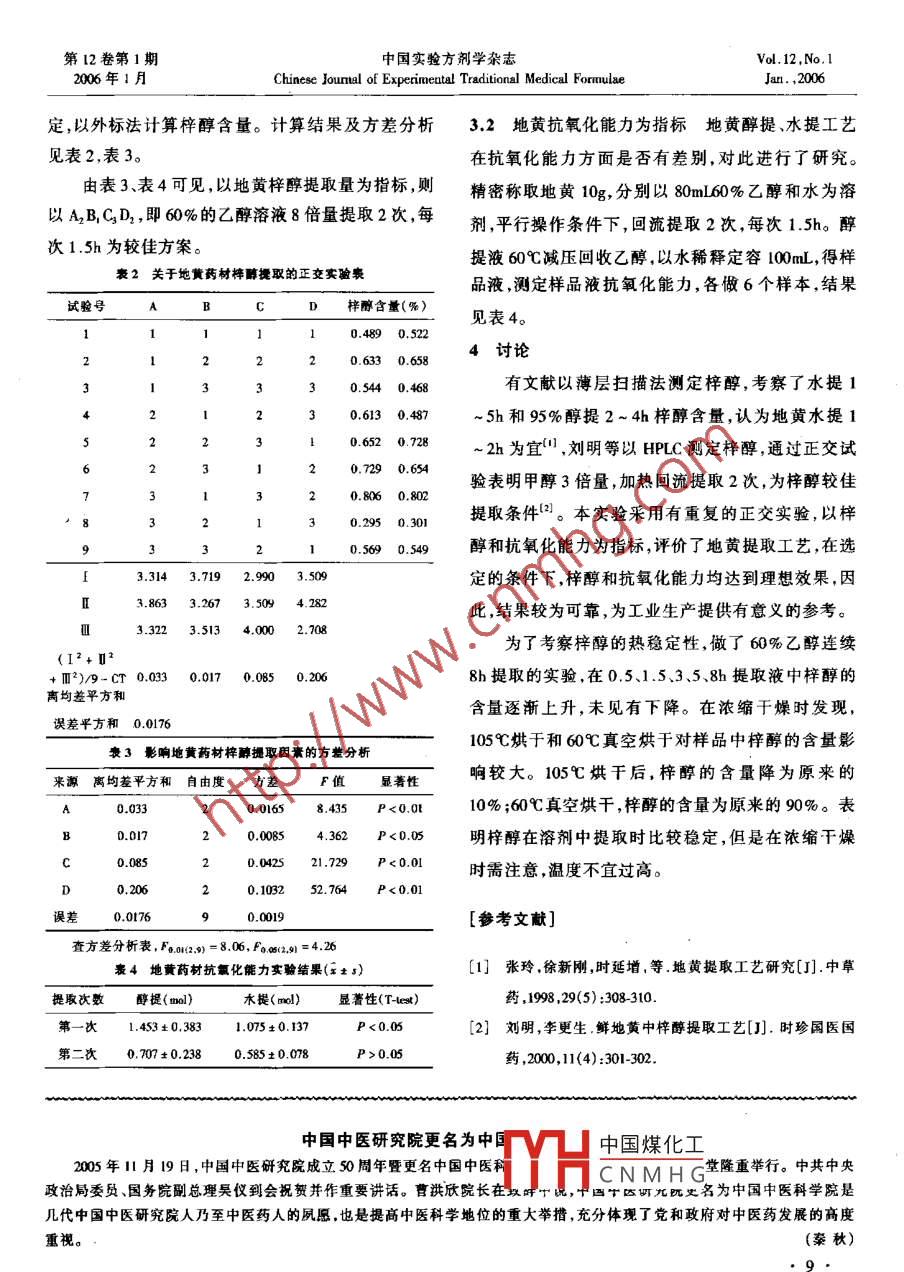 第12卷第1期中國實驗方劑學(xué)雜志Vol. 12,No.12006年1月Chinese Jourmal of Experimental Traditional Medical FormulaeJan. ,2006地黃提取工藝的優(yōu)化宋子榮'* ,譚梓駿”,陳西松’,白海波'(1.江西中醫(yī)學(xué)院,江西南昌330006; 2. 浙江養(yǎng)生堂藥物研究所,浙江杭州~ 310007;3.浙江中醫(yī)學(xué)院,浙江杭州310053)[摘要]目的 :研兗地黃中有效成分梓醇以及地黃抗氧化能力的最佳提取條件。方法:以HPLC為含量測定方法,采用重復(fù)正交實驗法,以乙醇濃度(A)、溶劑量(B)、提取時間(C)和提取次數(shù)(D)4個因素,每個因素選取3個水平進(jìn)行實驗,同時利用化學(xué)發(fā)光法進(jìn)行體外抗氧化能力研究,最后確定提取工藝。結(jié)果:因素A.B、C、D對梓醇的含量均有顯著影響。其抗氧化能.力以醇提2次為佳。結(jié)論:60%乙醇8倍量,回流提取2次,每次1.5h為梓醇及地黃抗氧化能力的較佳提取條件。[關(guān)鍵詞]地黃;梓醇 ;正交實驗;抗氧化能力;HPLC;化學(xué)發(fā)光法[中圖分類號] R283.6[文獻(xiàn)標(biāo)識碼] B [文章編號] 105-9302006010008-02地黃為玄參科植物Rehma,nnia glutinosa Libosch.作,注入發(fā)光儀進(jìn)行測定,以Ve為對照品進(jìn)行計算。的塊莖,其化學(xué)成分研究表明,有效成分含有梓醇等3結(jié)果環(huán)烯醚萜甙類,極性較大,為更好發(fā)揮地黃的藥用功3.1梓醇為指標(biāo)效,本研究以梓醇為檢測指標(biāo),采用HPLC方法,考3.1.1提取溶劑的確定 取10g地黃藥材兩份,一察了提取溶媒、提取方法、提取次數(shù)和溶媒用量等因份用10倍水提取1h,提取4次,每次100mL 定容;素,同時采用化學(xué)發(fā)光法,以地黃抗氧化能力為指標(biāo)- 份用10倍70%乙醇提取1小時,提取4次,每次對提取條件進(jìn)行探討,確定了最佳工藝條件。100mL定容,10倍稀釋后HPLC法測定梓醇含量。1儀器與試劑檢測結(jié)果:水提得率為1.28%, 第一次提取出66%,Angilent1100高效液相色譜儀,DAD檢測器;70%乙醇提取得率為1.96%,第一次提取出75%。Photochem發(fā)光儀(德耶拿儀器公司),梓醇(0808~所 以選擇醇提法提取,梓醇提取得率更高。9803,中國藥品生物制品檢定所);乙腈(色譜純);化3.1.2正交實驗設(shè)計及結(jié)果 為確定 地黃醇提的學(xué)發(fā)光試劑盒(德耶拿儀器公司);地黃藥材(華東醫(yī)提取工藝,以梓醇為指標(biāo),采用L,(3^ )正交實驗進(jìn)行藥股份有限公司)經(jīng)鑒定為玄參科植物地黃優(yōu)選,正交因素,水平見表1。Rehmannia glutinosa Libosch. 的塊莖。表1正交試驗因素 、冰平裹2實驗方法因素2.1梓醇含量測定 采用 HPLC法測定,色譜柱為4.6x 150mm C18;流動相為乙腈-水(2:98);檢測波乙醇依度(%)溶劑量(倍)提取時間(h) 提取次數(shù)(次)長212nm;柱溫28C;流量0.6mL/min;經(jīng)方法學(xué)考0.5察合格,回歸方程為Y = 0.0002X - 0.0016, r =21.50.9999。(Y:濃度,X:峰面積)2.2地黃抗氧化能力測定 地黃 提取液(0.1g生藥提取工藝過程為稱取地黃10g左右,以不同濃/mL)作1:50稀釋,精密吸取20puL,按試劑盒說明操度中國煤化工,分別按L,(3* )正交MHCNMHG液,加水稀釋定容至1000mL,得1 ~9號樣品液,做2次重復(fù)。精密量取[收稿日期] 204-11-.10[遁訊作者]宋子榮 , (0571)86669211上述樣品溶液1mL,高速離心,注入色譜儀進(jìn)行測●8..第12卷第1期中國實驗方劑學(xué)雜志Vol.12,No. 12006年1月Chinese Jounal of Experimneatal Traditional Medical ForoulaeJan. ,2006定,以外標(biāo)法計算梓醇含量。計算結(jié)果及方差分析3.2地黃抗氧化能力為指標(biāo) 地黃醇提 、水提工藝見表2,表3。在抗氧化能力方面是否有差別,對此進(jìn)行了研究。由表3、表4可見,以地黃梓醇提取量為指標(biāo),則精密稱取地黃10g,分別以80mL60%乙醇和水為溶以A,B,CD,,即60%的乙醇溶液8倍量提取2次,每劑,平行操作條件下,回流提取2次,每次1.5h。醇次1.5h為較佳方案。提液60減壓回收乙醇,以水稀釋定容100mL,得樣表2關(guān)于地黃藥材梓醉提取的正交實驗表品液,測定樣品液抗氧化能力,各做6個樣本,結(jié)果試驗號B梓醇含量(%)見表4。0.489 0.5220.633 0.6584討論0.544 0.468有文獻(xiàn)以薄層掃描法測定梓醇,考察了水提10.613 0.487~5h和95%醇提2~4h梓醇含量,認(rèn)為地黃水提10.652 0.728~ 2h為宜",劉明等以HPLC測定梓醇,通過正交試0.729 0.654驗表明甲醇3倍量,加熱回流提取2次,為梓醇較佳0.806 0.802提取條件(2]。本實驗采用有重復(fù)的正交實驗,以梓0.295 0. 3010.569 0. 549醇和抗氧化能力為指標(biāo),評價了地黃提取工藝,在選3.314 3.719 2.990 3. 509定的條件下,梓醇和抗氧化能力均達(dá)到理想效果,因[3.863 3.267 3.509 4 .282此,結(jié)果較為可靠,為工業(yè)生產(chǎn)提供有意義的參考。3..322 3.513 4.000 2.708為了考察梓醇的熱穩(wěn)定性,做了60%乙醇連續(xù)(I2+ U2+ m2)/9-CT 0.033 0.017 0.0B5 0.2068h提取的實驗,在0.5.1.5.3.5.8h提取液中梓醇的離均差平方和含量逐漸上升,未見有下降。在濃縮于燥時發(fā)現(xiàn),誤差平方和0.0176105C烘于和60C真空烘于對樣品中梓醇的含量影褒3影響地黃藥材梓醇提取因囊的方整分析響較大。105氣烘干后,梓醇的含量降為原來的來源離均差平方和自 由度方差F值顯著性0.0330.01658.435p<0.0t10% ;60C真空烘干,梓醇的含量為原來的90%。表.0.00854.362P< 0.05明梓醇在溶劑中提取時比較穩(wěn)定,但是在依縮干燥0.0850.042521.729P<0.0I時需注意,溫度不宜過高。.0.2060.103252. 764P<0.01誤差0.01760.0019 .[參考文獻(xiàn)]查方差分析表,Fo.oua.0) = 8.06, F.or2.0 =4.26表4地黃藥材抗氧