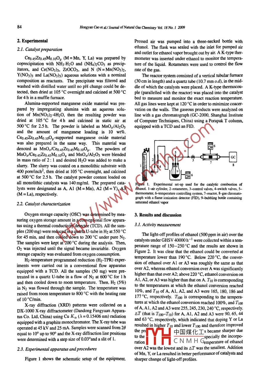 Availableonlineatwww.sciencedirect.comSciencedirectCHEMISTRYELSEVIERJournal of Natural Gas Chemistry 18(2009)83-87www.elsevier.com/locate/jngcMnO/AlO3/Ceo.4 Zro. 4 M, 100,(M=Mn, Y, La) catalysts used forethanol catalytic combustionHongyan Cao, Weicong Song, Maochu Gong, Jianli Wang, Shenghui Yan, Zhimin Liu,Yaoqiang ChenKey Laboratory of Green Chemistry Technology Ministry of Education, College of Chemistry, Sichuan Universit Chengdu 610064, Sichuan, ChinaManuscript received November 7, 2008; revised December 17, 2008]AbstractMnO-/Al203/Ceo. 4]. 4 Mo1o0, (=Mn, Y, La)catalysts were prepared by impregnation method and characterized by BET, TPRand XRD analyses. The catalytic activities toward ethanol combustion were imvestigated in a microreactor. The results demonstrated thatthe catalytic activity of MnO-/ Al2O3/Ceo. so Zro soOz monolithic catalyst could be improved by doping Mn, Y and La into Ceo. so Zro 5002When doping Y into Ceo. s0Zros002, the catalyst MnO2/Al203/Ce, 45Zr045 Y01001.95 showed the highest activity. The 100% conversiontemperature of ethanol was 230C. Furthermore, once the conversion of ethanol started, the complete conversion was quickly achieved. Thedoping of Mn, Y and La led to better activity for ethanol combustion and lower temperature reduction peaks in TPR profiles. The doping of Mnresulted in enhanced oxygen storage capacity(OSC), larger area of the reduction peaks, and excellent reactivity, and the doping of Y resultedin the lowest reduction temperature and the best activity.Key words: MnOx; ethanol; ceria-zirconia solid solutions; doping1. Introductionthan other metal oxides. However, transition metal oxides aremuch cheaper and allow a higher catalyst loading. Moreover,In recent years, with the more strict regulations of the their activity for VOCs combustion is comparable with the no-environment, a renewable fuel ethanol, as a replacement for ble metal catalysts under certain conditions [7-10gasoline, is used in cars as an octane enhancer and oxygenatedAs far as supports are concemed, particular attentionadditive to gasoline [1]. In addition, ethanol is a potential is being paid to ceria-based materials, especially Ceo2-liquid fuel used for direct alcohol fuel cell( DAFC) because containing mixed oxides with the fluorite structure [ll]of its low cost, easy storage, facile transportation, and high- Ceria-based solid solutions, such as CeO2-Al2O3, Ceo,energy content[2]. Although hydrocarbon exhaust emissions La203, CeO2-SiO2, CeO2-HO2, CeO2-PrO2, and Ceoof ethanol are less toxic than those of gasoline, there are in- ZOz, have been intensively investigated [12-18]. Amongtermediate formed during the oxidation, which can lower the them, CeO2- ZrOz possesses the best thermal stability, excelactivity of catalysts, pollute the environment, and do harm to lent redox behavior, and higher oxygen storage capacity. Inhuman beings. Among all the methods of eliminating the pol- addition, doping some metal oxides into Ceo2-ZrO2 solid so-lution of ethanol and its byproducts, catalytic combustion is a lutions has a positive effect on the redox property and oxy-promising one. Therefore, it is quite important and necessary gen storage capacity of the solid solutions [19, 20], and mayto find a catalyst with excellent activity for ethanol conversion cause significant modifications in the crystal structure and mito co2.crostructure [21, 22].Several groups have investigated the reactivity of volatileIn present work, Mn-containing catalysts with ceria-organic compounds(vOCs, ethanol is a kind) over the nobleronia solid solutions modified by Mn, Y and La were premetal supported catalysts and the metal oxide catalysts, and parehararterined in order to study thethe correlation between their reactivity and structure[3-6]. effed中國煤化工 ria-zirconia solid soluGenerally speaking, the noble metal catalysts are more active tionsCNMHGticcombustion.Corresponding author. Tel/Fax: 028-85418451; E-mail: nic7501 @emailscueducnute of Chemical Physics, Chinese Academy of Sciences. All rights reserved.doi: 1Hongyan Cao et al/ Journal of Natural Gas Chemistry Vol. 18 No. 1 20092. ExperimentalPressed air was pumped into a three-necked bottle with2. 1. Catalyst prepethanol. The flask was sealed with the inlet for pumped airand outlet for ethanol vapor brought out by air. A K-type ther-Ceo.45Zr04s Mo10O,(M=Mn, Y, La) was prepared by mometer was inserted under ethanol to monitor the tempera-coprecipitation with NH3 H20 and(NH4) CO as precip- ture of the liquid. Rotameters were used to control the flowitators, and Ce(NO3)3, ZrOCO, and N(N= Mn(NO3), rate of the gas.Y(NO3)3 and La(NO3))aqueous solutions with a nominalThe reactor system consisted of a vertical tubular fumacecomposition as reactants. The precipitate was filtered and (30 cm in length)and a quartz tube (10. 7 mm od), in the mid-washed with distilled water until no pH change could be de dle of which the catalysts were placed. A K-type thermocou-tected, then dried at 105C overnight and calcined at 500c ple(parallelled with the reactor)was placed into the catalystfor 4 h in a muffle furnacebed to measure and monitor the exact reaction temperatureAlumina-supported manganese oxide material was pre- All gas lines were kept at 120C in order to minimize coacerared by impregnating alumina with an aqueous solu- vation on the walls. The gaseous products were analyzed ontion of Mn(NO3)24H2O, then the resulting powder was line with a gas chromatograph(GC-2000, Shanghai Institutedried at 105C for 4h and calcined in static air at of Computer Techniques, China)using a Porapak T column,500C for 2.5h. The powder is labeled as MnO-/AlO3 equipped with a TCD and an FIDand the amount of manganese loading is 10 wt%Ceo. 45Zro 4]Mo 1oO,supported manganese oxide materialwas also prepared in the same way. This material wasdenoted as MnO/Ceo. 45Zr045 Mo. 1oOy. The powders ofMnOx/Ceo. 45Zr0.45Mo. 1oOy and MnO_/Al2O were blendedin mass ratio of 2: 1 and desired H2O was a