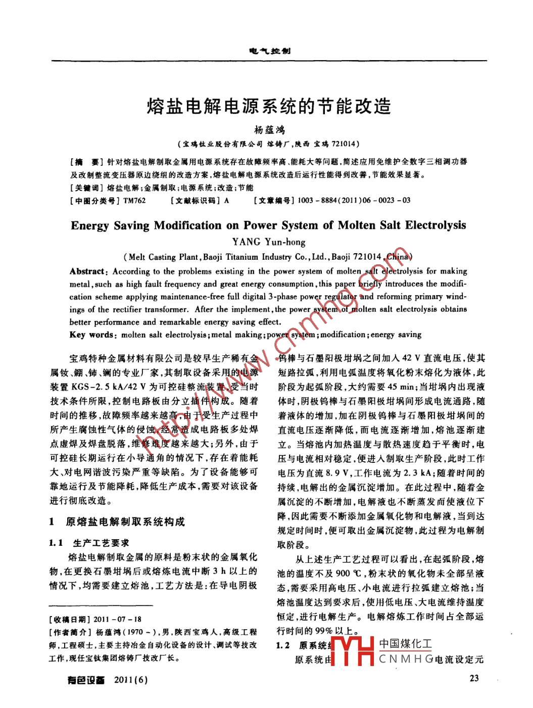 電氣控制熔鹽電解電源系統(tǒng)的節(jié)能改造楊蘊鴻(寶雞鈦業(yè)股份有限公司熔鑄廠,陜西寶雞721014)[摘要]針對熔鹽電解制取金屬用電源系統(tǒng)存在故障頻率高能耗大等問題,簡述應(yīng)用免維護全數(shù)字三相調(diào)功器及改制整流變壓器原邊繞組的改造方案,熔鹽電解電源系統(tǒng)改造后運行性能得到改善,節(jié)能效果顯著。關(guān)鍵詞]熔鹽電解;金屬制取;電源系統(tǒng);改造;節(jié)能[中圍分類號]TM762[文獻(xiàn)標(biāo)識碼]A[文章編號]1003-8884(2011)06-0023-03Energy Saving Modification on Power System of Molten Salt ElectrolysisYANG Yun-hongMelt Casting Plant, Baoji Titanium Industry Co, Ltd. Baoji 721014, China)Abstract: According to the problems existing in the power system of molten salt electrolysis for makingmetal, such as high fault frequency and great energy consumption, this paper briefly introduces the modification scheme applying maintenance-free full digital 3-phase power regulator and reforming primary windings of the rectifier transformer. After the implement, the power system of molten salt electrolysis obtainsbetter performance and remarkable energy saving effect.Key words: molten salt electrolysis; metal making; power system; modification; energy saving寶雞特種金屬材料有限公司是較早生產(chǎn)稀有金鎢棒與石墨陽極坩堝之間加入42V直流電壓,使其屬釹、錋、鈰、鑭的專業(yè)廠家,其制取設(shè)備采用的電源短路拉弧,利用電弧溫度將氧化粉末熔化為液體,此裝置KGS-2.5kA/42Ⅴ為可控硅整流裝置,受當(dāng)時階段為起弧階段,大約需要45min;當(dāng)坩堝內(nèi)出現(xiàn)液技術(shù)條件所限,控制電路板由分立插件構(gòu)成。隨著體時,陰極鎢棒與石墨陽極坩堝間形成電流通路,隨時間的推移,故障頻率越來越高,由于受生產(chǎn)過程中著液體的增加,加在陰極鎢棒與石墨陽極坩堝間的所產(chǎn)生腐蝕性氣體的侵蝕,經(jīng)常造成電路板多處焊直流電壓逐漸降低,而電流逐漸增加,熔池逐漸建點虛焊及焊盤脫落,維修難度越來越大;另外,由于立。當(dāng)熔池內(nèi)加熱溫度與散熱速度趨于平衡時,電可控硅長期運行在小導(dǎo)通角的情況下,存在著能耗壓與電流相對穩(wěn)定,便進入制取生產(chǎn)階段,此時工作大、對電網(wǎng)諧波污染嚴(yán)重等缺陷。為了設(shè)備能夠可電壓為直流89V,工作電流為23kA;隨著時間的靠地運行及節(jié)能降耗,降低生產(chǎn)成本,需要對該設(shè)備持續(xù),電解出的金屬沉淀增加。在此過程中,隨著金進行徹底改造。屬沉淀的不斷增加,電解液也不斷蒸發(fā)而使液位下1原熔鹽電解制取系統(tǒng)構(gòu)成降,因此需要不斷添加金屬氧化物和電解液,當(dāng)?shù)竭_(dá)規(guī)定時間時,便可取出金屬沉淀物,此過程為電解制1.1生產(chǎn)工藝要求取階段。熔鹽電解制取金屬的原料是粉末狀的金屬氧化從上述生產(chǎn)工藝過程可以看出,在起弧階段,熔物,在更換石墨坩堝后或熔煉電流中斷3h以上的池的溫度不及900℃,粉末狀的氧化物未全部呈液情況下,均需要建立熔池,工藝方法是:在導(dǎo)電陰極態(tài),需要采用高電壓、小電流進行拉弧建立熔池;當(dāng)熔池溫度達(dá)到要求后,使用低電壓、大電流維持溫度[收稿日期]201-07-18恒定,進行電解生產(chǎn)。電解熔煉工作時間占全部運[作者簡介]楊蘊鴻(1970-),男陜西寶雞人,高級工程行時間的99%以上師,工程碩土,主要主持冶金自動化設(shè)備的設(shè)計調(diào)試等技改12原系統(tǒng)4中國煤化工工作,現(xiàn)任寶鈦集團熔鑄廠技改廠長。原系統(tǒng)CNMHG電流設(shè)定元有色設(shè)高2011(6)電氣控制件,在可控硅輸出主回路中設(shè)直流電流互感器,互感波危害同時易于實現(xiàn)分組控制。器檢測出的信號作為電流表的指示信號和系統(tǒng)控制2.2新系統(tǒng)構(gòu)成負(fù)反饋信號,由三塊分立元件構(gòu)成的電子線路板分(1)在改造方案中,由于干式整流變壓器的容別實現(xiàn)直流±15V控制電源的產(chǎn)生、直流電流的調(diào)量和負(fù)載并未發(fā)生變化,遵照低投人原則,干千式整流整及跟隨、直流電流的限幅與過流保護控制脈沖的變壓器的鐵芯和副邊繞組不動,將原邊繞組重新繞形成與分配脈沖的整形與放大等功能。整流變壓制引出中間抽頭,全繞組和中間抽頭繞組分別對應(yīng)器原邊三相380V輸入,采用△形接法,副邊為帶平380V/11.2V和380V/36.5V。衡電抗器的雙反Y形接法,輸出36.5V相電壓到可(2)選用一臺智能化、模塊化的三相全數(shù)字化控硅裝置,可控硅裝置的直流輸出加在熔煉爐的陰調(diào)功器KTY31,該調(diào)功器適用于阻性負(fù)載、感性負(fù)極鎢棒和石墨陽極坩堝兩端,提供電解熔煉工作電載;變壓器的一次側(cè)選用高級單片機作為控制核心;源(見圖1)。選用單塊SMT表面貼裝技術(shù)電子線路板,在定購時380V提出密封線路板等特殊要求。KTY31具有豐富的整流變壓器|電抗器軟件功能模塊;如參數(shù)鍵盤設(shè)置、LED數(shù)碼顯示;輸F畫脈沖脈沖入、輸出可編程;方便組態(tài);具有“自動限流”功能,當(dāng)輸出電流大于額定電流時,電流被限制;具有過L電流互感器折示儀悉}流、過熱、晶閘管故障、主回路電源丟失/缺相、負(fù)載斷線等保護功能;集開環(huán)/閉環(huán)控制,電壓移相、過零1改造前熔鹽電解制取電源系統(tǒng)觸發(fā)、脈寬調(diào)制為一體,輸入可編程定義內(nèi)/外給定2技術(shù)改