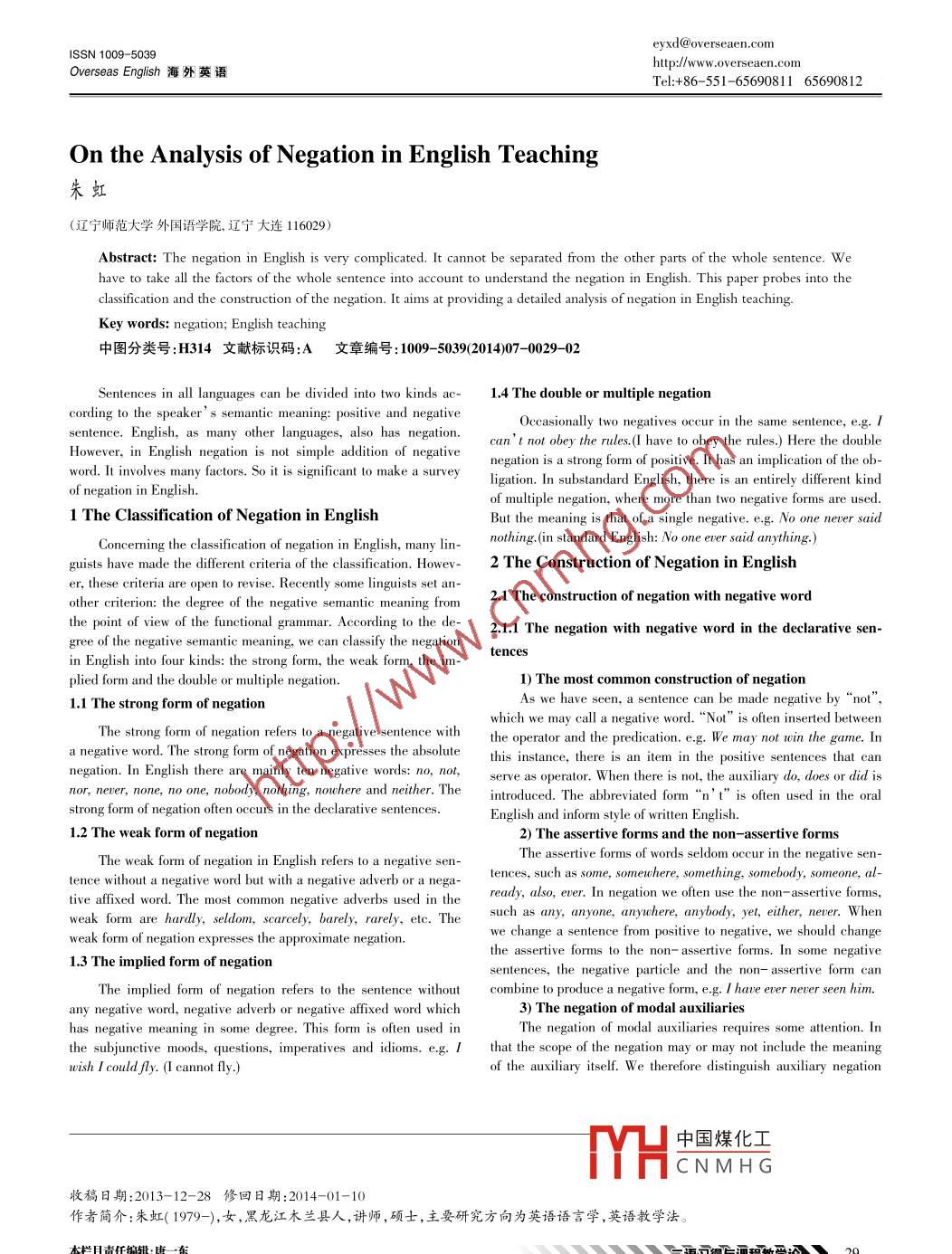 eyxd@overseaen.comISSN 1009- -5039htp://ww.overseaen.comOverseas English海外英語Tel:+86- -551-65690811 65690812On the Analysis of Negation in English Teaching朱虹(遼寧師范大學外國語學院,遼寧大連116029)Abstract: The negation in English is very complicated. It cannot be separated from the other parts of the whole sentence. Wehave to take all the factors of the whole sentence into account to understand the negation in English. This paper probes into theclassification and the construction of the negation. It aims at providing a detailed analysis of negation in English teaching.中圖分類號:H314文獻標識碼:A文 章編號:1009- -5039(2014)07-0029- 02Sentences in all languages can be divided into two kinds ac- 1.4 The double or multiple negationcording to the speaker’s semantic meaning: positive and negativeOccasionally two negatives occur in the same sentence, eg. Isentence. English, as many other languages,also has negation.can't not obey the rules(1 have to obey the rules.) Here the doubleHowever, in English negation is not simple addition of negativenegation is a strong form of positive. It has an implication of the ob-word. It involves many factors. So it is significant to make a surveyof negation in English.of multiple negation, where more than two negative forms are used.1 The Classification of Negation in EnglishBut the meaning is that of a single negative. e.g. No one never saidConcerning the classification of negation in English, many lin-nothing(in standard English: No one ever said anything.)guists have made the dfferent citera of the lasication. Howev- 2 The Construction of Negation in Englisher, these criteria are open to revise. Recently some linguists set an-other criterion: the degree of the negative semantic meaning from2.1 The construction of negation with negative wordthe point of view of the functional grammar. According to the de-2.1.1 The negation with negative word in the declarative sen-gree of the negative semantie meaning, we can classify the negationin English into four kinds: the strong form, the weak form, the im-tencesplied form and the double or muliple negation.1.1 The strong form of negationAs we have seen, a sentence can be made negative by“not”,which we may call a negative word.“Not”is often inserted betweenThe strong form of negation refers to a negative sentence withthe operator and the predication. e.g. We may not win the game. Ina negative word. The strong form of negation expresses the absolutenegation. In English there are mainly ten negative words: no, not,serve as operator. When there is nol, the auxiliary do, does or did isnor, never, none, no one, nobody, nothing, nowhere and neither. Theintroduced. The abbreviated form “n’ t”is often used in the oralstrong form of negation often occurs in the declarative sentences.English and inform style of written English.1.2 The weak form of negation2) The assertive forms and the non assertive formsThe assertive forms of words seldom occur in the negative sen-The weak form of negation in English refers to a negative sen-tence without a negative word but with a negative adverb or a nega-tences, such as some, somewhere, somelhing, somebody, someone, al-tive affixed word. The most common negative adverbs used in theready, also, ever. In negation we often use the non- assertive forms,weak form are hrls, sldom, sarcely, barely, rarely, elc. The such as any, anyone, anychere; ansbods, ywe change a sentence from positive to negative, we should changeweak form of negation expresses the approximate negation.the assertive forms to the non- assertive forms. In some negative1.3 The implied form of negationsentences, the negative particle and the non- assertive form canany negative word, negative adverb or negative affixed word which3) The negation of modal auxiliarieshas negative meaning in some degree. This form is often used inThe negation of modal auxiliaries requires some attention. Inthe subjunctive moods, questions, imperatives and idioms. e.g. I that the scope of the negation may or may not include the meaningwish I could fly. (I cannot fly.)of the auxiliary itself. We therefore distinguish auxiliary negation中國煤化工MYHCNMHG收稿日期:2013-12-28修回日期:2014-01-10.作者簡介:朱虹( 1979-),女,黑龍江木蘭縣人,講師,碩士,主要研究方向為英語語言學,英語教學法。本欄目責任編輯:唐-東Overseas English海外英語2014年04月and main verb negation. Certain auxiliaries (can and need) follow 2.2 The construction of negation with negative prefixes.the pattern of auxiliary negation, while others (will,Some negation is constructed by negative prefixes. The mostfollow that of main verb negation. May belongs to the former groupfrequently used negative afixes are un-, non-, dis-, in-, mal-,in its“permission” sense, but to the latter group in the sense ofmis-, anti-, counter- , -less, etc. Non- can normally be regarded as“possibility" . Must not is not used at all in the“necessity" sense.corresponding to clause negation: non -smoher means one who doesWe often use cannot in the sense of“ impossibility". A commonnot smoke. It frequently contrasts with un- in expressing binaryauxiliary negation of must is needn' l which has two meanings ofcontrast, rather than the opposite end of a scale.non- obligation and non- necessity. On the whole, the past tensenegative auxiliaries such as mightn' 1, couldn ' I, twouldn' t and2.3 The construction of negation with prepositionsshouldn' t follow the same pattern as their present tense equiva-Sometimes the negation can be realized by the preposition or .lents.prepositional phrase. It often occurs in some fixed idiomns. e.g This2.1.2 The negation with negative word in the interrogative sen- apple is beyond my reach. (I cannot reach this apple.)tences3 ConclusionThe most commonly used way of negation in questions is to in-Although negation is also applied in other languages, the nega-sert a negative wo