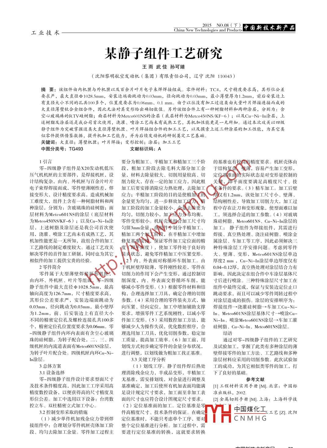 工業(yè)技術(shù)mCMP斯技木斯產(chǎn)品某靜子組件工藝研究王雨武佳孫可婧(沈陽黎明航空發(fā)動機(集團(tuán))有限責(zé)任公司,遼寧沈陽110043)摘要:該組件由內(nèi)機匣與外機匣以及百余片葉片電子柬焊焊接組成。零件材料:TC4,尺寸精度要求高,其形位公差求嚴(yán),最大直徑Φ1028.5mm,安裝邊端面跳動為θ.03mm,徑向跳動為0.03mm,最小薄壁厚為1.2mm,前后安裝邊上有直徑大小不同的孔共100多個,位置度要求為0.6mm、O.1mm。由于以往沒有加工過這類由大量葉片焊接連接而成的大直徑薄壁鈦合金組合件,因此無法對其變形給出確切數(shù)值。另外該組合件上有一種樹脂材料和兩種涂層,分別為:含空心玻璃珠的RTV硅樹脂;面層材料為 Metco601NS的涂層(底層材料為 Metco450NS/KF-6);以及Cu-Ni-m涂層,上述樹脂及涂層還是我公司首次使用,澆灌、噴涂工藝尚未有成熟工藝,其杌加性能更是一無所知。通過本次攻關(guān)以四級靜子組件為突破掌握這類大直徑薄壁機匣、葉片焊接組合件的加工工藝,以及摸索上述三種涂層的加工性能,為其它類似零件提供借鑒數(shù)據(jù),提升機加工藝能力,并為后續(xù)發(fā)動機的研制奠定工藝基礎(chǔ)關(guān)鍵詞:大直徑;薄壁機匣;葉片焊接;變形控制;涂層;加工工藝中圖分類號:TG493文獻(xiàn)標(biāo)識碼:A1引言要分為粗加工、半精加工和精加工三個階的基準(zhǔn)也有較高的精度要求。機匣殼體由零~四級靜子組件是Ⅹ20發(fā)動機低壓段,粗加工階段去除毛料大部分加工余于結(jié)構(gòu)復(fù)雜,壁薄,容易產(chǎn)生加工變形,壓氣機機匣的主要部件,是焊接機匣,設(shè)量,材料去除量較大、切削用量較高、切定位基準(zhǔn)面的實際狀態(tài)是對變形量控制的計結(jié)構(gòu)復(fù)雜,由內(nèi)、外機匣與百余片葉片削力較大,存在一定的加工應(yīng)力,因此粗關(guān)鍵,即平面度要滿足高精度尺寸、技電子?xùn)|焊焊接而成,零件壁薄剛性差,焊加工后要安排消除應(yīng)力熱處理,去除加工術(shù)條件的要求。(3)精車加工。加工后壁接變形大,設(shè)計精度要求高,造成機械加應(yīng)力;半精加工階段的目的是使精加工的厚僅有1.2mm,該處加工尺寸小、壁薄工難度大,組件上含有一種樹脂材料和兩余量更為均勻,進(jìn)一步釋放加工應(yīng)力;精結(jié)構(gòu)剛性差,導(dǎo)致加工切削力大,加工過種涂層,分別為:含玻璃珠的硅樹脂;面加工階段的加工余量較小、余量去除更為程中存在讓刀和變形現(xiàn)象,使型面難以加層材料為 Metco601NS的涂層(底層材料均勻,切削力較小,加工應(yīng)力分布均衡,工,須選擇合適的加工參數(shù)。(4)對玻璃為Meco450NS/KF-6);以及Cu-Ni-lm涂零件變形較小。機匣殼體組合加工尺寸均珠硅樹脂、 Metco601NS、Cu-Ni-ln涂層的層,上述樹脂及涂層還是我公司首次使勻留3mm余量,在組件中劃分半精加工、加工:靜子組件為焊接組件,其需進(jìn)行用,澆灌、嗩涂工藝尚未冇成熟工藝,其精加工兩個加工階段,在半精加工中増加焊接、真空熱處理、澆注硅樹脂、噴涂金機加性能更是一無所知,故組合件的加工修復(fù)基準(zhǔn)安排,保證零件加工定位面的精屬涂層、車加工等此必須解決工藝路線的制定難度較大。通過工藝攻關(guān)度(即平面度),使加工零件處于良好的種特殊涂層工序安排問題??紤]到零件解決零件的首件加工研制,同時也為其它裝夾狀態(tài),避免零件精加工中壓緊變形。大、壁薄、變形, Metco601Ns涂層單邊相似件的加工提供寶貴的經(jīng)驗。(2)內(nèi)、外表面對稱循環(huán)車削加工。由厚度2mm,Cu-Ni-In涂層單邊厚度僅有2零件簡介于機匣壁厚較薄,零件剛性較差,零件在0.04-0.12厚,真空熱處理對涂層結(jié)合力有零件屬于大型薄壁焊接環(huán)形機匣,切削力的作用下會產(chǎn)生變形,通過控制切影響,因此決定在組合件中車涂層基體尺由內(nèi)環(huán)、外機匣、葉片等組成。零~四級削深度,內(nèi)、外表面交替循環(huán)車削,能寸后進(jìn)行噴涂。三種特殊涂層尺寸加工在靜子組件中最大直徑Φ1028.5mm,最高夠減小零件變形。(3)根據(jù)零件材料和結(jié)組件中最終完成,保證與安裝邊定位止口軸向高度為1267mm,尺寸精度要求高,構(gòu),合理選擇加工刀具,確定合理的切削跳動要求,而且可以減少零件周轉(zhuǎn)過程中其形位公差要求嚴(yán),安裝邊端面跳動為參數(shù)。(4)采用合理的零件裝夾方式,軸對涂層造成的損傷。涂層的安排順序為o.03mm,徑向跳動為0.03πm,最小壁厚向壓緊、徑向定位,加工中增加輔助支撐焊接組件→澆灌硅樹脂→車加工Cu-Ni-為1.2mm,前、后安裝邊上有直徑大小要求,增強零件工藝系統(tǒng)剛性,以減小零Im、 Metco601Ns涂層基體尺寸→噴涂Cu-不同的精密定位孔及螺栓連接孔共100多件加工變形。(5)采用數(shù)控加工方法,能Ni-Im、噴涂 Metco601Ns涂層→車加工灌精密定位孔位置度要求為0.06mm。零夠減少人為操作失誤,優(yōu)化數(shù)控程序,合硅樹脂、Cu-Ni-In、 Metco601NS涂層四級靜子組件內(nèi)環(huán)內(nèi)表面有含空心玻璃理選用加工刀具,優(yōu)化切削參數(shù),穩(wěn)定加結(jié)語珠的硅樹脂,為轉(zhuǎn)子配合處,二、三、四工質(zhì)量,提高加工效率。(6)加工前,用通過對零~四級靜子組件的工藝研究級機匣的內(nèi)流道表面有Meco61NS涂層,劃線方式初步確定零件的余量分布狀況,及試驗加工,掌握了此類有多種