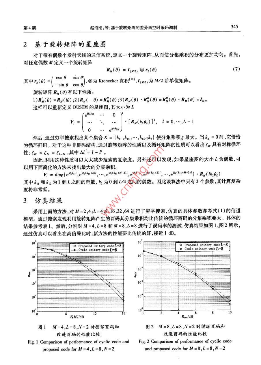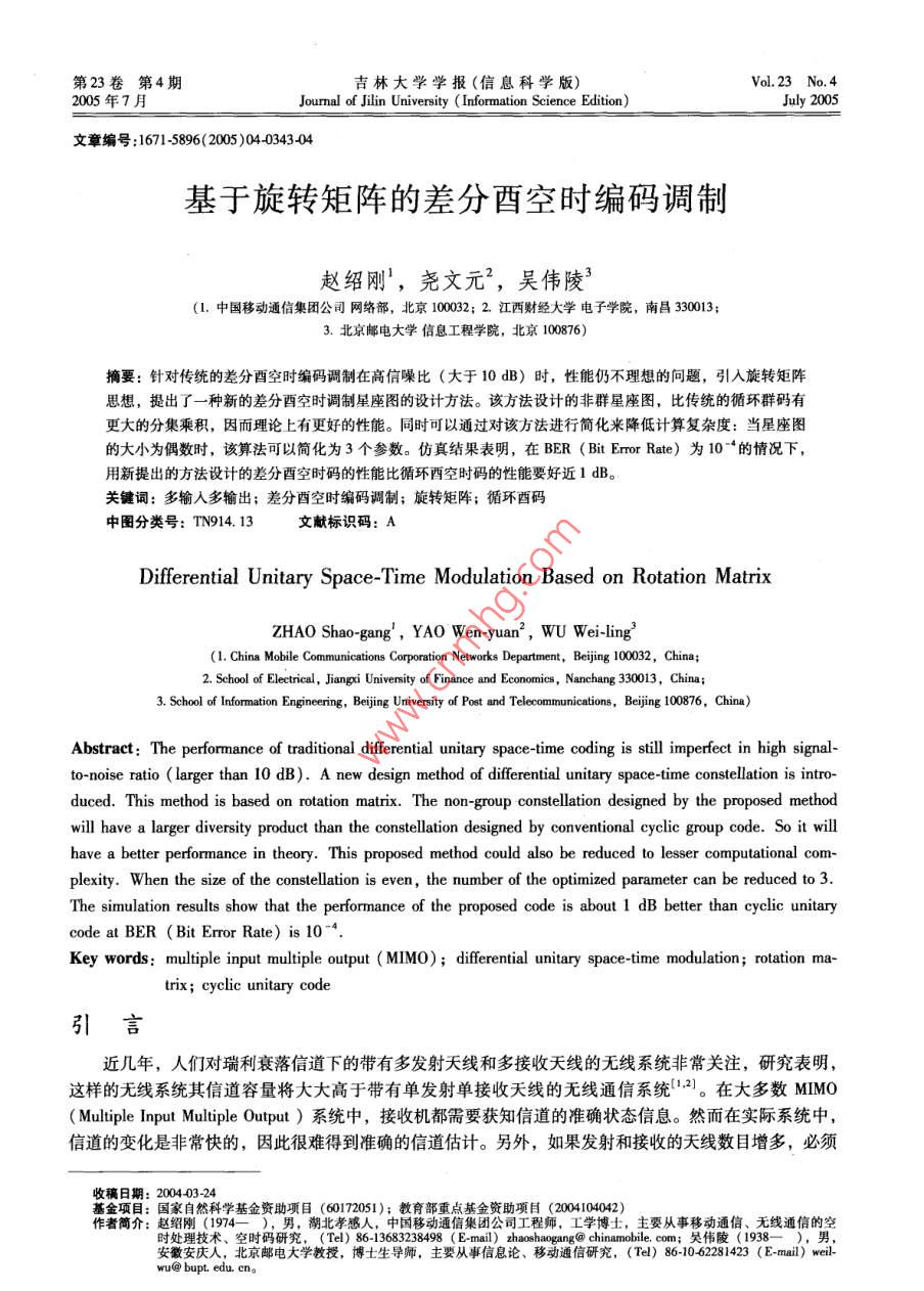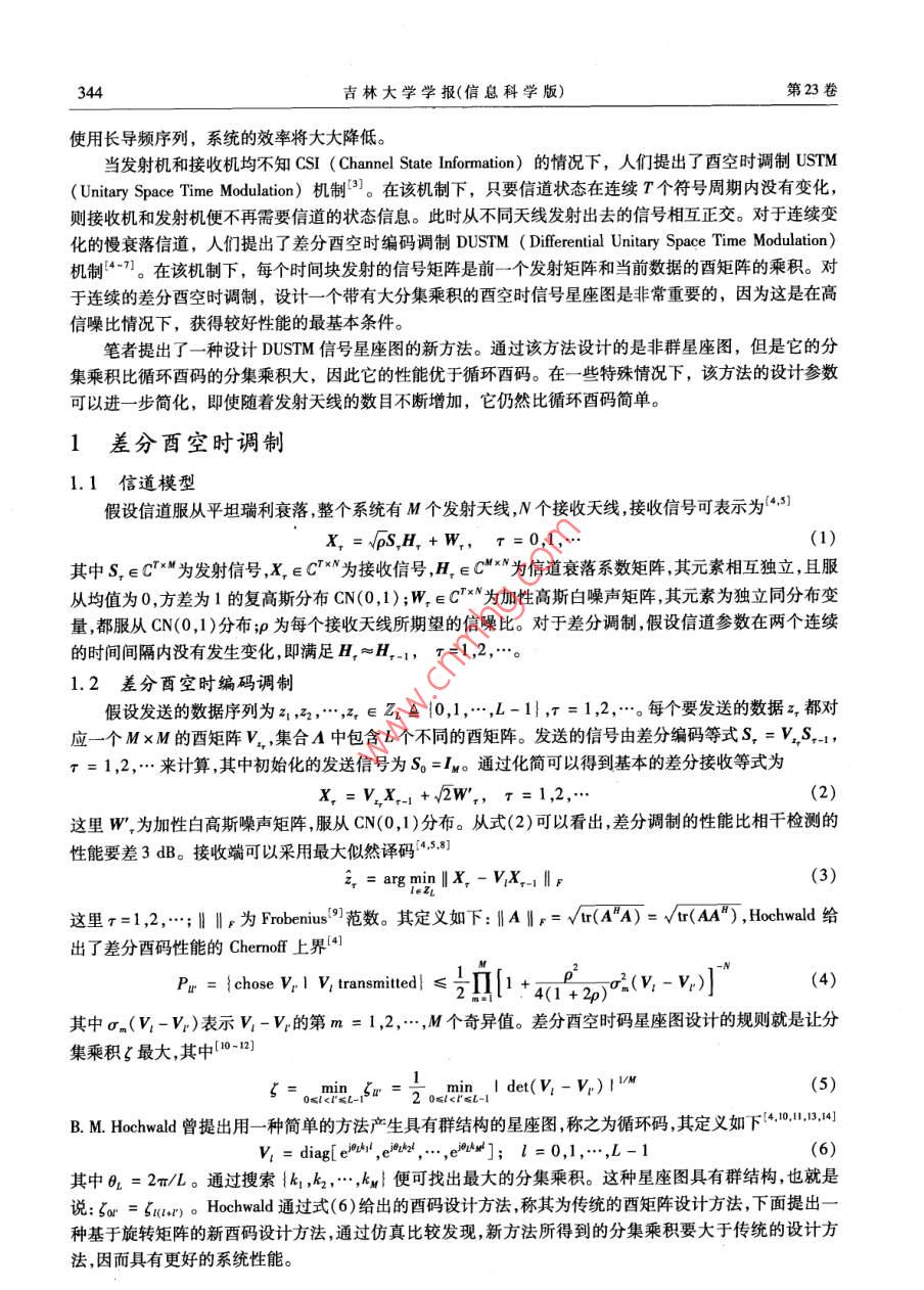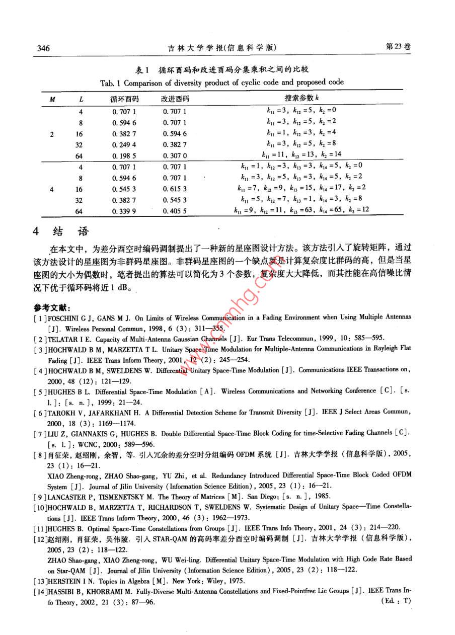 第23卷第4期吉林大學(xué)學(xué)報(bào)(信息科學(xué)版)Vol 23 No 4005年7月Journal of Jilin University (Information Science Edition)July 2005文章編號:16715896(2005)04034304基于旋轉(zhuǎn)矩陣的差分酉空時編碼調(diào)制趙紹剛,堯文元2,吳偉陵3(1.中國移動通信集團(tuán)公司網(wǎng)絡(luò)部,北京10002;2.江西財(cái)經(jīng)大學(xué)電子學(xué)院,南昌330013;3.北京郵電大學(xué)信息工程學(xué)院,北京100876)摘要:針對傳統(tǒng)的差分酉空時編碼調(diào)制在高信噪比(大于10dB)時,性能仍不理想的問題,引入旋轉(zhuǎn)矩陣思想,提出了一種新的差分酉空時調(diào)制星座圖的設(shè)計(jì)方法。該方法設(shè)計(jì)的非群星座圖,比傳統(tǒng)的循環(huán)群碼有更大的分集乘積,因而理論上有更好的性能。同時可以通過對該方法進(jìn)行簡化來降低計(jì)算復(fù)雜度:當(dāng)星座圖的大小為偶數(shù)時,該算法可以簡化為3個參數(shù)。仿真結(jié)果表明,在BER( Bit Error Rate)為10的情況下,用新提出的方法設(shè)計(jì)的差分酉空時碼的性能比循環(huán)酉空時碼的性能要好近ldB關(guān)鍵詞:多輸入多輸出;差分酉空時編碼調(diào)制;旋轉(zhuǎn)矩陣;循環(huán)酉碼中圖分類號:TN914.13文獻(xiàn)標(biāo)識碼:ADifferential Unitary Space-Time Modulation Based on Rotation MatrixZHAO Shao-gang, YAO Wen-yuan, WU Wei-ling(1. China Mobile Communications Corporation Networks Department, Beijing 1000323. School of Information Engineering, Beijing University of Post and Telecommunications, Beijing 100876, ChinaAbstract: The performance of traditional differential unitary space-time coding is still imperfect in high signalto-noise ratio ( larger than 10 dB). A new design method of differential unitary space-time constellation is intro-duced. This method is based on rotation matrix. The non-group constellation designed by the proposed methodwill have a larger diversity product than the constellation designed by conventional cyclic group code. So it willhave a better performance in theory. This proposed method could also be reduced to lesser computational com-plexity. When the size of the constellation is even, the number of the optimized parameter can be reduced to 3The simulation results show that the performance of the proposed code is about 1 dB better than cyclic unitarycode at ber( Bit Error Rate) is 10Key words: multiple input multiple output(MIMO); differential unitary space-time modulation; rotation matrix; cyclic unitary code引言近幾年,人們對瑞利衰落信道下的帶有多發(fā)射天線和多接收天線的無線系統(tǒng)非常關(guān)注,研究表明,這樣的無線系統(tǒng)其信道容量將大大高于帶有單發(fā)射單接收天線的無線通信系統(tǒng)2。在大多數(shù)MMo( Multiple Input Multiple Ouφput)系統(tǒng)中,接收機(jī)都需要獲知信道的準(zhǔn)確狀態(tài)信息。然而在實(shí)際系統(tǒng)中信道的變化是非常快的,因此很難得到準(zhǔn)確的信道估計(jì)。另外,如果發(fā)射和接收的天線數(shù)目增多,必須200403-24國家自然科學(xué)基金資助項(xiàng)目(60172051點(diǎn)基金資助項(xiàng)目(2004104042)趙紹剛(1974),男,湖北孝感人中移新蛋信集團(tuán)公司工程師,工學(xué)博士,主要從事移動通信、無線通信的空時處理技術(shù)、空時碼研究,(Tel)8613(Emal)haoshaogang'@chinamobile.com;吳偉陵(1938—),男安徽安慶人,北京郵電大學(xué)教授,博土生導(dǎo)師,主要從事信息論、移動通信研究,(Tel)86-10462281423(E-mail)welj@ bupt. edu. ena344吉林大學(xué)學(xué)報(bào)(信息科學(xué)版)第23卷使用長導(dǎo)頻序列,系統(tǒng)的效率將大大降低。當(dāng)發(fā)射機(jī)和接收機(jī)均不知CSI( Channel State Information)的情況下,人們提出了酉空時調(diào)制USTMUnitary Space Time Modulation)機(jī)制3。在該機(jī)制下,只要信道狀態(tài)在連續(xù)T個符號周期內(nèi)沒有變化,則接收機(jī)和發(fā)射機(jī)便不再需要信道的狀態(tài)信息。此時從不同天線發(fā)射出去的信號相互正交。對于連續(xù)變化的慢衰落信道,人們提出了差分西空時編碼調(diào)制 DUSTM( Differential Unitary Space Time Modulation)機(jī)制“)。在該機(jī)制下,每個時間塊發(fā)射的信號矩陣是前一個發(fā)射矩陣和當(dāng)前數(shù)據(jù)的酉矩陣的乘積。對于連續(xù)的差分酉空時調(diào)制,設(shè)計(jì)一個帶有大分集乘積的酉空時信號星座圖是非常重要的,因?yàn)檫@是在高信噪比情況下,獲得較好性能的最基本條件。筆者提出了一種設(shè)計(jì)DUSM信號星座圖的新方法。通過該方法設(shè)計(jì)的是非群星座圖,但是它的分集乘積比循環(huán)酉碼的分集乘積大,因此它的性能優(yōu)于循環(huán)酉碼。在一些特殊情況下,該方法的設(shè)計(jì)參數(shù)可以進(jìn)一步簡化,即使隨著發(fā)射天線的數(shù)目不斷增加,它仍然比循環(huán)酉碼簡單。1差分酉空時調(diào)制1.1信道模型假設(shè)信道服從平坦瑞利衰落整個系統(tǒng)有M個發(fā)射天線,N個接收天線,接收信號可表示為5X,=√pS,H,+W,r=0,1其中S,∈CM為發(fā)射信號,X,∈C為接收信號,丑,∈C"為信道衰落系數(shù)矩陣其元素相互獨(dú)立,且服從均值為0,方差為1的復(fù)高斯分布CN(0,1);W,∈C為加性高斯白噪聲矩陣,其元素為獨(dú)立同分布變量,都服從CN(0,1)分布;p為每個接收天線所期望的信噪比。對于差分調(diào)制假設(shè)信道參數(shù)在兩個連續(xù)的時間間隔內(nèi)沒有發(fā)生變化,即滿足H,≈H,-1,r=1,2,…。1.2差分酉空時編