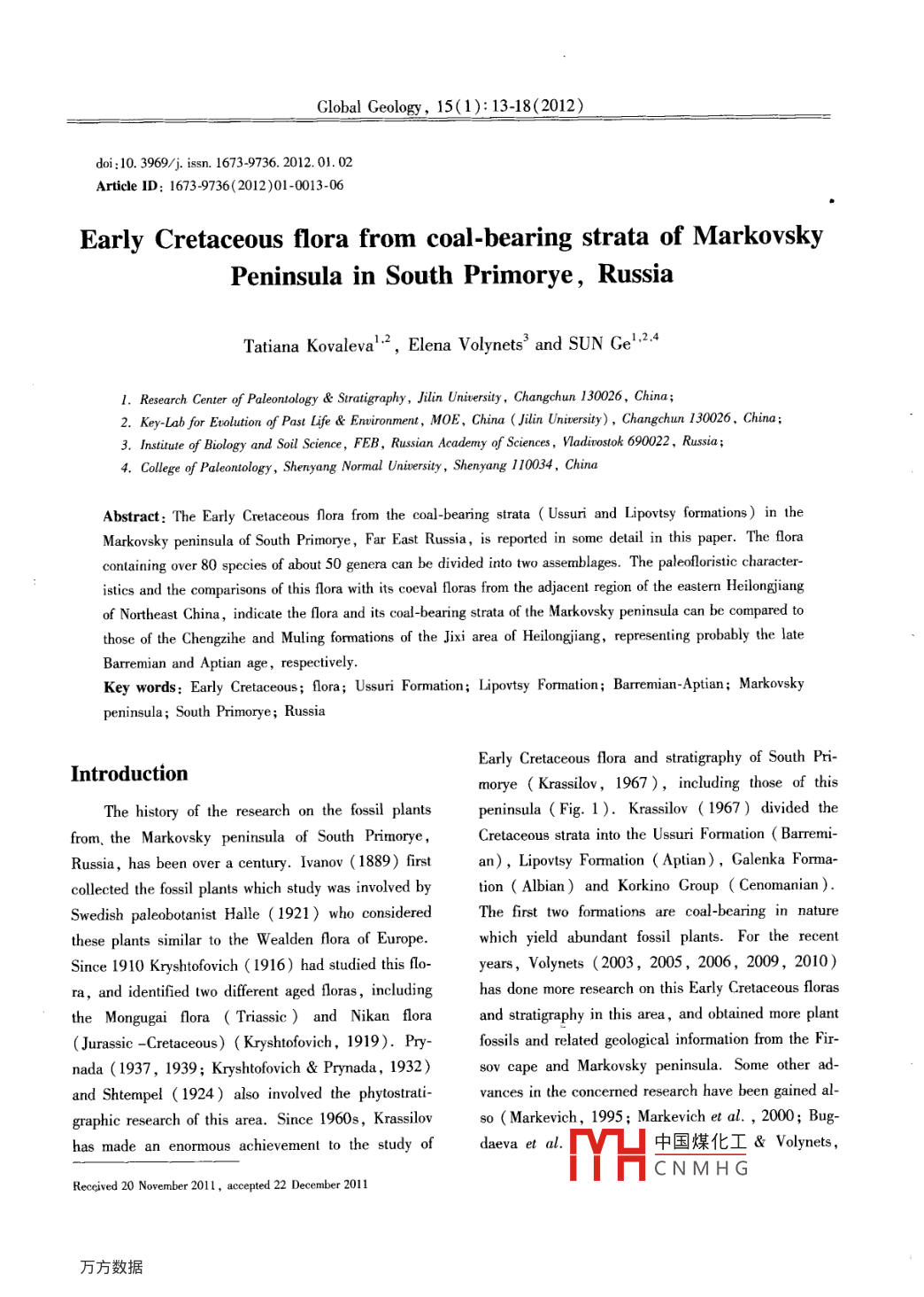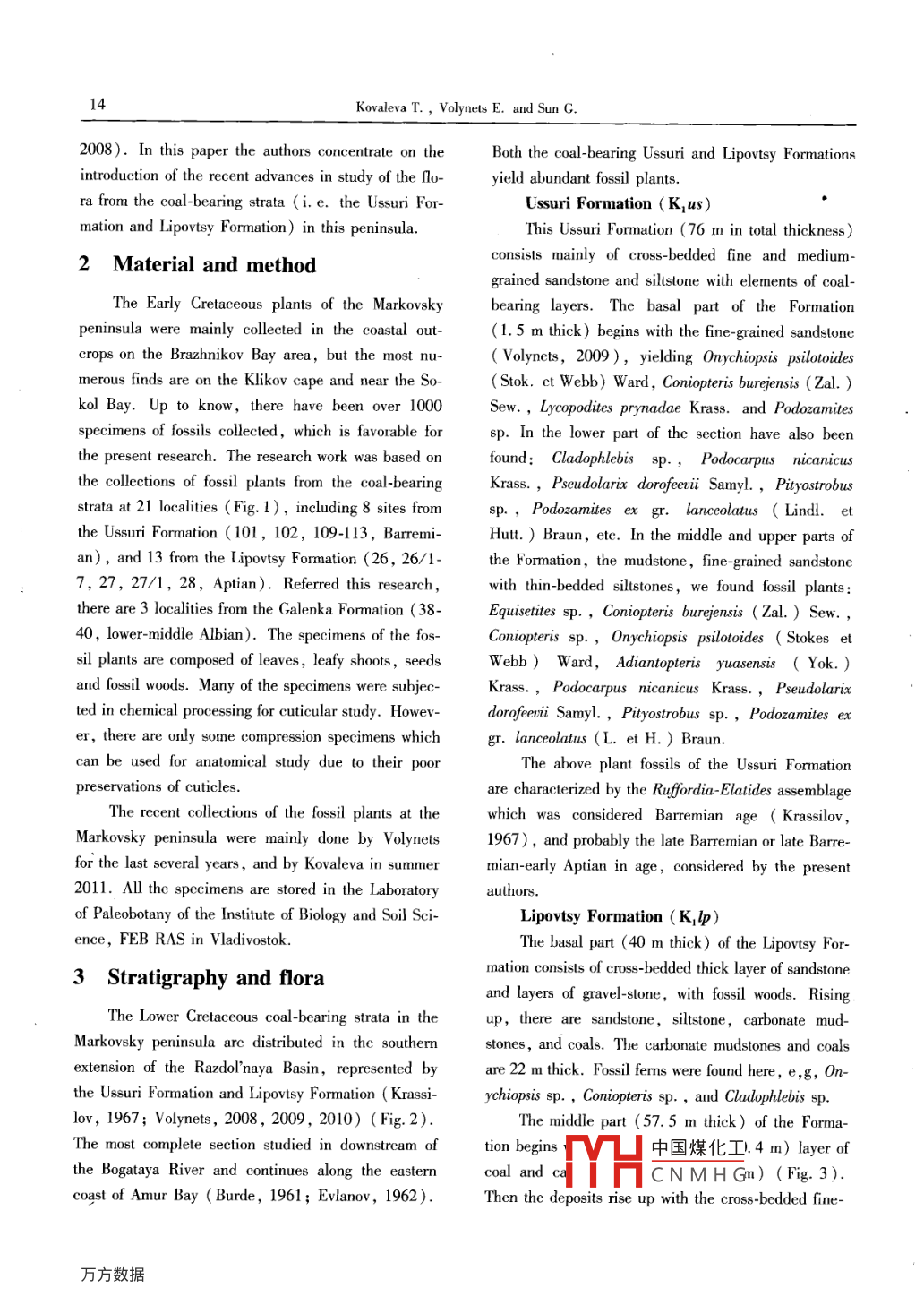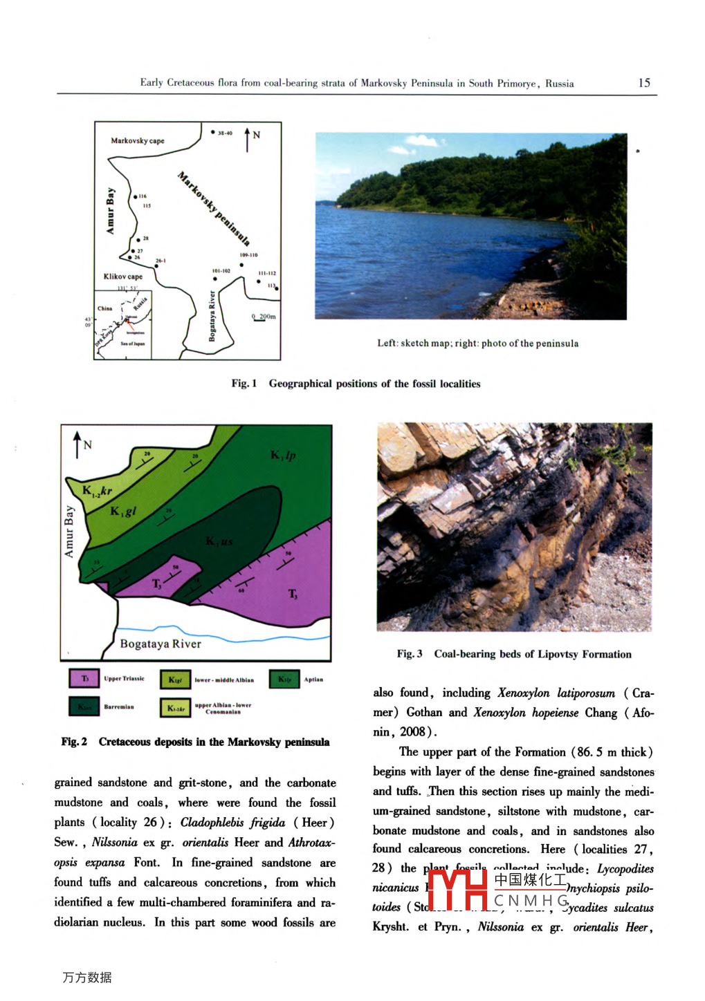 Global Geology, 15(1): 13-18(2012)doi:10.3969/is.1673-9736.2012.01.02Article ID:16739736(2012)01-0013-06early Cretaceous flora from coal-bearing strata of MarkovskyPeninsula in South Primorye, russiaTatiana Kovaleva, Elena volynets and SUN Gel.2.4I. Research Center of Paleontology Stratigraphy, Jilin University, Changchun 130026, China;2. Key-Lab for Euolution of Past Life Environment, MOE, China(Jilin University), Changchun 130026, China3. Institute of Biology and Soil Science, FEB, Russian Academy of Sciences, Vladivostok 690022, Russia4. College of Paleontology, Shenyang Normal University, Shenyang 110034, ChinaAbstract: The Early Cretaceous flora from the coal-bearing strata( Ussuri and Lipovtsy formations in theTarkovsky peninsula of South Primorye, Far East Russia, is reported in some detail in this paper. The floracontaining over 80 species of about 50 genera can be divided into two assemblages. The paleofloristic character-istics and the comparisons of this flora with its coeval floras from the adjacent region of the eastern Heilongjiangof Northeast China, indicate the flora and its coal-bearing strata of the Markovsky peninsula can be comparedthose of the Chengzihe and Muling formations of the Jixi area of Heilongiiang, representing probably the lateBarremian and AptianKey words: Early Cretaceous; flora; Ussuri Formation; Lipovtsy Formation: Barremian-Aptian: Markovskypeninsula; South Primorye; RussiaEarly Cretaceous flora anIntroductionmorye( Krassilov, 1967), including those of thisThe history of the research on the fossil plants peninsula( Fig. 1). Krassilov( 1967) divided thefrom, the Markovsky peninsula of South PrimoryeCretaceous strata into the Ussuri Formation( BarremiRussia, has been over a century. Ivanov(1889)first an), Lipovtsy Formation(Aptian), Galenka Formacollected the fossil plants which study was involved bytion( Albian) and Korkino Group( CenomanianSwedish paleobotanist Halle(1921)who consideredThe first two formations are coal-bearing in naturethese plants similar to the Wealden flora of Europewhich yield abundant fossil plants. For the recentSince 1910 Kryshtofovich(1916) had studied this flo- years, Volynets(2003, 2005, 2006, 2009, 2010)ra, and identified two different aged floras, including has done more research on this Early Cretaceous florasthe Mongugai flora Triassic and Nikan florand stratigraphy in this area, and obtained more plant(Jurassic-Cretaceous)( Kryshtofovich, 1919). Prfossils and related geological information from the Firnada(1937, 1939 Kryshtofovich& Prynada, 1932) sov cape and Markovsky peninsula. Some other ad-and Shtempel (1924 )also Involveed the phytostratvances in the concerned research have been gained algraphic research of this area. Since 1960s, Krassilovso( Markevich, 1995; Markevich et al., 2000: Bug-has made an enormous achievement to the study of daeva et a.V凵中國(guó)煤化工& Volynets,CNMHGReceived 20 November 2011, accepted 22 December 201114Volynets E.2008 ). In this paper the authors concentrate on the Both the coal-bearing Ussuri and Lipovtsy Formationsintroduction of the recent advances in study of the flo- yield abundant fossil plantsra from the coal-bearing strata (i. e. the Ussuri ForUssuri Formation(K,us)ation and Lipovtsy Formation) in this peninsulThis Ussuri Formation (76 m in total thickness)2 Material and methodconsists mainly of cross-bedded fine and mediumgrained sandstone and siltstone with elements of coalThe Early Cretaceous plants of the Markovskybearing layers. The basal part of the Formationpeninsula were mainly collected in the coastal out(1. 5 m thick)begins with the fine-grained sandstonecrops on the brazhnikov Bay area, but the most nu(Volynets, 2009), yielding Onychiopsis psilotoidesmerous finds are on the Klikov cape and near the So-(Stok. et Webb)Ward, Coniopteris burejensis(ZaIkol Bay. Up to know, there have been over 1000 Sew, Lycopodites prynadae Krass. and podozamitesspecimens of fossils collected, which is favorable for sp. In the lower part of the section have also beenthe present research. The research work was based on found: Cladophlebis sp, Podocarpus nicanicusthe collections of fossil plants from the coal-bearing Krass, Pseudolarix dorofeevii Samyl., Pityostrobusstrata at 21 localities( Fig. 1), including 8 sites from sp, Podozamites ex gr. lanceolatus( Lindl. etthe Ussuri Formation(101, 102, 109-113, BarremiHutt )Braun, etc. In the middle and upper parts ofan), and 13 from the Lipovtsy Formation(26, 26/1the Formation, the mudstone, fine-grained sandstone7, 27, 27/1, 28, Aptian). Referred this researchwith thin-bedded siltstones, we found fossil plantsthere are 3 localities from the Galenka Formation(38Equisetites sp, Coniopteris burejensis (Zal.)Sew40, lower-middle Albian). The specimens of the fosConiopteris sp, Onychiopsis psilotoides Stokes etsil plants are composed of leaves, leafy shoots, seedsWebb) Ward, Adiantopteris yuasensis Yokand fossil woods. Many of the specimens were subjecKrasPodocarpKrassPseudolarixted in chemical processing for cuticular study. Howevdorofeeuii Amyl., Pityostrobus sp., Podozamites exer, there are only some compression specimens which gr. Lanceolatus(L. et H)Brauncan be used for anatomical study due to their poorThe above plant fossils of the Ussuri Formationpreservations of cuticlesare characterized by the Ruffordia-elatides assemblageThe recent collections of the fossil plants at the which was considered Barremian age(KrassilovMarkovsky peninsula were mainly done by Volynets 1967), and probably the late Barremian or late Barrefor the last several years, and by Kovaleva in summer mian-early Aptian in age, considered by the present2011. All the specimens are stored in the laboratoryauthorsof Paleobotany of the Institute of Biology and Soil SciLipovtsy Formation(K, lp)ence, FEB RAS in VladivostokThe basal part(40 m thick) of the L3 Stratigraphy and floranation consists of cross-bedded thick layer of sandstoneand layers of gravel-stone, with fossil