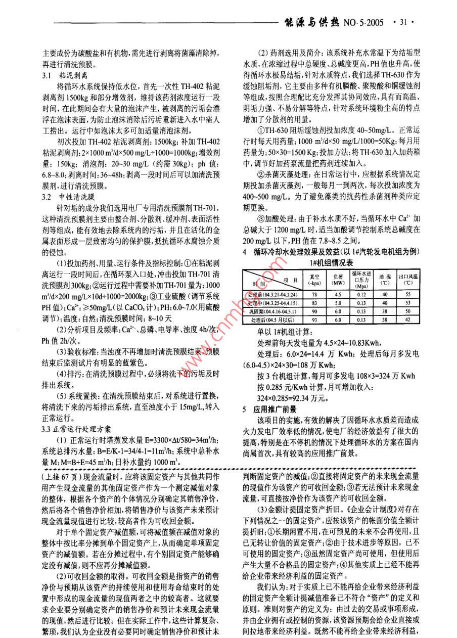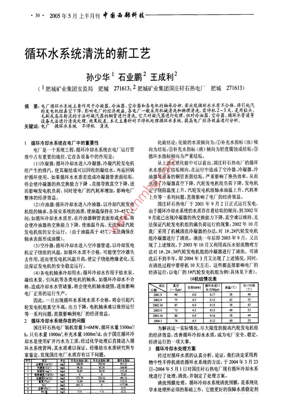 ●30. 2005年5月上半月刊中國西部科技-循環(huán)水系統(tǒng)清洗的新工藝孫少華1石業(yè)鵬2王成利2( 1肥城礦業(yè)集團安監(jiān)局肥城271613; 2肥城礦業(yè)集團國莊矸石熱電廠肥城 271613)摘要:電廠循環(huán)水系統(tǒng)主要作用于冷凝器.冷油器、空冷器和各電機的軸承冷卻,若出現(xiàn)循環(huán)水水質(zhì)不合格,將引起汽輪發(fā)電機組真空下降,影響電廠的經(jīng)濟效益。各電廠- -般采用機械清洗和物理清洗,需停機2-3天,是用鉆頭,毛刷或高壓射流的方法對凝汽器的銅管進行清洗。它只對凝汽器進行處理,但對冷油器、空冷器、循環(huán)水管道等設(shè)備無法進行清洗處理,效果較差。本文主要針對不停機處理循環(huán)水系統(tǒng)、提高電廠經(jīng)濟效益進行分析。關(guān)鍵詞:電廠循環(huán)水系統(tǒng) 不停機清洗I循環(huán)冷卻水系統(tǒng)在電廠中的重要性化驗結(jié)論:化驗的水質(zhì)傾向為:①補充水指標(biāo)(濁)傾電廠是一個系統(tǒng)工程,循環(huán)冷卻水系統(tǒng)在電廠運行管向為結(jié)垢:②補充水指標(biāo)(清)傾向為輕度腐蝕或結(jié)垢;③理中占有重要的地位,它在各設(shè)備中的作用是:循環(huán)水指標(biāo)傾向為嚴重結(jié)垢。(1)冷凝器:循環(huán)冷卻水進入冷凝器,冷凝汽輪發(fā)電機從上述水質(zhì)化驗中可以看出,國莊矸石熱電廠的循環(huán)組產(chǎn)生的排汽,使其凝結(jié)成可以回收的凝結(jié)水,再返回鍋水水質(zhì)存在結(jié)垢傾向,在運行中造成了空冷器冷凝器、冷爐循環(huán)使用。如果循環(huán)水水質(zhì)差造成冷凝器管表面結(jié)垢,油器等設(shè)備的銅管表面結(jié)垢,嚴重影響了換熱效率,從而將會使冷凝器的熱交換能力下降,直接導(dǎo)致真空下降,進出現(xiàn)了冷凝器真空下降,汽輪發(fā)電機組負荷下降,發(fā)電機而影響發(fā)電機負荷,同時使電廠的汽耗率增加,影響電廠定子繞阻溫度上升,汽輪發(fā)電機組軸承油溫上升、汽耗率整體的經(jīng)濟效益。上升等一系列問題,直接影響了電廠的經(jīng)濟效益。(2)冷油器:循環(huán)冷卻水進入冷油器,以冷卻汽輪發(fā)電國莊矸石熱電廠于2001年9月2日正式運行發(fā)電,機組的軸承、各保安系統(tǒng)的油質(zhì),使油溫保持在35~45C之由于循環(huán)冷卻水系統(tǒng)的水質(zhì)存在著結(jié)垢的傾向,到2002年間;如循環(huán)冷卻水水質(zhì)差,在冷油器銅管表面形成水垢,將9月底已出現(xiàn)冷凝器的熱交換能力下降,真空難以維持,無會使冷油器熱交換能力下降,使油溫升高,無法保證汽輪法保證汽輪發(fā)電機組的滿負荷運行的現(xiàn)象; 2002年10月發(fā)電機組的安全運行。(由于油溫高于45C,無法確保在我廠采用了機械清洗冷凝器的辦法,對1#、2#汽輪發(fā)電機軸承表面形成油膜)。組冷凝器進行了清洗。清洗- -年后即2003年9月,又出(3)空冷器:循環(huán)冷卻水進入空冷器管道,以冷卻發(fā)電現(xiàn)了上述情況,于2003年10月又利用高壓水射流物理方機定子繞組的風(fēng)溫,如循環(huán)水質(zhì)不合格,可能使空冷器失法對l#、2#3#汽輪發(fā)電機組的冷凝器進行了清洗。可清去作用,進而使發(fā)電機風(fēng)溫升高,使定子繞組絕緣老化,無洗后不到半年,即2004年3月又出現(xiàn)了上述情況同時,法保證發(fā)電機的安全穩(wěn)定運行。在清洗過程中要停機10天左右,這些都直接影響電廠的(4)各電機軸承冷卻用水:循環(huán)冷卻水作用于給水泵、經(jīng)濟運行:以電廠的1#汽輪發(fā)電機組為例(具體見下表)。凝結(jié)水泵、引風(fēng)機等各類電機的軸承,如循環(huán)冷卻水不合1#機組情況表格,造成冷卻水水管堵塞,將會使電機軸承燒毀,進而影響項目真空負街(Mw)|著環(huán)水進口 |油溫(C)出口風(fēng)溫日期壓力Mpa)C電廠正常的運行生產(chǎn)。200.920500.173840因此,-旦出現(xiàn)循環(huán)水系統(tǒng)水質(zhì)不合格,將會引起汽2002.97550.124255輪發(fā)電機組真空不高,出力下降,電機軸承難以維持運行2002.1000.15 _82003.90133等一系列問題,直接影響到電廠的經(jīng)濟效益。2003.10,042循環(huán)冷卻水系統(tǒng)存在的問題國莊矸石熱電廠裝機容量3x6MW,循環(huán)水量3300m/為解決這一實際情況,盡大限度的提高汽輪發(fā)電機組h,只有水量1000m',補充水量1000m/d,由于國莊循環(huán)冷的經(jīng)濟效益,改善循環(huán)冷卻水水質(zhì),成為電廠安全、穩(wěn)定、卻水是使用礦井污水為工質(zhì),經(jīng)過化學(xué)處理后直接進入循經(jīng)濟運行的-項大事。環(huán)水系統(tǒng)管網(wǎng),其水質(zhì)難以保證。經(jīng)維坊市水質(zhì)研究所專3循環(huán)冷卻水處理方案家鑒定,發(fā)現(xiàn)國莊電廠水質(zhì)存有以下問題。經(jīng)過對循環(huán)水質(zhì)的認真分析、論證,我們決定采用藥物中性不停機清洗循環(huán)水系統(tǒng)的方法,于2004年3月23日~2004年5月1日對國莊矸石熱電廠現(xiàn)有循環(huán)冷卻水系統(tǒng)進行了處理、清洗,并制定了處理方案。MKC.COP清洗預(yù)膜處理。循環(huán)冷卻水系統(tǒng)清洗預(yù)膜,是系統(tǒng)化57學(xué)水處理所必須的基礎(chǔ)工作,它能更好的保障水質(zhì)穩(wěn)定劑能源與供熱N0.5.2005● 31●主要成份為碳酸鹽和有機物,需先進行剝離將菌藻清除掉,(2)藥劑選用及簡介:該系統(tǒng)補充水常溫下為結(jié)垢型再進行清洗預(yù