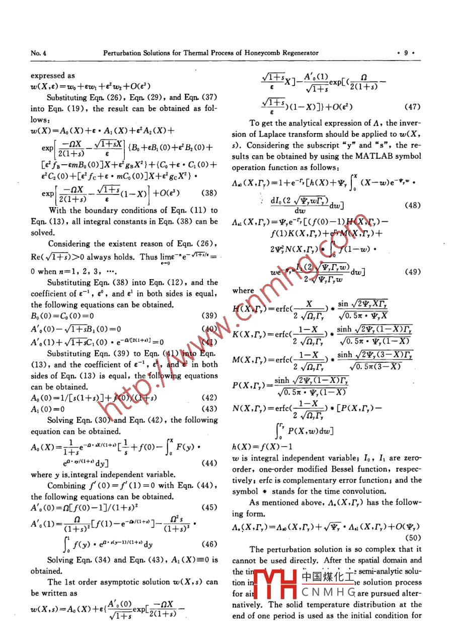 Available online at www.sciencedirect.comScienceDirectJ0URNAL OF IRON AND STEEL RESEARCH, INTERNATIONAL. 2007, 14(4); 06-10, 48Perturbation Solutions for Thermal Process of Honeycomb RegeneratorAI Yuan-fang,MEI Chi,HUANG Guo dong, JIANG Shao-jian(School of Energy Science and Enginering, Central South Univeriy, Changsha 410083, Hunan, China)Abstract; A parameter perturbation for the unsteadystate heat transfer characteristics of honeycomb regenerator ispresented, It is limited to the cases where the storage matrix has a small wall thickness s0 that no temperature varia-tion in the matrix perpendicular to the flow direction is .considered. Starting from a two phase transient thermal mod-el for the gas and storage matrix, an approximate solution for regenerator heat transfer process is derived using themultiple scale method for the limiting case where the longitudinal heat conduction of solid matrix is far less than theconvective heat transfer between the gas and the solid. The regenerator temperature profiles are expressed as Taylorseries of the cofficient of solid heat conduction item in the model. The analytical validity is shown by comparing theperturbation solution with the experinent and the numerical solution. The results show that it is possible for the per-turbation to improve the effectiveness and economics of thermal research on regenerators.Key words: honeycomb regenerator; thermal process; asymptotic analysis; semi-analytic methodHigh-temperature air combustion[1 used in themal performance. The analytical process withoutforging furnaces, soaking furnaces, continuousconsidering longitudinal solid heat conduction is easy.heating furnaces, ladle bakers, gas-fired radiantbut coarse, Considering the solid heat conductiontubes, and aluminum melting furnaces of the meta!-parallel to flow direction, Klein H[8] derived an ap-lurgical industry can provide high thermal efficien-proximate heat transfer solution using the Taylor' scy,reduced NO: emission, and uniform heat fluxseries expansions as a function of switch time t forfield. Most of these furnaces use the honeycomb re-the limiting case where the period of heating andgenerator-2.8. Its thermal characteristics such as thecooling process became infinitesimally small. Histemperature fluctuation and the temperature effi~conclusions could not be applied to the real situationciency are critical to achieve the optimal thermal per-because he treated“switching rapidly" as“t→0" andformance. Therefore, a more accurate research onassumed a0/at to be differentiable on t=0. In theregenerator heat transfer process is required,present study, the asymptotic solution of heat trans-Numerical simulation[4-61 is a theoretical meth-fer process for weak solid heat conduction is ob-od often used to solve regenerator thermal perform-tained through the perturbation method.ance. The mathematical analysis is an effective andDynamic Energy Balancesconvenient method. Zheng C H7] had carried outseveral investigations on the analytic solutions inThe regenerator temperature changes continu-case that the storage matrix has a small wall thick-ously with its location and time. Temperature varia-ness so that no temperature variation in the matrixtion perpendicular to the flow direction can be usual-perpendicular to the flow direction is considered,ly neglected because regenerators have a compara-but they are limited to the case where the longitudi-tively small wall thickness. Because the residual gasnal heat conduction is neglected. For regenerator,mass (the volume of the gas within the honeycombespecially compact regenerator, operating at a shortmatrix void) is less than 0.1% of the total gas massswitching period, the solid heat conduction in theflow, its effect on heat transfer is negligible'7間. There-length direction may lead to the change in the ther-fore,中國煤化工state and two-phaseFoundatlon Item:Item Sponsoted by High Technology Research and DevelopmentMHC N M H G0lAA514013)Biography: AI Yuan-fang(1968-), Male, Doctor, Associate Professor; E mail: yfai@maiL csu. edu. cn Revised Date; April 10, 2006No.4.Perturbation Solutions for Thermal Process of Honeycomb Regeneratorheat transfer model with energy balance equations(a,L)/(A.p.cp.), X=x/l, A.=(B, -0.,)/(8.o -..),for the gas and solid matrix can be sufficient.Ay=(), -0.)/(6,.o -08.1), the dimensionless constantsConsidering the symmetrical geometry of the幾= (a,LI)/(qm,yCp,) and業(yè)= (入.A.)/(a,Ll2), the :honeycomb structure, it can be assumed that theabove equations can be rewritten asdistribution of physical parameters is the same forAA./ar,-Q,H*A,/aX2 = =A,-A.(3)each cell of the honeycomb matrix. The region be-AAy/aX= -業(yè),(A,-A.)tween two symmetrical adiabatic surfaces shown inA,(0,F,)=1,JA. (0,r,)/aX=aA,(1,r,)/aX=0 (5)Fig. 1 is taken as the control volume. The flue gasA,(X,0)= f(X)and air are regarded as the ideal gas.Eqn. (3) to Eqn. (6) are the 2nd order linearDuring the flue gas cooling period shown inpartial differential equations with constant coeffi-Fig. 1, the coordinate origin is at the flue gas inlet,cients. Under certain conditions, its solution exists'andx axis is along the flow direction. The energyand is unique, continuous, and differentiable.balance for the element dx at x shown in Fig. 1The subscript “y" and“s" can be neglected toyields the following equations:simplify the expression, Combining Eqn. (3) withA.p.cp..a0./at- A,A.J0,/ax2 =a,L(0,-θ.)(1) Eqn. (4), A, can be eliminated and thereforegqm,yCp,DU,/Ax=-a,L(O, -0,)(2)a.|2A_ -341+2+ 23A- ψ°A=0(7)whereA is area, m2; P is density, (kg ●m~*); cp is”|示ax|taxtaxarspecific heat at constant pressure, (kJ.kg-'●K-);θIntroducing the complex variables s and w(X,s)==is temperature,"C; tis time, s; λ is thermal conduc-L[A(X,r)], and considering the derivative theoremtivity, (kW●m-1● K-); a is surface coefficient ofand Eqn. (6), the following equation can be ob-heat transfer including heat convection and ther