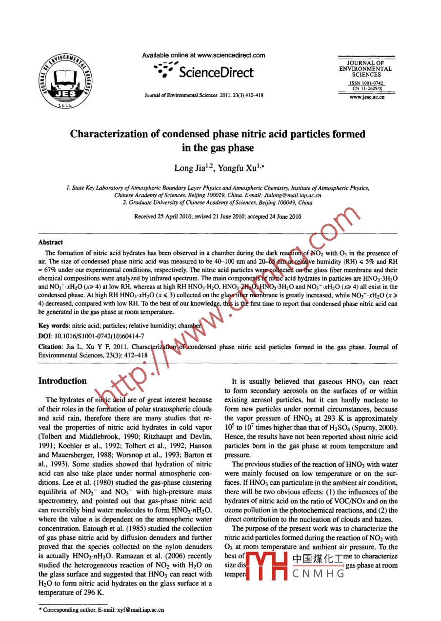 NIRONMAvailableonlineatwww.sciencedirect.comRNAL OFScience Direct181m29Journal of Environmental Sciences 2011, 23(3)412418Characterization of condensed phase nitric acid particles formedin the gas phaseLong Jia", Yongfu Xu'1. State Key Laboratory of Atmospheric Boundary Layer Physics and Atmospheric Chemistry, Institute of Atmospheric Physics,Chinese Academy of Sciences, Beijing 100029, China. E-mail: Jialong@ mail iap. accn2. Graduate University of Chinese Academy of Sciences, Beijing 100049, ChinaReceived 25 April 2010: revised 21 June 2010: accepted 24 June 2010AbstractThe formation of nitric acid hydrates has been observed in a chamber during the dark reaction of NO2 with O in the presence ofair. The size of condensed phase nitric acid was measured to be 40-100 nm and 20-65 nm at relative humidity(rH)<5% and rh67% under our experimental conditions, respectively. The nitric acid particles were collected on the glass fiber membrane and theirnd NO3"xH2O(x> 4)at low RH, whereas at high RH HNO3. H2O, HNO. 2H2O, HNO3 3H2O and NO3"xH2O(xe 4)all exist in theondensed phase At high RH HNO, xH2O (x< 3)collected on the glass fiber membrane is greatly increased, while NO3. xH2O(x>4)decreased, compared with low RH. To the best of our knowledge, this is the first time to report that condensed phase nitric acid canbe generated in the gas phase at room temperatureKey words: nitric acid; particles; relative humidity; chamberDOI:10.1016/S1001-0742(10604147Citation: Jia L, Xu Y F, 2011. Characterization of condensed phase nitric acid particles formed in the gas phase. Journal ofEnvironmental Sciences, 23 (3): 412-418IntroductionIt is usually believed that gaseous HNO3 can reactto form secondary aerosols on the surfaces of or withinThe hydrates of nitric acid are of great interest because existing aerosol particles, but it can hardly nucleate tof their roles in the formation of polar stratospheric clouds form new particles under normal circumstances, becauseand acid rain, therefore there are many studies that re. the vapor pressure of HNO at 293 K is approximatelyveal the properties of nitric acid hydrates in cold vapor 10 to 10 times higher than that of H2SO4( Spurny, 2000)(Tolbert and Middlebrook, 1990: Ritzhaupt and Devlin, Hence, the results have not been reported about nitric acid1991: Koehler et al., 1992; Tolbert et al., 1992; Hanson particles bom in the gas phase at room temperature andand Mauersberger, 1988; Worsnop et al., 1993: Barton et pressureal., 1993). Some studies showed that hydration of nitric The previous studies of the reaction of HNO, with wateracid can also take place under normal atmospheric con- were mainly focused on low temperature or on the surditions. Lee et al. 1980)studied the gas-phase clustering faces. If HNO can particulate in the ambient air condition,equilibria of NO2" and NO3- with high-pressure mass there will be two obvious effects:(1)the influences of thespectrometry, and pointed out that gas-phase nitric acid hydrates of nitric acid on the ratio of VOC/NOx and on thecan reversibly bind water molecules to form HNO, nH2O, ozone pollution in the photochemical reactions, and (2)thewhere the value n is dependent on the atmospheric water direct contribution to the nucleation of clouds and hazes.concentration. Eatough et al. (1985) studied the collection The purpose of the present work was to characterize theof gas phase nitric acid by diffusion denuders and further nitric acid particles formed during the reaction of NO2 withproved that the species collected on the nylon denuders O at room temperature and ambient air pressure. To theis actually HNO3 nH2O. Ramazan et al. ( 2006)recently best of中國煤化工 me to characterizestudied the heterogeneous reaction of NO2 with H2O on size digas phase at roomthe glass surface and suggested that HNO can react with tempCNMHGH20 to form nitric acid hydrates on the glass surface at atemperature of 296Korresponding author. E-mail: xyf@mailiap.accnCharacterization of condensed phase nitric acid particles formed in the gas phase1 ExperimentalTable 1 Initial conditions for experimentsThe experiments were performed in a 100 L reactorNo(ppb)made of 0. 1 mm FEP Teflon film at a temperature range #1of 289-295 K with a total pressure of 1 atm. The details of #2the apparatus have been described by Xu et al. (2006). Gas #36200533phase HNO was generated by the reaction of NO, with #4%7<≤≤<9Oy in the absence of irradiation. Before each experiment, #611270the reactor was washed using N2(99.999%), until O3and NOx concentrations were under the detecting limiRH: relative humidityAfter the residual gas was pumped out, the given volumesof 101 ppm NO2, synthetic air and ca. 500 ppm O3 2 Results and discussionwere sequentially introduced into the reactor according to Table 1 presents the experimental conditions for thethe chosen reactant concentrations. Then, the reactor wasvigorously shaken to make the reactants mixed thoroughly, NO, wall losses were obtained to be 40x 10-6 and 2.41after which timing the reaction began. At the same time, x 10-6 sec-I in the chamber, respectively ia et al., 2009)the ozone concentration was monitored on line. Syntheticair was used as background gas. The fine particles in syn. Experiments #1 and#2 were used to characterize the sizethetic air were removed by an Teflon holder that contains adistribution of nitric acid hydrate clusters under rH=67%and RH 5%, respectively; #3 and #4 were used to studyPTFE(polytetrafluoroethylene) fiber membrane (pore size the total nitrate products and gas phase nitrate; and #5 and0.2 um, Sartorius, Germany). During each experimentalcourse the temperature varied about t 1 K. After each #6 were used to determine the influences of rH on theexperiment the reactor was flushed using synthetic air forcondensed phase nitrate products10 hr with a 40 w blacklight lamp on2.1 Determination of gas phase nitric acidThe gas-phase species such as N2O5, HNO3, NOx andO, were determined by a long path Fo