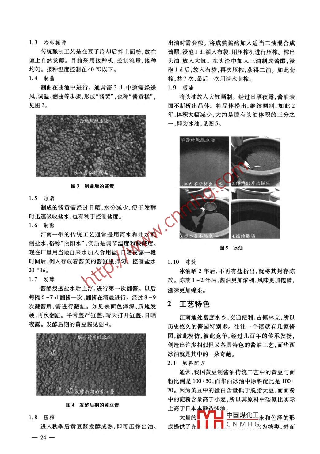 2015年第2期江蘇調(diào)味副食品總第141期華西冰油工藝研究謝韓,周家達(dá)2(1.南京釀造集團(tuán)有限公司,江蘇南京210004;2.江陰市華西食品釀造廠,江蘇江陰214421)摘要:華西冰油是華西食品釀造廠傳承老醬園工藝生產(chǎn)的傳統(tǒng)產(chǎn)品。詳細(xì)介紹其工藝,并分析該工藝獨(dú)特之處的原理,以期我國(guó)傳統(tǒng)的老工藝能得到發(fā)揚(yáng)光大。關(guān)鍵詞:冰油;醬園;醬油;傳統(tǒng)工藝中圖分類號(hào):TS264.21文獻(xiàn)標(biāo)志碼:A文章編號(hào):1006-8481(2015)02-0023-03江南是魚米之鄉(xiāng),釀造作坊非常多,調(diào)味品各生產(chǎn)工藝。由于多年來生產(chǎn)技術(shù)變化不大,21世具特色,冰油即是其中的一種。冰油就是一種醬紀(jì)末此工藝被轉(zhuǎn)給華西食品釀造廠。在華西村油,在曬露醬油過程中,由于水分蒸發(fā),濃度變大,的雄厚實(shí)力支持下,此工藝得以穩(wěn)定發(fā)展。通過表面凝成鹽的晶體如薄冰狀,故稱冰油。在無錫、研究冰油釀造工藝特色,希望促進(jìn)傳統(tǒng)工藝發(fā)揚(yáng)蘇州一帶,每個(gè)集鎮(zhèn)上都有若干老字號(hào)醬園,原華光大。西村的食品釀造廠就保留了此工藝。江陰的華士1工藝流程鎮(zhèn)在歷史上有老字號(hào)“元隆醬園”“鼎元醬園”,解放后公私合營(yíng),并為華墅鼎元醬園,保留了冰油冰油的加工流程見圖1。面粉、菌種黃豆→挑選→浸泡→清洗→蒸煮→冷卻→混合→制曲→晾曬→制醅→發(fā)酵→壓榨→晾曬→陳放→冰油鹽水圖1冰油的加工流程1.1原料前處理證豆皮完整,豆肉熟而不爛,見圖2。為保持傳統(tǒng)工藝特色,黃豆只選用非轉(zhuǎn)基因品種。傳統(tǒng)工藝的原料前處理稱為汰豆,即經(jīng)過挑西村原釀冰油選、去雜、清洗、浸泡等過程,沿襲了黃豆醬的古老做法。目前采用髙壓球鍋蒸煮,原料通過篩網(wǎng)后直接在球鍋內(nèi)浸泡、清洗。浸泡時(shí)間8h,氣溫低時(shí)略長(zhǎng)。浸泡后黃豆體積增大2.2倍。清洗后必須將水瀝干。1.2蒸煮煮熟的黃豆傳統(tǒng)工藝采用木甑蒸煮,大火煮透,文火燜熟。目前采用高壓球鍋蒸煮,通常壓力達(dá)0.1MPa。保圖2煮熟的黃豆收稿日期:2014-09-2中國(guó)煤化工作者簡(jiǎn)介:謝韓(1945-),男,南京釀造集團(tuán)有限公司高級(jí)工程師;周家達(dá)(1974—),男,江陰市華西食品釀造廠工程師。CNMHG231.3冷卻接種出油時(shí)需套榨。將成熟醬醅加入適當(dāng)二油混合成傳統(tǒng)釀制工藝是在豆子冷卻后拌上面粉,放在醬醪浸泡1d,灌入布袋,用壓榨機(jī)進(jìn)行壓榨。榨出匾上自然發(fā)酵。目前采用接種機(jī),控制流量,接種頭油,放入大缸。在頭渣中加入三油制成醬醪,浸均勻。接種溫度控制在40℃以下泡1d后,放入布袋,再次壓榨,獲得二油。如此套1.4制曲榨,共7次,最后一次用清水套榨。制曲在曲池中進(jìn)行。通常需3d,中途需經(jīng)送1.9曬油風(fēng)、調(diào)溫、翻曲等步驟,形成“醬黃”,也稱“醬黃糕”,將頭油放入大缸曬制。經(jīng)過日曬夜露,醬油表見圖3。面不斷析出晶體。將晶體撈出,繼續(xù)曬制,如此2年,體積大幅減少,大約是原有頭油體積的三分之西村原釀冰即為冰油,見圖5華西村原釀冰油入包的成圖3制曲后的醬黃缸內(nèi)不斷析出鹽水已2師傳們開始撈冰1.5晾曬制成的醬黃需經(jīng)過日曬,水分減少,便于發(fā)酵時(shí)迅速吸收鹽水,也有利于控制鹽度。1.6制醅江南一帶的傳統(tǒng)工藝通常是用河水和井水配永悲本結(jié)4繼續(xù)曝曬制鹽水,俗稱“陰陽水”,實(shí)質(zhì)是調(diào)節(jié)溫度和酸堿度。圖5冰油現(xiàn)在廠里用當(dāng)?shù)刈詠硭尤胧秤名},日曬夜露一段時(shí)間后,倒入存放著醬黃的醬缸里拌勻??刂汽}水1.10陳放20°B。冰油曬2年后,不再有鹽析出,就將其封存陳1.7發(fā)酵放。陳放1~2年后,醬油更加濃稠,風(fēng)味更加飽滿,醬醅浸透鹽水后上浮進(jìn)行第一次翻醬。以后滋味更加綿柔。每隔6~7d翻醬一次,翻醬在清晨進(jìn)行。經(jīng)過8~9次翻醬后,需進(jìn)行翻缸。如見表面色澤深、質(zhì)地發(fā)2工藝特色硬,再次翻缸。平常蓋嚴(yán)缸蓋,晴天打開缸蓋,日曬江南地處富庶水鄉(xiāng),交通便利,古鎮(zhèn)林立,所以夜露。發(fā)酵后期的黃豆醬見圖4。歷史悠久的醬園特別多。往往一個(gè)鎮(zhèn)就有幾家醬園,彼此模仿,彼此競(jìng)爭(zhēng),經(jīng)過幾百年的傳承發(fā)揚(yáng),創(chuàng)造出許多相似但又各具特色的醬油工藝,而華西冰油就是其中的一朵奇葩。2.1原料配方通常,我國(guó)黃豆制醬油傳統(tǒng)工藝中的黃豆與面粉比例是100:50,而華西冰油中原料配比是100友酵后期的黃豆醬70。因?yàn)辄S豆中的蛋白含量低于脫脂大豆,而面粉中的淀粉含量高于小麥,所以其原料中碳氮比實(shí)際圖4發(fā)酵后期的黃豆醬上高于日本本釀造醬油1.8壓榨大量的中國(guó)煤化工味和色澤的形進(jìn)入秋季后黃豆醬發(fā)酵成熟,即可壓榨出油。成提供了充CNMHG為糖類進(jìn)而24轉(zhuǎn)化為有機(jī)酸、醇類物質(zhì)、脂類物質(zhì)、色素等,形成但是,國(guó)內(nèi)一些保留傳統(tǒng)工藝的小企業(yè)在特定的形產(chǎn)品的酸、甜、苦、鮮特色。勢(shì)下舉步維艱的狀況也值得重視。由于場(chǎng)地縮小、2.2發(fā)酵時(shí)間成本增大、社會(huì)歧視等多種因素,許多傳統(tǒng)醬園難華西冰油的入缸