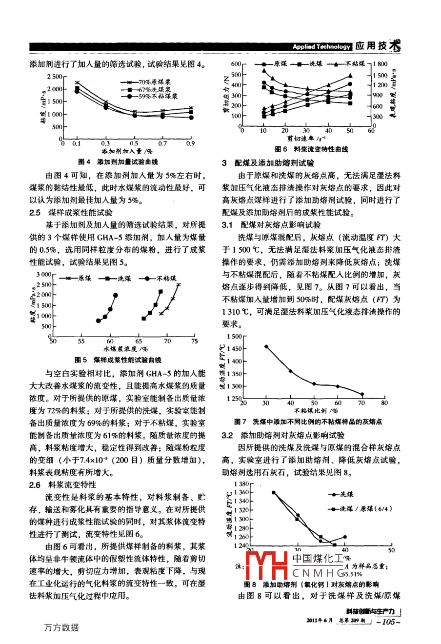 ApldTechnolog應(yīng)用技術(shù)文章編號: 1674- -9146(2011)06 -0103 -04寧東紅墩子煤田煤氣化成漿性能研究王克義',王德海',郭繼虎",蘆曉芳2(1.中國電力投資集團公司寧夏青銅峽能源鋁業(yè)集團煤炭煤化工分公司,寧夏銀川75001;2.山西農(nóng)業(yè)大學(xué)文理學(xué)院,山西太谷030801)摘要:在對寧東紅墩子煤田煤全面煤質(zhì)分析基礎(chǔ)上,進行了實驗室料漿制備及成漿性能試驗。通過對原煤、洗煤和不粘煤等3個堞樣的添加添加劑、助熔劑及配煤試驗,進行了氣化工藝的成漿性能可行性評價。關(guān)鍵詞:寧東煤;氣化;成漿性中圖分類號:TQ531文獻標(biāo)志碼:A影響煤的成漿性的因素是多方面的,包括煤質(zhì)表1煤質(zhì)分析結(jié)果因素(4,添加劑還有制備工藝。對于煤的成漿性項目原煤洗煤不粘煤而言,煤質(zhì)因素是最主要的,各煤質(zhì)因素之間有著水分MJ1.271.319.05密切的聯(lián)系。為了能滿足水煤漿氣化工藝的要求,工業(yè)分析灰分Au30.9818.39 10.62/ wt%[揮發(fā)分VJ26.4129.5325.72制漿原料煤的成漿性能要符合- -定的標(biāo)準(zhǔn)。筆者對固定碳FC_41.3450.7754.61寧東北部煤田的煤質(zhì)進行了全面的分析,并進行了碳C.54.2566.4063.81一系列的成漿性能實驗,研究其應(yīng)用于水煤漿氣化元素分析氫H3.504.183.25的可行性。/wt%氮NJ0.911.07 0.60疏St.0.50 0.490.361煤質(zhì)特性分析實驗氧O.8.1612.31實驗用煤樣為寧東橫城煤田的原煤及其洗煤,發(fā)熱量0 /kJ.kg122530 | 27 450 24 810以及配煤用不粘煤,按照GB/T 212- -2001, GB/T可磨指數(shù)HGI5754 T213- 2003, GB/T 219 -1996,GB/T 220- -2001,變形溫度DT 1460 1430 1050灰熔點| 軟化溫度ST >1500>1500 1070 ]GB/T 474-1996, GB/T 476- -2001,GB/T 483-/C流動溫度FT_一1 1101998和GB/T2565-1998等煤炭分析標(biāo)準(zhǔn)對煤樣SiO,53.9151.63 32.88的工業(yè)分析、元素分析、發(fā)熱量、灰成分分析、灰Al,O,35.0234.1013.59熔點分析、化學(xué)反應(yīng)活性分析以及可磨指數(shù)進行測灰組成分析Fe:O,1.922.95 14.33CaO3.033.8718.22定。3種煤樣煤質(zhì)特性的分析數(shù)據(jù)見表1。MgO1.07 1.394.27從表1可看出,原煤應(yīng)該屬于高揮發(fā)份的氣SO,2.372.749.56煤,有利于氣化;原料煤的水分低,對制漿有利,TiO21.250.77可以提高水煤漿的質(zhì)量濃度;灰分較高,灰熔點較8001.11.216.0高,這對液態(tài)排渣的氣化工藝不利,需要對原料煤850C2.62.827.4900 C4.34.640.8進行處理以降低煤的灰熔點。原煤熱值較高,可以化學(xué)反應(yīng)活性A9509.59.755.8提高氣化爐膛的溫度,對液態(tài)排渣有利;原煤可磨1%10009.620.8性中等,這會提高運行費用。原煤和洗煤的高灰熔1 0509C39.840.182.2點,使其不能單獨作為氣化用原料,需要進行配煤. 1100C I56.857.490.1以降低灰熔點。不粘煤的灰熔點相對較低,可以考?xì)饣妹旱姆磻?yīng)活性越好越有利于氣化,所慮和原煤或洗煤相配使用。以氣化中國煤化工有一-定要求。各YHCNMHG收稿日期:201009-10;修回日期:2010-10 -13作者簡介:王克義( 1968- ),男,山東泰安人,碩士,主要從事煤礦生產(chǎn)與加工研究,E- mil:wangdehai126@126.com??萍紕?chuàng)晰與生產(chǎn)力J2011年6月_總第09期 j -103-應(yīng)用技術(shù)ApliedTechnoloy煤樣的CO2反應(yīng)活性(還原率)隨溫度的變化曲線高了煤漿的流動性。所以,要制備出成漿性能較好見圖1。的料漿,就必須加入合適的添加劑。2.3添加劑篩 選試驗-第一不粘煤'本實驗選取了10種添加劑,分別對提供的3-+-洗煤一--原煤種煤樣進行了成漿性能的考察,實驗結(jié)果見圖3。1 600-82400-1 20050 800 850 900 950 100010501100 1150 .1 000800-600-圍1煤樣CO2反應(yīng)活性(還原率)曲線00-l圖1結(jié)果顯示,原煤和洗煤的反應(yīng)活性基本一致,只是在高于1 000 C時,洗煤的反應(yīng)活性稍微高于原煤,不粘煤的反應(yīng)活性明顯高于原煤和洗言言言言言言言言言吾添加劑種類煤??梢钥闯?原煤和洗煤的反應(yīng)活性偏低,可以3- a 70%質(zhì)量濃度原煤漿考慮配人活性高的不粘煤或加入助溶劑共同氣化。2成漿性能測試1 400-2.1水煤漿的制備田1200-煤粉粒度主要根據(jù)煤的反應(yīng)活性確定。根據(jù)水。1000煤漿加壓氣化裝置制合成氣工業(yè)化運行結(jié)果認(rèn)為,所提供煤樣中,原煤和洗煤的制漿煤粉粒度小于7.4x10- (200目)占45%~60%為宜,不粘煤制漿煤粉粒度小于7.4x10~ (200目)占40% -50%為言言言言言言言言言言宜。將原料煤用顎式破碎機粉碎成-定粒度,然后定量加入13 L的實驗室用球磨機進行制粉,根據(jù)3-b 67%質(zhì)濃度洗煤漿煤的可磨指數(shù)和入磨粒度,控制研磨時間,得到所1 600L ,需粒度的煤粉。稱取上述粒度的煤粉加入自來水和中1200120添加劑配制不同質(zhì)量濃度的料漿,試驗時用攪拌器T 0000均化10 min,再測定料漿的各性能參數(shù)。8002.2 空白樣(無添加劑)成漿性能試驗400luMl00稱取上述粒度的煤粉加入自來水配制不同質(zhì)量濃度的料漿空白樣,用攪拌器均化10 min,進行成漿性能試驗,結(jié)果見圖2。3000一-一原煤一-洗煤一不粘煤3-c 59%質(zhì) 濃度不粘煤漿52 500圈3原煤、 洗煤及不粘煤加入添加劑后的成漿性能旨2 0從圖3可以看出,在3個煤樣的煤漿改性數(shù)據(jù)側(cè)1 500中CHA-5添加劑對煤漿的流動性影響最大,說明GHA- -5添加劑對煤漿的改性效果最好,可以考慮利用CHA -5作為水煤漿的添加劑。9055507o煤漿質(zhì)量濃度/%.4 添加劑加入量的篩選試驗圖2煤樣空白樣成漿性能試驗添加劑加入量太少時,添加