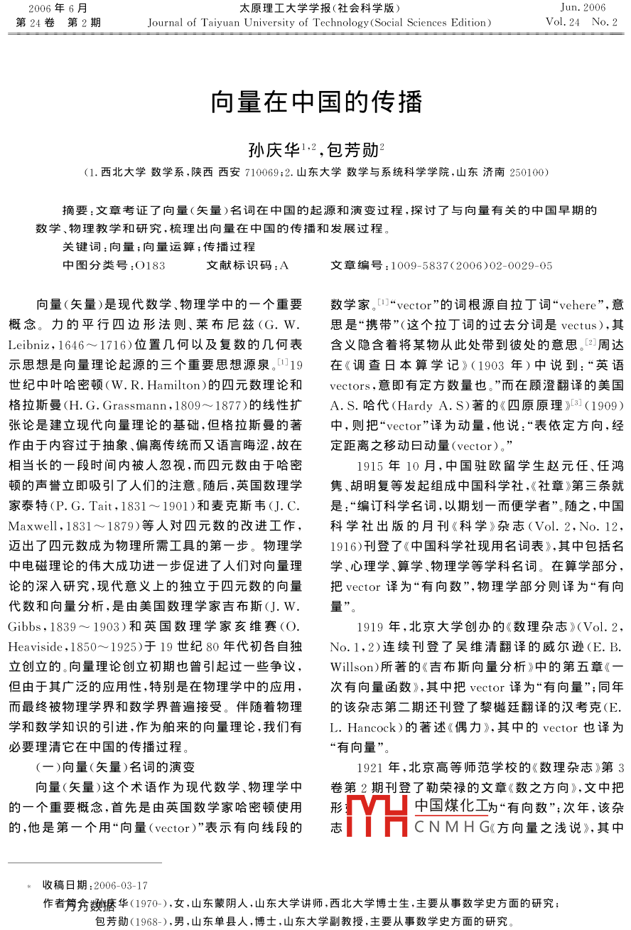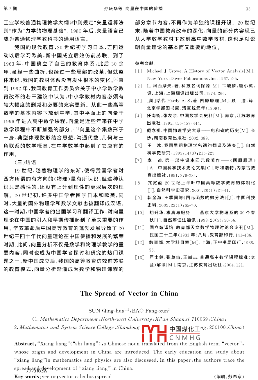 2006年6月太原理工大學(xué)學(xué)報(bào)(社會(huì)科學(xué)版)第24卷第2期Journal of Taiyuan University of Technology( Social Sciences EditionVol 24 No. 2向量在中國的傳播孫慶華12,包芳勛(1.西北大學(xué)數(shù)學(xué)系,陜西西安710069;2.山東大學(xué)數(shù)學(xué)與系統(tǒng)科學(xué)學(xué)院,山東濟(jì)南250100)摘要:文章考證了向量(矢量)名詞在中國的起源和演變過程,探討了與向量有關(guān)的中國早期的數(shù)學(xué)、物理教學(xué)和研究,梳理出向量在中國的傳播和發(fā)展過程。關(guān)鍵詞:向量;向量運(yùn)算;傳播過程中圖分類號(hào):O183文獻(xiàn)標(biāo)識(shí)碼:A文章編號(hào):1009-5837(2006)02-0029-05向量(矢量)是現(xiàn)代數(shù)學(xué)、物理學(xué)中的一個(gè)重要數(shù)學(xué)家。“ vector”的詞根源自拉丁詞“ venere”,意概念。力的平行四邊形法則、萊布尼茲(G.W思是“攜帶”(這個(gè)拉丁詞的過去分詞是 vectus),其Leibniz,1646~1716)位置幾何以及復(fù)數(shù)的幾何表含義隱含著將某物從此處帶到彼處的意思。2周達(dá)示思想是向量理論起源的三個(gè)重要思想源泉。19在《調(diào)查日本算學(xué)記》(1903年)中說到:“英語世紀(jì)中葉哈密頓(W.R. Hamilton)的四元數(shù)理論和 vectors,意即有定方數(shù)量也?!倍陬櫝畏g的美國格拉斯曼(H.G. Grassmann,1809~1877)的線性擴(kuò).S.哈代( Hardy A.S)著的《四原原理》(1909)張論是建立現(xiàn)代向量理論的基礎(chǔ),但格拉斯曼的著中,則把“ vector”譯為動(dòng)量,他說:“表依定方向,經(jīng)作由于內(nèi)容過于抽象、偏離傳統(tǒng)而又語言晦澀,故在定距離之移動(dòng)曰動(dòng)量( vector)?!毕喈?dāng)長的一段時(shí)間內(nèi)被人忽視,而四元數(shù)由于哈密1915年10月,中國駐歐留學(xué)生趙元任、任鴻頓的聲譽(yù)立即吸引了人們的注意隨后,英國數(shù)理學(xué)雋、胡明復(fù)等發(fā)起組成中國科學(xué)社,《社章》第三條就家泰特(P.G.Tait,1831~1901)和麥克斯韋(J.C.是:“編訂科學(xué)名詞,以期劃一而便學(xué)者”隨之,中國Maxwell1831~1879)等人對(duì)四元數(shù)的改進(jìn)工作,科學(xué)社出版的月刊《科學(xué)》雜志(Vol.2,No.12,邁出了四元數(shù)成為物理所需工具的第一步。物理學(xué)1916)刊登了《中國科學(xué)社現(xiàn)用名詞表》,其中包括名中電磁理論的偉大成功進(jìn)一步促進(jìn)了人們對(duì)向量理學(xué)、心理學(xué)、算學(xué)、物理學(xué)等學(xué)科名詞。在算學(xué)部分論的深入研究,現(xiàn)代意義上的獨(dú)立于四元數(shù)的向量把 vector譯為“有向數(shù)”,物理學(xué)部分則譯為“有向代數(shù)和向量分析,是由美國數(shù)理學(xué)家吉布斯(J.W.量Gibbs,1839~1903)和英國數(shù)理學(xué)家亥維賽(O1919年,北京大學(xué)創(chuàng)辦的《數(shù)理雜志》(Vol.2Heaviside,1850~1925)于19世紀(jì)80年代初各自獨(dú)No.1,2)連續(xù)刊登了吳維清翻譯的威爾遜(E.B.立創(chuàng)立的。向量理論創(chuàng)立初期也曾引起過一些爭議, Willson)所著的《吉布斯向量分析》中的第五章《但由于其廣泛的應(yīng)用性,特別是在物理學(xué)中的應(yīng)用,次有向量函數(shù)》,其中把 vector譯為“有向量”;同年而最終被物理學(xué)界和數(shù)學(xué)界普遍接受。伴隨著物理的該雜志第二期還刊登了黎樾廷翻譯的漢考克(E.學(xué)和數(shù)學(xué)知識(shí)的引進(jìn),作為舶來的向量理論,我們有L. Hancock)的著述《偶力》,其中的 vector也譯為必要理清它在中國的傳播過程有向量”。(一)向量(矢量)名詞的演變1921年,北京高等師范學(xué)校的《數(shù)理雜志》第3向量(矢量這個(gè)術(shù)語作為現(xiàn)代數(shù)學(xué)、物理學(xué)中卷第2期刊登了勒榮祿的文章《數(shù)之方向》,文中把的一個(gè)重要概念首先是由英國數(shù)學(xué)家哈密頓使用形中國煤化工為“有向數(shù)”;次年,該雜的,他是第一個(gè)用“向量( vector)”表示有向線段的志件HCNMHG《方向量之淺說》,其中收稿日期:2006-03-17作者筒數(shù)糖華(1970-),女,山東蒙陰人,山東大學(xué)講師西北大學(xué)博士生,主要從事數(shù)學(xué)史方面的研究;包芳勛(1968-),男,山東單縣人,博士,山東大學(xué)副教授,主要從事數(shù)學(xué)史方面的研究太原理工大學(xué)學(xué)報(bào)(社會(huì)科學(xué)版)第24卷vector譯為“方向量”。的 vector大都譯為“向量”。如 vector algebra譯為成立于1923年7月的中國科學(xué)社數(shù)學(xué)名詞審“向量代數(shù)”; vector analysis譯為“向量分析(學(xué))”;查委員會(huì)為了統(tǒng)一數(shù)學(xué)名詞,先后審定了許多數(shù)學(xué)tor function譯為“向量函數(shù)”等等。自此之后,在分支的譯名,并于1925~1932年間,在《科學(xué)》雜志數(shù)學(xué)中人們漸漸習(xí)慣于稱 vector為“向量上連續(xù)刊登了題為《數(shù)學(xué)名詞審查會(huì)算學(xué)名詞》的文1985年4月,經(jīng)國務(wù)院批準(zhǔn)正式成立了全國自章。在1925年的第10卷第6期的“微積分”部分給然科學(xué)名詞審定委員會(huì)。該審定會(huì)在1989年出版的出了 vector及相關(guān)詞語的翻譯,這里 vector譯為《物理學(xué)名詞》中將 vector譯為“矢量,向量”。根據(jù)矢”, vector function譯為“矢函數(shù)”, vector國務(wù)院授權(quán),全國自然科學(xué)名詞審定委員會(huì)審定公differentiation譯為