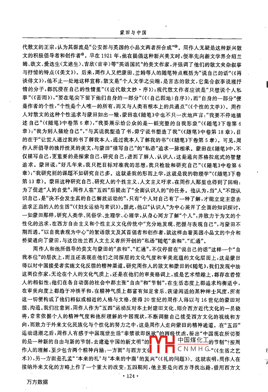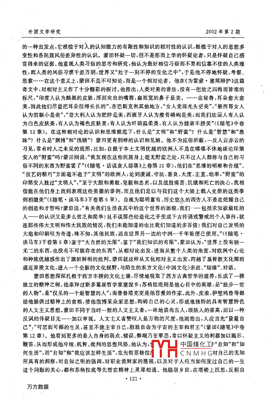 外國文學(xué)研究2002年第2期蒙田與中國錢林森內(nèi)容提要:本文從蒙田思想的智慧特色切入,著眼于中西方古典哲學(xué)的精神傳統(tǒng)和智慧層面的透視,揭示出蒙田之于中國文化,陌生中蘊藏著親和,相異中存在著匯通,指出正是這種內(nèi)在的“親和力”和匯通,使這位法蘭西人文主義“怪才”跨越基督教文化圈而逼近異質(zhì)文化,進入一個全新的文化視野,與陌生的中國文化親近、“結(jié)緣”。文章接著分析了中因新文學(xué)絮語散文作者如何以英倫三島“蒙田式”的隨筆作家為媒介而與蒙田“攜手”、“對話”,并從兩者“自我本位"的層次、審羨底蘊和文化氣度等方面加以審視和比較,從而描述出“你中有我我中有你”的的繽紛多彩的文化反饋的景觀。關(guān)鍵詞:蒙田智慧親和力中國文化文化反饋當(dāng)基督教文化與儒家文化于1600年間開始第一次實質(zhì)性的接觸時,歐洲文藝復(fù)興運動后期人文主義者蒙田( Michel de montaigne,1533-1592)已經(jīng)去世八個年頭,他無緣參與這東西方互不相識的兩個文明的對話,自然對孔夫子和儒家文化一無所知。但是,作為“啟蒙運動以前的位對知識權(quán)威的批評家”,作為“社會人類學(xué)興起以前的一位對其他民族文化進行冷靜研究的學(xué)者,作為法國文學(xué)史上第一位超越基督教文化圈,了望異質(zhì)文化的作家和思想家,他與流長的中國文化卻有著一種內(nèi)在的親和力,因而進人我們的研究視野,成為木文探討的對象。蒙田與中國文化的親和力蒙田所生逢的16世紀(jì)中葉和末葉,正是法國戰(zhàn)亂頻繁風(fēng)云變幻的時代由于深感宗教戰(zhàn)爭的危機,厭倦官場生活和疲于社交事務(wù),這位人文主義的怪才,在37歲(1570年)時,就一改文藝復(fù)興諸子凌厲激奮的生活航向,賣官歸田,退隱到他鄉(xiāng)下的領(lǐng)地維尼,過起一種離群索居的隱居生活。蒙田的退隱既表現(xiàn)了他對所處社會的逃避和悖逆,也反映出文藝復(fù)興運動后期新興資產(chǎn)階級中飽學(xué)之士對優(yōu)游暇生活的向往,有著深刻的西方政治文化背景。然而這種退隱歸田的生活方式,常常使人聯(lián)想到“杜門不復(fù)出,終身與世辭”的莊周、陶淵明這樣一些東方“隱士”的形象,以致使某些西方學(xué)者(如英國歷史學(xué)家博克)敏銳地意識到,蒙田“遲早總要被人們看作是一位中國道家思想的人物。其實,蒙田生前對中國道家思想毫無所知。作為作家兼思想家的蒙田純粹是由西方文化圈打造出來的,他以古希臘哲學(xué)為乳汁,轉(zhuǎn)益多師不宗一派他的思想清新、透徹,是“一種明快的自由思想,與道家思想并沒有什么直接淵源的關(guān)聯(lián)。蒙田對中國文化純?nèi)皇悄吧摹o知的,他在55歲(1588年)上,即辭世四年前,才讀到西班牙來華傳教士門多薩的《中華大帝國史》,接受了中華民族具有古老歷史的想想,并中國煤化工的話:“在中國,在這個很少與我們交往,對我們并不了解的王國里,它CNMHG杰出的領(lǐng)域內(nèi)超越了我們,它的歷史告訴我,世界之大、之豐高是我們時性元和找們?nèi)誱兒法深刻了解的這幾乎是蒙田在《隨筆》中談?wù)撝袊^無僅有的文字,它表現(xiàn)了西方巨子對東方古國的一種陌生·119.·蒙田與中國感及其對中國古老文明的神往之情。蒙田的思想與中國文化不存在直接淵源關(guān)系,那么蒙田何以被西方學(xué)者視為可能的中國道家人物呢?蒙田與中國傳統(tǒng)文化之間究竟存在什么樣的關(guān)聯(lián)呢?這只能從培育蒙田思想的西方文化源頭,從蒙田思想的智慧和視野特色來尋求答案。蒙田隱居鄉(xiāng)下領(lǐng)地,并非如他所言單單“享吾天年”,也非如陶淵明似的“采菊東籬下,悠然見南山”,將自己封閉在綠色的田野里荷鋤吟詠,而是一頭扎進了他那座圓塔三樓的書房里,閉門讀書、寫作、沉思,用美文、用智慧、用其豐富的人生體驗,結(jié)成了《隨筆》這樣一部多卷的“研究人,探索自己”的曠世之作,向整個世界和整個人類敞開了他的思想之窗,以致他的后輩和同鄉(xiāng),18世紀(jì)啟蒙思想家孟德斯鳩讀到《隨筆》時,不僅“讀到了寫書的人”,而且也“看到了思想的人”。他在藏書室的四壁掛滿了西方古哲的語錄其中就有羅馬劇作家泰倫修( Terence,公元前195-159)的一個雋語:“我是人,我認(rèn)為人類的一切都與我血肉相關(guān)?!边@是人文主義者蒙田終身遵從的人生格言和創(chuàng)作主旨,從中顯示出蒙田所特有的自我意識、人類意識和世界意識。蒙田思考的中心主題是人,以人為中心,以“自我”為中心。他在《隨筆》中聲言:“我所從事的研究其主題是人”,我的頭腦最主要、最辛勤的工作,便是研究自己。抑他本人就是“書的素材”,他是“第一個向公眾展示包羅萬象的自我全貌的人。他在自己的思考和作品中,充分地肯定了個人的存在及價值,肯定了人有獲得幸福和享受現(xiàn)世生活的權(quán)利肯定了所有的人在精神、道德和智慧上都是平等的,認(rèn)為“每個人都包含了人之所以為人的完整形態(tài),“人在興趣上和力量上各個不同,應(yīng)該通過不同的道路,根據(jù)個人的情況來謀求幸?!?《隨筆》下卷第12章),“皇帝和鞋匠的靈魂出于個模子”(《隨筆》中卷第12章),這種對個性、人性的尊重和肯定,必然導(dǎo)致對神和神性的否定和取代;這種人類平