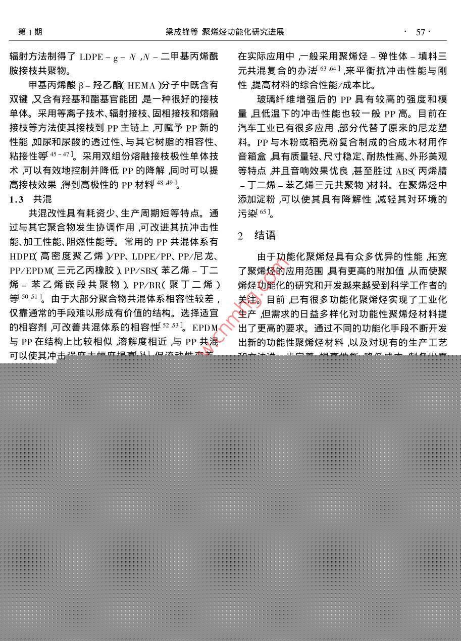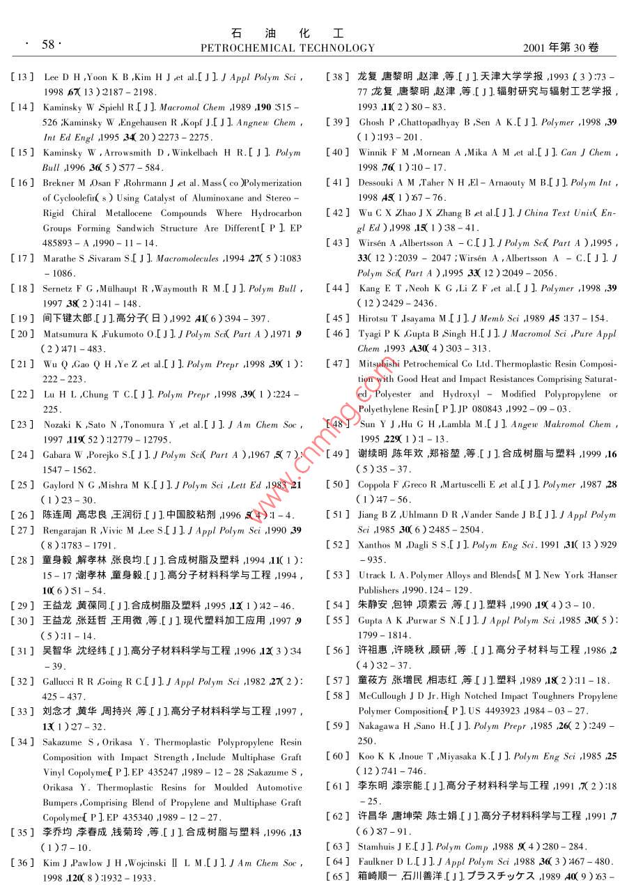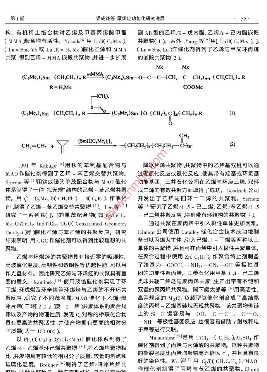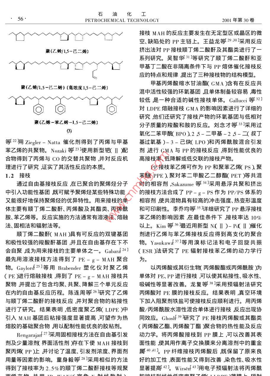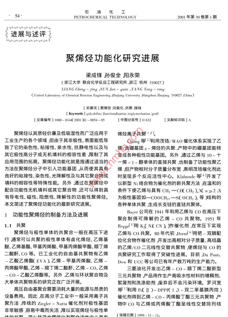 油化工PETROCHEMICAL TECHNOLOGY2001年第30卷第1期進(jìn)展與述評(píng)聚烯烴功能化研究進(jìn)展梁成鋒孫俊全陽永榮(浙江大學(xué)聯(lián)合化學(xué)反應(yīng)工程研究所浙江杭州310027)LIANG Cheng- feng ,SUN Jun- quan ,YANG Yong- rong( United Laboratory of Chemical Reaction Engineering Zhejang University ,Hangzhou Zhejang 310027 ,China)[關(guān)鍵詞]聚烯烴功能化共聚接枝[ Keywords ] polyolefins ;functionalization icoply merization igraft[文章編號(hào)] 1000 - 8144( 2001 )01 - 0054- 05[中圖分類號(hào)]0632[文獻(xiàn)標(biāo)識(shí)碼]A聚烯烴以其質(zhì)輕價(jià)廉及低吸濕性而廣泛應(yīng)用于烯烴離子共聚12。工業(yè)生產(chǎn)的各個(gè)領(lǐng)域但由于其非極性、表面能低導(dǎo)Chung等3利用茂鋯/MAO催化體系實(shí)現(xiàn)了乙致了它的染色性、粘接性、親水性、抗靜電性以及與烯/含硼基團(tuán)a-烯烴的共聚產(chǎn)物中的硼基團(tuán)能轉(zhuǎn)其它極性高分子或無機(jī)填料的相容性差,限制了其變成各種極性功能基團(tuán)。另外通過乙烯與10-十應(yīng)用范圍的拓展。聚烯烴功能化就是指通過適當(dāng)?shù)囊幌?1-醇單體的直接共聚,也制備了功能性聚乙方法在聚烯烴分子中引入功能基團(tuán),從而使其具有烯但產(chǎn)物相對(duì)分子質(zhì)量分布寬表明茂鋯催化劑此良好的粘接性、染色性、光降解性及與其它聚合物或時(shí)呈現(xiàn)多個(gè)反應(yīng)活性中心。Klabunde 等4]開發(fā)了填料的相容性等特殊性能。另外,通過在聚烯烴中以新型Ni絡(luò)合物為催化劑的新共聚方法在溫和的配合功能性無機(jī)填料或其它聚合物,還可以得到具條件下使乙烯與具有CH2=CH(CH2),X( n≥2 ,x有導(dǎo)電性、磁性、阻燃性、降解性的功能性聚烯烴。為極性基團(tuán)如一-C00CH3、- -Si( 0CH3 ),等)結(jié)構(gòu)的本文簡(jiǎn)述了聚烯烴功能化的最新研究進(jìn)展。各種單體共聚生成長(zhǎng)支鏈的直鏈共聚體。Bayer公司在1941 年利用乙烯與CO在高壓下1功能性聚烯烴的制備 方法及進(jìn)展聚合制得可降解的乙烯- CO共聚物。1951 年1.1 共聚.Reppe 5用K[ Ni( CN ) ]作催化劑,在常壓下實(shí)現(xiàn)聚烯烴與極性單體的共聚合一般在高壓下進(jìn)乙烯與CO共聚。80 年代初,Drent6用鈀 -雙膦配行通??梢怨簿鄣臉O性單體有鹵化烯烴、乙烯基位化合物作催化劑,開發(fā)出高相對(duì)分子質(zhì)量、高結(jié)晶醚、乙烯基酯、甲基丙烯酸、甲基丙烯酸甲酯、順丁烯的乙烯/CO二元線性交替共聚物,使烯烴與CO的二酸酐、CO等。已工業(yè)化的自由基共聚物有乙烯共聚研究工作取得了突破性進(jìn)展。目前,Du Pont、-乙酸乙烯酯( EVA)乙烯-甲基丙烯酸、乙烯-Dow和UCC等公司已有年產(chǎn)數(shù)萬噸的生產(chǎn)能力。丙烯酸甲酯、乙烯-順丁烯二酸酐、乙烯- co、乙烯.三菱油化開發(fā)出乙烯- co-順丁烯二酸新型- CO-乙酸乙烯酯等。另外,乙烯與環(huán)狀聚合物及三元共聚物產(chǎn)品用作生產(chǎn)高吸水性材料的增稠劑、大單體共聚物系的研究正在廣泛開展。絮凝劑和洗滌助劑廢棄后不會(huì)污染環(huán)境。羅河寬高壓自由基聚合需要消耗大量的能源與昂貴的等7利用Pd( II )- DPPP( 1 ,3-雙二苯基膦丙烷)設(shè)備費(fèi)用。因此在高分子工業(yè)中一般采用離子共催化劑得到乙烯- CO-丙烯酸丁酯三元共聚物產(chǎn)聚方法,傳 統(tǒng)的Ziegler- Natta催化劑對(duì)極性基團(tuán)物中cO與乙烯或丙烯酸丁酯呈線性交替排列結(jié)非常敏感容易中毒而失活難以實(shí)現(xiàn)烯烴與極性單體的共聚。第IV族茂金屬催化劑聚合活性中心具有[收稿日期] 1999-11-11。陽離子性質(zhì),郎便在較強(qiáng)的L堿性溶液中也能進(jìn)行[作者簡(jiǎn)介]梁成鋒( 1976- ).男河南省臺(tái)前縣人博士生電話0571 - 7951833。第1期梁成鋒等聚烯烴功能化研究進(jìn)展55.構(gòu)。有機(jī)稀土絡(luò)合物對(duì)乙烯及甲基丙烯酸甲酯到AB型的乙烯/δ-戊內(nèi)酯、乙烯/e-己內(nèi)酯嵌段( MMA聚合均有活性。Yasudd8用 LnR( CsMes )共聚物( 1)另外,Yang等9]用[ LnH( CsMes ) h( Ln=Sm、Yb或Lu ;R= H、Me )催化乙烯和M MA(Ln=Sm、Lu )作催化劑得到了乙烯與甲叉環(huán)丙烷共聚得到乙烯- MMA嵌段共聚物并進(jìn)一步擴(kuò)展的嵌段共聚物2)Me(C;Me,)2Sm- +(CHfCH,HR HMMA(C;Me;)2Sm-0- -C=C- +CH2- C- CH)mT +CHCHRR= HMcCOOMe(CH).(CsMc,)2Sm- +CH2CH六R -一0 (C;Me,)Sm-O +CH士C一( CH2方R(1)CH2{SmH(C,Me,)lrCH,=CH2 +-+CH2CHJNfCH.CH.-C亦(2)1991年Kakugf10]用 鈦的苯氧基配合物與-降冰片烯共聚物共聚物中的乙烯基雙鍵可以通MAO作催化劑得到了乙烯-苯乙烯交替共聚物。過硼氫化反應(yīng)或氫化反應(yīng),使其帶有羥基或環(huán)氧基Stevens等11]用鈦或鋯的單茂配合物與MAO催化功能基團(tuán)。三井石化公司在乙烯與環(huán)庚三烯、雙環(huán)體系制得了-種擬無規(guī)”結(jié)構(gòu)的乙烯-苯乙烯共聚戊二烯的有效共聚方面取得了成功。Goodrich 公司物。用η- CsMesTiC CH2Ph)- B( C6Fs》作催化開發(fā)出了乙烯與四環(huán)十二烯的共聚物。Sernetz劑制得了乙烯-苯乙烯交替共聚物[12]。Lee 等13]等18研究了乙烯/1 ,5- 己二烯、乙烯/苯乙烯/1 ,5研究了一系列鈦(IV)的單茂配合物(如CpTiCl、-己二烯共聚反應(yīng)得到帶有環(huán)結(jié)構(gòu)的共聚物( 3 )MesCpTiCl3、IndTiCl、CGC( Constrained Geometry通過共聚在聚丙烯中引入極性單體更加困難。Catalyst等)催化乙烯與苯乙烯的共聚反