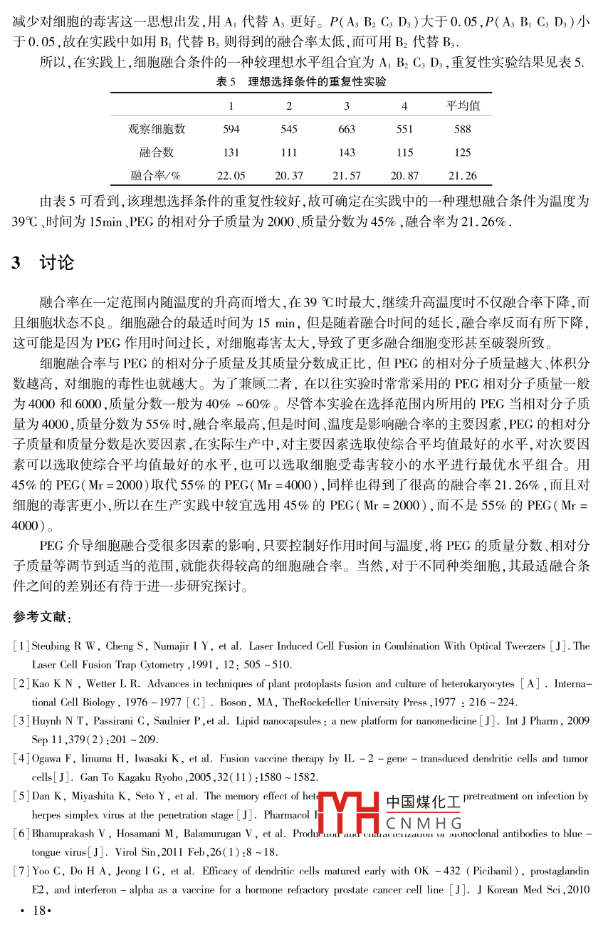 第34卷湖北師范學(xué)院學(xué)報(bào)(自然科學(xué)版)Vol. 34第1期Journal of Hubei Normal University ( Natural Science )No. 1 ,2014聚乙二醇介導(dǎo)細(xì)胞融合的優(yōu)化條件探究嚴(yán)鎮(zhèn)鈞',張小兵2(1. 湖北師范學(xué)院生命科學(xué)學(xué)院,湖北黃石435002;2.湖北省黃石市第十八中學(xué),湖北黃石435001 )摘要;細(xì)胞融合技術(shù)是細(xì)胞工程中的一項(xiàng)核心基礎(chǔ)技術(shù),聚乙二醇(PEG)是最常用的促融劑,廣泛地被應(yīng)用于農(nóng)業(yè)、醫(yī)藥環(huán)保等多個(gè)領(lǐng)域。探討更符合細(xì)胞工程要求的、融合后的細(xì)胞更大限度地保持生理活性的.快速、有效的細(xì)胞融合條件。以牛紅細(xì)胞為實(shí)驗(yàn)材料,PEG作促融劑介導(dǎo)牛紅細(xì)胞融合,研究不同的融合溫度、PEG作用時(shí)間、PEG的相對分子質(zhì)量和PEG的質(zhì)量分?jǐn)?shù)等因素對細(xì)胞融合率的影響。實(shí)驗(yàn)結(jié)果表明,選擇融合溫度為39C,時(shí)間為15min,選用相對分子質(zhì)量為2000、質(zhì)量分?jǐn)?shù)為45%的PEG,可以在細(xì)胞受毒害較小的同時(shí)得到最佳的融合效果,融合率能達(dá)到21.26%.關(guān)鍵詞:細(xì)胞工程;聚乙二醇;使用條件優(yōu)化研究中圖分類號:Q813.2文獻(xiàn)標(biāo)識碼:A文章編號:1009-2714( 2014)01-0014-06doi:10. 3969/j. issn. 1009 - 2714. 2014. 01. 004細(xì)胞工程是四大生物工程之- - - ,其核心基礎(chǔ)技術(shù)之一是細(xì)胞融合 技術(shù)。細(xì)胞與組織不同,不排斥異類.異種細(xì)胞,因此細(xì)胞融合不受種屬的局限,可實(shí)現(xiàn)種間生物體細(xì)胞的融合,使遠(yuǎn)緣雜交成為可能,因而是改造細(xì)胞遺傳物質(zhì)的有力手段。它的意義在于從此打破了僅僅依賴有性雜交重組基因創(chuàng)造新種的界限和生殖壁壘,極大地?cái)U(kuò)大了遺傳物質(zhì)的重組范圍;細(xì)胞融合技術(shù)避免了分離、提純、剪切、拼接等基因操作,在技術(shù)和儀器設(shè)備上的要求不象基因工程那樣復(fù)雜,投資少,有利于廣泛開展研究和推廣,有著重大的實(shí)踐意義。人工細(xì)胞融合開始于20世紀(jì)50年代,60年代到70年代作為一門新興的技術(shù)發(fā)展很快,有力地推動了生物科學(xué)各領(lǐng)域的發(fā)展,目前,細(xì)胞融合技術(shù)已成為研究細(xì)胞遺傳細(xì)胞免疫、腫瘤和生物新品種培育的重要手段,其應(yīng)用范圍極廣,已在農(nóng)業(yè)醫(yī)藥、環(huán)保等領(lǐng)域取得了開創(chuàng)性的研究成果,而且應(yīng)用領(lǐng)域不斷擴(kuò)大,其發(fā)展前景及產(chǎn)生的影響日益顯著。目前有許多促使細(xì)胞融合的技術(shù),但有些技術(shù)還處于剛剛起步階段,尚不成熟,或者存在某種生產(chǎn)應(yīng)用方面的缺陷,例如利用滅活的仙臺病毒介導(dǎo)細(xì)胞融合盡管可以得到較高的融合率,對各種動物細(xì)胞都適宜,并且仙臺病毒能在牛胚中大量繁殖,但其缺點(diǎn)是操作復(fù)雜、不穩(wěn)定,在保存過程中促融合活性會降低,并且制備過程比較煩瑣,而且病毒引進(jìn)細(xì)胞后,可能會對細(xì)胞的生命活動產(chǎn)生干擾,正是由于這些缺點(diǎn),目前滅活的仙臺病毒已逐漸被聚乙二醇( Polyethyleneglycol , PEG)取代;利用激光融合技術(shù)雖然易于實(shí)現(xiàn)特異性細(xì)胞融合,參數(shù)易于控制,操作方便,而且實(shí)驗(yàn)重復(fù)性好,但它只能逐一-處理細(xì)胞,不能像PEG-樣同時(shí)處理大量細(xì)胞”自從20世紀(jì)70年代Kao和Michayluk用PEG成A5十南石笊蚌物原生質(zhì)體融合后2],PEG法介導(dǎo)細(xì)胞融合以其容易制備活性穩(wěn)定、不需要中國煤化工便等優(yōu)點(diǎn),被普遍地YHCNMHG應(yīng)用于生物、遺傳、醫(yī)藥等研究領(lǐng)域,并且是目前應(yīng)用取)以的細(xì)胞融口時(shí)促融劑。2009年,HuynhNT收稿日期:2013-10-23作者簡介:嚴(yán)鎮(zhèn)均(1976- ),男 ,湖北武漢人,講師,研究方向?yàn)檫z傳學(xué).●14.等利用聚乙二醇介導(dǎo)細(xì)胞融合技術(shù)發(fā)展了納米醫(yī)學(xué)中的一個(gè)新領(lǐng)域-脂質(zhì)毫超微囊劑技術(shù)”。Oga-waF等用PEG介導(dǎo)經(jīng)紫外線照射形成的腫瘤細(xì)胞和轉(zhuǎn)人了IL-2基因或LacZ基因的樹狀細(xì)胞融合,融合細(xì)胞表達(dá)出了組織相容性復(fù)合體( Major Histocompatibility Complex , MHC ) classI、MHCclassll、CD86、CD11c和CD8alpha+。Dan K等用PEC介導(dǎo)細(xì)胞融合的技術(shù)證明了能高效抑制單純皰疹病毒(HSV)復(fù)制的多金屬氧酸鹽PM-19并非是在病毒感染的融合階段起作用”。另外,單克隆抗體技術(shù)就是通過細(xì)胞融合技術(shù)發(fā)展起來的,對生命科學(xué)的研究及醫(yī)學(xué)方面的應(yīng)用產(chǎn)生了重大影響,其中,PEG作為促融劑發(fā)揮了不可替代的作用,比如, Bhanuprakash V等用激活的淋巴細(xì)胞和骨髓瘤細(xì)胞通過PEG介導(dǎo)融合制造了藍(lán)舌病病毒的單克隆抗體[°]。ChangheeYoo等用PEG(Mr=1500)介導(dǎo)經(jīng)熱處理后的前列腺癌細(xì)胞(DU145cells)和成熟的抗原呈遞細(xì)胞樹狀細(xì)胞(Dendriticcells,DCs)進(jìn)行雜交,制備前列腺癌細(xì)胞系疫苗。GuoCH等用50%PEG介導(dǎo)食管癌細(xì)胞系( esophageal carcinoma cell line 109 , EC109 )和樹狀細(xì)胞( Dendritic cells , DCs)融合產(chǎn)生抗腫瘤的雜交疫苗8。HommaS等用自體樹狀細(xì)胞和自體