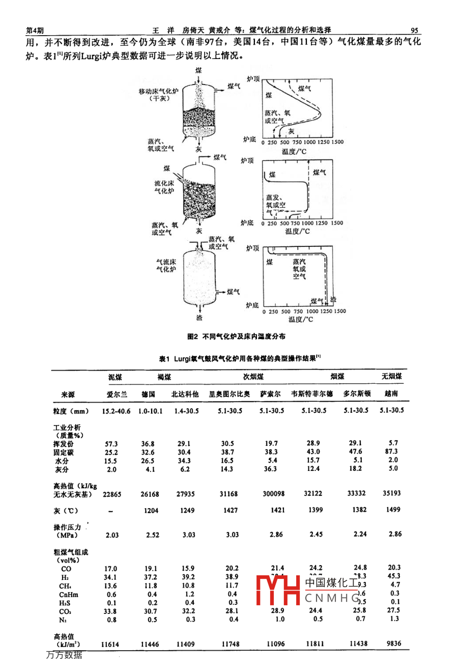 東莞理工學院學報第13眷第4期Vol.13 No.42006年8月。JOURNAL OF DONGGUAN UNIVERSITY OF TECHNOLOGYAug. 2006煤氣化技術的發(fā)展一煤氣化 過程的分析和選擇王洋房倚天黃戒介馬小云吳晉滬(中國科學院山西煤炭化學研究所,山西太原314002 )摘要:煤氣化在現(xiàn)在和未來能源化工的可持續(xù)發(fā)展中都占有相當重要的位置.根據(jù)現(xiàn)代煤基 能源化工需求、煤氣化過程特點及我國煤炭資源特點的分析,對如何認識、選擇和優(yōu)化已有技術,自主研發(fā)的方向是什么等問題進行了探討,指出:氣流床氣化中干法進料工藝炭轉化率更高,但從效率特別是液態(tài)排渣的運轉可靠性看,低灰含量、低灰熔點煤更有利,灰熔聚流化床氣化對煤的灰含量、灰熔點不敏感,可以適用更多種煤,過程效率也較高,符合我國資源特點,應加快研發(fā).關鍵詞:煤氣化;流化床;氣流床;過程效率;灰熔聚;高灰分;高灰熔點中國分類號: TQS4文獻標識碼: A文章編號: 1009-0312 (2006) 04- 0093-080簡介煤氣化技術發(fā)展至今已有一百多年的歷史,從路燈照明、工業(yè)煤氣、化工合成原料氣到今天的大型化工能源合成和先進發(fā)電系統(tǒng),規(guī)模上、技術上均發(fā)生了根本的變化。目前國際上考慮最緊迫的煤炭能源問題是清潔發(fā)電和制取液體燃料或更高級的氫能,通過煤氣化經(jīng)燃氣-蒸汽聯(lián)合循環(huán)、燃料電池循環(huán)發(fā)電、煤氣化制合成氣制高清潔汽、柴油、醇醚燃料可大幅度提高過程效率和環(huán)境品質。煤氣化制氫當前主要用于氨的合成,還可用于煉油廠油品加氫提質。我國經(jīng)濟在快速的發(fā)展中,更面臨著能源資源和環(huán)境限制的瓶頸,鑒于我國富煤缺油少氣的特點,煤氣化就更成為煤炭能源清潔高效轉化的重要基礎,近20年來特別是近幾年我國工業(yè)界已大量引進美歐等先進氣化技術,我國研究人員也開發(fā)了自己的氣化技術,但面對我國的大規(guī)模國家需求和市場需求、面對我國煤炭資源自身特點(如高灰含量,高灰熔點煤較多),如何認識、選擇和優(yōu)化已有技術,自主研發(fā)的方向是什么仍是必須回答的問題。本文根據(jù)現(xiàn)代煤能源化工需求,煤氣化過程特點和我國煤炭性質對以上問題進行了討論。1現(xiàn)代電力和能 源化工對煤氣化的需求本文中現(xiàn)代電力、能源化工指經(jīng)煤氣化聯(lián)合循環(huán)或煤氣化制氫燃料電池聯(lián)合循環(huán)發(fā)電和以大噸位液體燃料(油、醇、醚、氫)合成為目的的能源生產(chǎn)(如圖1所示) ,通過先進技術的集成應用,大幅度提高一次能源效率,減輕或消除環(huán)境污染,保證社會和經(jīng)濟的可持續(xù)發(fā)展。電力、能源化工大規(guī)模、環(huán)境友好、高效經(jīng)濟的特征要求煤氣化過程具有以下特點:1)大規(guī)模、高生產(chǎn)能力一如氣化爐 單臺日處理能力500~2000噸煤以上;2)過程高效一操作壓力、 溫度合理,能耗低,設備投資低;3)過程可靠-操作穩(wěn)定、設備簡單,開工率高,4)粗煤氣、水、灰渣凈化處理容易,無環(huán)境二次污中國煤化工5)氣化原料煤種寬,特別是可適應高灰含量高灰熔點mCNMHG收稿日期: 2006-07-05作者簡介:王祥(1940-). 男,山西交城人,研究員,主要從事流化床煤氣化過程工程的研究。94東莞理工學院學報2006年→力國國一圖o,+H (煉油,汽車燃料)→電力氨、肥料(CO+H)合威}一 +油、醇、醚0O2 (埋存)圖1以氣化為基礎的煤炭利用2現(xiàn)代煤氣化技術2. 1煤氣化的基本化學反應煤氣化是借氣化劑使煤轉化為燃料氣或合成氣的過程,為達到一定的化學組成和足夠快的反應速度,通常在高溫(>900C)和一定壓力下進行,所涉及的反應包括:煤熱解→CH+CO+CO+Hz+油/焦油+C(半焦)快反應C+Oz= =CO2+409KJ/mol(2)C+1/202=C0+123KJ/mo1(3)C+H:O=CO+H2-119KJ/mol慢反應(4)C+COz= 2CO-162 KJ/molCO+H20=CO:+Hz+42KJ/molCO+3H:=CH+H2O+206KJ/mol(7)由于煤富炭少氫(≤5%),高溫下首先熱解(反應())轉化為大量炭(半焦),因此氣化過程主要考察氣化反應(4) (1) (5)和供熱反應(2) (1) (3),反應(6)為快速氣相反應。2.2典型煤氣化技術現(xiàn)已工業(yè)應用的氣化爐型有三類,即固定床氣化爐、流化床氣化爐和氣流床氣化爐(如圖2 ),固定床UGI (1913年) WG (1880年) M型、D型常壓1流化床Winkler(1926年) AFB(2001年)氣化爐氣流床K- -T (1952年)固定床-Lurgi (1939年)加壓流化床- -HTW ( 1985年) KRW (1975年) AFB(1996年)*氣流床-Texaco(1978年) Shel(1983年)B-gas (1983年) GSP(1983年)其爐內溫度分布如圖22.2.1固定床氣化爐固定床氣化爐以魯奇爐(Lurgi) 為代表,煤與氣化劑(氧、蒸汽)逆流流動,塊狀煤(5-50mm)從爐頂加入在逐步下移過程中與熱的煤氣氣化劑換熱,發(fā)生干燥、干餾、氣化、燃燒和灰渣冷卻,氣化劑(氧、蒸汽)則在上升過程中換熱,反應轉化為煤氣中圖2所示溫商分布可見,由于逆流過程“冷進”“冷出”,固定床氣化爐應該氣化過程效率TYH中國煤化工k爐的蒸汽用量較大,常達煤量的2~3倍以防灰渣熔結,使?jié)衩簹怙@熱消耗CN M H G之煤氣中干餾產(chǎn)物(焦油、酚等)未能氣化(達煤熱值的8%),不但降低了煤氣化過程效率,而且增加了粗煤氣凈化設備投資和能耗,因此固定床氣化爐更適用于褐煤、年青煙煤氣化制城市煤氣和焦油能集中加工的場合,而不太適用于現(xiàn)代發(fā)電和能源化工合成。但固定床加壓氣化爐(1939年發(fā)明)較早用于工業(yè)應第4期.王洋房倚天黃戒介等:煤
