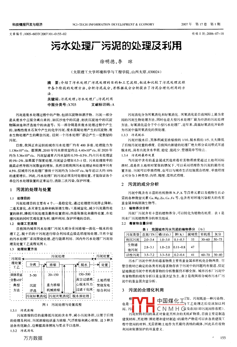 科技慵報(bào)開(kāi)發(fā)與經(jīng)濟(jì)SCI-TECH INFORMATION DEV ELOPMENT & ECONOMY2007年第17卷第1期文章編號(hào):1005- 603( 2007 )01-0155-02收稿日期:2006 -07-18污水處理廠污泥的處理及利用徐明德,李瓊(太原理T.大學(xué)環(huán)境科學(xué)與T.程學(xué)院.山西太原.030024 )摘要:介紹了 污水處理廠污泥處理的目的和工藝流程,敘述和比較了污泥處理流程中各個(gè)階段的處理方法,分析污泥成分,并根據(jù)成分分析提出了污泥合理化利用的方法,關(guān)鍵詞:污泥處理;污水處理廠;污泥利用中圖分類(lèi)號(hào):X703文獻(xiàn)標(biāo)識(shí)碼:A污泥是廢水處理過(guò)程中的產(chǎn)物.包括沉淀物和漂浮物。污泥-部分污泥消化分為厭氧消化和好氧消化。厭氧消化是日前國(guó)際上最為常是從廢水中直接分離出|來(lái)的.如沉沙池中的沉渣.初次沉淀池中的沉淀用的污泥生物處理方法.同時(shí)也是大型污水處理廠最為經(jīng)濟(jì)的污泥處理物隔油池和評(píng)選池中的油渣等:另-部分則是在廢水處理過(guò)程中產(chǎn)生方法。好氧消化適合于中小型污水處理廠.近年來(lái).高溫好氧消化開(kāi)始作的,如酸性廢水石灰中產(chǎn)生的化學(xué)污泥。廢水混凝處理產(chǎn)生的沉淀物.廢為污泥中溫厭氧消化的預(yù)處理。水生物處理產(chǎn)生的剩余污泥。任何- .個(gè)污水 處理廠都會(huì)產(chǎn)生- -定數(shù)量的.3.3 污泥脫水污泥。污泥經(jīng)脫水后.其體積減至濃縮前的1/10.脫水前的1/5.大大降低日前,我國(guó)正在運(yùn)轉(zhuǎn)的城市污水處理廠約有400多座.處理能力為了后續(xù)污泥處置的難度。日前國(guó)內(nèi)新建的處理廠絕大部分采川帶式厭濾1.136x10" u/a。據(jù)預(yù)測(cè),2010年污水排放量將達(dá)4.40x10* U/a.面2020年脫水機(jī).具有出泥含水率低穩(wěn)定.能耗少.管理簡(jiǎn)單等特點(diǎn)。約為5.36x10"la。污泥址通常占污水址的0.3%-0.5% .約占污水處理址1.3.4污泥的最終處 置的1%-2%.如果屬于深度處理.污泥址會(huì)增加0.5~1倍。污水處理效率的當(dāng)污泥中禽有的面金屬或其他有毒有害物質(zhì)濃度超過(guò)土地利用標(biāo)提高必然導(dǎo)致污泥數(shù)址的增加。雖然日前我國(guó)污水處理址和處理率只有準(zhǔn)時(shí).或是在土地相對(duì)緊張的情況下,可以采用填埋作為污泥的最終處4.5%.但城市污水處理廠排放十污泥約為3.0x10* l/a每年還以大約10%置方法。污泥可以單獨(dú)填埋.也可以與城市生活垃圾混合填埋。單獨(dú)坑埋的速度增長(zhǎng)。內(nèi)此,污水處理廠的污泥必須及時(shí)處理處置,才能保證各個(gè)義可分為3種類(lèi)型:溝填.掩埋堤壩式填埋。單位污水處理裝置的正常運(yùn)行.消除二次污染,保護(hù)環(huán)境。2污泥的成分分析1污泥的處理與處置污泥中既含有豐富的有機(jī)物和N,P,K等營(yíng)養(yǎng)元素以及植物生長(zhǎng)必1處理目的需的各種微址元素Ca.Mg.Zn,Co,Fe等.也含有對(duì)環(huán)境污染較大的有害污泥處理日的主要有4個(gè):一是穩(wěn)定化.通過(guò)處理使污泥停止降解;重金屬和病原微生物等。二是無(wú)害化.殺滅寄生蟲(chóng)卵和病原微生物;三是減量化.減少污泥最終處.1 植物養(yǎng)分分析置的體積,降低污泥處理及最終處置費(fèi)州;四是資源化和最終處置.在處污泥廠污泥含 有半富的植物養(yǎng)分.可以轉(zhuǎn)化為植物有機(jī)質(zhì)。表1是理污泥的同時(shí)實(shí)現(xiàn)化害為利.循環(huán)利用.保護(hù)環(huán)境的日的。污水廠污泥植物養(yǎng)分的相關(guān)組成。1.2處理工藝流程2.2 毒害物含量分析日前國(guó)內(nèi)城市污水處理廠污泥大部分采用濃縮- -消化- 脫水的處表1 我國(guó)城市污水污泥的植物養(yǎng)分 (%)理T.藝.脫十后的干污泥進(jìn)行綜合利用或直接送填埋場(chǎng)處理.只有少量[污泥類(lèi)型總氮(TN)磷(P0.)鉀(K)腐殖質(zhì)有機(jī)質(zhì)灰分的污水處理廠采用焚燒處理.進(jìn)行能源利H.國(guó)內(nèi)外污水處理廠污泥處[ 初沉污泥2.0-3.4 1.0-3.0 0.1-0.3 I _ 3.30-60 I 50~75理及處置T.藝流程見(jiàn)圖1。生物濾2.8-3.1 1.0-2.0 0.11-0.8 473處理處置方法.池污泥污泥處理污泥處置話(huà)性污泥3.5-.2 3.3-5.0_0.2-0.4.60-7030-40;污泥處4污水廠污泥中所含的毒害物質(zhì)主要有重金屬和有機(jī)化合物兩類(lèi)。盡:理處置[分離Jp(濃縮了下[脫水一八處置管日前對(duì)已確定的各類(lèi)有機(jī)毒害物存在于污泥中的問(wèn)題均有報(bào)道.但定工藝址地描述污泥中有機(jī)毒害物的分析數(shù)據(jù)仍不夠全面。城市污水廠污泥中周體質(zhì)址5-50 .20-1501i50-500有害物質(zhì)的現(xiàn)有分析以重金屬含址為主.表2是我國(guó)部分城市污水廠污分?jǐn)?shù)x10!真空過(guò)濾離土地填埋泥中的重金屬含址分析。典型沉淀重力濃縮心脫水壓力:焚燒發(fā)電.方法浮選,機(jī)械濃縮、↓過(guò)濾干化床:綜合利用3污泥的合理化利用污泥好氧消化污泥厭氧消化[脫水預(yù)處理T知,污說(shuō)既是-一種污染物,圖1污泥處理與處置流程中國(guó)煤化工T藝處理之后應(yīng)該加以利1.3.1 污泥濃縮用。污TYHC N M H G&及農(nóng)用即污泥州作農(nóng)肥)。污泥濃縮的日的是降低污泥的含水率.減小污泥體積.以便于后續(xù)污泥材料利用的真正對(duì)象是其所含的無(wú)機(jī)礦物質(zhì).日前主要是制造的處理及利用。污泥濃縮