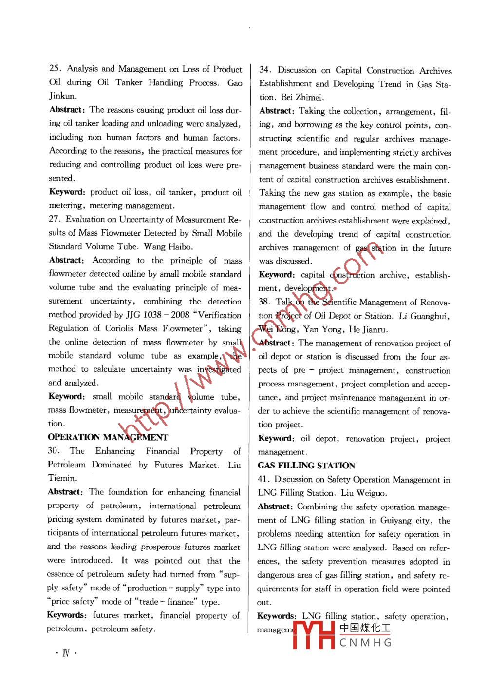 Bimonthly, StartefPublication in 1992OIL DEPOT AND GAS STATIONVol. 21, No. 1No. 119 totallyFeb20,2012Honorary Chairman of Editorial Committee: Li Chunguang, Zhang haichaoContents and abstractsChairman of Editorial Committee: Zuo XingkaiVice Chairman of Editorial Committee: Guo FeihoSTORAGE TECHNOLOGIESng, Wang Weimin, An Shan1. Realization of Quantitative Loading Control ofMembers: Zhang Xilai, Wang Hongchuan, Xu Fubin,I Rail Tankers Using Continuous MeasurementZhang zia, Feng Peiyu, Li Yuxing, Rui Jiqiang, Principle of Radio Frequency Admittance. ZhanChen Biwen, Yin Chaoming, Ren Shixian, Du Yubin,JiajunYang Jiming, Huang He, Li Yiqing, Zheng Jinghua, Abstract: Aiming at the study on the automationJia Yuepeng, Lun Kaiyong, Yan Hua, Huang bingliLiu Xiangbin, Zhang Tianming, Luo Tonghua, Niuf rail tankers loading, the design conception ofJingmin, Wang Jinpei, Han Qingyue, Liu Huabin, Wangusing directly radio frequency admittance liquidMin, Han Jie, Xia Fengwu, Wang An, Dai Fujun, Zhou level meter to measure the liquid level of tankerXuehong, XU Jiangqiao, Liu Sheng, He Ming, Song and then check the volume according to tankerWei, Bu Wenping, Zhang Yi, Du Daolin, Shen Qingql, volume table is proposed as the alternative of rou-Du Hongyan, Zhou Jiaxiang, Han Jun, Jin WangangDirector: Zuo Xingkaitine measuring method using flowmeter. TheVice Director: Guo Feihongstructure of radio frequency admittance liquid levelEditor-in-Chief: Wang Weiminmeter and the principle for continuous measure-Vice Editor-in-Chief: Jin Wangangment, and the possibility of realizing measurementEditor-in-Charge: Zhang YResponsible Department: China PetrochemicalCorporation (SINOPEC)CKeyword: storage automation, radio frequencySponsor: SINOPEC Sales Companyadmittance liquid level meter, quantitative loadPublisher: Editorial Office of Oil Depots and OiltationDistributor(Domestic): Editorial Office of Oil De-4. All- Weather Magnetic Breather Valve. Gaopots and Oil StationsSongzhu, Tang Junfeng, Zhao Shuzhong, XuAddress:Building No 6, Guangqujiayuan, Dongcheng PingDistrict, BeijingAbstract The structure, working principle andPostcode: 100022Tel:(010)67006041;67006042technical features of all weather magnetic breatherFax:(010)67006043E-mail:sykjyz@sina.comand different operating conditions of large/smallDistributor(Abroad): China National Publication breathing were analyzed, and the technical perfor-mance of the valve was describedPrinter: Fei Teng Printing Co Ltd of langfangAddress: No 25, Yonghua Dao Ave LangfangKeyword: oil depot, breathing valve all-weathPostcode: 065000er, magnetic.ISSN1008-2263;CN11-3945/TESAFETY TECHNOLOGYNo. of Ad. License: 0135, Chaoyang District,6. Reason Analysis on Boil-over in Heavy OilBeijingTank atDomestic Price: RMB60 per yearangangAbstrac中國(guó)煤化工Copyright gor all originally published reportsCNMHGheavy oil tanks, according to the physical properties electrical equipmentof heavy oil, the reasons causing borboil-over acci- Keywords: oil depot, explosion proof, electrical e-dents of heavy oil were analyzed. The temperature quipment, measure.parameter controlled for heavy oil storage was dis- 16. The Self-Protection of Staff in Gas Stationussed theoretically, and precautions for preventing Zhou Yunli, Yang Xiaojie, Zhang Zhengangheavy oil were proposed, which had Abstract: The dangers faced by gas station staff arecertain guiding significance for heavintroduced. It is proposed that the gas station staffand actual productionshould study safety knowledge, improve self-pro-Keywords: heavy oil tank, residue, boil-over, tection measures and safety technological abilitycautionreduce hazard to minimum degree, in order to en8. Application and Developing Trend of Video sure the personnel safety of gas station staffMonitoring System in Oil Depot. Zhao XingweiKeyword: gas station, staff, self-protectionAbstract: Based on the introduction of selection ofmeasurecamera and hard disk video recorder during upgrad- ENVIRONMENT PROTECTIONing of monitoring system in Shoushan Oil Depot in 18. Study on Ecological Environment Protection2010, the standard and factors considered for selec- Measures of Oil Storage Depot. Chen Siwei,Chention of camera and hard disk video recorder were Shuhai, Tang Shunwudescribed. The developing trend of oil depot moni- Abstract: The main pollution sources of oil storagetoring system was prospected, i. e. video monitor- depot were analyzed comprehensively from the as-ing system has integrated digital technology and re- pects of design, construction, and routine operamote expanding system, high resolution video,I tion. In order to reduce the influence on environlong distance digital transmission, mass storage ment to minimum degree during oil depot designhave become the tendency of above-mentioned construction and daily operation, the correspondingsystemmeasures should be adopted adopt various meaKeywords: video monitoring, oil depot, applica- sures to reduce oil leakage and hydrocarbon vaportion, developing trendization: treat the wastewater to meet theSAFETY MANAGEMENTments of discharge standard; treat the solid waste11. Safety Management of High Place Work in Gas to harmlessness; adopt low noise equipments andStation Construction. Zou Xiujianuse vibration reduction, sound isolation measures;Abstract: The reasons causing accidents during establish corresponding accident prevention strate-high place work in gas station construction were gyanalyzed. The countermeasures for preventingKeywords: oil storage depot, ecological environ-dents of high place work were presented in order to ment protection, safety strategyavoid accidents of high place work21. Fault Analysis on Oil Vapor Recovery SystemKeywords: gas station construction, high place in Gas Station. Zhang Wenfengwork, safety managementAbstract: The structure of oil vapor recovery sys14. Safety Prevention Measures of Explosion Proof tem in gas station was described briefly, and theElectrical Equipment in Oil Depot. Ren Junq