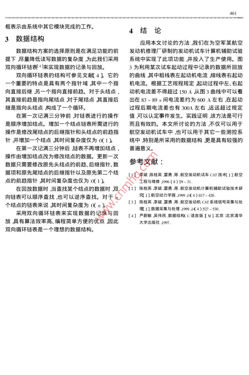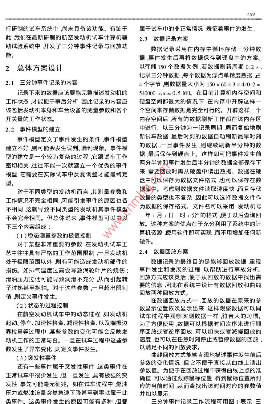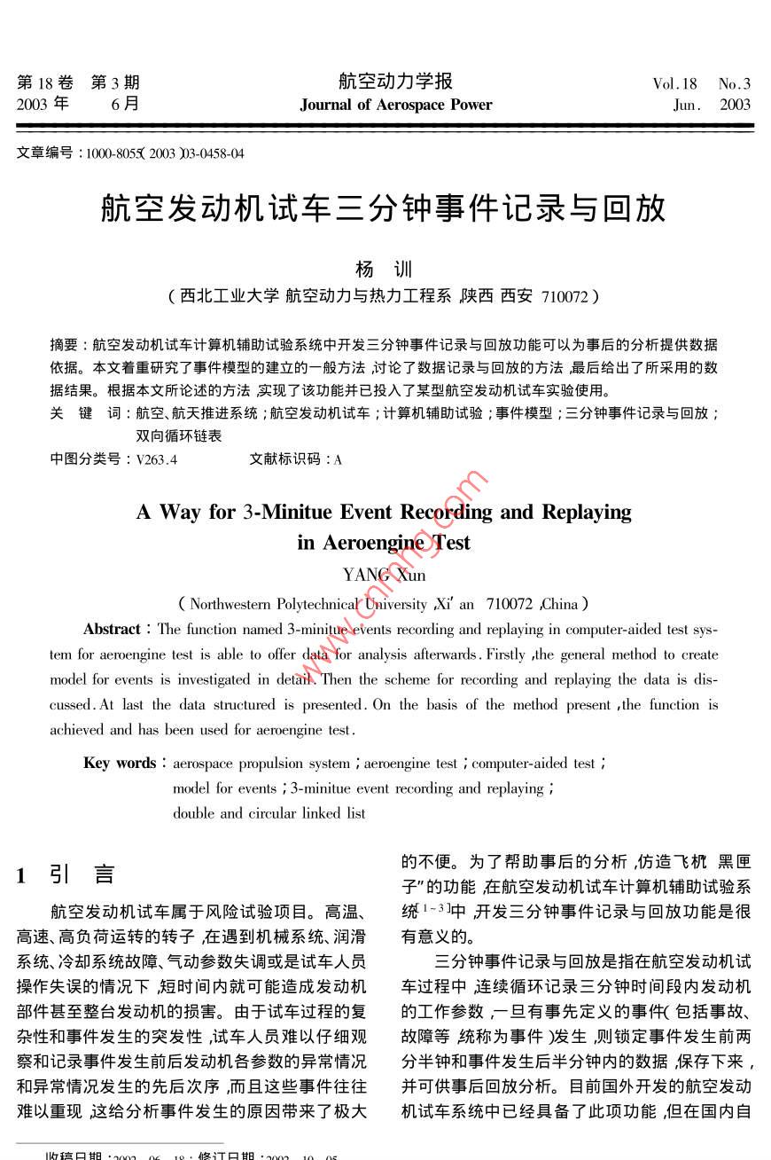 第18卷第3期航空動(dòng)力學(xué)報(bào)Vol 18 No. 3003年月Journal of Aerospace Power文章編號:100080520033-0458-04航空發(fā)動(dòng)機(jī)試車三分鐘事件記錄與回放楊訓(xùn)西北工業(yè)大學(xué)航空動(dòng)力與熱力工程系陜西西安710072)摘要:航空發(fā)動(dòng)機(jī)試車計(jì)算機(jī)輔助試驗(yàn)系統(tǒng)中開發(fā)三分鐘事件記錄與回放功能可以為事后旳分析提供數(shù)據(jù)依據(jù)。本文著重研究了事件模型的建立的一般方法討論了數(shù)據(jù)記錄與回放的方法最后給出了所采用的數(shù)據(jù)結(jié)果。根據(jù)本文所論述的方法實(shí)現(xiàn)了該功能并已投入了某型航空發(fā)動(dòng)機(jī)試車實(shí)驗(yàn)使用。關(guān)鍵詞:航空、航天推進(jìn)系統(tǒng);航空發(fā)動(dòng)機(jī)試車;計(jì)算機(jī)輔助試驗(yàn);事件模型;三分鐘事件記錄與回放雙向循環(huán)鏈表中圖分類號:V263.4文獻(xiàn)標(biāo)識碼:AA Way for 3-Minitue Event Recording and replayingn aeroengine TestYANG XunNorthwestern Polytechnical University Xi' an 710072 ChinaAbstract: The function named 3-minitue events recording and replaying in computer-aided test sys-tem for aeroengine test is able to offer data for analysis afterwards firstly , the general method to createmodel for events is investigated in detail. Then the scheme for recording and replaying the data is dis-cussed. At last the data structured is presented. On the basis of the method present the function isachieved and has been used for aeroengine testKey words: aerospace propulsion system aeroengine test computer-aided test i'model for events i 3-minitue event recording and replayingdouble and circular linked list1引言的不便。為了幫助事后的分析,仿造飛杌黑匣子"的功能在航空發(fā)動(dòng)機(jī)試車計(jì)算機(jī)輔助試驗(yàn)系航空發(fā)動(dòng)機(jī)試車屬于風(fēng)險(xiǎn)試驗(yàn)項(xiàng)目。高溫、統(tǒng)1-3中開發(fā)三分鐘事件記錄與回放功能是很高速、高負(fù)荷運(yùn)轉(zhuǎn)的轉(zhuǎn)子在遇到機(jī)械系統(tǒng)、潤滑有意義的。系統(tǒng)、冷卻系統(tǒng)故障、氣動(dòng)參數(shù)失調(diào)或是試車人員三分鐘事件記錄與回放是指在航空發(fā)動(dòng)機(jī)試操作失誤的情況下短時(shí)間內(nèi)就可能造成發(fā)動(dòng)機(jī)車過程中連續(xù)循環(huán)記錄三分鐘時(shí)間段內(nèi)發(fā)動(dòng)機(jī)部件甚至整臺發(fā)動(dòng)機(jī)的損害。由于試車過程的復(fù)的工作參數(shù),旦有事先定義的事件(包括事故、雜性和事件發(fā)生的突發(fā)性,試車人員難以仔細(xì)觀故障等統(tǒng)稱為事件)發(fā)生則鎖定事件發(fā)生前兩察和記錄事件發(fā)生前后發(fā)動(dòng)機(jī)各參數(shù)的異常情況分半鐘和事件發(fā)生后半分鐘內(nèi)的數(shù)據(jù)保存下來,和異常情況發(fā)生的先后次序而且這些事件往往并可供事后回放分析。目前國外開發(fā)的航空發(fā)動(dòng)難以重現(xiàn)這給分析事件發(fā)生的原因帶來了極大機(jī)試車系統(tǒng)中已經(jīng)具備了此項(xiàng)功能但在國內(nèi)自行研制的試車系統(tǒng)中尚未具備該功能。有鑒于屬于試車中的非正常情況表征著事件的發(fā)生。此我們在最新研制的航空發(fā)動(dòng)機(jī)試車計(jì)算機(jī)輔2.3數(shù)據(jù)記錄方案助試驗(yàn)系統(tǒng)中開發(fā)了三分鐘事件記錄與回放功數(shù)據(jù)記錄采用在內(nèi)存中循環(huán)存儲三分鐘數(shù)據(jù)事件發(fā)生后再將數(shù)據(jù)保存到硬盤中的方案2總體方案設(shè)計(jì)以存儲150個(gè)數(shù)據(jù)為例,若數(shù)據(jù)刷新周期0.2s,記錄三分鐘數(shù)據(jù)每個(gè)數(shù)據(jù)為浮點(diǎn)單精度數(shù)據(jù)占2.1三分鐘事件記錄的內(nèi)容4個(gè)字節(jié)則數(shù)據(jù)量大小為150×60×3×4/0.2=記錄下來的數(shù)據(jù)應(yīng)該要能完整描述發(fā)動(dòng)機(jī)的540000byte≈0.5MB。在目前計(jì)算機(jī)內(nèi)存空間和工作狀態(tài)才能便于事后分析因此記錄的內(nèi)容應(yīng)硬盤空間都很大的情況下在內(nèi)存中開辟這樣一該包括發(fā)動(dòng)機(jī)本身和車臺設(shè)備的測量參數(shù)和各個(gè)個(gè)空間來存儲數(shù)據(jù)是完全可行的。開辟這樣一個(gè)開關(guān)量的工作狀態(tài)內(nèi)存空間后所有的數(shù)據(jù)刷新工作都在該內(nèi)存區(qū)2.2事件模型的建立中進(jìn)行。以三分鐘為一記錄周期周而復(fù)始地刷事件模型定義了事件發(fā)生的條件事件模型新試車數(shù)據(jù)最后時(shí)刻的數(shù)據(jù)自動(dòng)刷新最早時(shí)刻建立不好則可能會發(fā)生誤判、漏判現(xiàn)象。事件模的數(shù)據(jù),一旦事件發(fā)生則繼續(xù)刷新半分鐘的數(shù)型的建立是一個(gè)較為復(fù)雜的過程;它跟試車工作據(jù)最后保存到硬盤上。這樣即可把事件發(fā)生前密切相關(guān)往往不能一次就建立一個(gè)優(yōu)秀的事件兩分半鐘和事件發(fā)生后半分鐘的數(shù)據(jù)全部保存下模型,它需要在實(shí)際試車中反復(fù)調(diào)整才能最終定來需要回放時(shí)再從硬盤中讀出數(shù)據(jù)。數(shù)據(jù)在硬盤中可以保存為數(shù)據(jù)文件格式也可以保存在數(shù)對于不同類型的發(fā)動(dòng)機(jī)而言其測量參數(shù)和據(jù)庫中??紤]到數(shù)據(jù)文件讀取速度快而且存儲工作情況不完全相同可能引