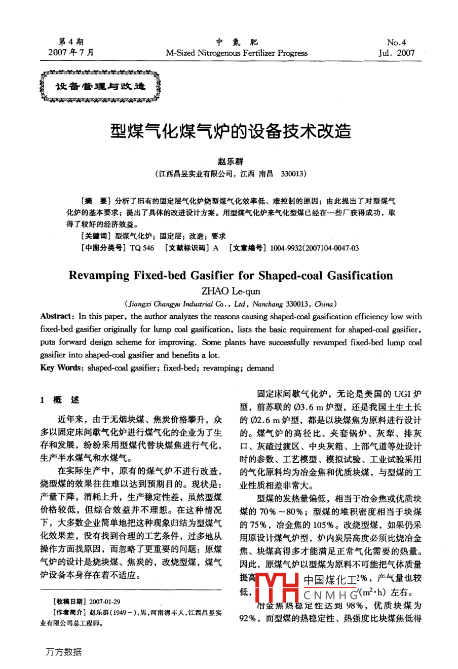 第4期中氮肥No.42007年7月M-Sized Nitrogenous Fertilizer ProgressJul.2007設(shè)備管理與改造型煤氣化煤氣爐的設(shè)備技術(shù)改造趙樂(lè)群(江西昌昱實(shí)業(yè)有限公司,江西南昌330013)[摘要] 分析了舊有的固定層氣化爐燒型煤氣化效率低、難控制的原因;由此提出了對(duì)型煤氣化爐的基本要求;提出了具體的改進(jìn)設(shè)計(jì)方案。用型煤氣化爐來(lái)氣化型煤已經(jīng)在- - 些廠獲得成功,取得了較好的經(jīng)濟(jì)效益。[關(guān)鍵詞]型煤氣化爐;固定層;改造;要求[中圖分類號(hào)] TQ546 [文獻(xiàn)標(biāo)識(shí)碼] A [文章編號(hào)] 1004-9932(2007)04-0047-03Revamping Fixed-bed Gasifier for Shaped-coal GasificationZHAO Le-qun(Jiangxi Changyu Industrial C., Ltd , Nanchang 330013, China)Abstract: In this paper, the author analyzes the reasons causing shaped-coal gasification efficiency low withfixed-bed gasifier originally for lump∞oal gasification, lists the basic requirement for shaped-coal gasifier,puts forward design scheme for improving. Some plants have successfully revamped fixed-bed lump coalgasifier into shaped-coal gasifier and benefits a lot.Key Words: shaped-coal gasifier; fixed-bed; revamping; demand固定床間歇?dú)饣癄t,無(wú)論是美國(guó)的UGI爐1概述型,前蘇聯(lián)的03.6 m爐型,還是我國(guó)土生土長(zhǎng)近年來(lái),由于無(wú)煙塊煤、焦炭?jī)r(jià)格攀升,眾的02.6 m爐型,都是以塊煤焦為原料進(jìn)行設(shè)計(jì)多以固定床間歇?dú)饣癄t進(jìn)行煤氣化的企業(yè)為了生的。煤氣爐的高徑比、夾套鍋爐、灰犁、排灰存和發(fā)展,紛紛采用型煤代替塊煤焦進(jìn)行氣化,口、灰碴過(guò)渡區(qū)、中央灰箱、上部氣道等處設(shè)計(jì)生產(chǎn)半水煤氣和水煤氣。時(shí)的參數(shù)、工藝模型、模擬試驗(yàn)、工業(yè)試驗(yàn)采用在實(shí)際生產(chǎn)中,原有的煤氣爐不進(jìn)行改造,的氣化原料均為冶金焦和優(yōu)質(zhì)塊煤,與型煤的工燒型煤的效果往往難以達(dá)到預(yù)期目的?,F(xiàn)狀是:業(yè)性質(zhì)相差非常大。產(chǎn)量下降,消耗上升,生產(chǎn)穩(wěn)定性差,雖然型煤型煤的發(fā)熱量偏低,相當(dāng)于冶金焦或優(yōu)質(zhì)塊價(jià)格較低,但綜合效益并不理想。在這種情況煤的70%~80%;型煤的堆積密度相當(dāng)于塊煤下,大多數(shù)企業(yè)簡(jiǎn)單地把這種現(xiàn)象歸結(jié)為型煤氣的75%,冶金焦的105%。改燒型煤,如果仍采化效果差,沒有找到合理的工藝條件,過(guò)多地從用原設(shè)計(jì)煤氣爐型,爐內(nèi)炭層高度必須比燒冶金操作方面找原因,而忽略了更重要的問(wèn)題:原煤焦、塊煤高得多才能滿足正常氣化需要的熱量。氣爐的設(shè)計(jì)是燒塊煤、焦炭的,改燒型煤,煤氣因此,原煤氣爐以型煤為原料不可能把氣體質(zhì)量爐設(shè)備本身存在著不適應(yīng)。提高中國(guó)煤化工2%,產(chǎn)氣量也較低,[HCN MH G(m2.h)左右。[收稿日期] 2007-01-29冶金焦熱穩(wěn)足性達(dá)到98%,優(yōu)質(zhì)塊煤為[作者簡(jiǎn)介]趙樂(lè)群(1949- ),男,河南清豐人,江西昌昱實(shí)92%,而型煤的熱穩(wěn)定性、熱強(qiáng)度比塊煤焦低得業(yè)有限公司總工程師。.48●中氮肥.第4期多,- -般煤球熱穩(wěn)定性為70%,煤棒為75%。8%, 而目前大部分型煤爐0O2體積分?jǐn)?shù)在9%冶金焦熱強(qiáng)度達(dá)到1.15X 103 N/cm2,優(yōu)質(zhì)塊煤~12%,明顯偏高。如果能提高氣化層,則可以為1x 103 N/cm2,而煤球僅為400 N/cm2,煤棒使0O2體積分?jǐn)?shù)降到9%以下,有利于提高氣化為350 N/cm2。強(qiáng)度。上述差別造成工藝指標(biāo)控制截然不同。爐上2.3提高吹風(fēng)量的 同時(shí)不發(fā)生吹翻溫度指標(biāo),冶金焦可以達(dá)到750 C,優(yōu)質(zhì)塊煤可型煤氣化層提高后,床層阻力升高,影響吹以達(dá)到550 C,型煤僅能在400 C以下操作。風(fēng)強(qiáng)度。而型煤氣化要求吹風(fēng)時(shí)風(fēng)量要比塊煤氣型煤的灰熔點(diǎn)和灰分含量與煤焦差別很大,化大得多。實(shí)際情況是:燒型煤吹風(fēng)流量普遍偏因此,爐算、灰犁、排灰口,灰碴過(guò)渡區(qū)等處的低。這一矛盾是制約型煤氣化的關(guān)鍵所在。怎樣設(shè)計(jì)相差也很大。如果不改變,勢(shì)必造成煤氣爐才能在型煤氣化時(shí)床層阻力較高的情況下,既大爐下灰盤、排灰口部位不是灰碴結(jié)死,就是粉末幅度提高吹風(fēng)流量,滿足氣化要求,又不致吹翻狀流生,難以穩(wěn)定生產(chǎn)。呢?答案是必須對(duì)煤氣爐進(jìn)行技術(shù)改造,重新進(jìn)根據(jù)經(jīng)驗(yàn)數(shù)據(jù),固定床煤氣爐以優(yōu)質(zhì)塊煤為行設(shè)計(jì)。原料,每0.95~1.05 m3人爐空氣生產(chǎn)1 m3半3煤氣爐改造水煤氣。而以型煤為原料,因其熱值偏低,炭層.中蓄熱量相對(duì)偏低,往往每1.15~1.25 m3空氣3.1 適應(yīng)型煤特性,使入爐風(fēng)量提高,流量加才能生產(chǎn)1 m3合格半水煤氣。因此,型煤氣化.大,流速降低要達(dá)到理想的生產(chǎn)強(qiáng)度,提供熱量的空氣量要比燒型煤容易吹翻,所以要求人爐空氣分布必塊煤高,即吹風(fēng)空氣需求量相對(duì)塊煤偏大。但在須合理,杜絕出現(xiàn)“偏流”、“走短路”。 除去爐實(shí)際生產(chǎn)中,固定床煤氣爐以型煤為原料氣化,箅各通 風(fēng)道合理布置以外,還必須實(shí)現(xiàn)中央灰箱吹風(fēng)量反而降低,否則會(huì)吹翻。要使型煤氣化達(dá)橫截面積大