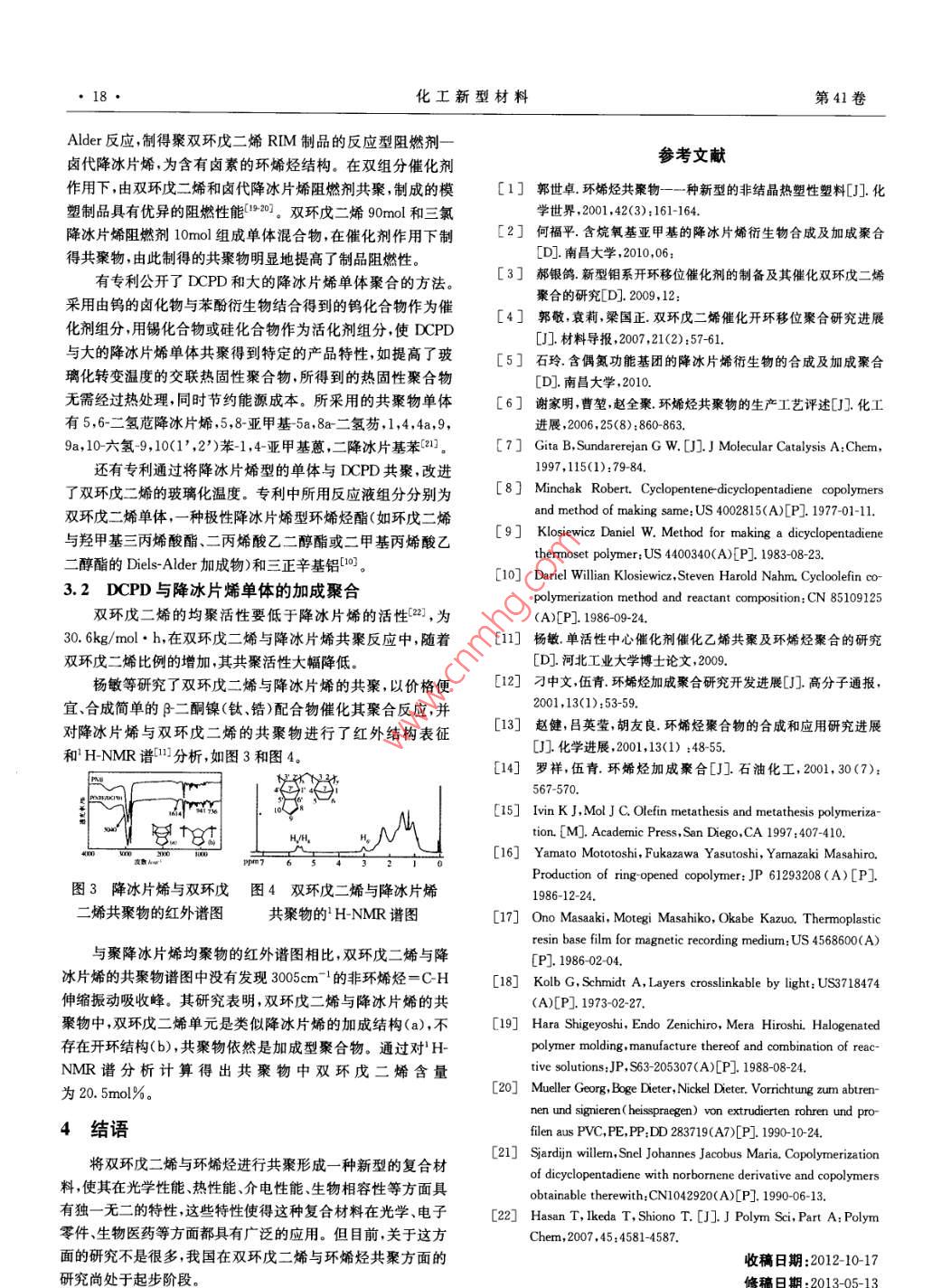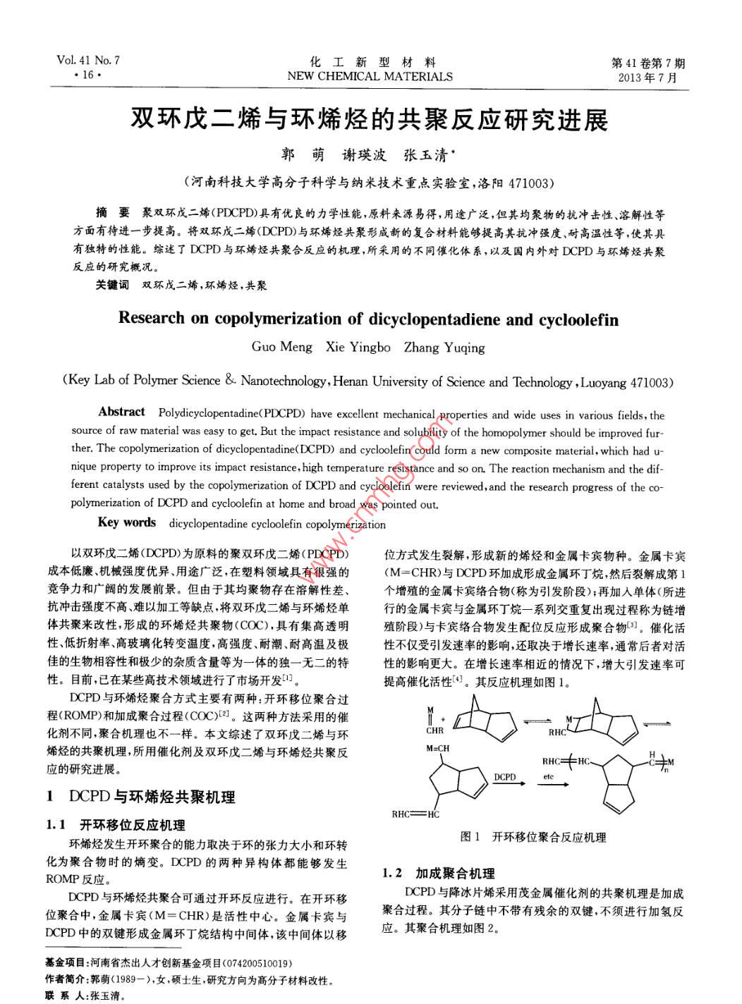 Vol. 41 No. 7化工新型材料第41卷第7期●16.NEW CHEMICAL MATERIALS2013年7月雙環(huán)戊二烯與環(huán)烯烴的共聚反應(yīng)研究進展郭萌謝瑛波張玉清*(河南科技大學高分子科學與納米技術(shù)重點實驗室,洛陽471003)摘要聚雙環(huán)戊二烯(PDCPD)具有優(yōu)良的力學性能,原料來源易得,用途廣泛,但其均聚物的抗沖擊性、溶解性等方面有待進一步提高。將雙環(huán)戊二烯(DCPD)與環(huán)烯烴共聚形成新的復合材料能夠提高其抗沖強度、耐高溫性等,使其具有獨特的性能。綜述了DCPD與環(huán)烯烴共聚合反應(yīng)的機理,所采用的不同催化體系,以及國內(nèi)外對DCPD與環(huán)烯烴共聚反應(yīng)的研究概況。關(guān)鍵詞雙環(huán)戍二烯,環(huán)烯烴,共聚Research on copolymerization of dicyclopentadiene and cycloolefinGuo Meng Xie Yingbo Zhang Yuqing(Key Lab of Polymer Science & Nanotechnology, Henan University of Science and Technology ,Luoyang 471003)Abstract Polydiclopentadine(PDCPD) have excllnet mechanical properies and wide uses in various fields, thesource of raw material was easy to get. But the impact resistance and solubility of the homopolymer should be improved fur-ther. The copolymerization of dicyclopentadine(DCPD) and cycloolefin could formn a new composite material, which had u-nique property to improve its impact resistance , high temperature resistance and so on, The reaction mechanism and the dif-ferent catalysts used by the copolymerization of DCPD and cyeloolefin were reviewed, and the research progress of the co-polymerization of DCPD and cycloolefin at home and broad was pointed out,Key words dicyclopentadine cyloolefin copolymerization以雙環(huán)戊二烯(DCPD)為原料的聚雙環(huán)戊二烯(PDCPD)位方式發(fā)生裂解,形成新的烯烴和金屬卡賓物種。金屬卡賓成本低廉機槭強度優(yōu)異、用途廣泛,在塑料領(lǐng)域具有很強的(M=CHR)與DCPD環(huán)加成形成金屬環(huán)丁烷,然后裂解成第1競爭力和廣闊的發(fā)展前景。但由于其均聚物存在溶解性差、個增殖的金屬卡賓絡(luò)合物(稱為引發(fā)階段);再加人單體(所進抗沖擊強度不高、難以加工等缺點,將雙環(huán)戊二烯與環(huán)烯烴單行的金屬卡賓與金屬環(huán)丁烷- -系列交重復出現(xiàn)過程稱為鏈增體共聚來改性,形成的環(huán)烯烴共聚物(COC),具有集高透明殖階段)與卡賓絡(luò)合物發(fā)生配位反應(yīng)形成聚合物”。催化活性、低折射率、高玻璃化轉(zhuǎn)變溫度,高強度、耐潮、耐高溫及極性不僅受引發(fā)速率的影響,還取決于增長速率,通常后者對活佳的生物相容性和極少的雜質(zhì)含量等為一體的獨-無二的特性的影響更大。在增長速率相近的情況下,增大引發(fā)速率可性。目前,已在某些高技術(shù)領(lǐng)域進行了市場開發(fā)。提高催化活性網(wǎng)。其反應(yīng)機理如圖1。DCPD與環(huán)烯烴聚合方式主要有兩種:開環(huán)移位聚合過程(ROMP)和加成聚合過程(COC)[2。這兩種方法采用的催化劑不同,聚合機理也不一樣。本文綜述了雙環(huán)戊二烯與環(huán)CHRRHC烯烴的共聚機理,所用催化劑及雙環(huán)戊二烯與環(huán)烯烴共聚反M=CHRHc=Hc^應(yīng)的研究進展。DCPD,ete1 DCPD 與環(huán)烯烴共聚機理RHC= =Hc1.1開環(huán)移位 反應(yīng)機理圖1開環(huán)移位聚 合反應(yīng)機理環(huán)烯烴發(fā)生開環(huán)聚合的能力取決于環(huán)的張力大小和環(huán)轉(zhuǎn)化為聚合物時的熵變。DCPD的兩種異構(gòu)體都能夠發(fā)生1.2加成聚合機理ROMP反應(yīng)。DCPD與環(huán)烯烴共聚合可通過開環(huán)反應(yīng)進行。在開環(huán)移DCPD與降冰片烯采用茂金屬催化劑的共聚機理是加成位聚合中,金屬卡賓(M= CHR)是活性中心。金屬卡賓與聚合過程。其分子鏈中不帶有殘余的雙鍵.不須進行加氫反DCPD中的雙鍵形成金屬環(huán)T烷結(jié)構(gòu)中間體,該中間體以移應(yīng)。其聚合機理如圖2。基金項目:河南省杰出人才創(chuàng)新基金項目(074200510019)作者簡介:郭萌(1989 - ),女,碩士生,研究方向為高分子材料改性。聯(lián)系人:張玉清。第7期郭萌等:雙環(huán)戊二烯與環(huán)烯烴的共聚反應(yīng)研究進展化劑。傳統(tǒng)的Ziegler Natta體系包括在環(huán)烯烴與a烯烴共聚合的研究方面,最早使用的鈦系共聚合催化劑主要由TiC4 和AlIEts .Al(-Bu)s、AlEnCl等組成.但催化活性不高12。鋯茂化合物與MAO組成的均相催化體系,可催化得到環(huán)烯烴的圖2加成聚合反應(yīng)機理均聚物12。后過渡金屬催化劑包括Pd催化劑和Ni催化劑[4。加成聚合過程的工藝開發(fā)晚于開環(huán)移位聚合過程,是在早期對環(huán)烯烴加成聚合的研究存在催化活性不高、分子茂金屬用于環(huán)烯烴均聚后才得以實現(xiàn)的5。雙環(huán)戍二烯與降量低等缺點,所以沒有引起重視。進入80年代后,Kaminsky冰片烯加成聚合的玻璃化溫度可通過調(diào)整雙環(huán)戊二烯的含量小組發(fā)現(xiàn)了茂金屬/甲基鋁氧烷(MAO)高效催化體系,從而來控制5]。但目前對雙環(huán)戊二烯與環(huán)烯烴共聚的加成聚合研加速了茂金屬催化劑的發(fā)展5。MAO具有良好的助催化能究還不成熟。力并能使催化劑均相化得到很大提高。茂金屬均相催化劑最顯著的特征是具有單一的活性中心,使聚合物的分子量分布2DCPD與環(huán)烯烴共聚的催化劑組成有單分散性,從而具有獨特的分子剪裁性,達到高分子設(shè)2.1DCPD與環(huán)烯烴開環(huán)移位聚合的催化劑計的