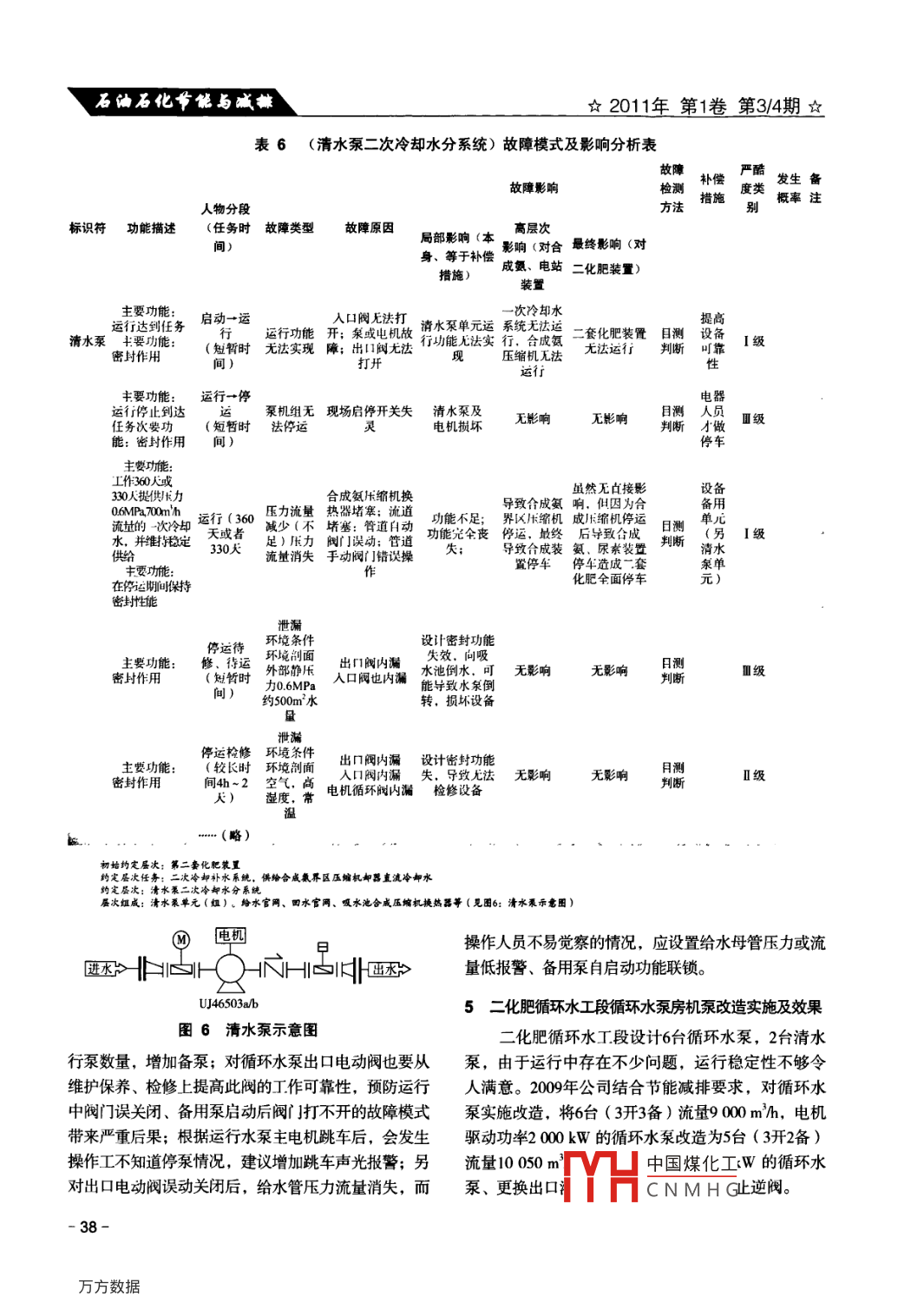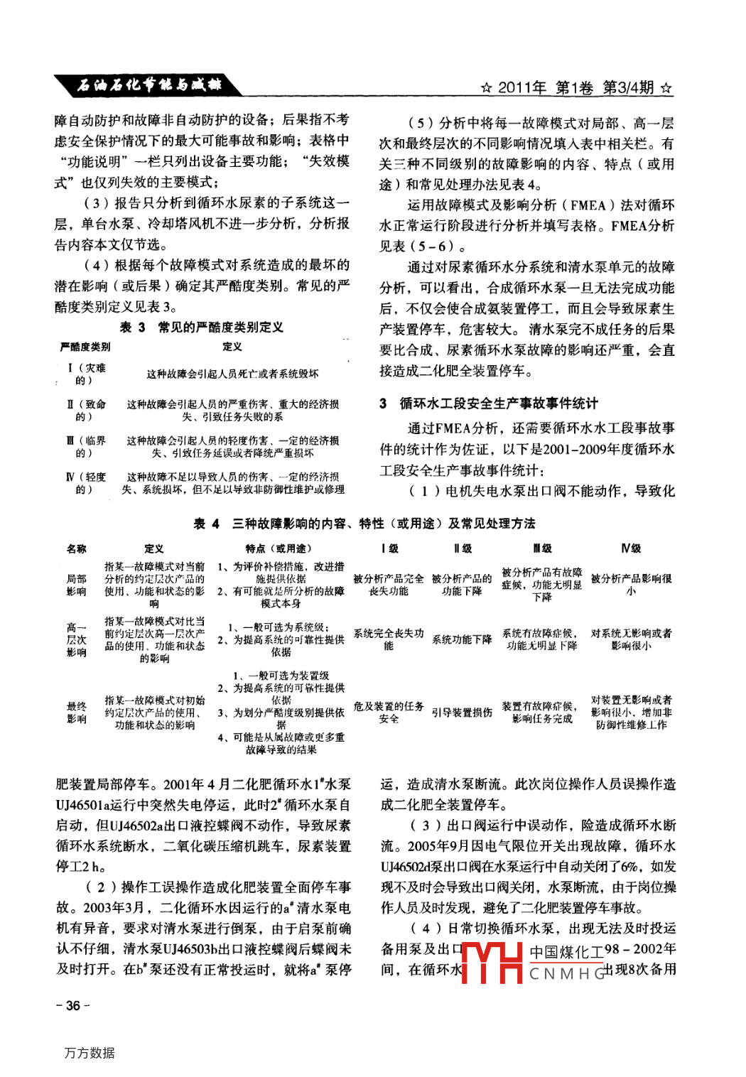 石油石化節(jié)能與減排2011年第1卷第3/4期Energy Conservation and Emission Reduction in Petroleum and Petrochemical Industry工業(yè)循環(huán)水水泵組故障類型及影響分析王維贊,曹夏孟(中國石油寧夏石化公司,寧夏750026)摘要: 用故障類型及影響分析法(FMEA) ,對寧夏石化公司二化肥循環(huán)水系統(tǒng)節(jié)能改造后的現(xiàn)狀進行了調(diào)查分析,針對發(fā)現(xiàn)的問題提出了改進措施和建議。該分析方法有助于提早發(fā)現(xiàn)裝置存在隱患,對預(yù)防事故發(fā)生、減少事故損失有重大意義。關(guān)鍵詞:故障類型及影響分析法( FMEA)工業(yè)循環(huán)水水泵故障1故障模式及影響分析法概述2二化肥循環(huán)水 系統(tǒng)FMEA分析1.1故障模式及影響分析法 (FMEA) 簡介寧夏石化公司二化肥裝置以天然氣為原料,設(shè)FMEA是- -種基本可靠性設(shè)計分析方法,是故計年產(chǎn)450 kt合成氨、780 kt尿素.障分析技術(shù)的基礎(chǔ)。該方法對發(fā)生或可能發(fā)生故障其循環(huán)水工段是為合成氨、尿素、鍋爐裝置輸送的系統(tǒng)及其組成單元進行分析,包括鑒別其故障起合理冷量的循環(huán)水。循環(huán)水水泵將流量為30000 m'h,因、故障模式(即故障機理和發(fā)展過程),評估該壓力為05 MPa的冷卻水送到合成氨、尿素、鍋爐界區(qū)故障模式對系統(tǒng)可能產(chǎn)生的影響及后果分析等。通的換熱器,經(jīng)熱交換后溫度上升至40 C;通過壓力為過故障模式及影響分析,可以迅速發(fā)現(xiàn)較明顯的故0.15 MPa的回水管網(wǎng)送至涼水塔,在涼水塔填料層中障模式并確定單點故障,然后采取相應(yīng)的技改措施與空氣逆流接觸冷卻,循環(huán)水溫度降至32 C后經(jīng)過涼予以消除,從而提高系統(tǒng)的可靠性。水塔塔池連通管進人吸水池;循環(huán)水泵再將吸水池的1.2使用FMEA分析的 目的冷卻水加壓送出。FMEA分析法能夠準(zhǔn)確地分析功能單元或部件故循環(huán)水蒸發(fā)損失、少量飛濺損失、工藝界區(qū)排障對系統(tǒng)工作所產(chǎn)生的后果,為制定設(shè)計方案、工藝放、水系統(tǒng)正常調(diào)節(jié)排污水量的損失,由外部新鮮改進和使用補償措施提供依據(jù)。能夠確定系統(tǒng)設(shè)施的原水補給以維持水量平衡見圖1??煽啃躁P(guān)鍵件(關(guān)鍵裝置)和重要件(重要部位),二化肥自1998年投產(chǎn)已運行12年。循環(huán)水系統(tǒng)而這些關(guān)鍵件、重要件又是進行設(shè)計、工藝技術(shù)改造因設(shè)備存在缺陷,如單臺循環(huán)水泵功率消耗大、流的主要目標(biāo),同樣也是進行可靠性增長試驗、鑒定試量低等問題,影響裝置的安全運行。為了全面地排驗、應(yīng)力分析和保證安全性的主要對象。查影響循環(huán)水系統(tǒng)安全、穩(wěn)定、長周期運行的問題通過FMEA可以達到下述目的:和隱患,結(jié)合裝置實際運行情況,使用FMEA方法(1)幫助工藝系統(tǒng)設(shè)計和運行管理者從各種.分析存在的問題和原因,提出了改進意見。方案中選擇滿足可靠性要求的最佳方案;2.1循環(huán)水系統(tǒng)功能層次劃分(2)有助于在設(shè)計審議中對有關(guān)措施、檢測二化肥工業(yè)循環(huán)水系統(tǒng)(工號名稱:二化肥循設(shè)備等做出客觀的評價;環(huán)水工段)的任務(wù)是:連續(xù)向二化肥裝置的水冷器(3)找出對設(shè)施系統(tǒng)故障有重大影響的部件、功能單元的故障模式并分析其影響程度;收稿日期: 2011-03-27(4)能為進- -步定 量分析提供基礎(chǔ);作者簡介中國煤化工此于撫順石油學(xué)院.(現(xiàn)遼寧現(xiàn)在寧夏石化公(5)能為進-步更改設(shè)施裝置設(shè)計提供資料;司質(zhì)量安fHCN MH G.- 33-石油石化節(jié)能與減排凸2011年第1卷第3/4期白蒸發(fā)水飛散水風(fēng)機.8SS。0循環(huán)熱水熱交換器.回水管網(wǎng)空氣熱交換器|熱交換器填料x工藝介質(zhì)工藝介質(zhì)給水管網(wǎng)循環(huán)冷水系統(tǒng)(保有)水冷卻塔泵排污水.圄1循環(huán)冷卻水系統(tǒng)流程及其它用水設(shè)備提供經(jīng)過水質(zhì)穩(wěn)定處理和冷卻的工機、人口閥。業(yè)用水。二化肥裝置按照裝置、系統(tǒng)、 子系統(tǒng)、設(shè)備、根據(jù)原二化肥循環(huán)水工段情況,參考節(jié)能改組件劃分,劃分層次和內(nèi)容見圖2。循環(huán)水系統(tǒng)由造設(shè)計、生產(chǎn)制造、土建、設(shè)備安裝情況和各參清水泵分系統(tǒng)、合成氨分系統(tǒng)、尿素分系統(tǒng)組成。與單位職責(zé),考慮運行后的維修級別,確定FMEA循環(huán)水子系統(tǒng)劃分各部分:回水管網(wǎng)、涼水塔分析對象的初始約定層次是二化肥裝置,最低約風(fēng)機、涼水塔、塔池、吸水池、循環(huán)水泵、給水管定層次為出口電動閥、止逆閥、水泵、驅(qū)動電網(wǎng)、用戶見圖3。初始約定層裝置約定層次2約定層次1最低約定層零組件.系統(tǒng)分系統(tǒng)次設(shè)備.尿素系統(tǒng)清水系統(tǒng)t[ 合成換熱器][合成氨用戶合成氨系統(tǒng)合成循環(huán)水清水泵組[循環(huán)水泵組1吸水池二套化肥裝置循環(huán)水系統(tǒng)尿素循環(huán)水水泵風(fēng)機蒸汽系統(tǒng)藥劑系統(tǒng)廠涼水塔L出口閥電機加氯系統(tǒng)電氣系統(tǒng)t人口閥監(jiān)測系統(tǒng).■尿素用戶]止逆閥[ 冷卻循環(huán)線]圖2二化肥裝置功能及層次劃分對應(y