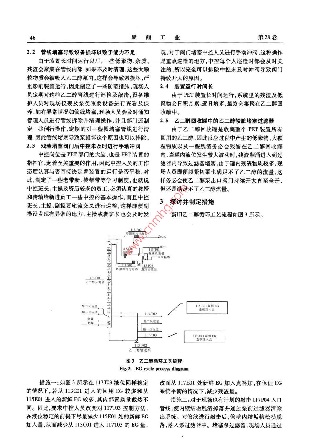 第28卷第4期聚酯工業(yè)Vol 28 No 4201507Polyester IndustryJuly 2015doi:10.3969/ 1. Issn.10088261.2015.04.013PET裝置乙二醇泵閥門開度的優(yōu)化安月綿,李晨,張瑞斌,桑平東,韓冰,杜慧(江蘇國(guó)望高科纖維有限公司,江蘇吳江215225)摘要:通過對(duì)新、舊乙二醇加入量及方式的調(diào)整減少乙二醇回收罐內(nèi)的殘?jiān)?及時(shí)對(duì)乙二醇泵人口管線進(jìn)行敲擊,使內(nèi)壁垢殘?jiān)袈洳⒂帽们斑^濾器清除出系統(tǒng),從而使乙二醇泵切換周期延長(zhǎng)保證乙二醇泵的出口閥門的正常開度。關(guān)鍵詞:;PET;乙二醇泵;閥門開度中圖分類號(hào):TQ323.41文獻(xiàn)標(biāo)識(shí)碼:B文章編號(hào):10088261(2015)040045030前言如圖1所示,正常情況下OP在60%左右,在7月12日開始,OP持續(xù)開大,14日8時(shí),OP為PET裝置經(jīng)過幾十年的發(fā)展,生產(chǎn)工藝已經(jīng)非104%,接近全開(全開為105%),流量仍無法滿足常成熟,同時(shí)針對(duì)其設(shè)備技術(shù)改造方面進(jìn)行了不斷生產(chǎn)要求,必須切換泵的創(chuàng)新。由于裝置運(yùn)行時(shí)間較長(zhǎng),導(dǎo)致乙二醇回收切換完117P04后,OP回到正常值,但沒持續(xù)多罐(117103)中殘?jiān)咳辗e月累、逐日增多,這樣當(dāng)久,OP又出現(xiàn)往上開的情況。如圖2所示為多次切罐內(nèi)液位發(fā)生較大波動(dòng)時(shí),殘?jiān)縿?wù)必會(huì)使過濾換117P4FCl102OP的趨勢(shì)圖。器堵塞,最終導(dǎo)致乙二醇泵(11704)出口閥門逐漸開大甚至全開也滿足不了乙二醇的注入量,為此進(jìn)行了不斷的探索及研究,對(duì)新鮮乙二醇的加入量進(jìn)行了調(diào)整,并且對(duì)乙二醇泵入口管線進(jìn)行敲擊,使內(nèi)壁結(jié)垢殘?jiān)袈洳⑼ㄟ^泵前過濾器清除出系統(tǒng),從而使乙二醇泵切換周期逐漸延長(zhǎng),最終保證乙二醇泵的出口閥門的正常開度。1優(yōu)化前工藝概況工藝改造前乙二醇泵閥門OP(開度)情況如圖1所示。圖2乙二醇泵切換后OP值波動(dòng)情況Fig. 2 OP value fluctuation situation after EG pump switch2117P04出口閥門持續(xù)開大原因2.1現(xiàn)場(chǎng)人員切泵后未徹底清理濾網(wǎng)PET裝置乙二醇循環(huán)泵是1用1備,1臺(tái)在線使用1臺(tái)作為備用,當(dāng)1臺(tái)泵運(yùn)行一段時(shí)間后,由于低聚物及殘?jiān)恋砑墼诠芫€內(nèi)會(huì)導(dǎo)致泵前過濾器堵塞,這時(shí)就需要切換在線泵到備臺(tái),切換后清理泵前過濾器濾網(wǎng)。由于每次進(jìn)行切泵操作,除了現(xiàn)場(chǎng)圖1工藝改造前乙二醇閥門OP情況操作人員到場(chǎng)之外,現(xiàn)場(chǎng)班長(zhǎng)及運(yùn)行班長(zhǎng)都會(huì)到場(chǎng)Fig. 1 EG pump valve OP situation before進(jìn)行監(jiān)督操作,所以現(xiàn)場(chǎng)切泵后未徹底清理濾網(wǎng)導(dǎo)致乙二醇泵出口閥門持續(xù)開大原因可以排除。收稿日期:201502-1;修回日期:20150514。作者簡(jiǎn)介:安月綿(1983-),女,河北石家莊人,技師,從事PET生產(chǎn)技術(shù)管理工作聚酯工業(yè)第28卷2.2管線堵塞導(dǎo)致設(shè)備損壞以致于能力不足現(xiàn),對(duì)于閥門堵塞中控人員進(jìn)行手動(dòng)沖閥,這種操作由于裝置長(zhǎng)時(shí)間運(yùn)行以后,一些低聚物、雜質(zhì)、是重點(diǎn)巡檢的地方,中控每個(gè)人巡檢時(shí)都會(huì)及時(shí)關(guān)殘?jiān)鼤?huì)聚集在管線內(nèi)部,如果不及時(shí)清理,這些大顆注的,所以完全可以排除中控未及時(shí)沖閥導(dǎo)致閥門粒物質(zhì)會(huì)被吸入乙二醇泵內(nèi),這樣會(huì)導(dǎo)致泵損壞,嚴(yán)持續(xù)開大的原因。重影響裝置運(yùn)行,因此制定了一些防范措施,現(xiàn)場(chǎng)人2.4裝置運(yùn)行時(shí)間長(zhǎng)員定期對(duì)這些乙二醇管線進(jìn)行巡檢及敲擊,設(shè)備維由于PET裝置長(zhǎng)時(shí)間運(yùn)行,系統(tǒng)里的殘?jiān)暗妥o(hù)人員對(duì)現(xiàn)場(chǎng)儀表及泵類重要設(shè)備進(jìn)行查看及保聚物會(huì)日積月累、逐日增多,最終會(huì)集聚在乙二醇回養(yǎng),如有異常情況如管線堵塞,現(xiàn)場(chǎng)人員會(huì)及時(shí)通知收罐中。管理人員進(jìn)行管線拆除并清理操作,并且部門還制2.5乙二醇回收罐中的乙二醇較臟堵塞過濾器定一些例行操作,定期的對(duì)一些易堵塞管線進(jìn)行清由于乙二醇回收罐是收集整個(gè)PET裝置所有理,因此管線堵塞導(dǎo)致泵損壞這個(gè)原因也可以排除?;赜玫囊叶家虼朔磻?yīng)過程中產(chǎn)生的低聚物、大顆2.3殘?jiān)氯y門后中控未及時(shí)進(jìn)行手動(dòng)沖閥粒物質(zhì)以及一些殘?jiān)鼊?wù)必會(huì)殘留在乙二醇回收罐中控崗位是PET部門的大腦,也是PET裝置的內(nèi),當(dāng)罐內(nèi)液位發(fā)生較大波動(dòng)時(shí),殘?jiān)窟M(jìn)入到過指揮官,起著至關(guān)重要的作用,因此中控人員的工作濾器內(nèi)導(dǎo)致過濾器堵塞,由于罐內(nèi)殘?jiān)镔|(zhì)較多,現(xiàn)態(tài)度認(rèn)真與否直接決定著裝置的運(yùn)行是否平穩(wěn)對(duì)場(chǎng)人員即便頻繁切泵也滿足不了乙二醇的流量,這此,制定了一些老帶新、傳幫帶等學(xué)習(xí)制度,也就說樣務(wù)必會(huì)使乙二醇泵出口閥門持續(xù)開大直至全開,中控班長(zhǎng)、主操及資歷較老的員工,必須認(rèn)真的教授但還是滿足不了乙二醇流量。和傳輸給新進(jìn)員工一些中控的基本操作,而且中控班