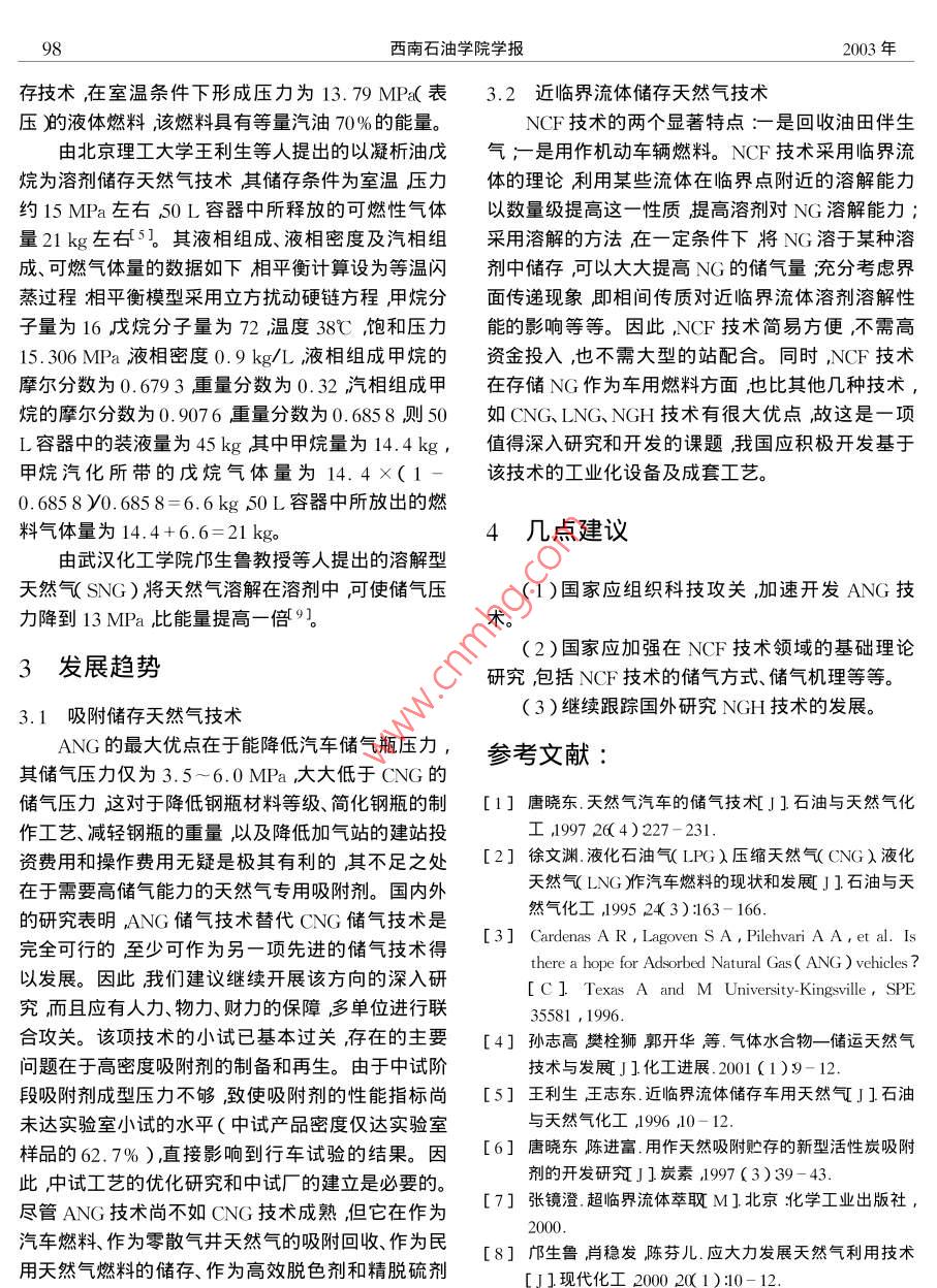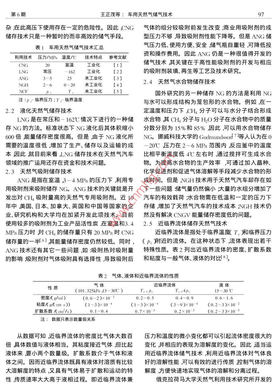 第25卷第6期西南石油學(xué)院學(xué)報(bào)2003年12月Journal of Southwest Petroleum InstituteDec 2003文章編號(hào):1000-2634200306-0096-03車用天然氣儲(chǔ)氣技術(shù)王正茂梁政楊志鐘功祥舒運(yùn)德(西南石油學(xué)院石油工程學(xué)院四川南充637001)摘要:天然氣用作汽車的代用燃料具有儲(chǔ)量豐富、價(jià)格便宜滓烷值髙、燃燒充分低硫、低氮、無(wú)灰、環(huán)境污染少等優(yōu)點(diǎn)。但是目前的壓縮天然氣儲(chǔ)氣技術(shù)存在儲(chǔ)氣壓力高、儲(chǔ)氣量小、續(xù)駛里程短等缺點(diǎn)嚴(yán)重制約著天然氣汽車應(yīng)用領(lǐng)域的擴(kuò)展。對(duì)5種車用天然氣儲(chǔ)氣技術(shù)進(jìn)行了分析討論后指出了吸附儲(chǔ)存和近臨界流體儲(chǔ)存天然氣技術(shù)在天然氣汽車領(lǐng)域?qū)⒂兄鴱V闊的應(yīng)用前景。關(guān)鍵詞:壓縮天然氣浦存天然氣汽車中圖分類號(hào):TE821文獻(xiàn)標(biāo)識(shí)碼:A隨著世界人口和汽車數(shù)量的迅猛增長(zhǎng),全球石于儲(chǔ)氣量受溫度影響較為嚴(yán)重因而充氣速度受到油資源日益緊缺油料供需矛盾更加突岀汽車尾氣限制。(2)CNG汽車?yán)m(xù)駛里程短主要用于城市及污染已經(jīng)對(duì)人類生存環(huán)境和經(jīng)濟(jì)發(fā)展造成了嚴(yán)重破市郊公共汽車和岀租車而對(duì)于長(zhǎng)途客車及載重貨壞。因此世界各國(guó)都在積極開發(fā)新能源尋找汽車車等皆因行駛距離遠(yuǎn)、CNG加氣站有限、充裝時(shí)間的代用燃料。天然氣NG用做汽車的代用燃料具長(zhǎng)等原因仍采用汽、柴油燃料。對(duì)于各類固定式及有儲(chǔ)量豐富、價(jià)格便宜庠烷值髙、燃燒充分忯硫、移動(dòng)式大型工程動(dòng)力杋械則主要以柴油為燃料這低氮、無(wú)灰環(huán)境污染少等優(yōu)點(diǎn)。預(yù)計(jì)在本世紀(jì)以天些杋械盡管多用在非城市地區(qū)但燃料耗用量及污然氣為動(dòng)力的汽車必將飛速發(fā)展而天然氣汽車染都極大。(3)壓縮天然氣汽車(CNGV)的啟動(dòng)性N(Ⅳ肢術(shù)的發(fā)展在很大程度上依賴于車用天然能和動(dòng)力性能較差等。氣儲(chǔ)氣技術(shù)的發(fā)展因此開發(fā)高效的車用天然氣儲(chǔ)研究車用天然氣儲(chǔ)氣技術(shù)解決CNGV所面臨氣技術(shù)就顯得十分重要。的主要問(wèn)題使天然氣汽車的儲(chǔ)氣量增加安全性更好續(xù)駛里程更長(zhǎng)是有必要的。1研究的意義開發(fā)應(yīng)用現(xiàn)狀天然氣的主要成分是甲烷在常溫常壓下甲烷是一種物理和化學(xué)性能都非常穩(wěn)定的小分子,密度目前車用天然氣儲(chǔ)氣技術(shù)主要分為壓縮儲(chǔ)存小不易壓縮、液化,幾乎不與任何溶劑互溶等等。(CNG液化儲(chǔ)有(LNG)吸附儲(chǔ)存(ANG)天然氣因此如何經(jīng)濟(jì)高效的儲(chǔ)存天然氣一直是一個(gè)十分水合物儲(chǔ)存(NGH)和近臨界流體儲(chǔ)存(NCF)五大棘手的問(wèn)題到目前為止仍然沒有一種比較行之有類見表1。效的儲(chǔ)氣手段。而天然氣汽車的發(fā)展在很大程度上2.1壓縮天然氣儲(chǔ)存技術(shù)依賴于天然氣儲(chǔ)存技術(shù)的發(fā)展,目前壓縮天然氣在儲(chǔ)氣技術(shù)中CNG儲(chǔ)存技術(shù)比較成熟,現(xiàn)已(CNG潴儲(chǔ)氣技術(shù)仍然是天然氣汽車的主要儲(chǔ)氣方經(jīng)實(shí)現(xiàn)工業(yè)化廣泛運(yùn)用于天然氣汽車。存在的不式但是卻存在以下幾方面的問(wèn)題足是緒儲(chǔ)氣量小續(xù)駛里程短;氣體燃料的能量密度1)儲(chǔ)氣壓力高,CNG氣瓶自重太大,儲(chǔ)氣量低啟動(dòng)性能和動(dòng)力性能較差;需要高壓壓縮(20~小現(xiàn)有(NG加氣站儲(chǔ)氣系統(tǒng)的壓力多在25MPa,25MPa)這就需要用昂貴的多級(jí)壓縮機(jī)要求使用而CNG汽車的充氣壓力多控制在20MPa以內(nèi)。由的高壓貯存容器為無(wú)縫容器壁厚體重制造工藝復(fù)第6期王正茂等:車用天然氣儲(chǔ)氣技術(shù)雜在此高壓下使用存在一定的危險(xiǎn)性。因此CNG氣體的組分較吸附前發(fā)生改變;商業(yè)用吸附劑的成儲(chǔ)存技術(shù)只是一種暫時(shí)的而非高效的儲(chǔ)氣手段。型壓力不夠?qū)е挛絼┬阅芟陆档?。但是ANG儲(chǔ)表1車用天然氣儲(chǔ)氣技術(shù)匯總氣壓力低、使用方便、安全儲(chǔ)氣瓶自重輕可降低投資和操作費(fèi)用。因此ANG仍是一種很值得開發(fā)的利用技術(shù)壓力/MPa溫度/℃技術(shù)特點(diǎn)參考文獻(xiàn)工業(yè)化儲(chǔ)氣技術(shù)其關(guān)鍵在于高性能吸附劑的開發(fā)與相應(yīng)an常壓工業(yè)化[2]的吸附劑裝填、再生等工藝及技術(shù)研究。3-5未工業(yè)化[3]NGH未工業(yè)化2.4天然氣水合物儲(chǔ)存技術(shù)未工業(yè)化[5]國(guó)外研究的另一種儲(chǔ)存NG的方法是利用NG注:p。臨界壓力;T一臨界溫度與水可以形成結(jié)構(gòu)為籠包形的水合物。例如在2.2液化天然氣儲(chǔ)存技術(shù)定溫度和壓力下H4分子可以與水分子結(jié)合形成LNG是在常壓和-16℃情況下進(jìn)行的一種儲(chǔ)水合物其CH4分子與H2O分子在水合物中的質(zhì)量存NG的方法。標(biāo)準(zhǔn)狀態(tài)下NG液化后其體積縮小分?jǐn)?shù)分別為15%和85%因此可以用水合物儲(chǔ)存600倍能量?jī)?chǔ)存密度很高。但是由于NG液化所NG挪威科技大學(xué)的 Gudmundsso7等人認(rèn)為在0需要的溫度很低,增加了生產(chǎn)、儲(chǔ)存以及