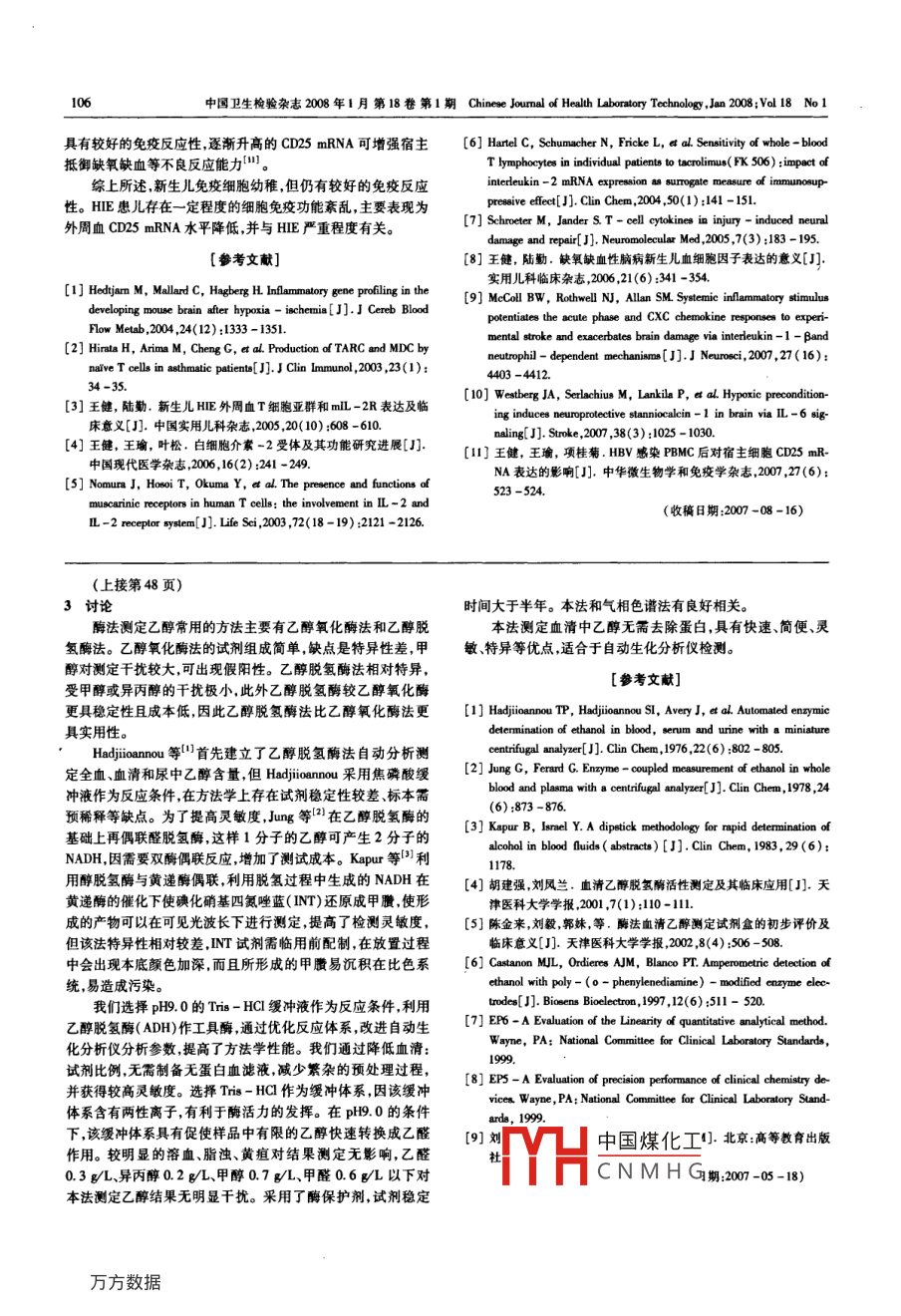 中國(guó)衛(wèi)生檢驗(yàn)雜志2008年1月第18卷第1期 Chinese Joumal of Health Laboratory Technology,Jan2008;l18No1【論著】改良乙醇脫氫酶法測(cè)定血清中微量乙醇胡云良2,王慧燕1,張立2,李艷霞3,王友沛,王賢理(1.溫州醫(yī)學(xué)院附屬第二醫(yī)院檢驗(yàn)科浙江溫州325027;2.溫州醫(yī)學(xué)院檢驗(yàn)醫(yī)學(xué)院浙江溫州3250353.溫州醫(yī)學(xué)院藥學(xué)院浙江溫州325035;4.浙江省蒼南縣人民醫(yī)院浙江蒼南3258005.溫州伊利康生物技術(shù)有限公司,浙江溫州325011)[摘要]目的建立一個(gè)簡(jiǎn)便靈敏特異試劑穩(wěn)定的乙醇脫氫酶法檢測(cè)血清中微量乙醇濃度。方法選擇Tis-HC緩沖液作為乙醇脫氫酶法測(cè)定乙醇的反應(yīng)條件通過優(yōu)化反應(yīng)體系及自動(dòng)生化分析儀分析參數(shù)采用兩點(diǎn)終點(diǎn)法對(duì)乙醇進(jìn)行檢測(cè)并評(píng)價(jià)了方法學(xué)性能。結(jié)果乙醇脫氫酶(ADH)最適用量為1.2g/L,氧化型輔酶I(NAD·)最適濃度為9g/L。線性范圍可達(dá)1200mg/L,批內(nèi)變異系數(shù)(CV)小于28%,批間變異系數(shù)(Cv)小于3.9%,平均回收率為9.8%。本法(Y與氣相色譜法(X)比較,具有良好的相關(guān)性,Y=0.993x-9.76,r=0.998。膽紅素159.1umoL、甘油三酯7.4mmo/L、血紅蛋白11.6g/L、乙醛0.3g/L、異丙醇0.2g/L、甲醇0.7g/L、甲醛0.6g/L以下對(duì)本法測(cè)定乙醇結(jié)果無明顯干擾。結(jié)論:本法測(cè)定血清中乙醇無需除蛋白,具有快速、簡(jiǎn)便、靈敏特異等優(yōu)點(diǎn)適合于自動(dòng)生化分析儀檢測(cè)。[關(guān)鍵詞]乙醇;乙醇脫氫酶法;兩點(diǎn)終點(diǎn)法;自動(dòng)生化分析[中圖分類號(hào)]R446.1文獻(xiàn)標(biāo)識(shí)碼]B[文章編號(hào)]1004-8685(2008)01-0047-03An improved method for determination of a small quantity of alcohol in serum with thealcohol dehydrogenaseHu Yun-liang", Wang Hui- yan, Zhang Li, Li Yan-xia, Wang You-pei, Wang Xian-li(1. Department of Laboratory Medicine of the Second Affiliated Hospital, Wenzhou Medical College, Wenzhou 325027, China;2. School of Laboratory Medicine, Wenzhou Medical College, Wenzhou 325027, China; 3. School of Pharmacy, Wenzhou MedicalCollege, Wenzhou 325027, China; 4. The People's Hospital of Cangnan, Cangnan 325800, China; 5. Yilikang BiotechnologyCo Ltd, Wenzhou 325011, China)Abstract] Objective: To establish a simple, sensitive, specific method of determination of alcohol in serum with stable rea-gents by catalysis of alcohol dehydrogenase. Methods: Tris-HCI buffer was used in this study. In the condition of alkalescencealcohol dehydrogenase(ADH)catalyzed the substance of alcohol to acetaldehyde, with the simultaneous production of deoxidizednicotinamide adenine dinucleotide(NADH). To analyze alcohol by two point end assay after optimizing reaction system and assayparameter of automatic analyzer. Results: The most adaptive quantity of ADH was 1. 2 g/L, and the best concentration of theNAD.*was g/L The linearity was up to 1200 mg/L The within run CV was lower than 2. 8% and the between run CV was lowerthan3.9%.Theaveragerecoverywas99.8%.comparingthismethod(y)withgaschromatography(x),theregressionequationwas obtained, Y=0.993X-9.76, r=0.998. The assays showed no interference from as much as 159. 1 umoV/L of bilirubin7.4 mmol/L of triglyceride, 11.6 g/L of hemoglobin, 0. 3 g/L of acetaldehyde, 0. 2 g/L of isopropanol, 0.7 g/L of methanoland 0.6 g/L of maldehyde. Conclusion: The method established for determining alcohol in serum is a rapid, simple, sensitive, spe-without being deproteinized. It is suiKey words] Alcohol; Alcohol dehydrogenase Two point end assay; Automatic analysis體液中乙醇含量測(cè)定是酒精中毒的重要判斷依據(jù),通過量衰竭技術(shù)及氣相色譜法等。其中氣相色譜法是測(cè)定乙醇的對(duì)攝入酒精后血中乙醇含量的測(cè)定,可方便迅速地監(jiān)測(cè)和研參考方法,具有較高的靈敏度與特異性,但設(shè)備昂貴操作復(fù)究乙醇在體內(nèi)的代謝過程,從而為預(yù)防和減輕酒精中毒的研雜而其它方法在穩(wěn)定性、靈敏度特異性等方面都存在不同究提供相應(yīng)的指標(biāo)和依據(jù)。測(cè)定乙醇的方法主要有化學(xué)比色程度的缺陷。我們對(duì)乙醇脫氫酶法測(cè)定乙醇進(jìn)行了方法學(xué)探法呼出氣乙醇分析、滲透壓測(cè)定法酶試劑分析法放射性能索通中國(guó)煤化工分析參數(shù)使其檢測(cè)乙醇有定程度的改善,現(xiàn)報(bào)[基金項(xiàng)目]溫州市科技局課題(C2002055道如CNMHG[作者簡(jiǎn)介]胡云良(1966-),男,碩士,副教授,主要從事臨床生化教學(xué)與醫(yī)院檢驗(yàn)科工作中國(guó)衛(wèi)生檢驗(yàn)雜志2008年1月第18卷第1期Chin" e Journal of Health Laboratory Technolog,Jan200g;val18N11材料與方法7170型自動(dòng)生化分析儀上測(cè)定,觀察反應(yīng)動(dòng)力學(xué),結(jié)果見圖1。1.1原理按 NCCLS EP-A文件作線性評(píng)價(jià)。在200-100mL范選用三(羥甲基)氨基甲烷-鹽酸(Tni-HC)緩沖液體圍內(nèi)稀釋變異