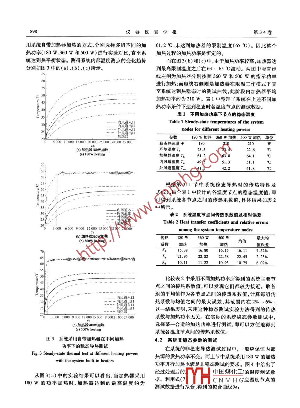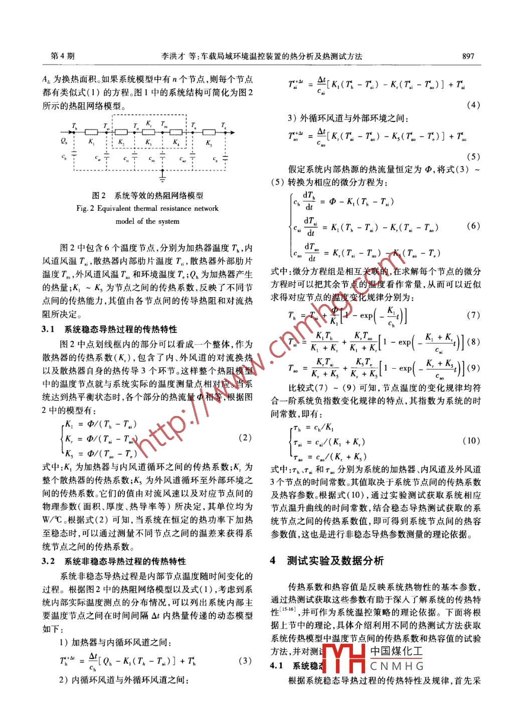 第34卷第4期儀器儀表學(xué)報Vol 34 No 42013年4月Chinese Journal of Scientific InstrumentApr.2013車載局域環(huán)境溫控裝置的熱分析及熱測試方法李洪才12,陳非凡,董永貴(1.清華大學(xué)精密測試技術(shù)及儀器國家重點實驗室北京100084;2.第二炮兵工程大學(xué)202教研室西安710025)摘要:針對車載局域環(huán)境溫控系統(tǒng)的個性化設(shè)計及評估調(diào)試問題,結(jié)合一種基于密閉風(fēng)冷換熱方式的車載局域溫控裝置的物理結(jié)構(gòu)及內(nèi)部溫度測點分布,對其傳熱過程進(jìn)行了分析,并建立了系統(tǒng)的熱阻網(wǎng)絡(luò)分析模型。推導(dǎo)了系統(tǒng)內(nèi)部溫度節(jié)點在穩(wěn)態(tài)導(dǎo)熱和非穩(wěn)態(tài)導(dǎo)熱情況下的變化規(guī)律。通過選擇不同的加熱功率及加熱方式對車載局域溫控裝置進(jìn)行實驗測試,結(jié)合推導(dǎo)出的變化規(guī)律對測試數(shù)據(jù)進(jìn)行擬合處理,獲得了系統(tǒng)溫度節(jié)點之間的傳熱系數(shù)及熱容參數(shù)。所測參數(shù)之間的相對誤差約在0.6%~6%,表明所建立的系統(tǒng)數(shù)學(xué)模型及測試方法可用于指導(dǎo)車載儀器溫控系統(tǒng)的設(shè)計及快速調(diào)試。關(guān)鍵詞:局域環(huán)境溫控系統(tǒng);車載儀器;密閉風(fēng)冷;熱分析;熱測試中圖分類號;TK311TM924.13文獻(xiàn)標(biāo)識碼:A國家標(biāo)準(zhǔn)學(xué)科分類代碼:460.40Thermal analysis and test methods for local environment temperaturecontrol in-vehicle apparatusLi Hongcai, Chen Feifan, Dong Yonggu(I. State Key Laboratory of Precision Measurement Technology and instruments, Tsinghua University, Beying 100084, China2. 202 Unit, The Second Artillery Engineering University, Xi'an 710025, China)Abstract: Aiming at the problem of individual design, evaluation and commissioning in local environment temperature con-trol in-vehicle system, and considering the physical structure and temperature sensor distribution of a sealed air coolingconstant temperature control in-vehicle apparatus, the heat transfer property of the apparatus was analyzed and the systemthermal resistance network model was established. The changing laws of the system temperature nodes were derived understeady-state and unsteady-state heat conductions. The local temperature control in-vehicle apparatus was tested when dif-ferent heating powers and heating styles were selected, the test data was fitted according to the derived laws, and the heattransfer coefficients and heat capacity parameters among the system temperature nodes were obtained. The relative errors ofthe measured parameters are about 0. 6% to 6%, which indicates that the established mathematical model and test methecan be used to guide the design and fast commissioning of the in-vehicle instrument temperature control systemKeywords: local environment temperature control system; in-vehicle instrument; sealed air cooling; thermal analysis; thermal test的移動性能、髙效的功能集成等突出優(yōu)點,尤其在執(zhí)行野1引言外測繪21、食品安全快速檢測以及特種車輛的自主導(dǎo)航定位等領(lǐng)域的任務(wù)中發(fā)揮著越來越重要的作用。安裝在車載移動平臺上的測量及檢測系統(tǒng)具有便捷可以很好地彌補實驗室及檢測中心地域固定的不足,并能夠執(zhí)行流Ha中國煤化工的應(yīng)急檢測等任收稿日期:2011406 Received Date:2011406CNMHG896儀器儀表學(xué)報第34卷務(wù)。將科學(xué)測量儀器從傳統(tǒng)的實驗室轉(zhuǎn)換到車載環(huán)境件下,系統(tǒng)根據(jù)測點溫度實現(xiàn)腔內(nèi)溫度的自動調(diào)節(jié),保證中,臨場測試環(huán)境中諸如振動溫度波動及粉塵等因素的整個系統(tǒng)工作在所需要的溫度范圍內(nèi)。影響不可忽視。因此,環(huán)境適應(yīng)能力的評估是這類儀器環(huán)境內(nèi)風(fēng)道入口內(nèi)風(fēng)扇研究開發(fā)過程中經(jīng)常遇到的問題。溫度T溫T散熱器外散熱器內(nèi)部肋片外風(fēng)道出口溫度是局域環(huán)境控制中最常見、也是最重要的控制部肋片熱傳導(dǎo)參數(shù)8”)。幾乎所有測量裝置都存在或多或少的溫度漂移問題,與其他環(huán)境影響因素相比,溫度也是最容易在車外腔體內(nèi)腔體載環(huán)境中實現(xiàn)恒定控制的參量。將測量儀器(如車載慣對流迫性測量元件、車載激光雷達(dá)等)安裝在能夠提供局域恒溫對流對流道出口環(huán)境的裝置中隔離溫度波動的影響,從而有效地將其他加熱器加熱器臨場環(huán)境因素的影響與溫度漂移問題解耦,解決車載儀外風(fēng)扇溫度T外風(fēng)道入口器現(xiàn)場測試數(shù)據(jù)中多因素混合的影響。例如振動等特定因素的影響導(dǎo)致難以準(zhǔn)確定位等問題4:0。對于那些圖1密閉風(fēng)冷局域環(huán)境溫控系統(tǒng)的物理時難以克服溫度漂移問題的測量系統(tǒng),局域環(huán)境溫控裝結(jié)構(gòu)及熱傳遞示意圖置則可以作為必要的配件,加速儀器車載化的研究進(jìn)程。Fig. 1 Physical structure and heat transfer schematic由于車載環(huán)境的特殊性,局域環(huán)境溫控系統(tǒng)一般需diagram of the sealed air cooling local environment要根據(jù)目標(biāo)儀器的特點進(jìn)行定制,并盡可能與測量儀器emperature control system融為一個有機整體。本文針對上述背景,結(jié)合車載條件下的特殊環(huán)境,設(shè)計了一種基于密閉風(fēng)冷的車載局域環(huán)為了便于實現(xiàn)系統(tǒng)內(nèi)部溫度的分布式測量以及數(shù)據(j