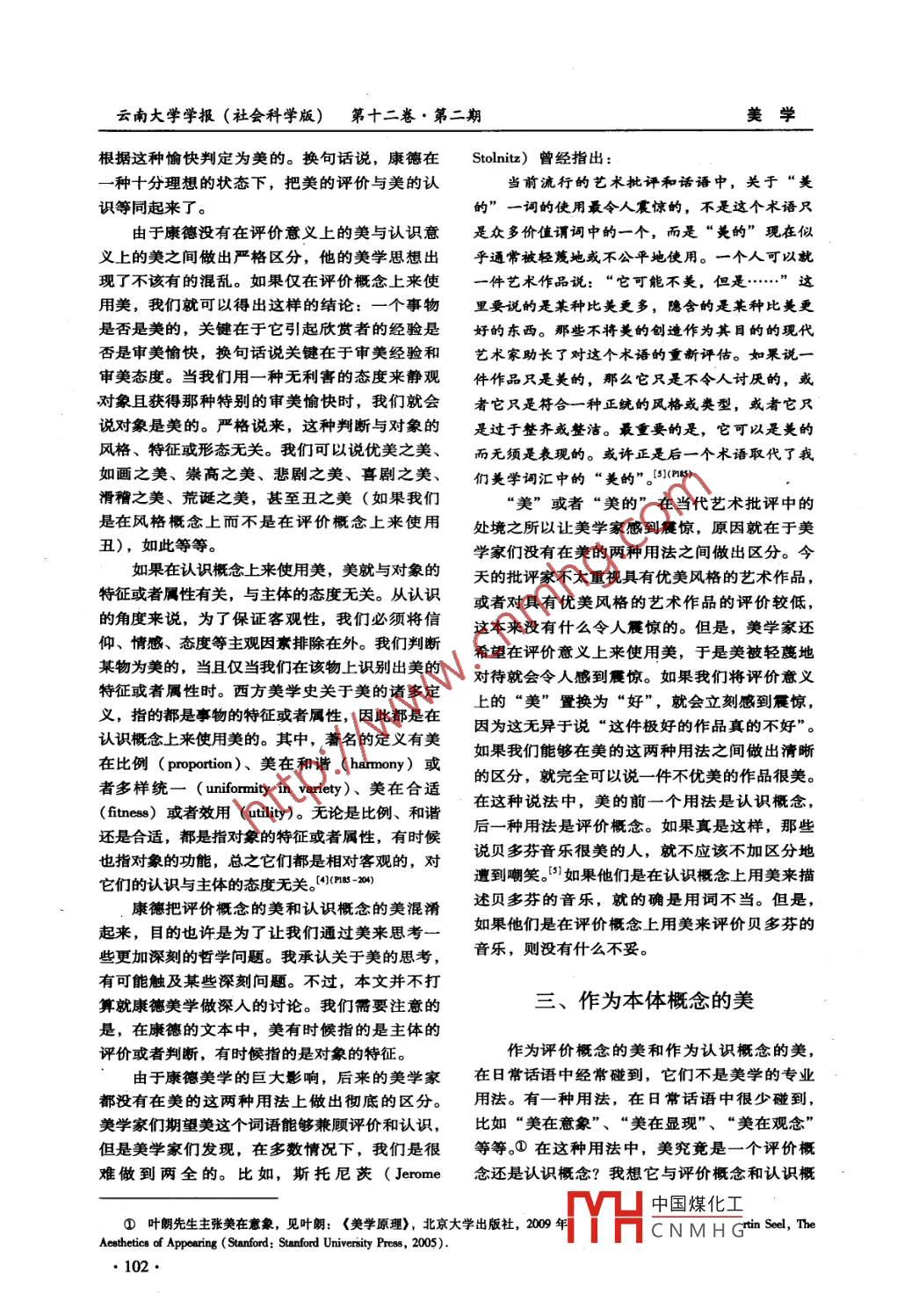 美的概念分析彭鋒[北京大學(xué),北京100871]關(guān)鍵詞:美;評(píng)價(jià);認(rèn)識(shí);本體摘要: 在美學(xué)的話語中,我們至少可以區(qū)分三種美的概念:作為評(píng)價(jià)概念的美、作為認(rèn)識(shí)概念的美和作為本體概念的美。美學(xué)領(lǐng)域中的許多問題,源于對(duì)這三種概念的混滑。本文力圖澄清這三種概念的含義,分析它們?cè)诿缹W(xué)理論中的表現(xiàn)以及造成混淆的某些可能,目的是避免因?yàn)楦拍铄e(cuò)位而導(dǎo)致的毫無意義的爭論。中圈分類號(hào): B83 -02文獻(xiàn)標(biāo)識(shí)碼: A文章編號(hào): 1671-7511 (2013) 02 -0100-06哲學(xué)常在概念領(lǐng)城工作,既可以創(chuàng)造概念,究。換句話說,我們可以像研究花的紅一樣去也可以分析概念。比如,在德勒茲( Gilles De-研究花的美。但是,這種常識(shí)看法卻是錯(cuò)誤的。leuze)看來,哲學(xué)與其說是追求真理,不如說我們不能像研究花的紅那樣去研究花的美,因是創(chuàng)造概念。然而,卡羅爾( Neol Caroll)則為紅指的是花的屬性,而美不是指花的屬性。直截了當(dāng)?shù)刂赋觯軐W(xué)只是分析概念。概念分為什么呢?維特根斯坦用- -種巧妙的方式,證析,成了今天哲學(xué)的代名詞。由于美學(xué)研究的明了花是紅的不同于花是美的:我們必須說紅是明白但卻混亂的感性認(rèn)識(shí),這有時(shí)候就會(huì)導(dǎo)才能表達(dá)花是紅的,但要表達(dá)花是美的我們可致它的概念相對(duì)不夠明確。因此,美學(xué)領(lǐng)城需以不必說美。我們可以說“美啊”,我們可以要?jiǎng)?chuàng)造概念,但更需要概念分析。清晰的概念說“啊”,我們甚至可以什么都不說,只是做分析,可以讓我們避免一-些無意義的爭論。在出一個(gè)愉快的表情?!鞍 ?或者- - 個(gè)愉快的表美學(xué)領(lǐng)域中,美就是-一個(gè)充滿歧義的概念,關(guān),情可以表達(dá)花的美, 但不能表達(dá)花的紅,由此于美的爭論從來就沒有停止過。讓我們從美的可見美與紅是非常不同的,紅是表達(dá)花的屬性概念分析入手,來看一看關(guān)于美的哪些爭論是的形容詞,美是表達(dá)主觀感受的感嘆詞。102)可以避免的。維特根斯坦的分析足夠敏銳和精確,但他涉及的只是美這個(gè)概念的一種用法,即作為評(píng)一、 作為評(píng)價(jià)概念的美價(jià)概念的美。我們根據(jù)自已的主觀感受來評(píng)價(jià)對(duì)象,我們愉快時(shí)說對(duì)象是美的,不愉快時(shí)說維特根斯坦( Ludwig Wittgenstein) 曾經(jīng)敏對(duì)象是丑的。 這種意義上的“美的”就如同銳地發(fā)現(xiàn),美與紅這兩個(gè)詞語,表面上看起來“好的”-樣。-致,其實(shí)非常不同。人們通常認(rèn)為,“花是美在美學(xué)史上,我們會(huì)經(jīng)常碰到作為評(píng)價(jià)概的”與“花是紅的”這兩個(gè)句子相似,在這兩念的美。比如,柏拉圖在對(duì)話錄《大希匹阿斯個(gè)句子中的美與紅的詞性也相似,即它們都是篇》中關(guān)于美的探討,其中的美就是這種評(píng)價(jià)形容詞,都是對(duì)花的特性的描述,由此,我們意義上的美,它包括美和善兩種含義在內(nèi),也可以將美與紅視為花的屬性,對(duì)它們做客觀研許用好來表達(dá)更為合適?!洞笙Fグ⑺蛊分兄袊夯な崭迦掌? 2012-01 -09作者簡介:彭鋒,男,哲學(xué)博士,北京大學(xué)藝術(shù)學(xué)院教授,博士研究生導(dǎo)師。MHCNMH G●100.美學(xué)美的概念分析關(guān)于美的探討沒有結(jié)論,其中-一個(gè)原因也許是,而在于主體的愉快感受。由此,我們可以看到對(duì)話雙方?jīng)]有將評(píng)價(jià)概念與認(rèn)識(shí)概念區(qū)別開來,一種有點(diǎn)奇怪的用法,比如“如畫之犯了將紅與美混淆起來的錯(cuò)誤。如果將美作為美"。53](K2-2)如畫( picturesque)本來是一種風(fēng)-一個(gè)評(píng)價(jià)概念,要從對(duì)象.上去尋找它的普遍性格,與優(yōu)美(beauty) 和崇高(eublime) 并列。就的確有些困難。俗話說,“蘿卜白菜,各有所18世紀(jì)英國美學(xué)家將如畫的特征確立為介于優(yōu)愛。”人們會(huì)根據(jù)自己不同的目的,對(duì)不同的對(duì)美與崇高之間:優(yōu)美的特征是光滑,如畫的特象做出美的評(píng)價(jià)。或者,人們會(huì)根據(jù)自已不同征是粗獷,祟高的特征是浩瀚。在如畫之美、的趣味,對(duì)不同的對(duì)象做出美的評(píng)價(jià),于是有崇高之美的用法中,美不是與如畫和崇高并列“談到趣味無爭辯”的說法。的一種風(fēng)格,而是--種評(píng)價(jià)。如果可以說如畫但是,康德(Immanuel Kant)卻發(fā)現(xiàn)了另之美、崇高之美的話,也就可以說優(yōu)美之美了。外- -種美的評(píng)價(jià)或者判斷方式。在康德看來,優(yōu)美之美其實(shí)就是美之美,因?yàn)閮?yōu)美和美是同不是任何判斷都稱得上美的判斷或者審美判斷。一個(gè)詞語,只不過為了照顧漢語講究詞語對(duì)稱有一種判斷是依據(jù)概念的判斷,可以稱之為認(rèn)的用法,我們把與崇高和如畫并列的美翻譯為識(shí)判斷。有一種判斷是依據(jù)目的的判斷,如果優(yōu)美。在優(yōu)美之美這種說法中,前- -個(gè)美指的是主觀小我的目的,可以稱之為功利判斷,如是風(fēng)格,后一個(gè)美指的是評(píng)價(jià)。果是全體大我的目的,可以稱之為道德判斷。它們都不是美的判斷,我們都不會(huì)把在這些