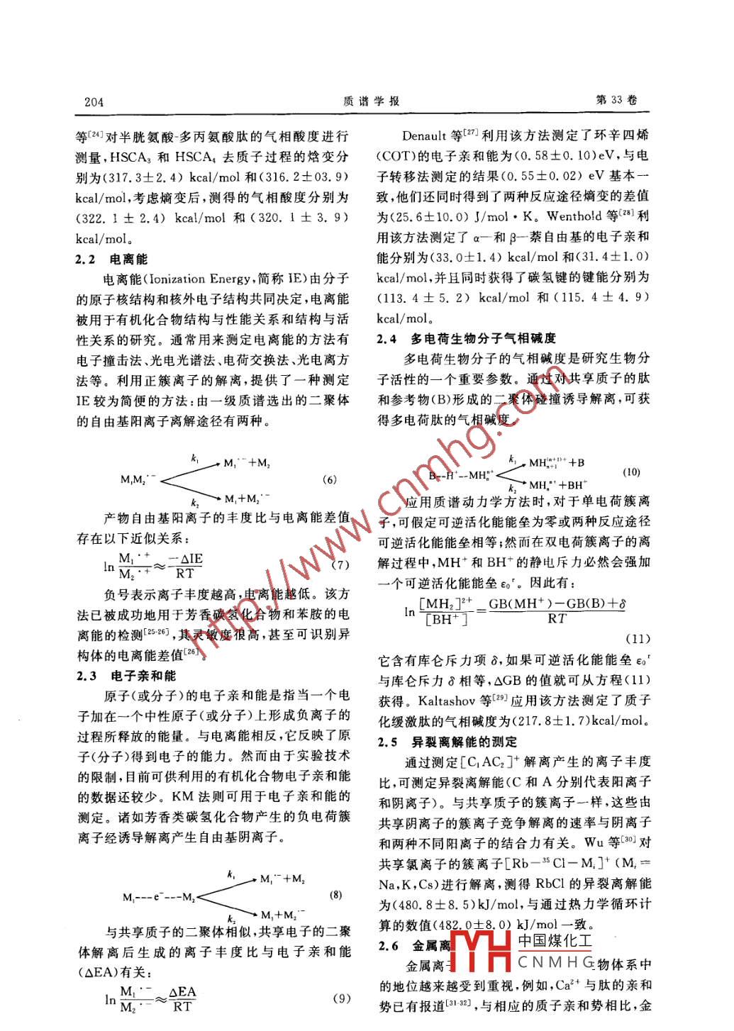 第33卷第4期質(zhì)譜學(xué)報Vol 33 No 42012年7月Journal of Chinese Mass Spectrometry SocietyJul.2012質(zhì)譜動力學(xué)方法原理及應(yīng)用李明,李紅梅,熊行創(chuàng),江游,黃澤建,方向(中國計量科學(xué)研究院,北京100013)摘要:質(zhì)譜動力學(xué)方法( Kinetic Method,簡稱KM法)是種基于經(jīng)質(zhì)量選擇的簇離子竟?fàn)幗怆x反應(yīng)速率的不同對熱力學(xué)數(shù)據(jù)進行測定的方法,由于采用串聯(lián)質(zhì)譜技術(shù),分析樣品無需純化,具有簡便、快速、靈敏等優(yōu)點。目前該方法已應(yīng)用于氣相酸堿度和質(zhì)子親合勢的測定、電子親和能的測定、電離能的測定、多電荷生物分子氣相堿度的測定、金屬離子與生物分子親和力的測定異裂離解能的測定離子結(jié)構(gòu)的檢測及對手性化合物對映體過量的測定等。本工作在介紹質(zhì)譜動力學(xué)方法原理的同時,列舉了其應(yīng)用實例,詳細(xì)地對質(zhì)譜動力學(xué)方法進行了綜合述評關(guān)鍵詞:動力學(xué)方法;簇離子;串聯(lián)質(zhì)譜;熱力學(xué)中圖分類號:O657.63文獻標(biāo)識碼:A文章編號:1004-2997(2012)04-0202-0Theory and Application of Mass Spectrometric Kinetic MethodLI Ming, LI Hong-mei, XIONG Xing-chuang, JIANG You, HUANG Ze- jian, FANG XiangNational Institute of Metrology, Beijing 100013, China)Abstract: The mass spectrometric kinetic method based on the competitive dissociations ofmass-selected cluster ions has been increasingly applied to thermochemical determinationmainly due to its simplicity, speediness and sensitivity. Because the kinetic method employstandem mass spectrometry, the compounds of interest need not be available in pure formThe kinetic method has been used to estimate gas-phase acidity and basicity and proton affinity, electron affinity, ionization energy, gas-phase basicities of multiply-charged biomolecules, metal ion affinities, heterolytic bond dissociation energies, chiral recognition andquantification. In this paper the theory of kinetic method is introduced in detail and its ap-lications are enumeratedKey words: kinetic method; cluster ion; tandem mass spectrometry thermochemistry1質(zhì)譜動力學(xué)方法的原理及發(fā)展從同一復(fù)合物碎裂得到兩個碎片的過程中,基于在質(zhì)譜學(xué)中,很早就發(fā)現(xiàn)在熱力學(xué)控制下活電離能的不同,碎裂時兩個碎片會爭奪電荷1化離子有競爭碎裂行為, Stevenson規(guī)則認(rèn)為Cooks等進行質(zhì)量分析離子動能譜( Mass ana收稿日期:201204-18;修回日期:2012-06-04基金項目:科技部儀器專項(2011YQ09000507)、中國計量科學(xué)研究院業(yè)務(wù)費(21-JB1251)資助作者簡介:李明(1979~),男(漢),吉林人,博土,從事質(zhì)譜學(xué)研究。 E-mail:中國煤化工通信作者:方向(1963~),男(漢),研究員,主要從事質(zhì)譜儀器研發(fā)工作。EmaCNMHG第4期李明等:質(zhì)譜動力學(xué)方法原理及應(yīng)用203lyzed Ion Kinetic Energy Spectrum, MIKE)Ag方程4兩邊同除以T得到方程5:研究中發(fā)現(xiàn),共享質(zhì)子的氨基酸二聚體經(jīng)質(zhì)量選△G/T=△ Hunk/Tm-△(△s)(5)擇后進行亞穩(wěn)離子解離,產(chǎn)物離子的豐度比與單以ln( k unknown/k)對△Ha作圖,曲線斜率為體的性質(zhì)有關(guān)2。在這一實驗結(jié)果的推動下,發(fā)1/(RTm)。采用不同的能量進行碰撞誘導(dǎo)解展了可獲得相對熱力學(xué)信息的定量方法一質(zhì)離,可得到不同的T,同時△G2可通過方程譜動力學(xué)方法。該方法研究的是簇離子的兩個(3)的曲線在橫軸上的截距求得。通過△G1競爭解離反應(yīng):T對1/T的作圖得到方程(5)所對應(yīng)的曲線斜率為待測物解離的焓變,在y軸上的截距為kB H +B競爭解離反應(yīng)熵變的差值。B1--H-B2BH+B2動力學(xué)方法的應(yīng)用其中k1、k2分別為兩種反應(yīng)途徑的反應(yīng)速KM法最大的優(yōu)點是具有很高的靈敏度,甚率常數(shù),忽略碎裂過程的嫡變,簇離子碎裂反應(yīng)至可以檢測到由同位素取代引起的熱力學(xué)性質(zhì)的速率與兩種反應(yīng)途徑的焓變的差值相關(guān),產(chǎn)物的細(xì)微變化。 Cooks等利用KM法對氘代乙腈豐度比的自然對數(shù)與相關(guān)熱力學(xué)值的差值成線的質(zhì)子親和勢測量結(jié)果為(18.3±1.2)kcal/性關(guān)系:mol,而乙腈的質(zhì)子親和勢為(188.2±1.2)kcal/n(k1/k2)=ln([B1H]+/[B2H]+)≈moln;另外,由于采用了串聯(lián)質(zhì)譜技術(shù),待測物ln(Q:‘/Q2)+△eoRT無需純化,同時具有快速、操作簡單等優(yōu)點,因此≈△(△G)/RT≈△(△H)/RT(2)被廣泛應(yīng)用于熱力學(xué)參數(shù)和化合物結(jié)構(gòu)的測定,這里,Q和Q2指兩種解離途徑不同過渡并且越來越多地應(yīng)用于生物分子熱力學(xué)性質(zhì)的態(tài)的配分函數(shù),△e為反應(yīng)活化能的差值,R為研究理想氣體常數(shù),Tm為有效溫度(在KM法中與2,1氣相酸堿度和質(zhì)子親和勢的測定簇離子平均內(nèi)能相關(guān)的一個參數(shù),活化簇離子的分子的氣相堿度和質(zhì)子親和勢是氣相離子內(nèi)能隨碰撞能量或碰撞氣體的壓力改變,T也化學(xué)反應(yīng)中的兩個重要參數(shù),它們直接給出分子隨之改變)Brostead酸堿性,還能提供其結(jié)構(gòu)以及活性的信質(zhì)譜動力學(xué)方法最初采用近似的形式,尤息;另外,分子氣相堿度是分子本身固有的堿度,其是關(guān)于內(nèi)能的分布(波爾茲曼分布)和忽略熵可用來闡明液相堿度順序的起因。因此研究分變的假定。方程(2)的