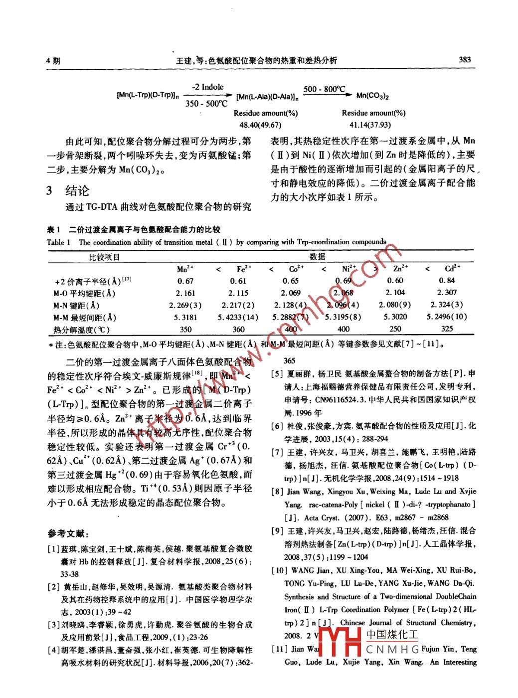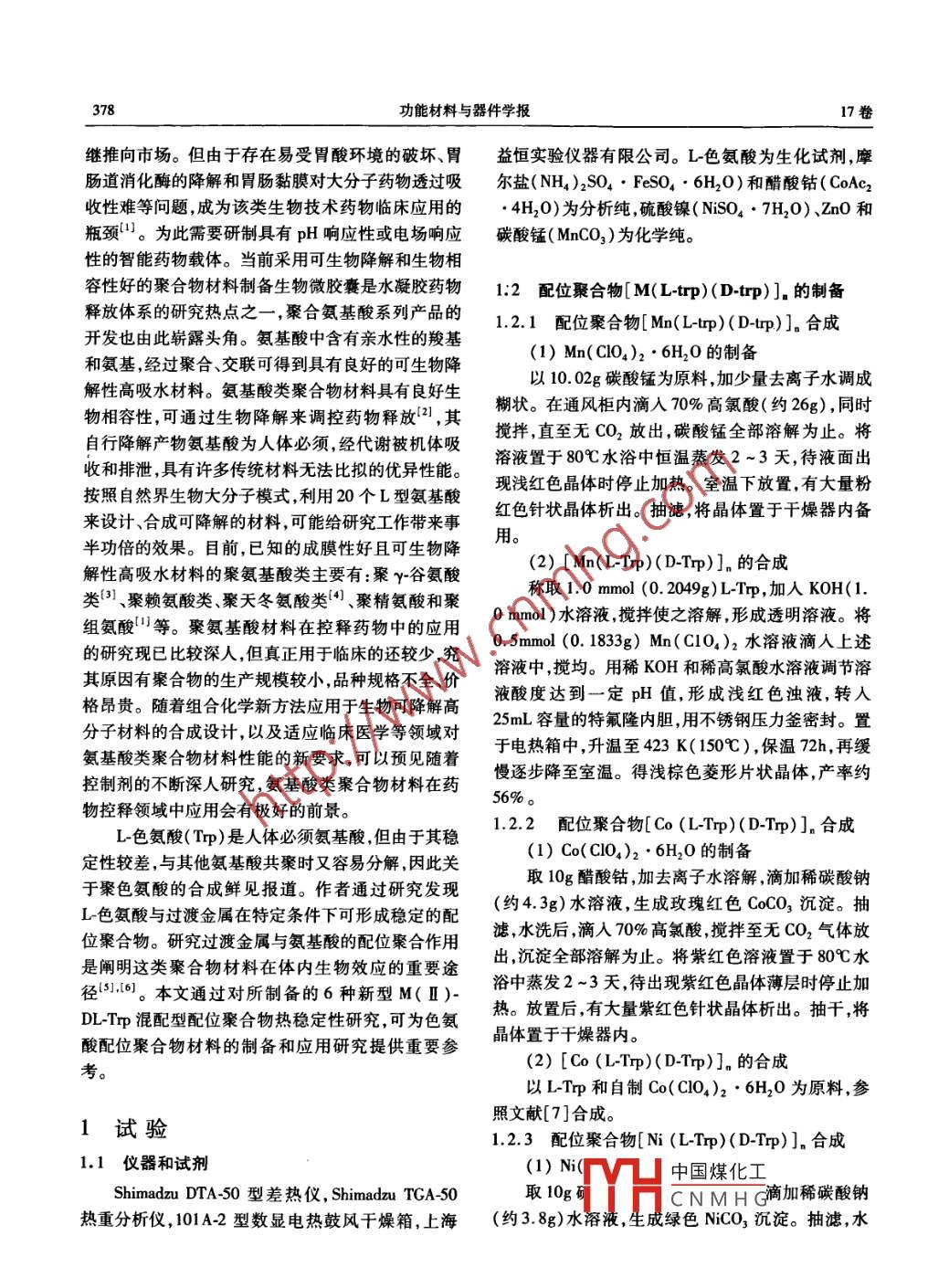 第17卷第4期功能材料與器件學(xué)報(bào)Vol. 17. No 42011年8月JOURNAL OF FUNCTIONAL MATERIALS AND DEVICESAug.,2011文章編號(hào):1007-4252(2011)04-0377-08色氨酸配位聚合物的熱重和差熱分析王建!,馬衛(wèi)興,劉瑋煒,唐麗娟2,陳龍1,李超1.淮海工學(xué)院化工學(xué)院,江蘇連云港22005;2.中國(guó)礦業(yè)大學(xué)化工學(xué)院,江蘇徐州2215)摘要:氨基酸類聚合物材料具有良好的生物相容性,可通過(guò)生物降解來(lái)調(diào)控藥物釋放。研究其性質(zhì)可為色氨酸配位聚合物材料的制備和應(yīng)用提供重要參考。對(duì)L色氨酸和鐵(Ⅱ)、鈷(Ⅱ)、鎳(Ⅱ)、鋅(Ⅱ)、鎘(Ⅱ)、錳(Ⅱ)等過(guò)渡金屬離子制備的6種M(Ⅱ)-DLTp混配型色氨酸配位聚合物進(jìn)行了熱穩(wěn)定性研究。其熱穩(wěn)定性次序符合埃文-威廉斯( Irving- Williams)規(guī)律,且這些配位聚合物中二價(jià)金屬離子半徑均≥0.6。關(guān)鍵詞:色氨酸;過(guò)渡金屬;配位聚合物;熱重分析;差熱分析中圖分類號(hào):063;TQ31;TQ46文獻(xiàn)標(biāo)識(shí)碼:ATG and dta Analysis of Tryptophan Coordination PolymersWANG Jian, MA Wei-xing, LIU Wei-wei, TANG Li-juan, CHEN Long,LI Chao(1. School of Chemical Engineering, Huaihai Institute of Technology, Lianyungang 222005, China;2. School of Chemical Engineering, China University Of Mining And Technology, Xuzhou 221116, China)Abstract: On the basis of L- Trp ligand, a series of Fe(Ⅱ),Co(Ⅱ),Ni(Ⅱ),zn(Ⅱ),Cd(Ⅱ)andMn(I)M(I)-( DL-Trp) coordination polymers were synthesized by a hydrothermal or solvent-ther-mal or mixed solvent-thermal method. The thermal stability of these coordination polymers was investigated by the thermogravimetric and differential thermal analysis. The results show that the thermal stabilityof these polymers accords with Irving-Williams law. The radiuses of these divalent metal ions in polymersare less than 0.6Key words: tryptophan; transition metals; coordination polymer; thermogravimetric analysis; differential0引言吸收醫(yī)用高分子材料為例,目前歐美國(guó)家在該領(lǐng)域?yàn)榱私鉀Q傳統(tǒng)高分子材料造成的“白色污染增長(zhǎng)迅速,年產(chǎn)值已突破500億美元。近年來(lái)基因問(wèn)題人們研制了各種可降解材料。以體內(nèi)可降解組學(xué)和蛋白組學(xué)的發(fā)展大量的蛋白、多肽類藥物相收稿日期:2010-09-20;修訂日期:2011-02-18基金項(xiàng)目:基金項(xiàng)目:江蘇省教育廳自然科學(xué)基金資助項(xiàng)目(08KJB15000);江蘇省“六大人才高峰項(xiàng)目(07-A04);江蘇省海洋生物技術(shù)重點(diǎn)建設(shè)實(shí)驗(yàn)室開(kāi)放基金項(xiàng)目(2010HS07);江蘇省海洋資源開(kāi)發(fā)中國(guó)煤化工 SIMRIOE2);淮海工學(xué)院博士科研啟動(dòng)項(xiàng)目(KQ09006)和自然科學(xué)課題(22009018)CNMHG作者簡(jiǎn)介:王建(1962),男,江蘇準(zhǔn)安人,教授博土,從事功能材料和表界面電分祈研究,Ema:wjsxhwhp@yaho.cn378功能材料與器件學(xué)報(bào)l7卷繼推向市場(chǎng)。但由于存在易受胃酸環(huán)境的破壞、胃益恒實(shí)驗(yàn)儀器有限公司。L色氨酸為生化試劑,摩腸道消化酶的降解和胃腸黏膜對(duì)大分子藥物透過(guò)吸爾鹽(NH4)2SO4·FeSO4·6H2O)和醋酸鈷(CoAc2收性難等問(wèn)題,成為該類生物技術(shù)藥物臨床應(yīng)用的4H2O)為分析純硫酸鎳(NSO4·7H2O)、ZnO和瓶頸。為此需要研制具有pH響應(yīng)性或電場(chǎng)響應(yīng)碳酸錳(MnCO3)為化學(xué)純。性的智能藥物載體。當(dāng)前采用可生物降解和生物相容性好的聚合物材料制備生物微膠囊是水凝膠藥物1:2配位聚合物[M(Ltrp)(Dtp)]的制備釋放體系的研究熱點(diǎn)之一,聚合氨基酸系列產(chǎn)品的1.2.1配位聚合物[Mn(L)(Dp)]。合成開(kāi)發(fā)也由此嶄露頭角。氨基酸中含有親水性的羧基和氨基,經(jīng)過(guò)聚合、交聯(lián)可得到具有良好的可生物降(1)Mn(ClO4)2·6H2O的制備解性高吸水材料。氨基酸類聚合物材料具有良好生以10.02g碳酸錳為原料,加少量去離子水調(diào)成物相容性,可通過(guò)生物降解來(lái)調(diào)控藥物釋放1,其糊狀。在通風(fēng)柜內(nèi)滴入70%高氯酸(約26g),同時(shí)自行降解產(chǎn)物氨基酸為人體必須,經(jīng)代謝被機(jī)體吸攪拌,直至無(wú)CO2放出,碳酸錳全部溶解為止。將收和排泄,具有許多傳統(tǒng)材料無(wú)法比擬的優(yōu)異性能。溶液置于80℃水浴中恒溫蒸發(fā)2~3天,待液面出按照自然界生物大分子模式,利用20個(gè)L型氨基酸現(xiàn)淺紅色晶體時(shí)停止加熱。室溫下放置,有大量粉來(lái)設(shè)計(jì)、合成可降解的材料,可能給研究工作帶來(lái)事紅色針狀晶體析出。抽濾,將晶體置于干燥器內(nèi)備半功倍的效果。目前,已知的成膜性好且可生物降解性高吸水材料的聚氨基酸類主要有:聚γ谷氨酸(2)[Mn(LTp)(D-T)],的合成類、聚賴氨酸類、聚天冬氨酸類4、聚精氨酸和聚稱取10mmol(0.2049g)LTrp,加入KOH(1組氨酸等。聚氨基酸材料在控釋藥物中的應(yīng)用0mmol)水溶液攪拌使之溶解,形成透明溶液。將的研究現(xiàn)已比較深人,但真正用于臨床的還較少究0.5mmol(0.1833)Mn(Cl04)2水溶液滴入上述其原因有聚合物的生產(chǎn)規(guī)模較小,品種規(guī)格不全價(jià)溶液中攪均。用稀KOH和稀高氯酸水溶液調(diào)節(jié)溶格昂貴。隨著組合化學(xué)新方法應(yīng)用于生物可降解高液酸度達(dá)到一定pH值,形成淺紅色濁液,轉(zhuǎn)入分子材料的合成設(shè)計(jì),以及適應(yīng)臨床醫(yī)學(xué)等
