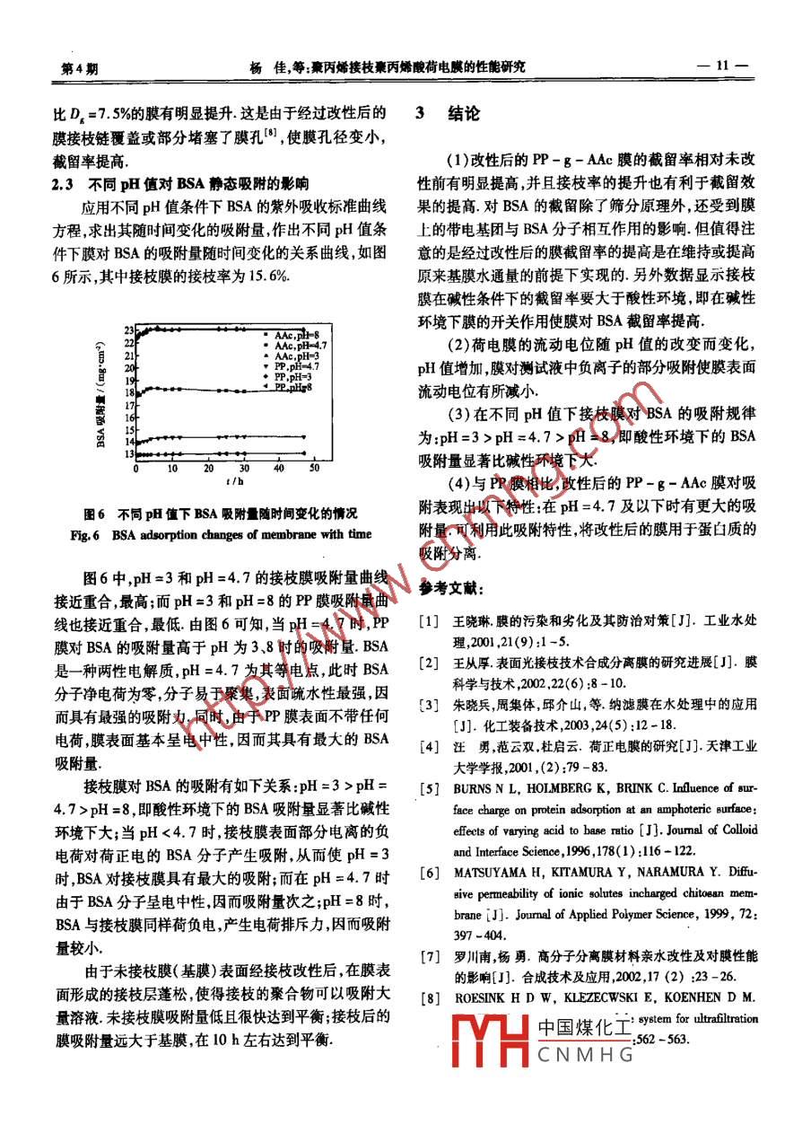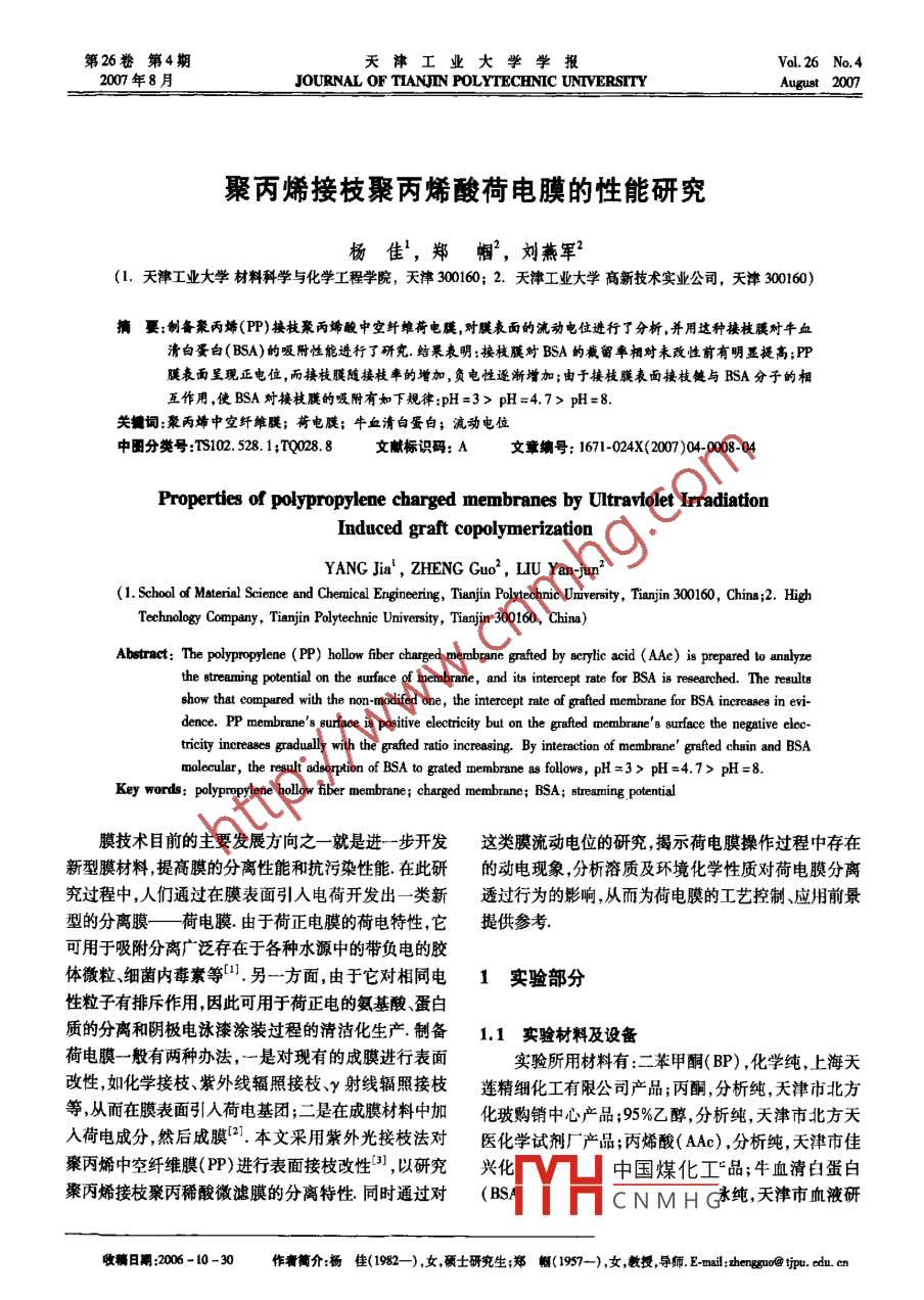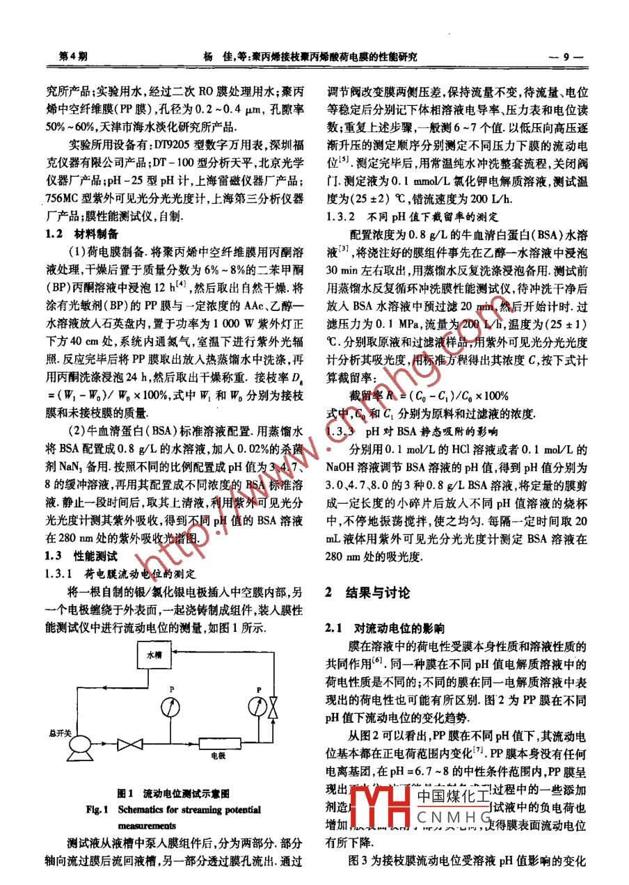 第26卷第4期天津工業(yè)大學(xué)學(xué)報(bào)Vol 26 No 42007年8月JOURNAL OF TIANJIN POLYTECHNIC UNTVERSITYAugust 2007聚丙烯接枝聚丙烯酸荷電膜的性能研究楊佳,鄭幗2,劉燕軍2(1.天津工業(yè)大學(xué)材料科學(xué)與化學(xué)工程學(xué)院,天津300160;2.天津工業(yè)大學(xué)高新技術(shù)實(shí)業(yè)公司,天津300160)摘:制備聚丙烯(PP)接枝聚丙烯酸中空纖維荷電膜,對(duì)膜表面的流動(dòng)電位進(jìn)行了分析,并用這種接枝膜對(duì)牛血清白蛋白(BSA)的吸附性能進(jìn)行了研究結(jié)果表明:接枝膜對(duì)BSA的截留率相對(duì)未改性前有明顯提高;PP膜表面呈現(xiàn)正電位,而接枝膜隨接枝率的增加,負(fù)電性逐漸增加;由于接枝膜表面接枝與BSA分子的相互作用,使BSA對(duì)接杖膜的吸附有如下規(guī)律:;pH=3>pH=4.7>pH=8.關(guān)詞:聚丙嬸中空纖膜;荷電膜;牛血清白蛋白;流動(dòng)電位中圖分類(lèi)號(hào):TS102.528.1;TQ28.8文獻(xiàn)標(biāo)識(shí)碼:A文章編號(hào):1671-024X(2007)04-0008-04Properties of polypropylene charged membranes by Ultraviolet IrradiationInduced graft copolymerizationYANG Jia, ZHENG Guo, LIU Yan-jun21. School of Material Science and Chemical Engineering, Tianjin Polytechnic University, Tianjin 300160, China; 2. HighTechnology Company, Tianjin Polytechnic University, Tianjin 300160, Chinact: The polypropylene(PP)hollow fiber charged membrane grafted by acrylic acid(AAc) is prepared to analthe streaming potential on the surface of membrane, and its intercept rate for BSA is researched. The resultshow that compared with the non- modifed one, the intercept rate of grafted membrane for BSA increases in evi-dence. PP membrane's surface is positive electricity but on the grafted membrane's surface the negative elec-tricity increases gradually with the grafted ratio increasing. By interaction of membranegrafted chain and BSAolecular, the result adsorption of BSA to grated membrane as follow, pH =3>pH=4. 7>pH=8Key words: polypropylene hollow fiber membrane; charged membrane; BSA; streaming potential膜技術(shù)目前的主要發(fā)展方向之一就是進(jìn)步開(kāi)發(fā)這類(lèi)膜流動(dòng)電位的研究揭示荷電膜操作過(guò)程中存在新型膜材料提高膜的分離性能和抗污染性能在此研的動(dòng)電現(xiàn)象分析溶質(zhì)及環(huán)境化學(xué)性質(zhì)對(duì)荷電膜分離究過(guò)程中,人們通過(guò)在膜表面引入電荷開(kāi)發(fā)出一類(lèi)新透過(guò)行為的影響,從而為荷電膜的工藝控制應(yīng)用前景型的分離膜—荷電膜由于荷正電膜的荷電特性,它提供參考可用于吸附分離廣泛存在于各種水源中的帶負(fù)電的膠體微粒細(xì)菌內(nèi)毒素等.另一方面由于它對(duì)相同電1實(shí)驗(yàn)部分性粒子有排斥作用因此可用于荷正電的氨基酸蛋白質(zhì)的分離和陰極電泳漆涂裝過(guò)程的清潔化生產(chǎn)制備1.1實(shí)驗(yàn)材料及設(shè)備荷電膜般有兩種辦法,是對(duì)現(xiàn)有的成膜進(jìn)行表面實(shí)驗(yàn)所用材料有:二苯甲酮(BP),化學(xué)純,上海天改性如化學(xué)接枝紫外線輻照接枝、y射線輻照接枝蓮精細(xì)化工有限公司產(chǎn)品;丙酮分析純天津市北方等從而在膜表面引入荷電基團(tuán);二是在成膜材料中加化玻購(gòu)銷(xiāo)中心產(chǎn)品;95%乙醇分析純天津市北方天入荷電成分然后成膜(2.本文采用紫外光接枝法對(duì)醫(yī)化學(xué)試劑廠產(chǎn)品;丙烯酸(Ac),分析純天津市佳聚丙烯中空纖維膜(PP)進(jìn)行表面接枝改性,以研究興化聚丙烯接枝聚丙稀酸微濾膜的分離特性同時(shí)通過(guò)對(duì)(BSYH中國(guó)煤化工“品;牛血清臼蛋白CNMH永純天津市血液研收稿日期:2006-10-30作者簡(jiǎn)介:楊佳(1982-)女碩士研究生;鄭幗(1957-),女教授導(dǎo)師Emil:zhengguo@ipu,cdm.cn第4期楊佳,等聚丙烯接枝秦丙烯酸荷電膜的性能研究9究所產(chǎn)品;實(shí)驗(yàn)用水,經(jīng)過(guò)二次RO膜處理用水;聚丙調(diào)節(jié)閥改變膜兩側(cè)壓差保持流量不變,待流量、電位烯中空纖維膜(PP膜),孔徑為0.2~0.4μm,孔隙率等穩(wěn)定后分別記下體相溶液電導(dǎo)率、壓力表和電位讀50%~60%,天津市海水淡化研究所產(chǎn)品數(shù);重復(fù)上述步驟,一般測(cè)6~7個(gè)值以低壓向高壓逐實(shí)驗(yàn)所用設(shè)備有:D9205型數(shù)字萬(wàn)用表,深圳福漸升壓的測(cè)定順序分別測(cè)定不同壓力下膜的流動(dòng)電克儀器有限公司產(chǎn)品;D-100型分析天平,北京光學(xué)位測(cè)定完畢后用常溫純水沖洗整套流程,關(guān)閉閥儀器廠產(chǎn)品;pH-25型pH計(jì),上海雷磁儀器廠產(chǎn)品;測(cè)定液為0.1mmo/L氯化鉀電解質(zhì)溶液測(cè)試溫756MC型紫外可見(jiàn)光分光光度計(jì),上海第三分析儀器度為(25±2)℃,錯(cuò)流速度為200Lh廠產(chǎn)品;膜性能測(cè)試儀,自制1.3.2不同pH值下截留率的測(cè)定12材料制備配置濃度為0.8g/L的牛血清白蛋白(BsA)水溶(1)荷電膜制備將聚丙烯中空纖維膜用丙酮溶液,將澆注好的膜組件事先在乙醇一水溶液中浸泡液處理,干燥后置于質(zhì)量分?jǐn)?shù)為6%~8%的二苯甲酮30min左右取出,用蒸餾水反復(fù)洗滌浸泡備用測(cè)試前(BP)丙酮溶液中浸泡12h“,然后取出自然干燥將用蒸餾水反復(fù)循環(huán)沖洗膜性能測(cè)試儀待沖洗干凈后涂有光敏劑(BP)的P膜與一定濃度的AAc、乙醇一放入BSA水溶液中預(yù)過(guò)濾20mn,然后開(kāi)始計(jì)時(shí)過(guò)水溶液放人石英盤(pán)內(nèi),置于功率為1000W